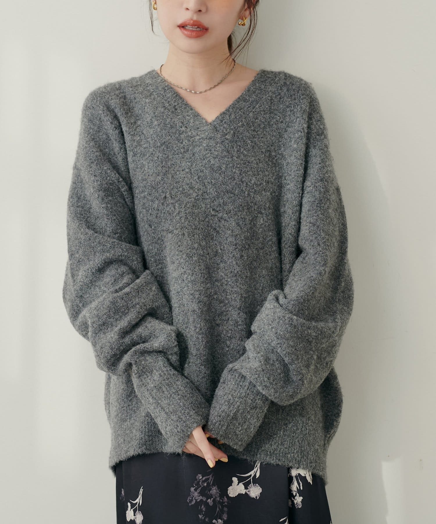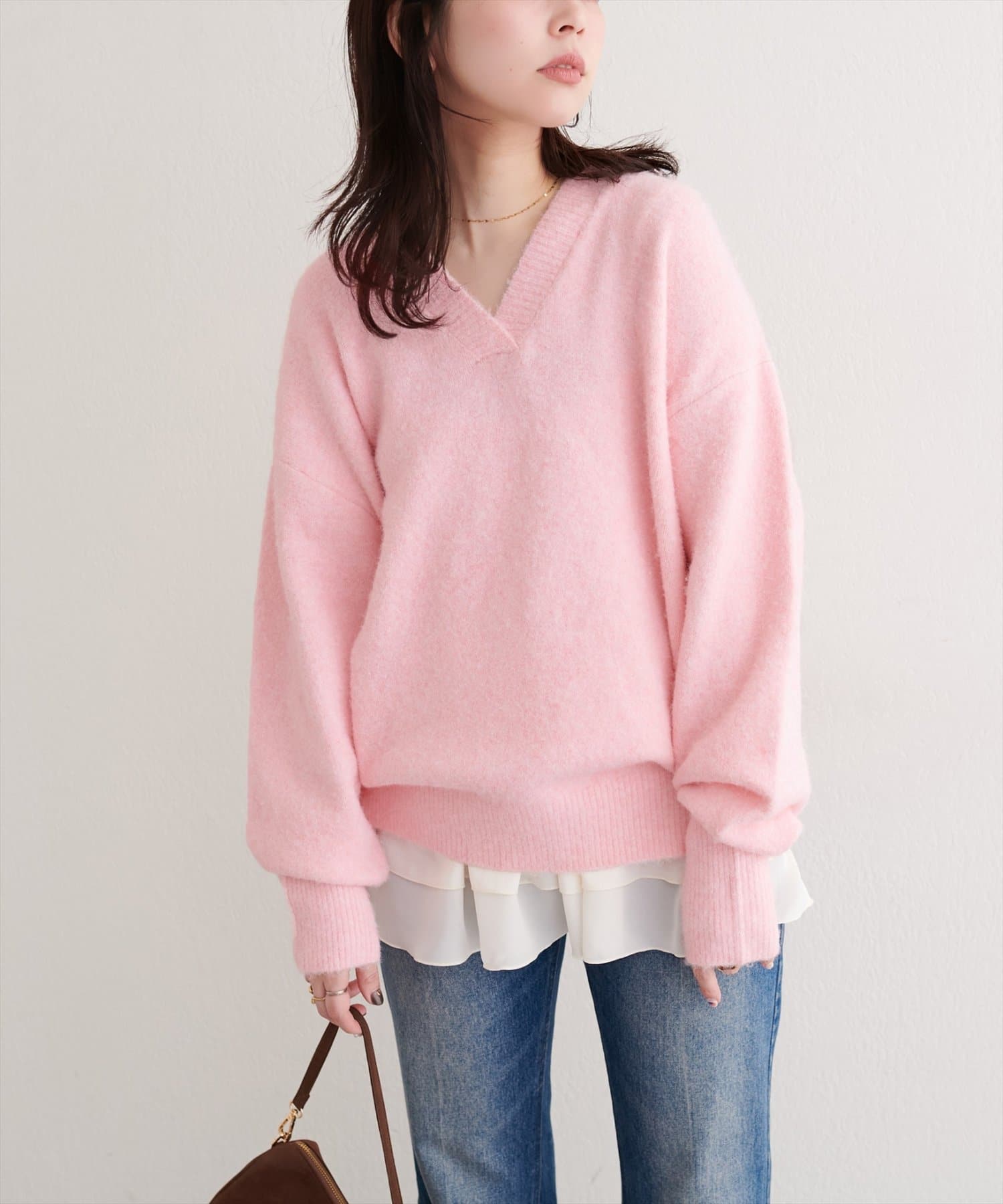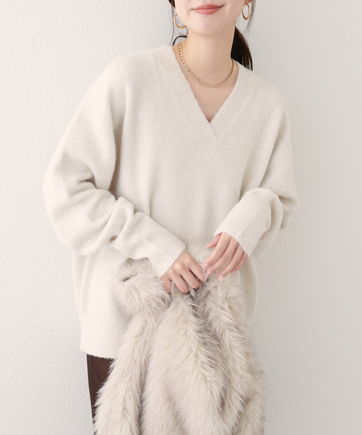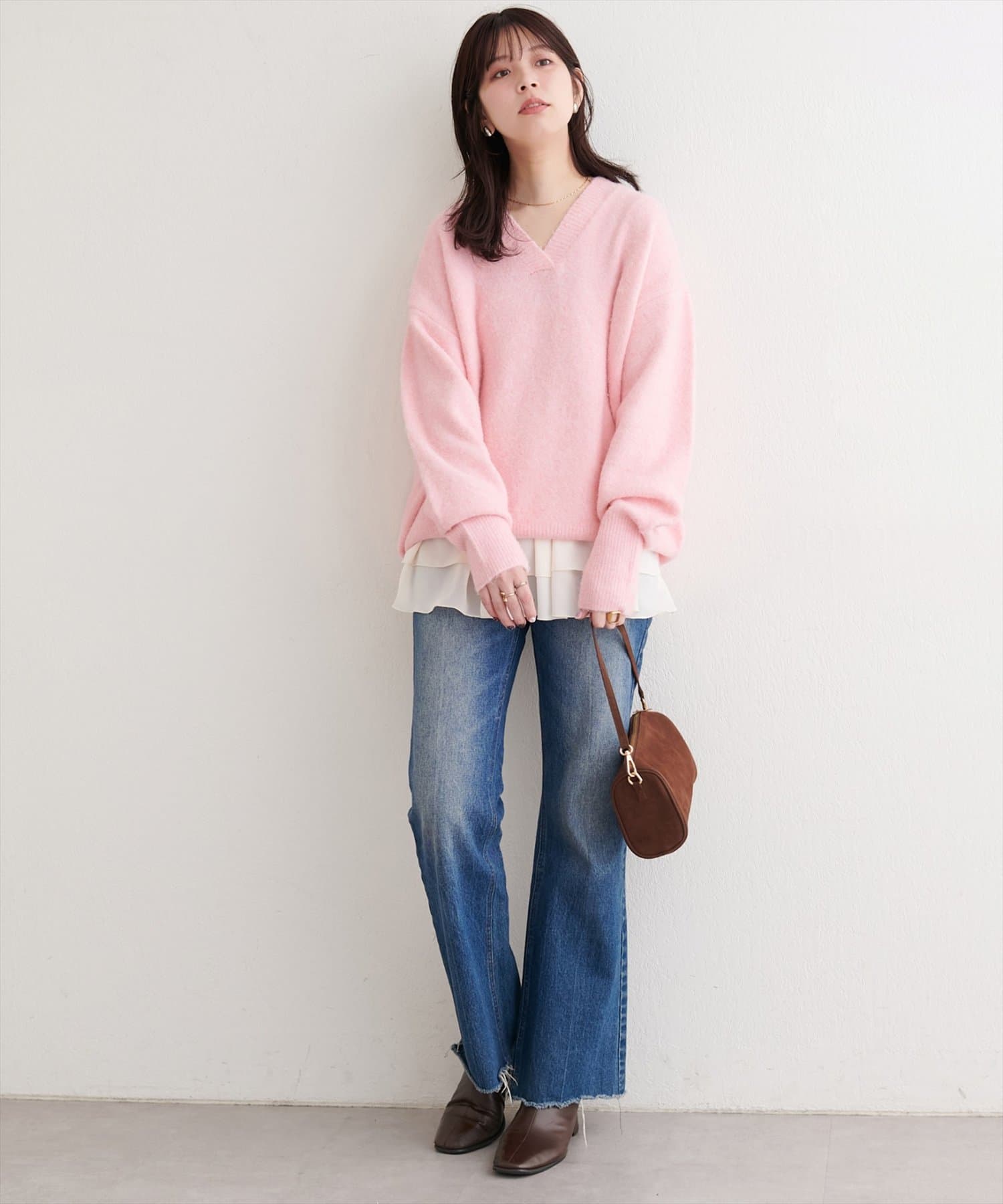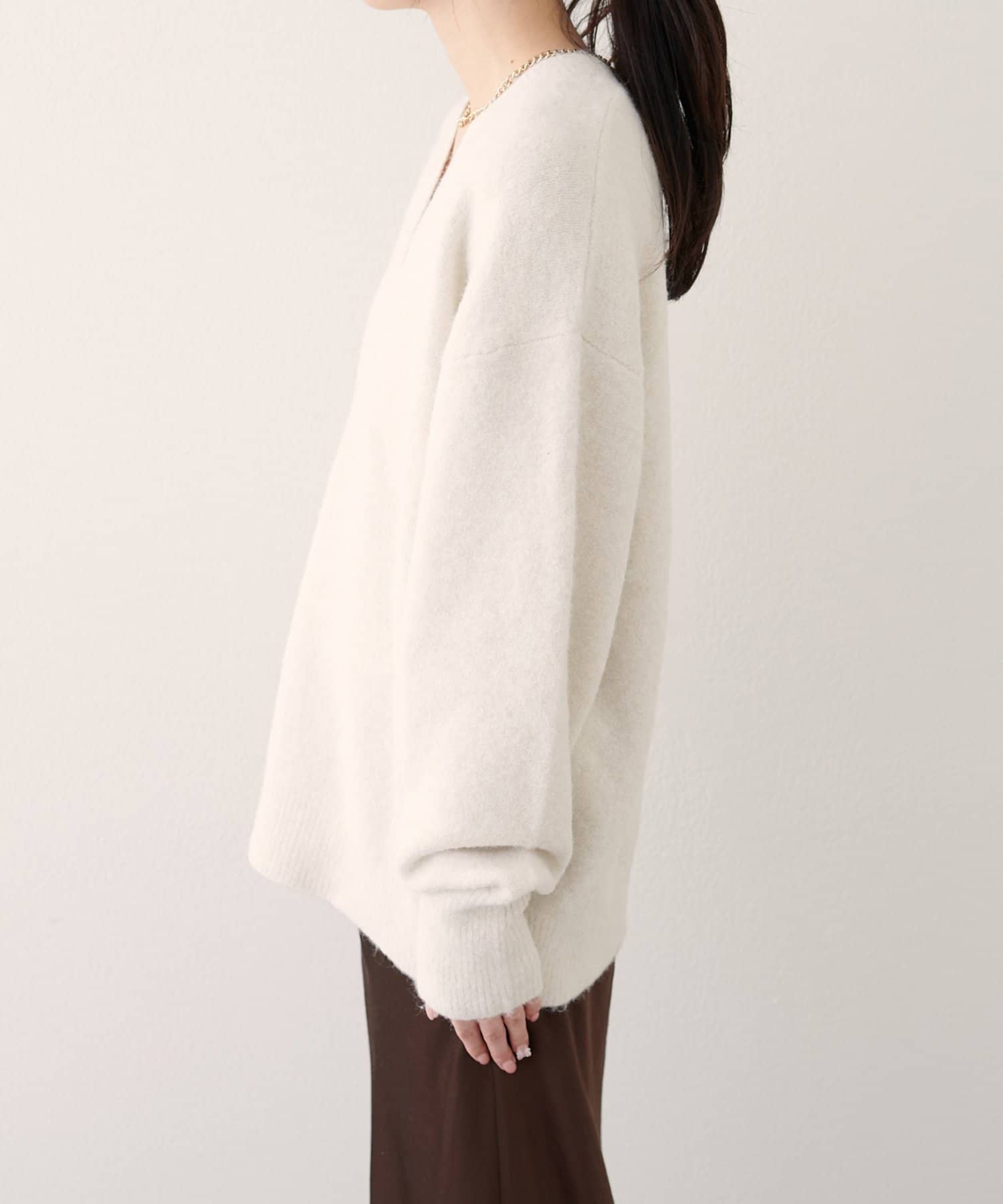 デコルテを美しく見せるVネックラインは、カジュアルながらも女性らしさを引き立てる絶妙なカッティング。