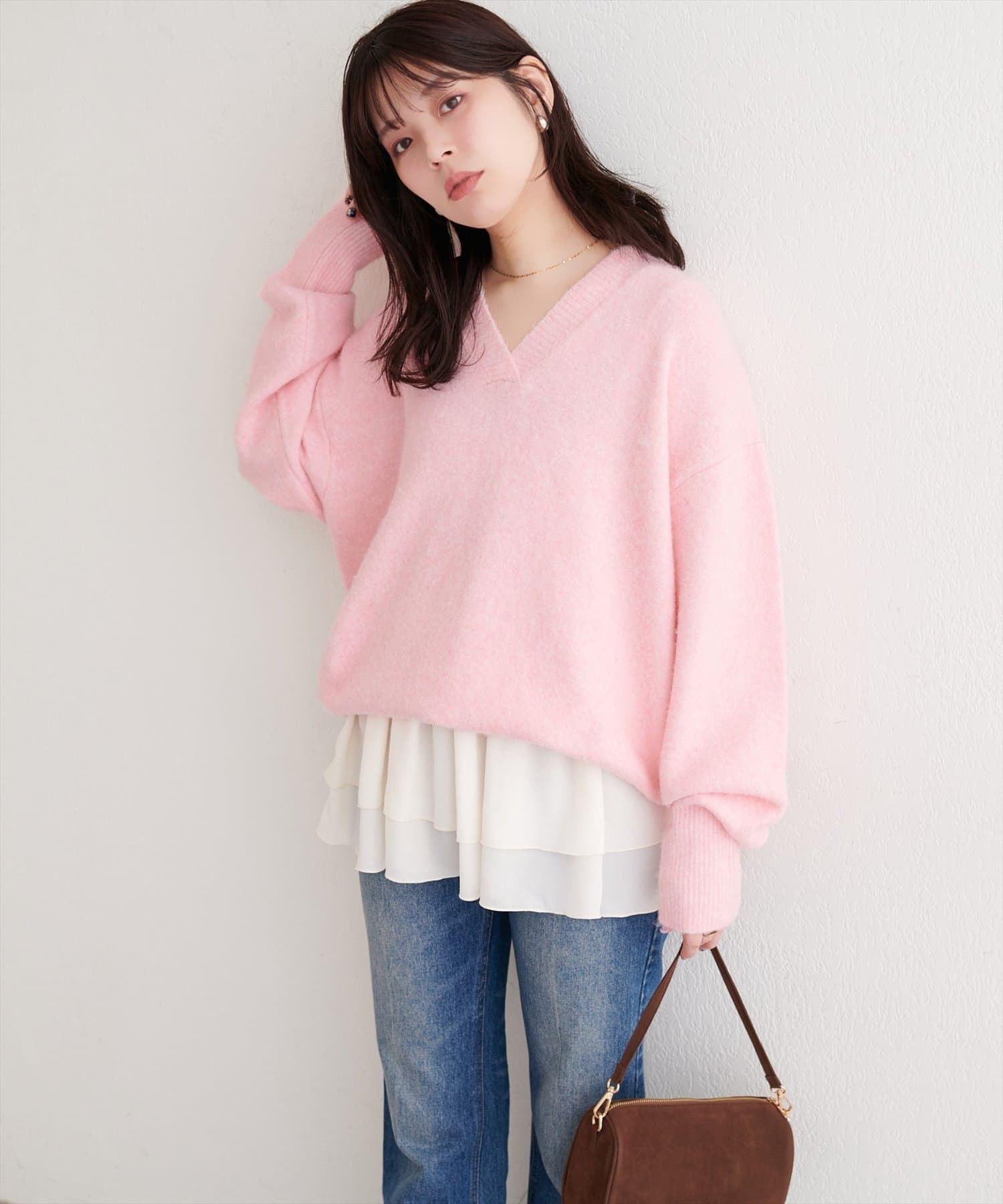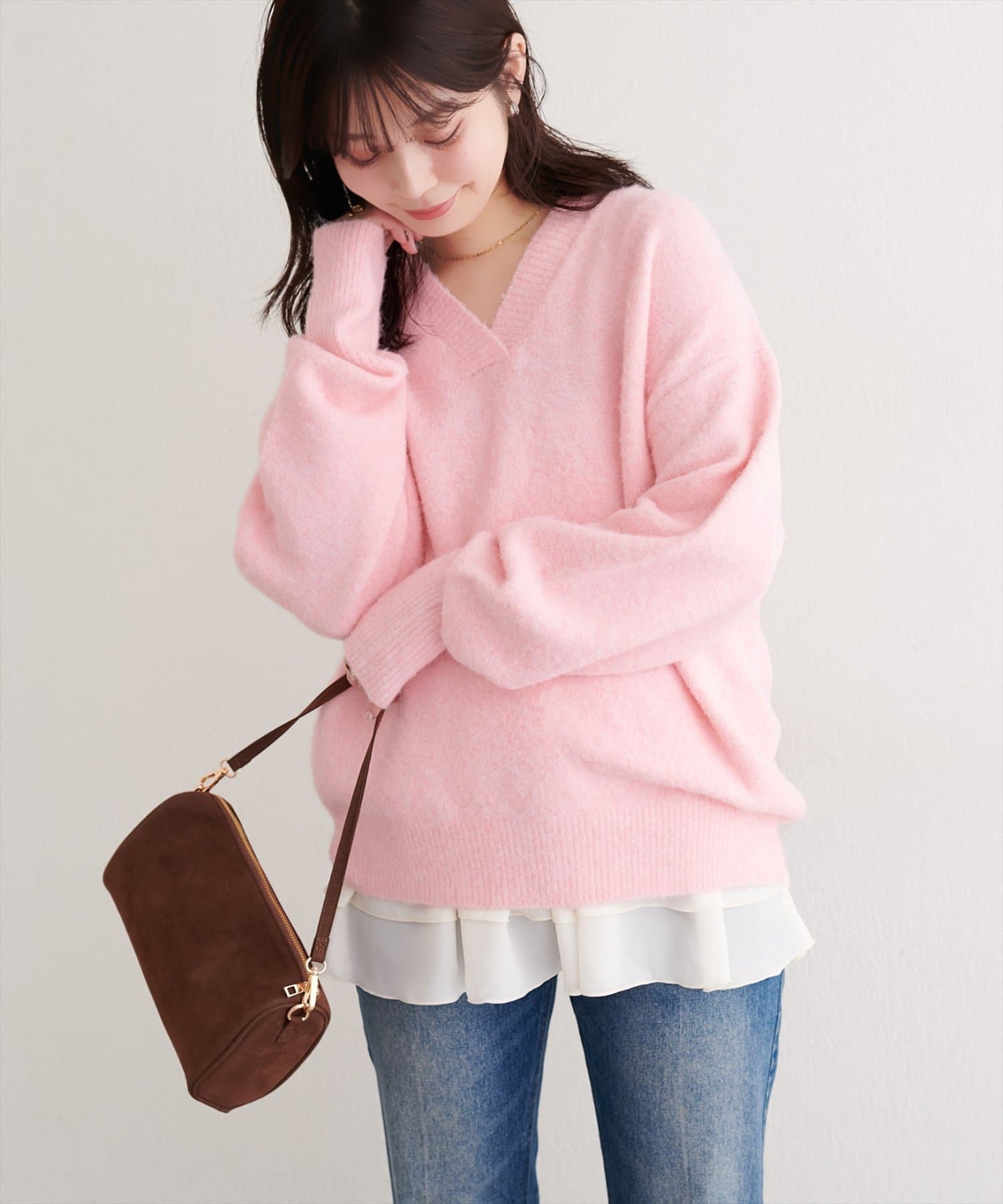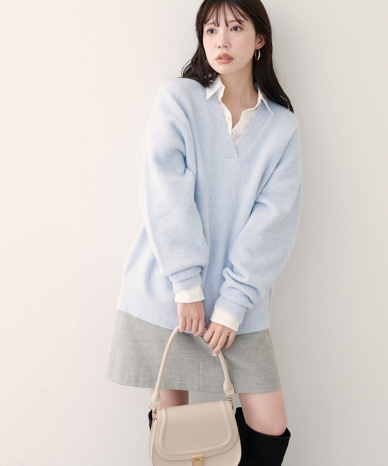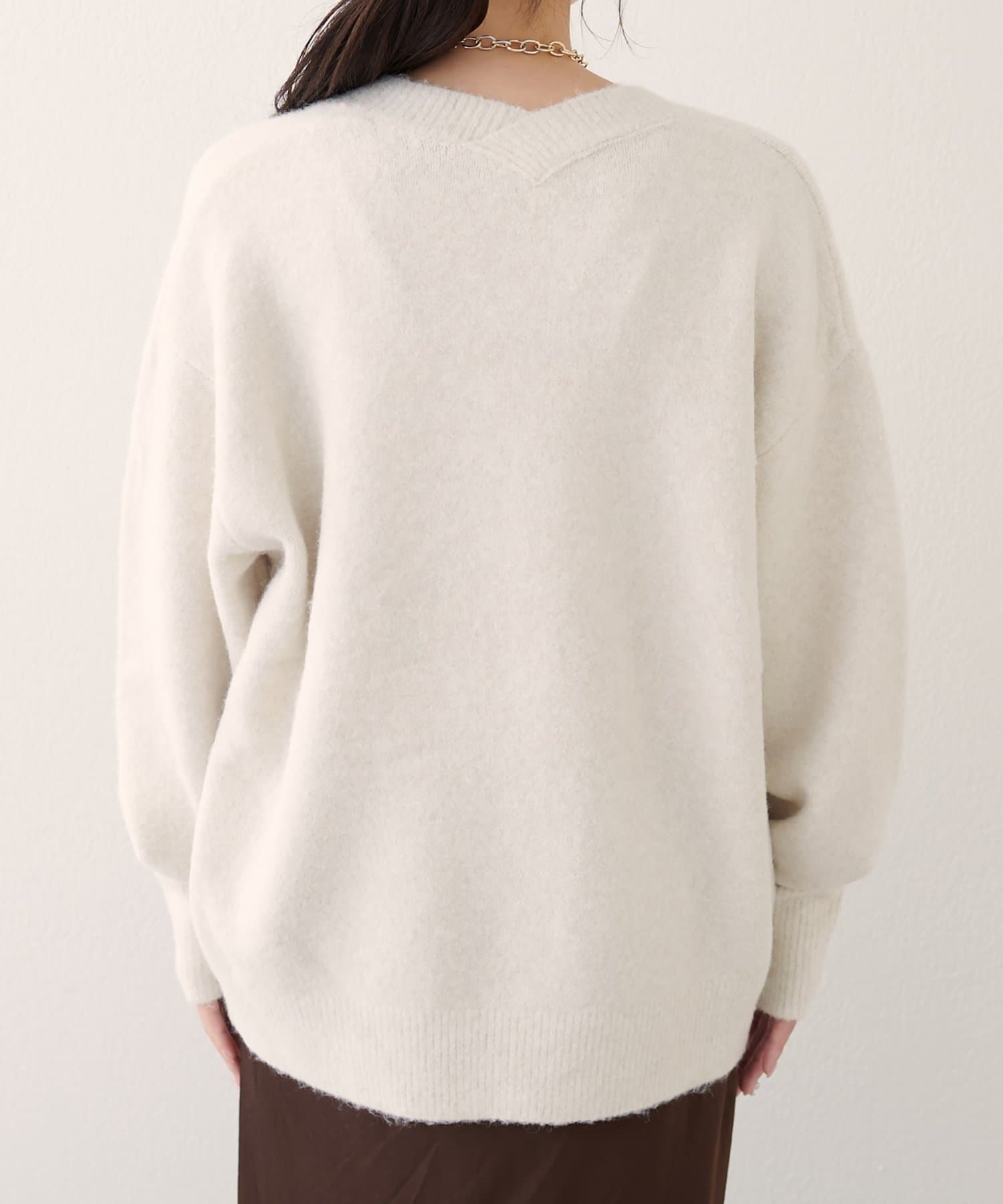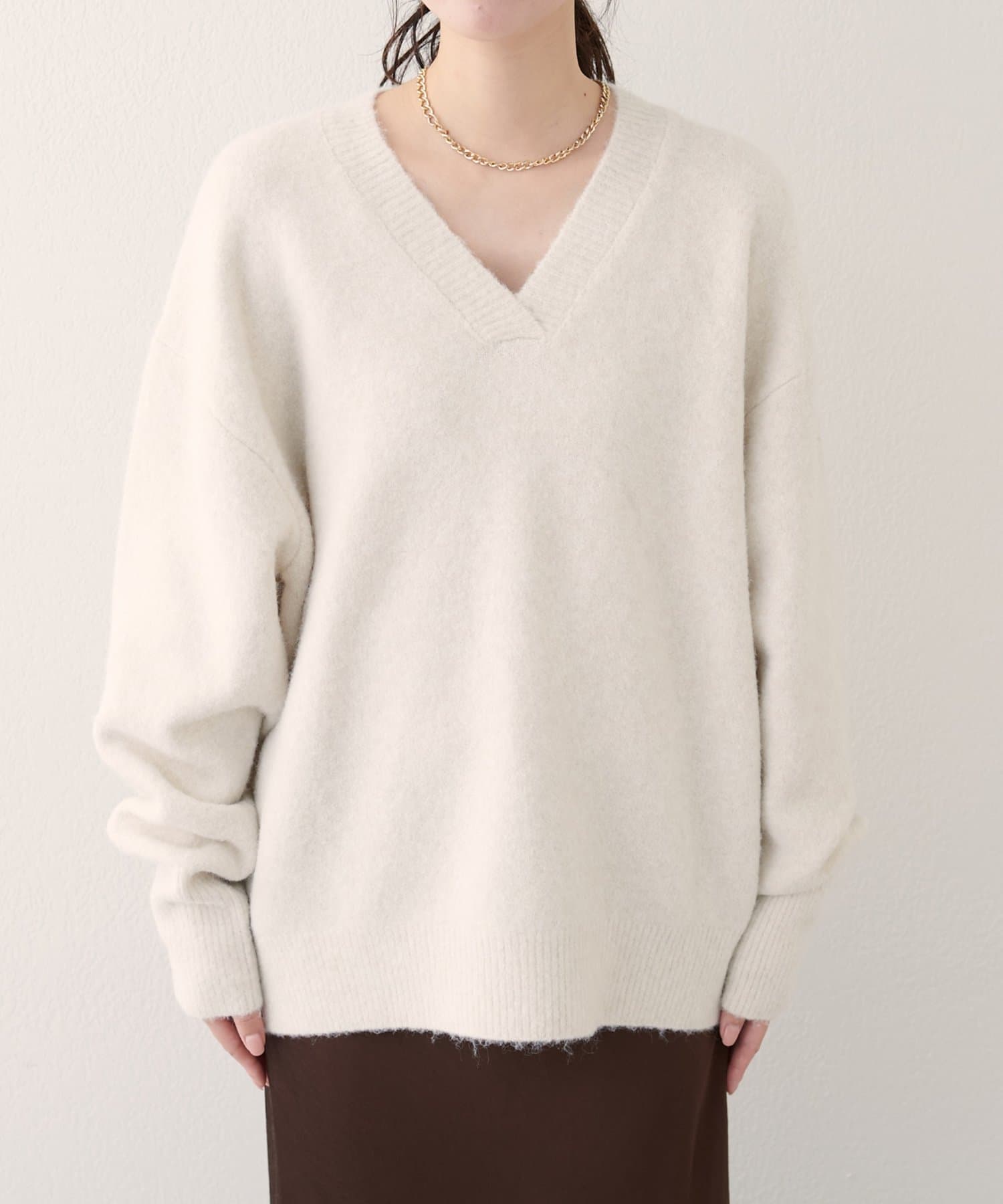 デコルテを美しく見せるVネックラインは、カジュアルながらも女性らしさを引き立てる絶妙なカッティング。