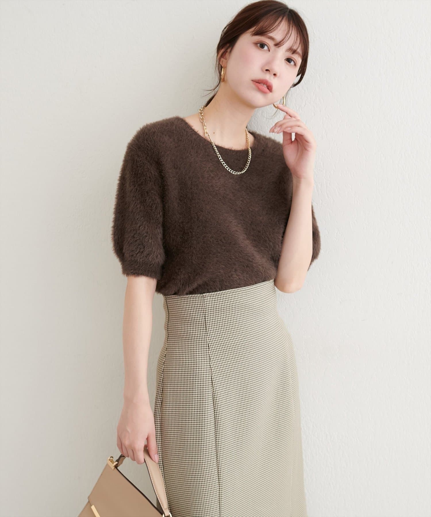 上品で女性らしい着こなしを叶える、フェザーヤーン半袖ニットプルオーバー。
