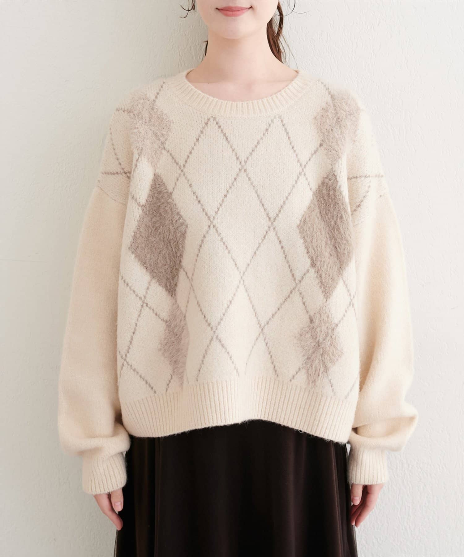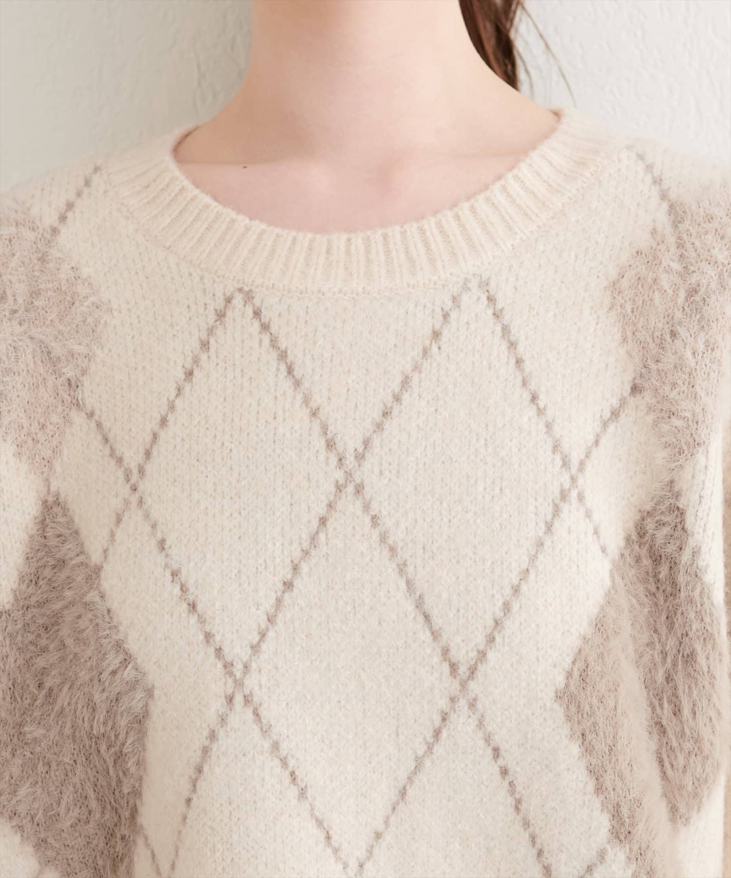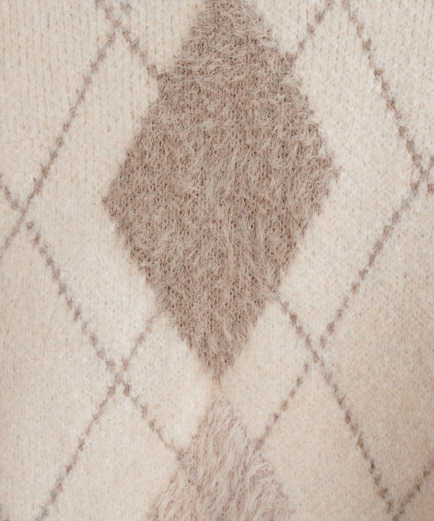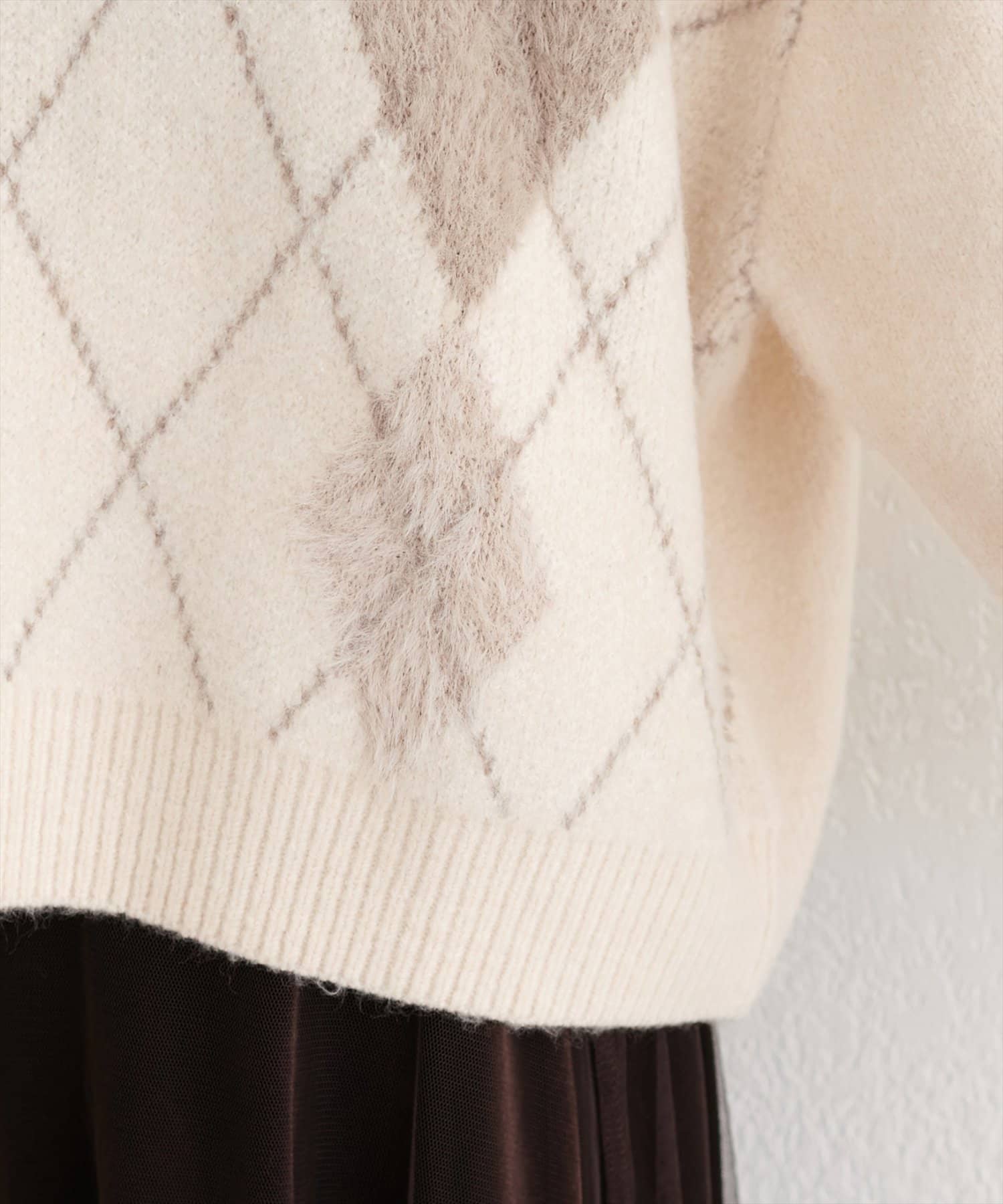 アーガイル柄部分には、ふわふわとしたフェザーのような素材を使用し、立体感と奥行きをプラス。