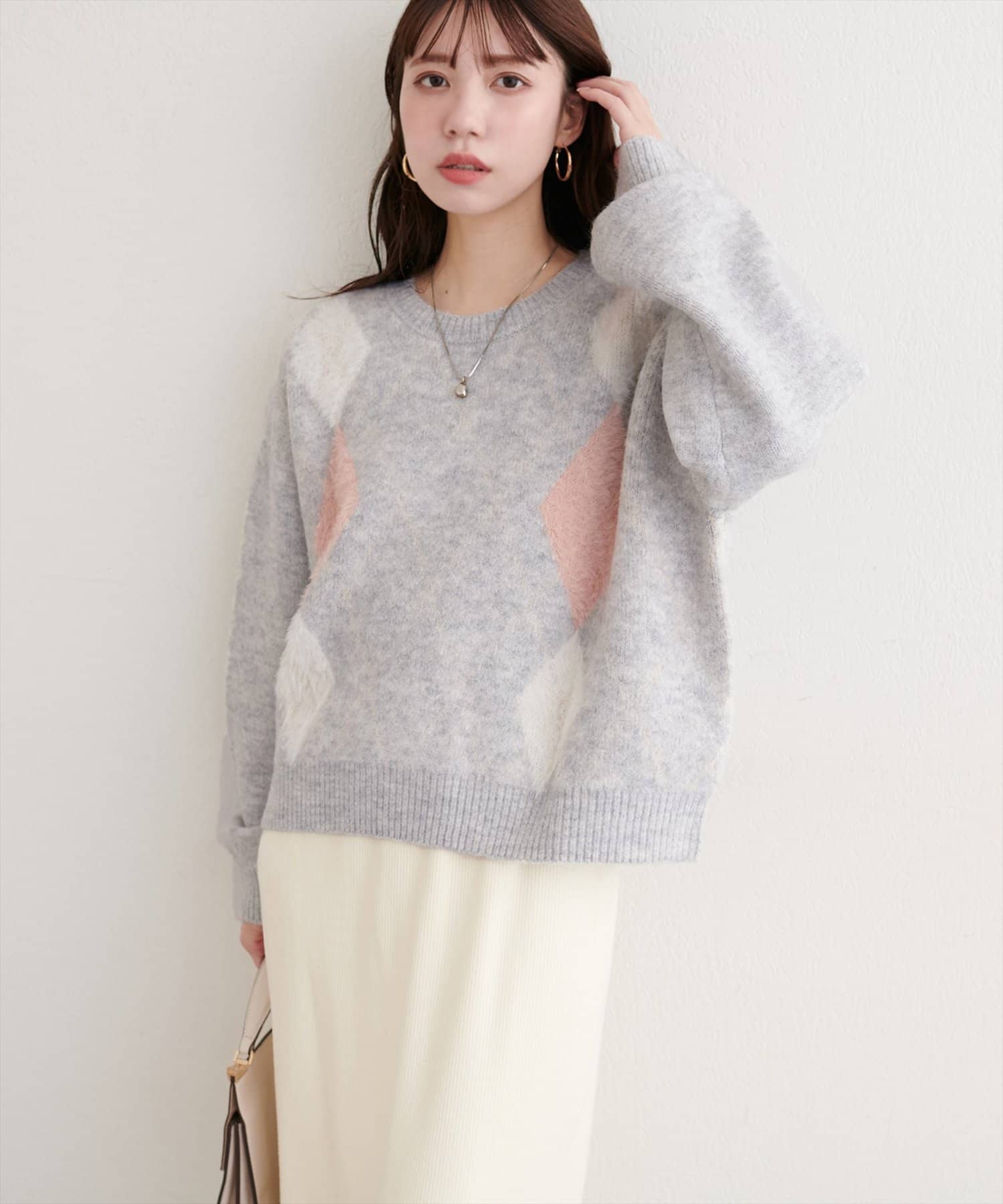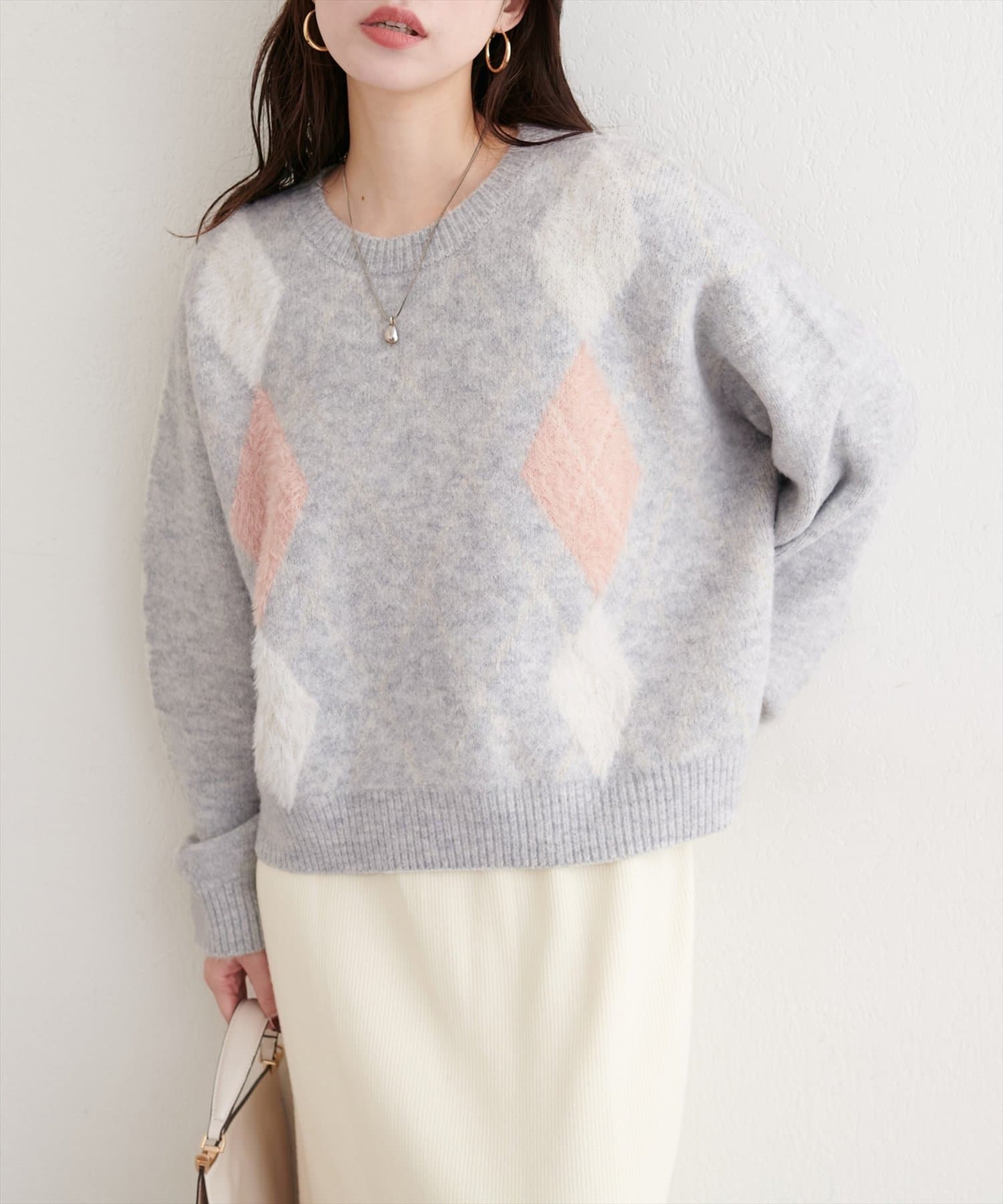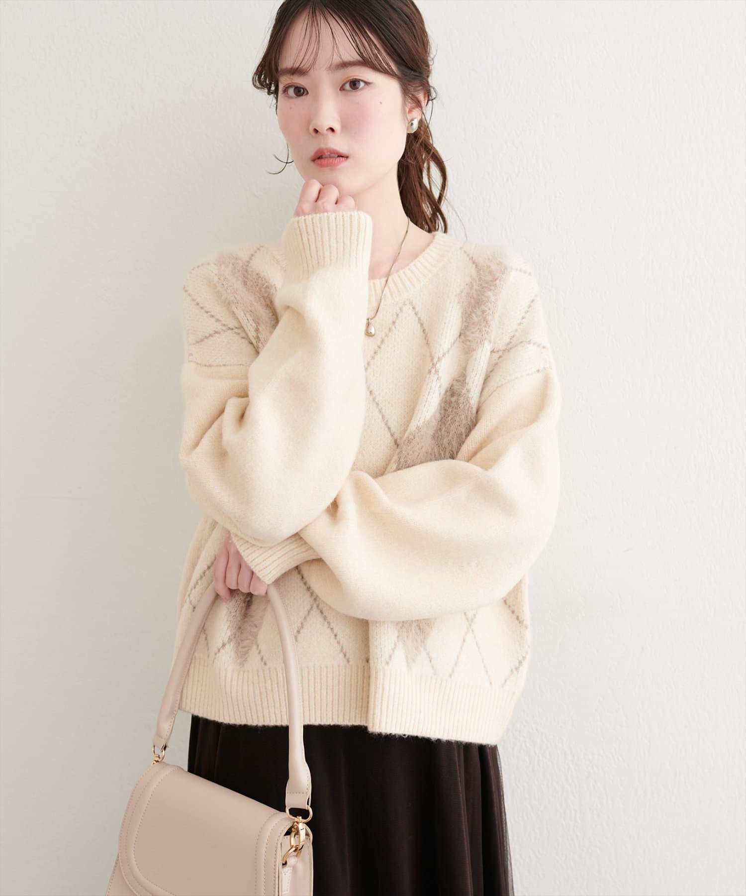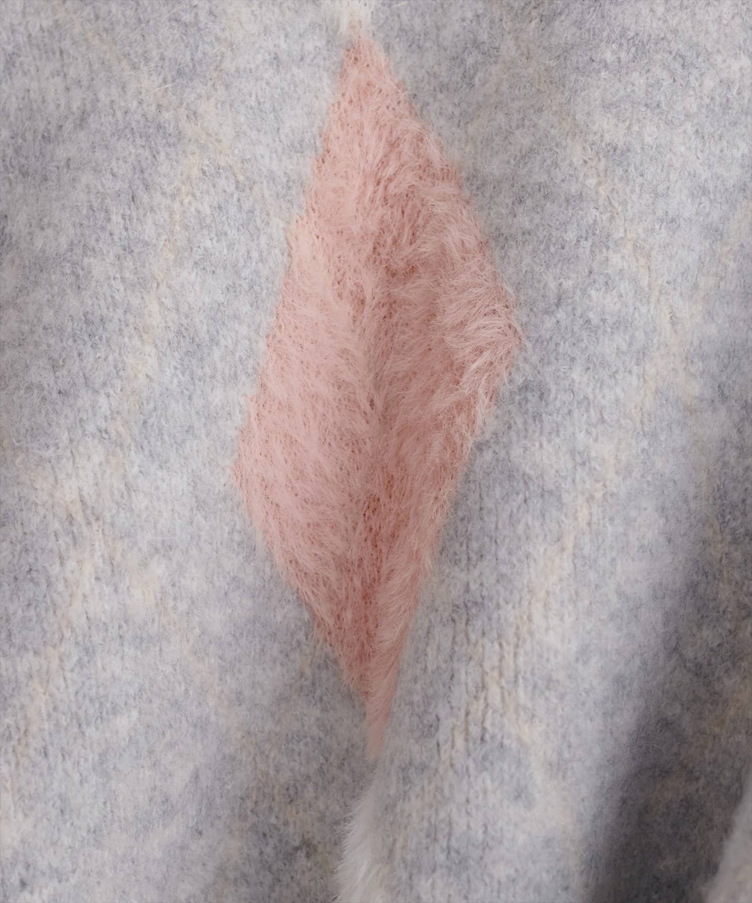 アーガイル柄部分には、ふわふわとしたフェザーのような素材を使用し、立体感と奥行きをプラス。
