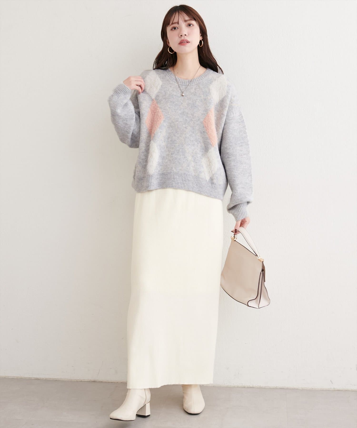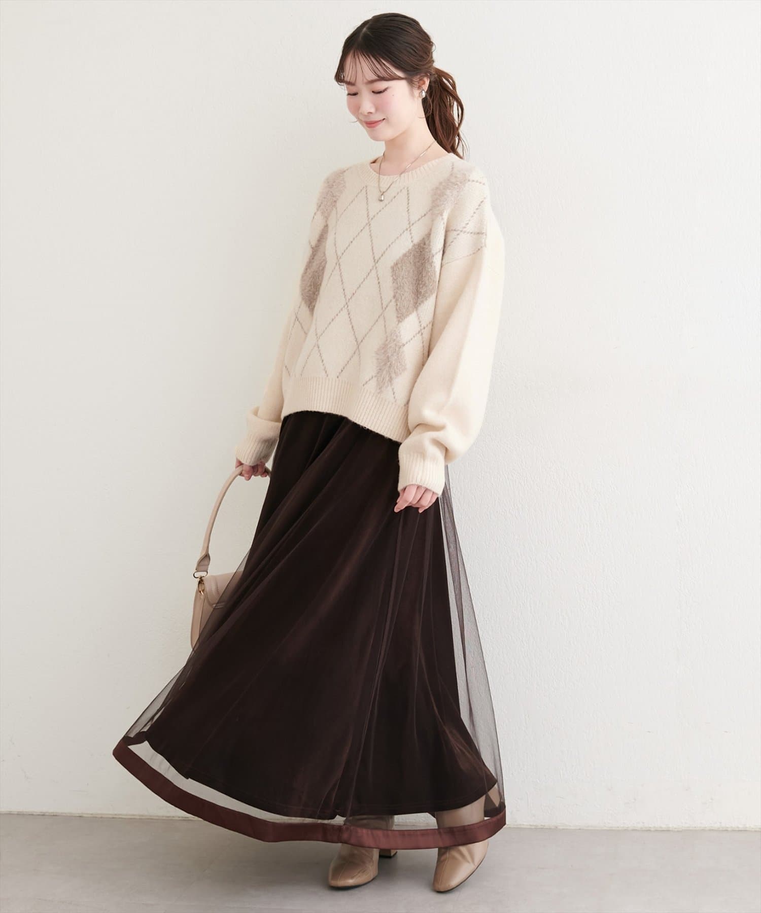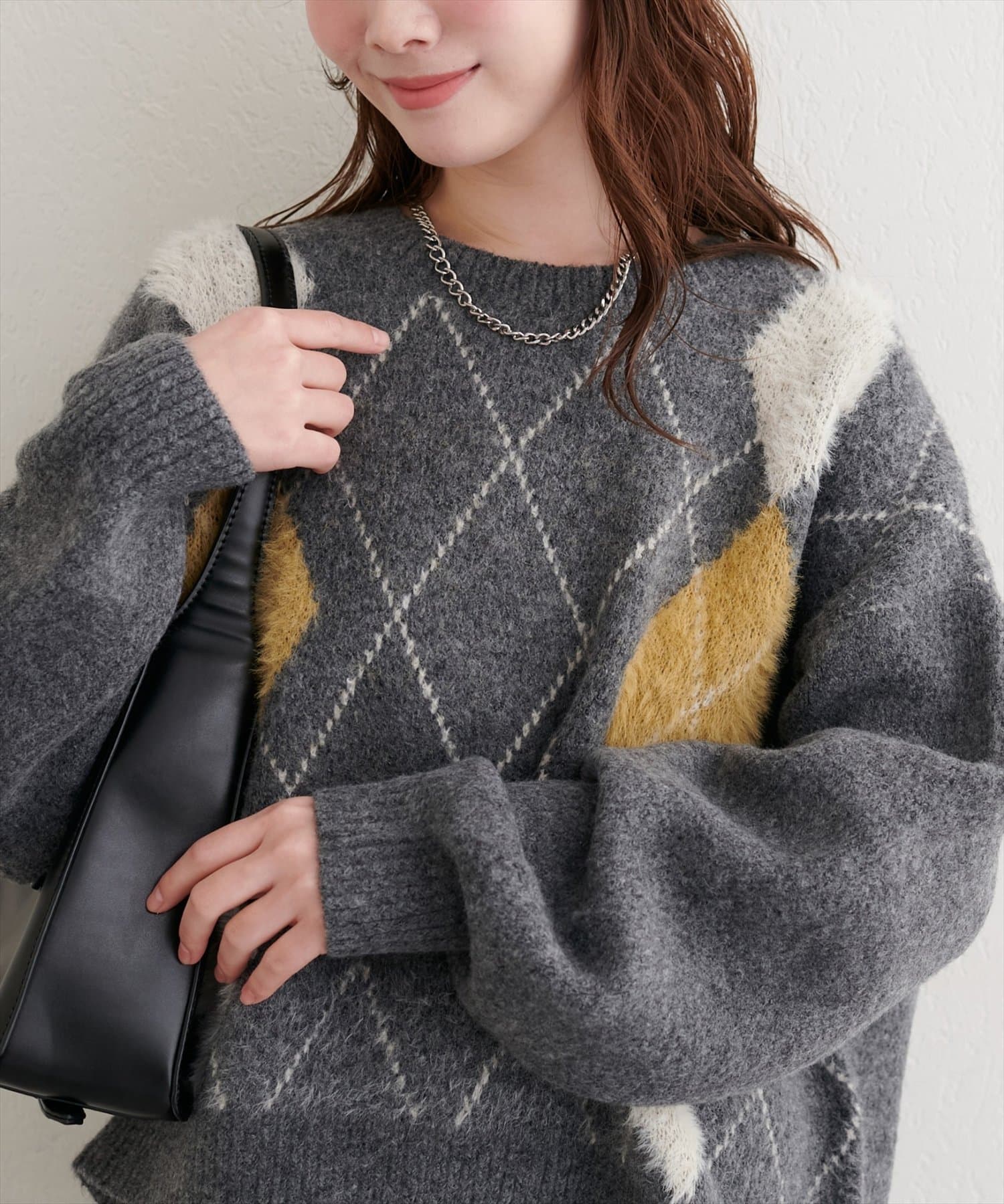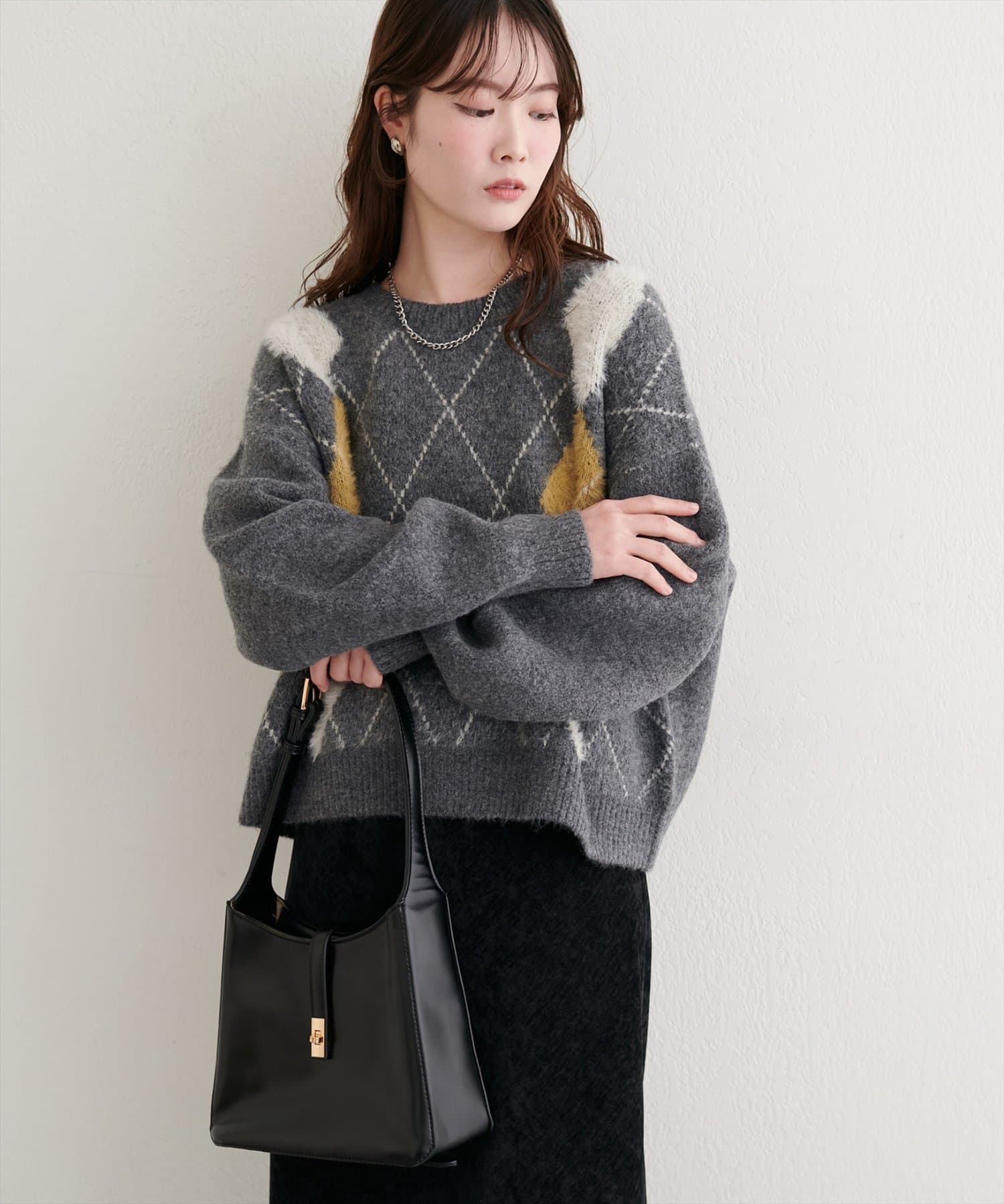 アーガイル柄部分には、ふわふわとしたフェザーのような素材を使用し、立体感と奥行きをプラス。