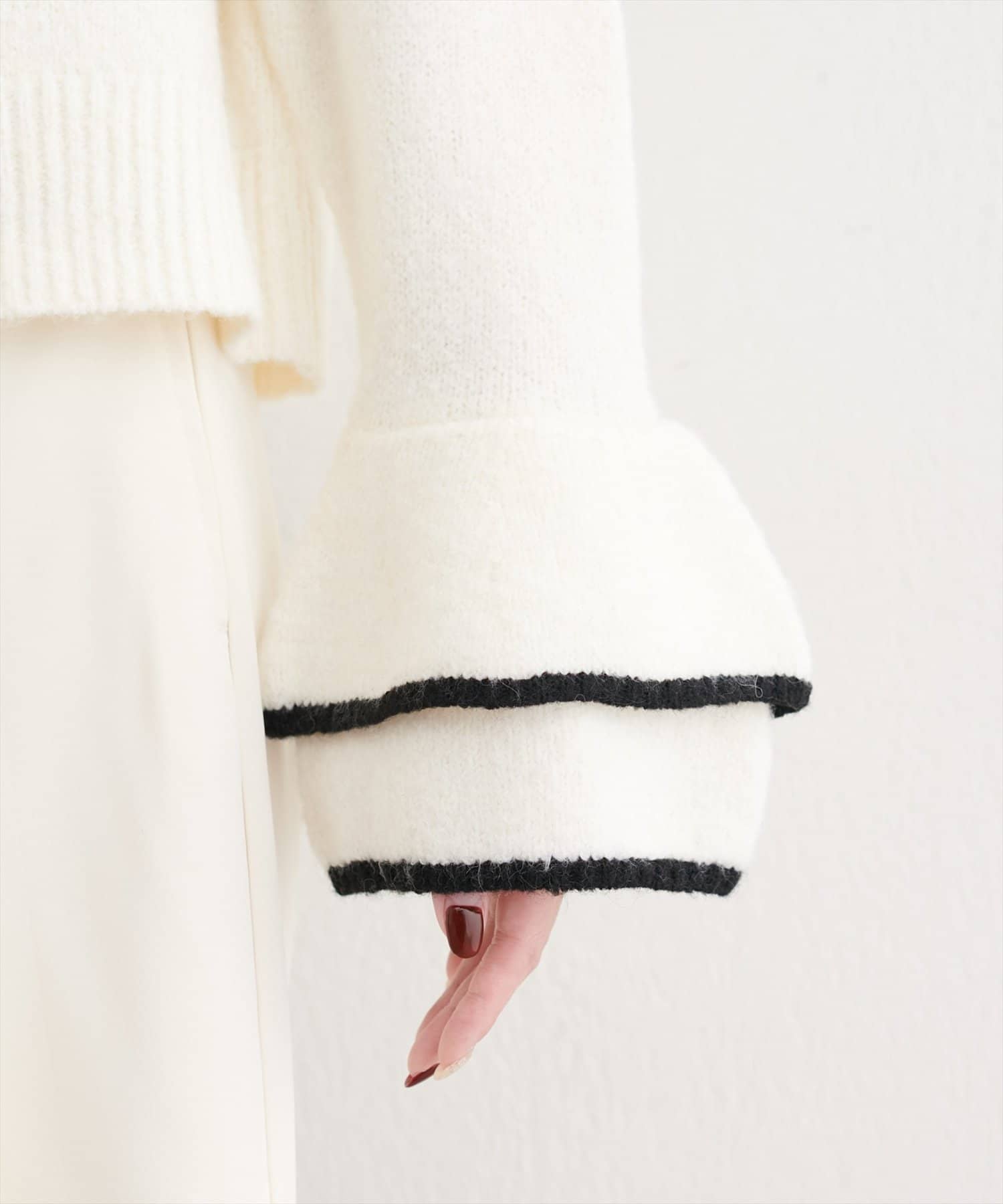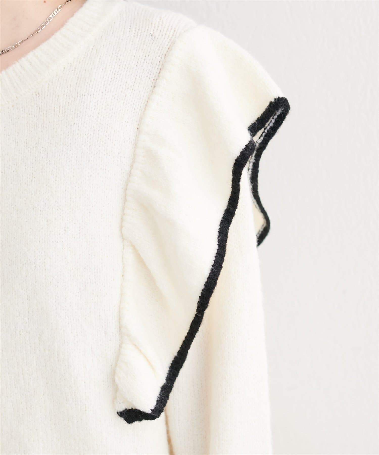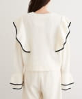 ネックラインと袖口を飾るフリルは、ほんのり甘く、上品な雰囲気を演出します。