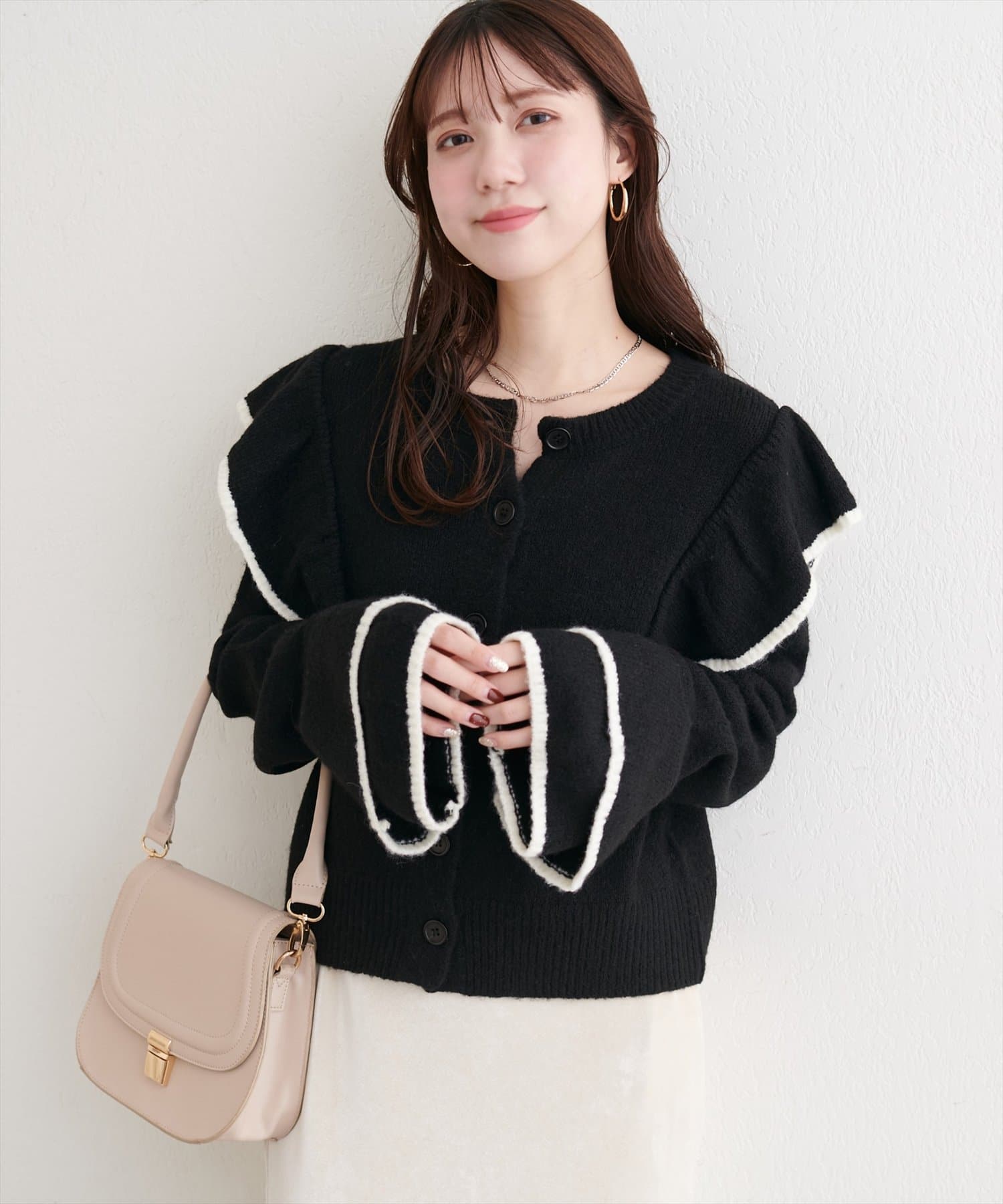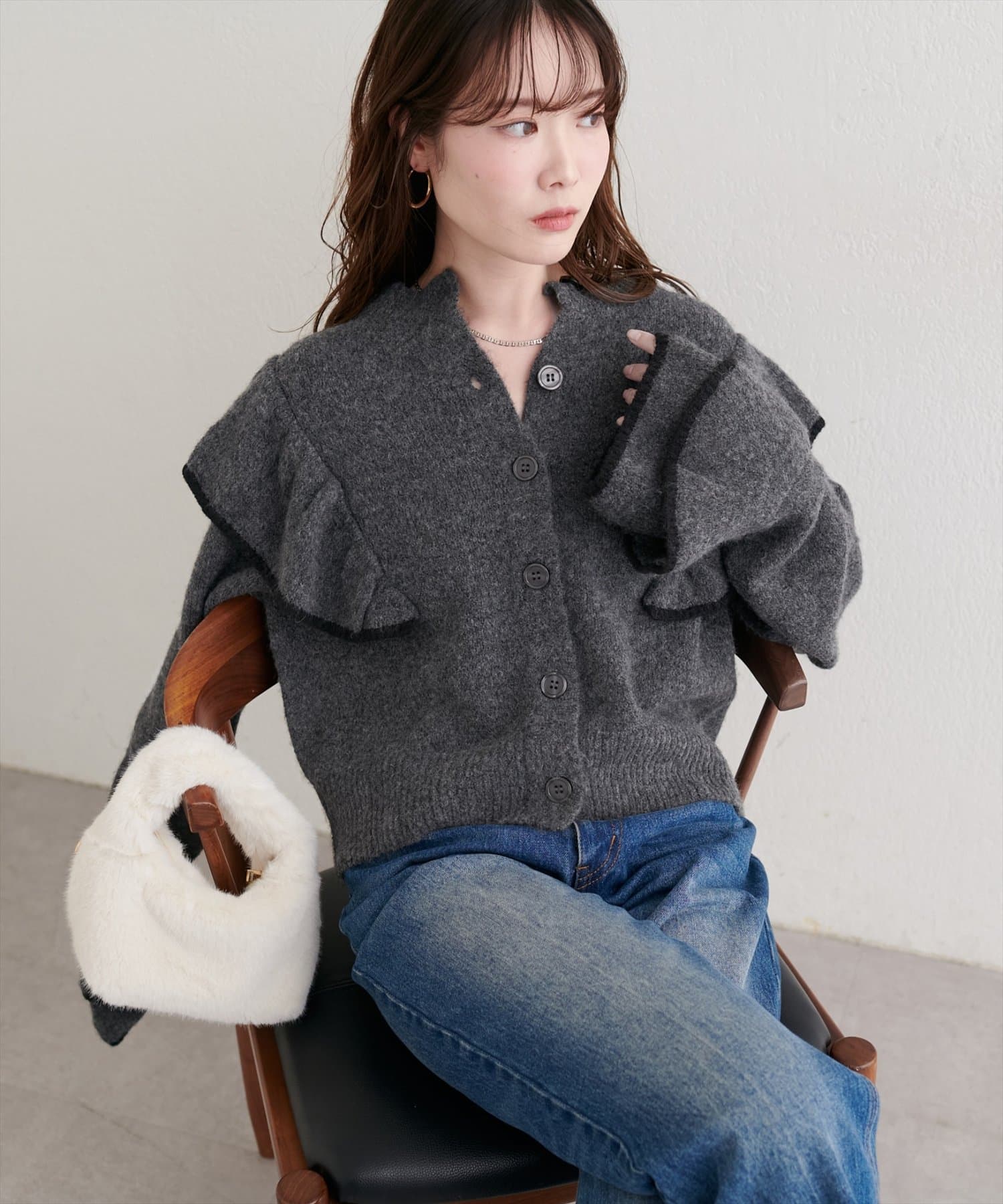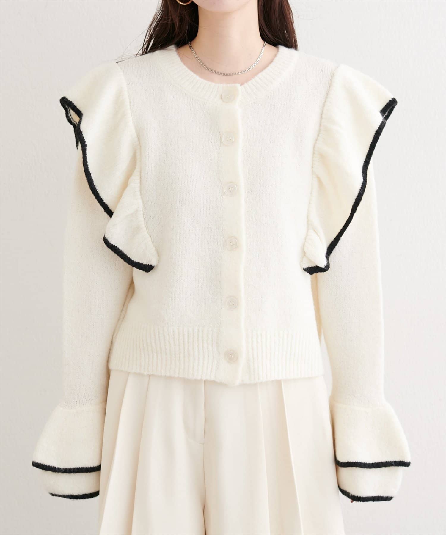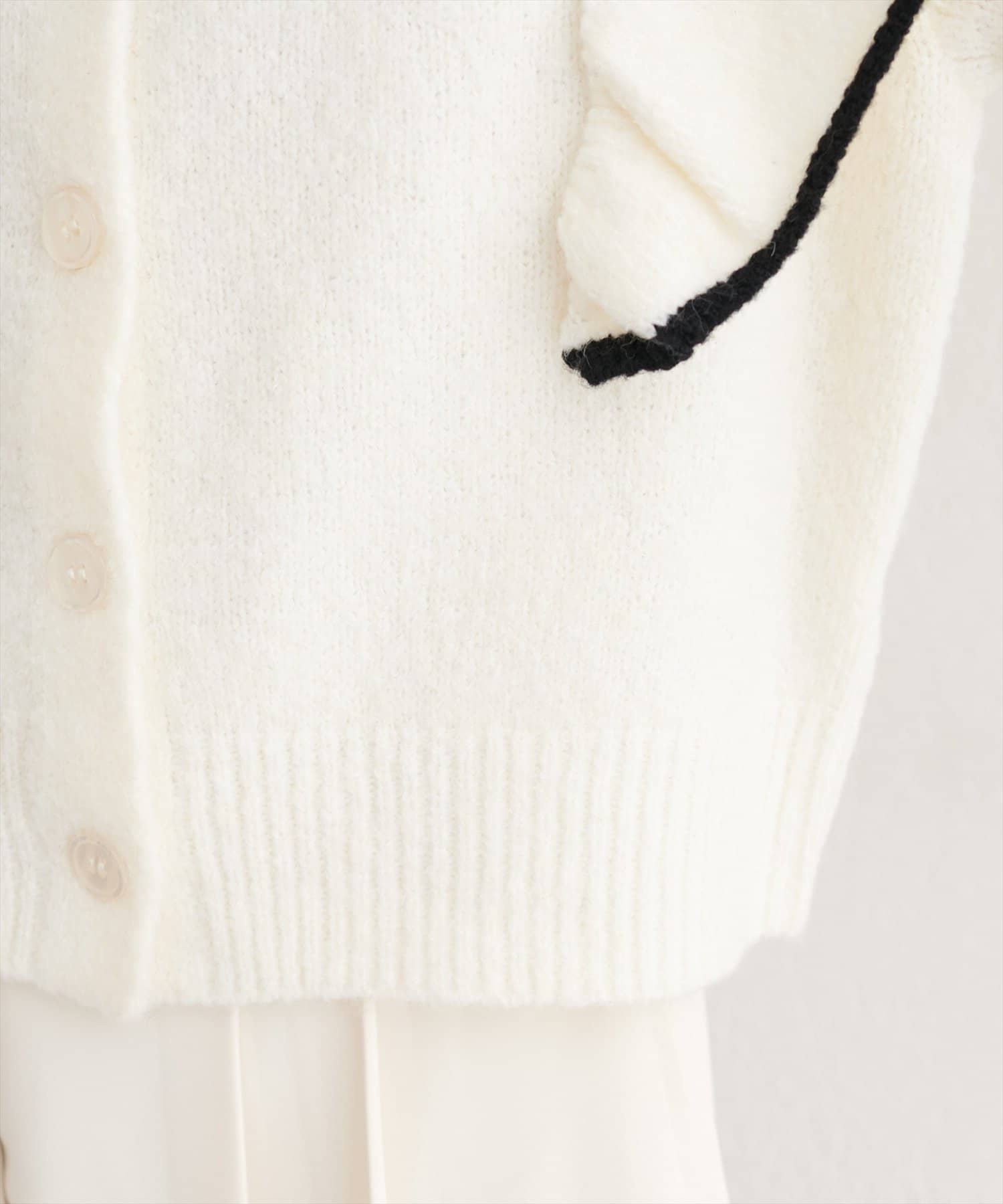 一目で心を奪われる、繊細なフリルが印象的なニットカーディガン。