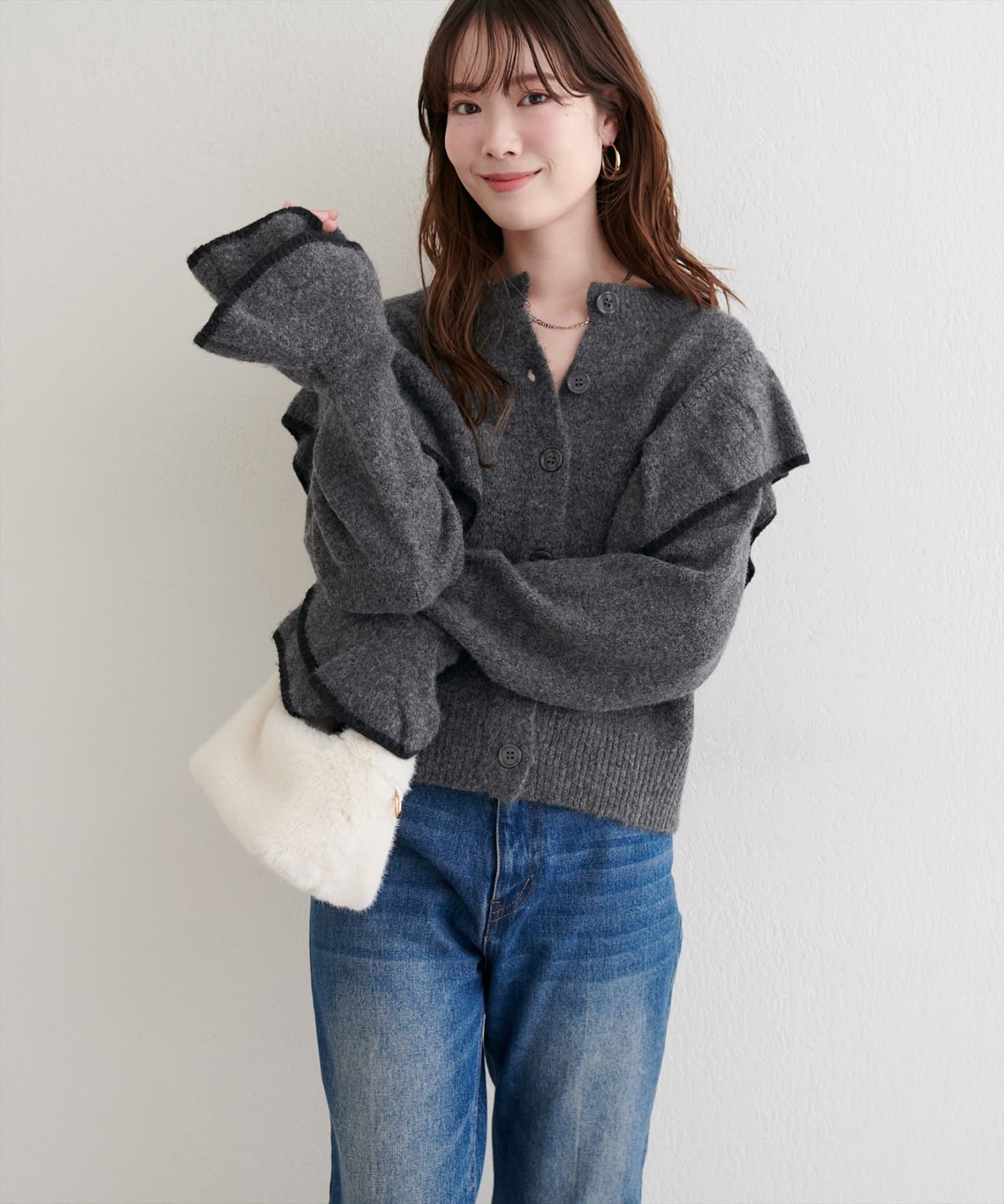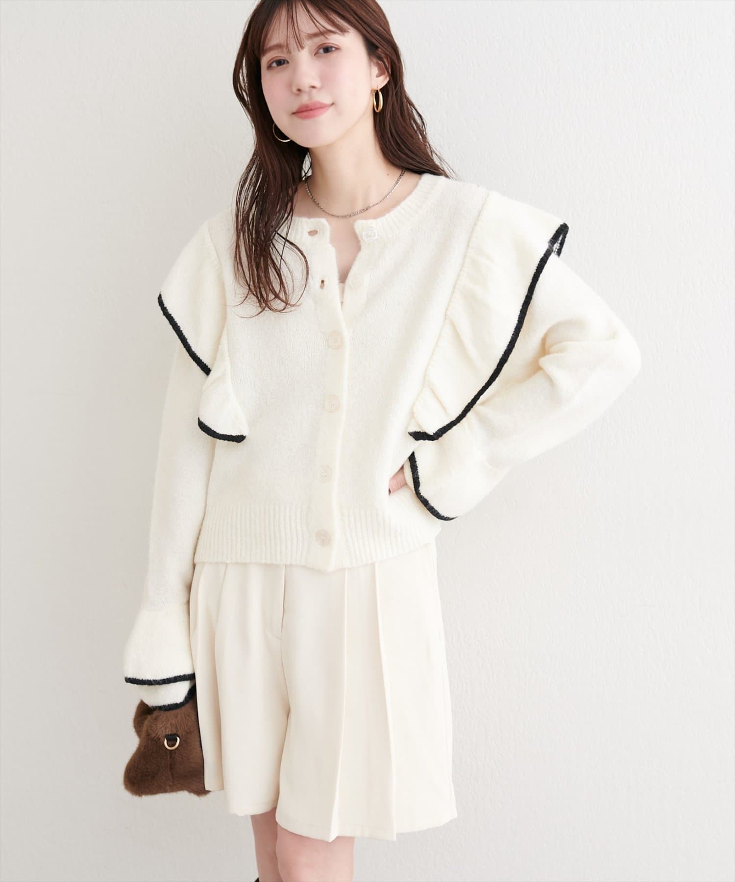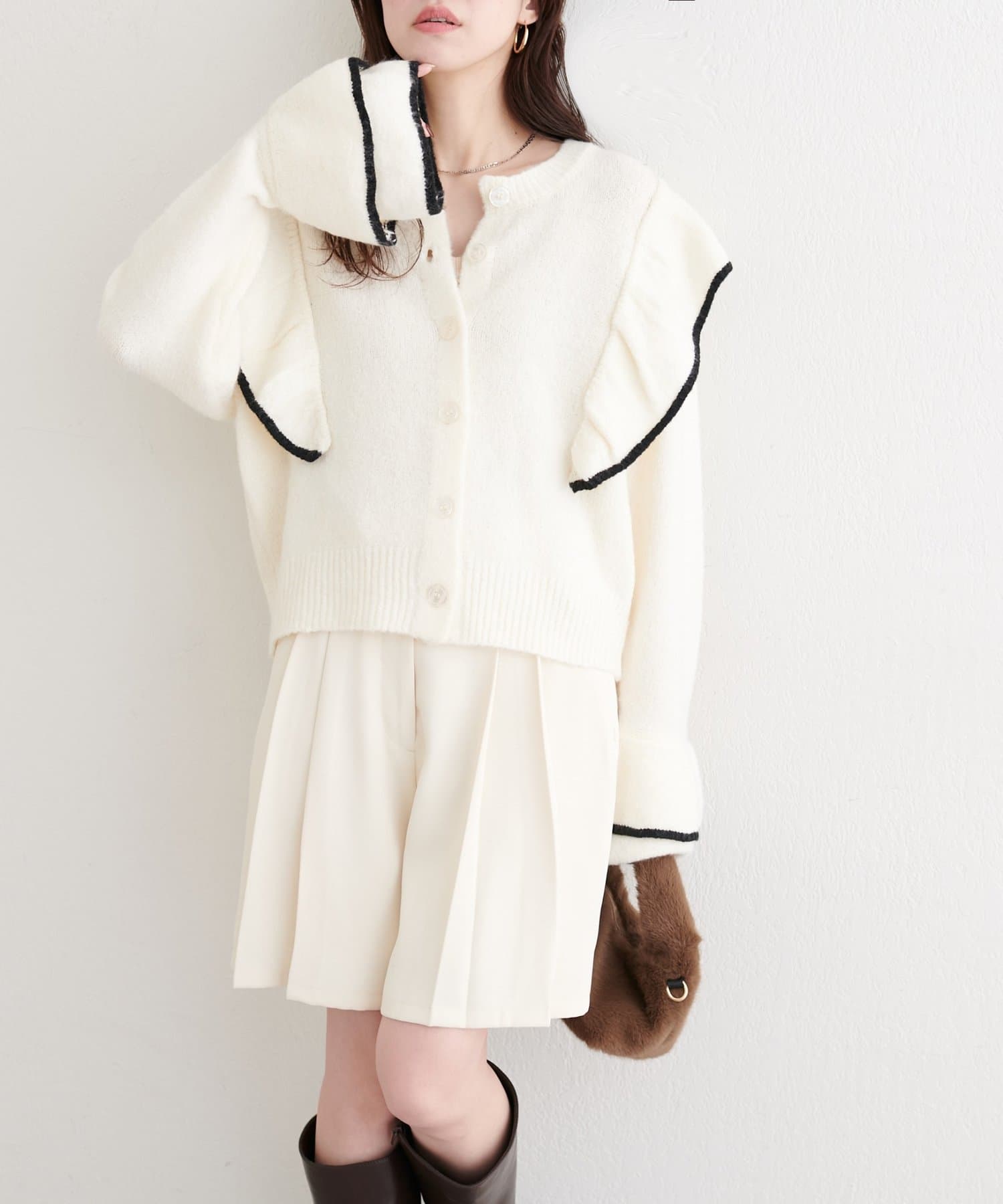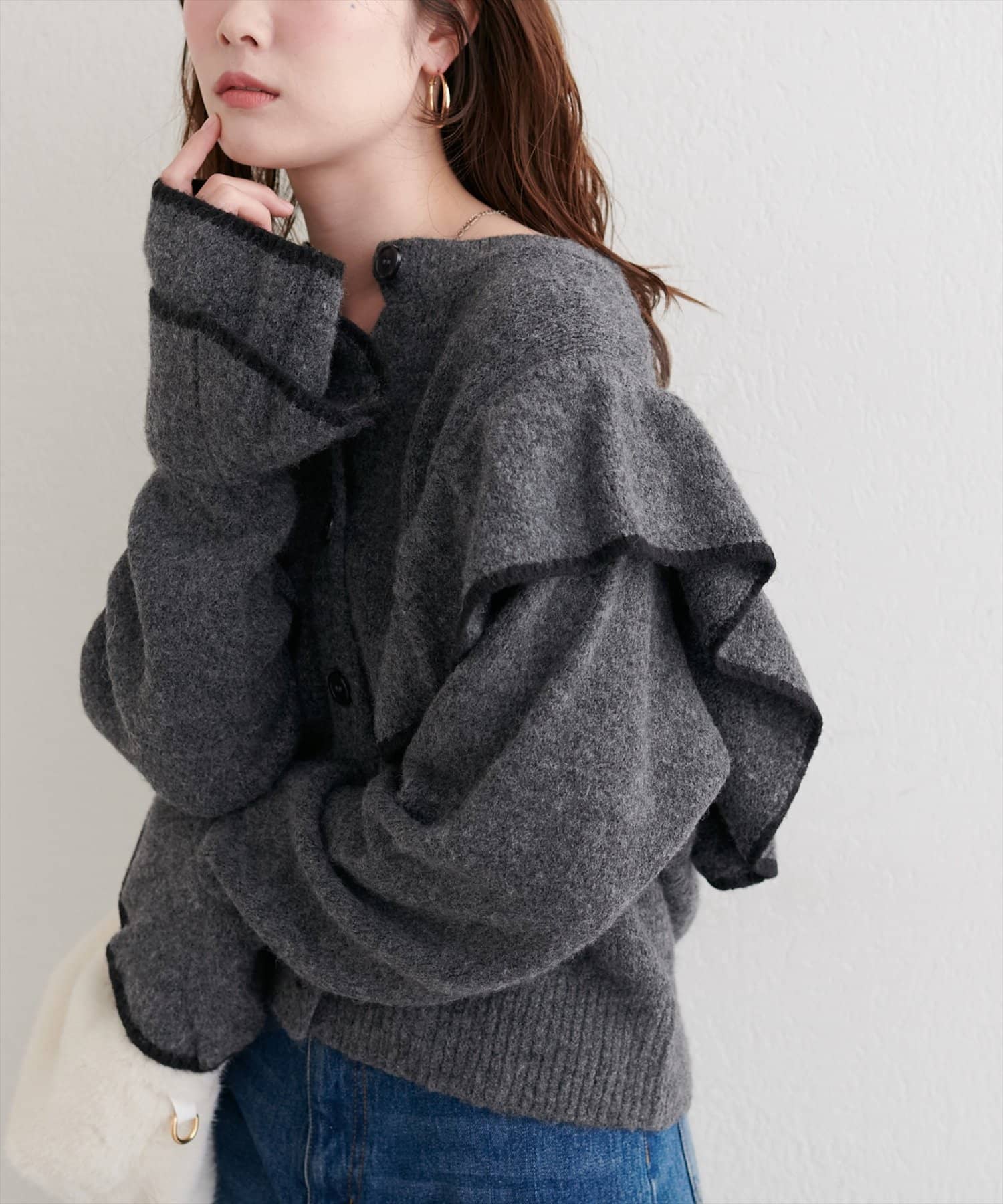 一目で心を奪われる、繊細なフリルが印象的なニットカーディガン。