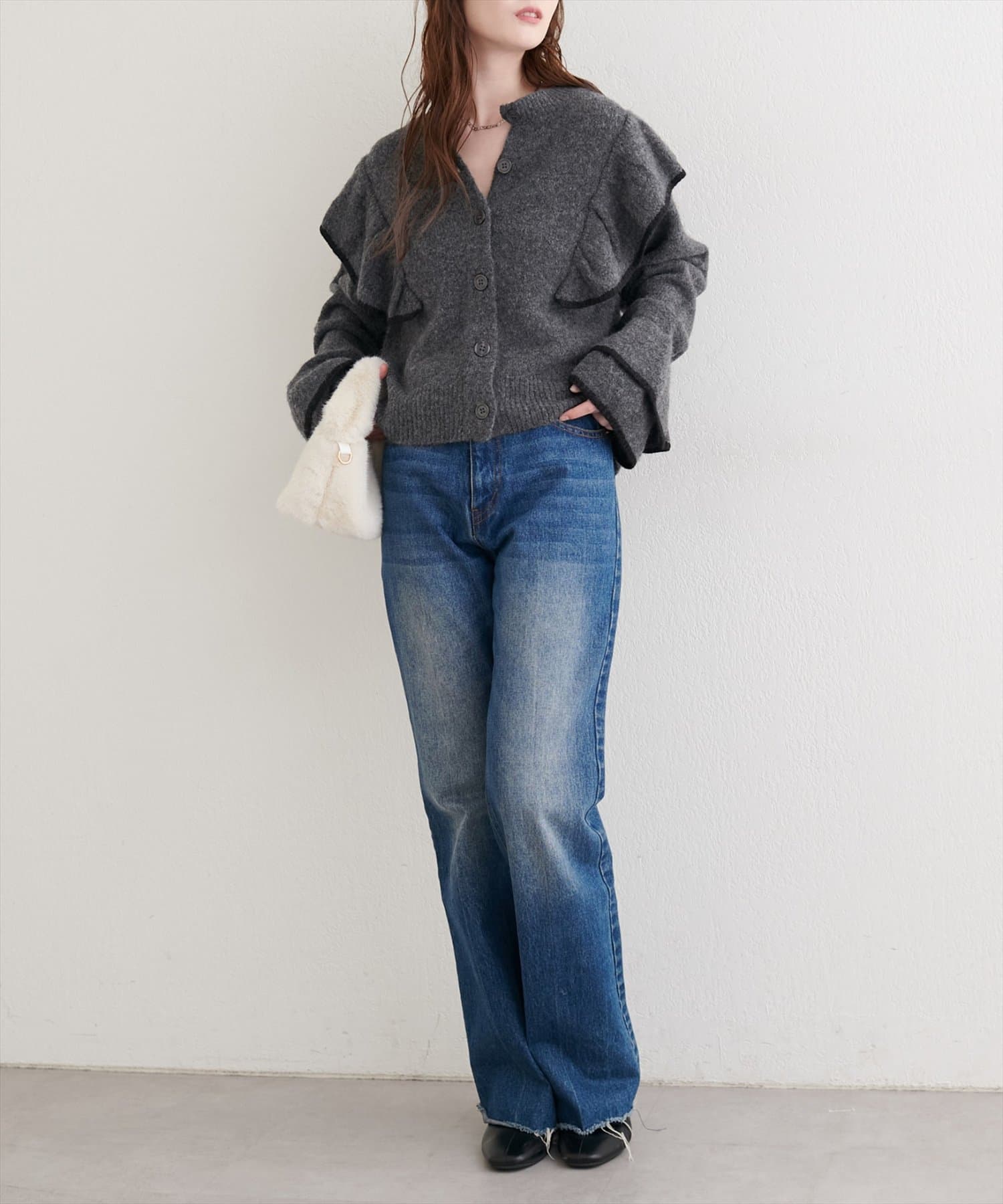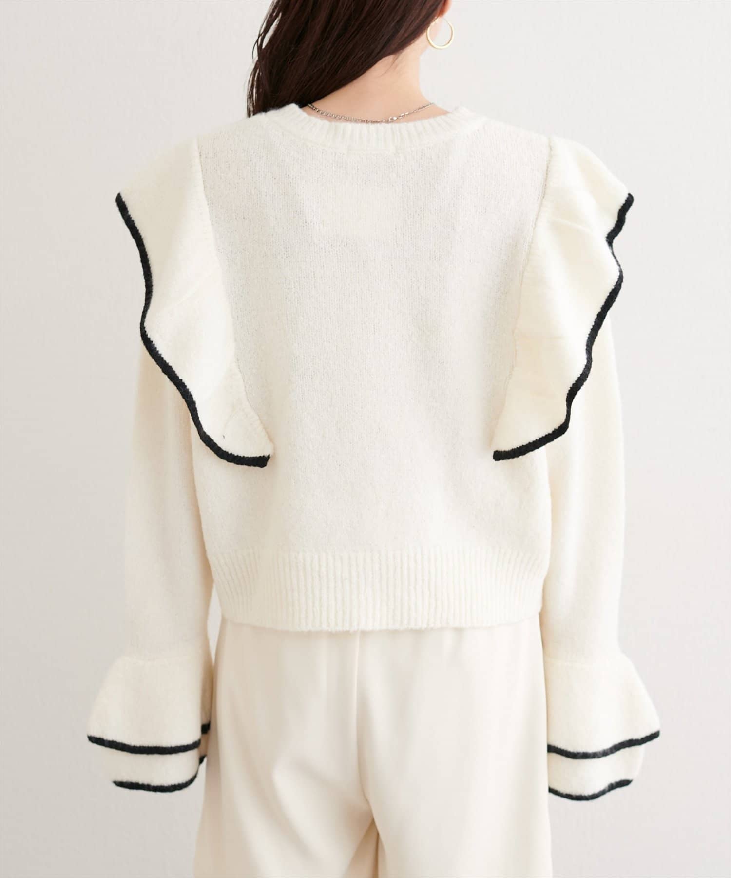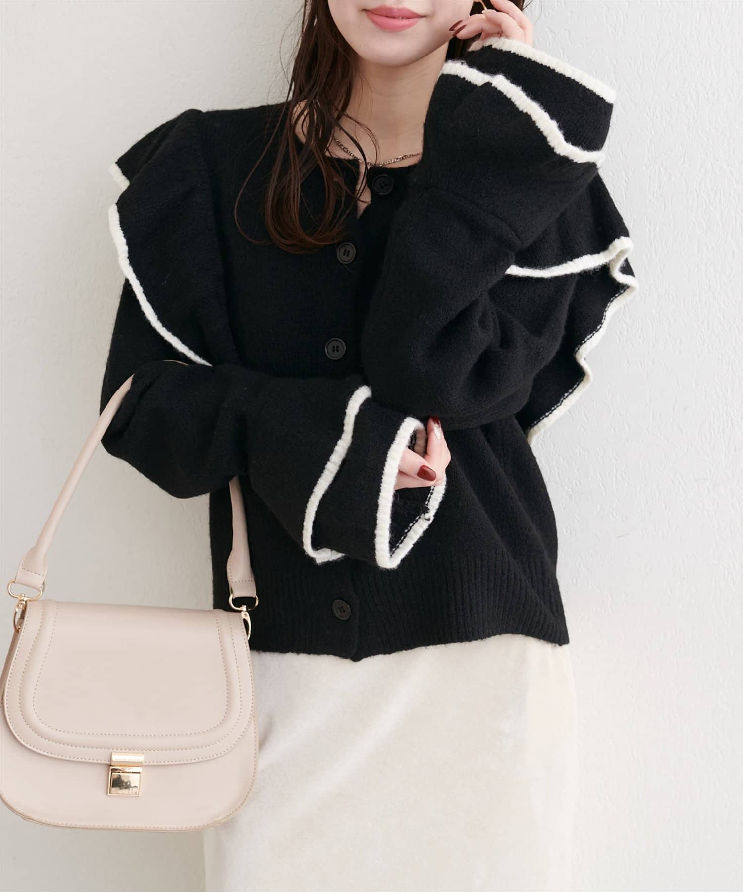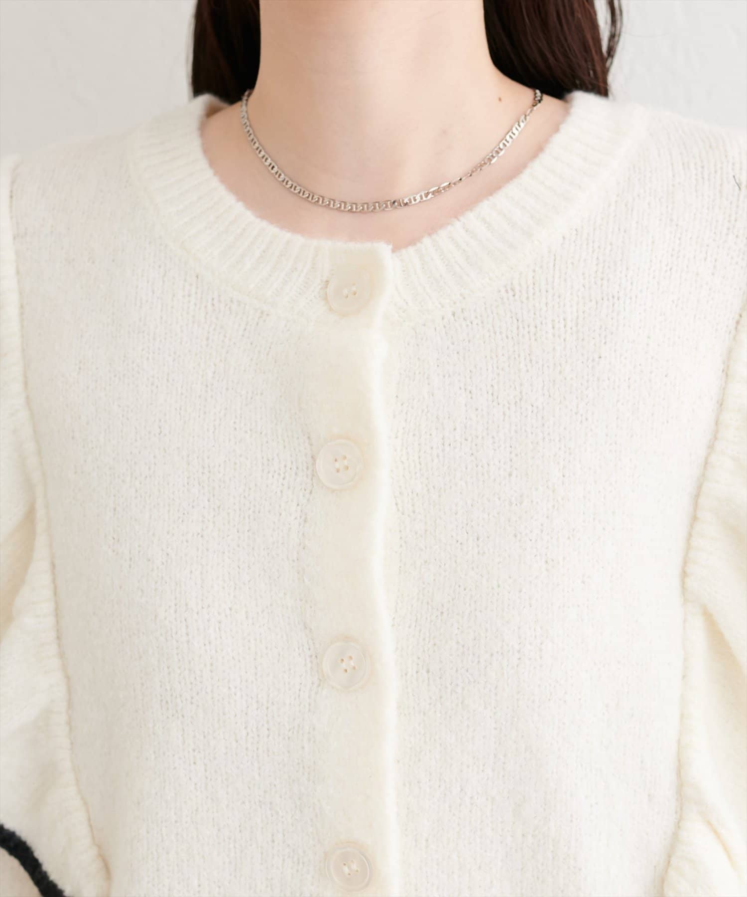 一目で心を奪われる、繊細なフリルが印象的なニットカーディガン。