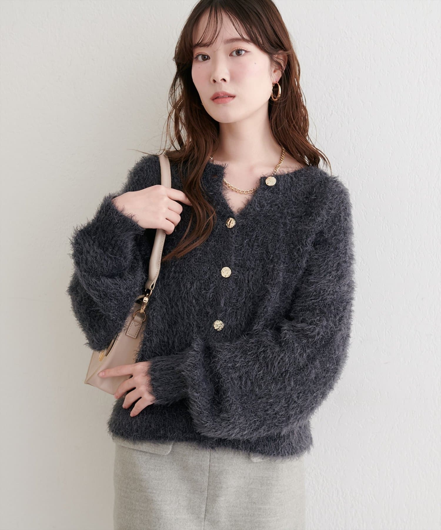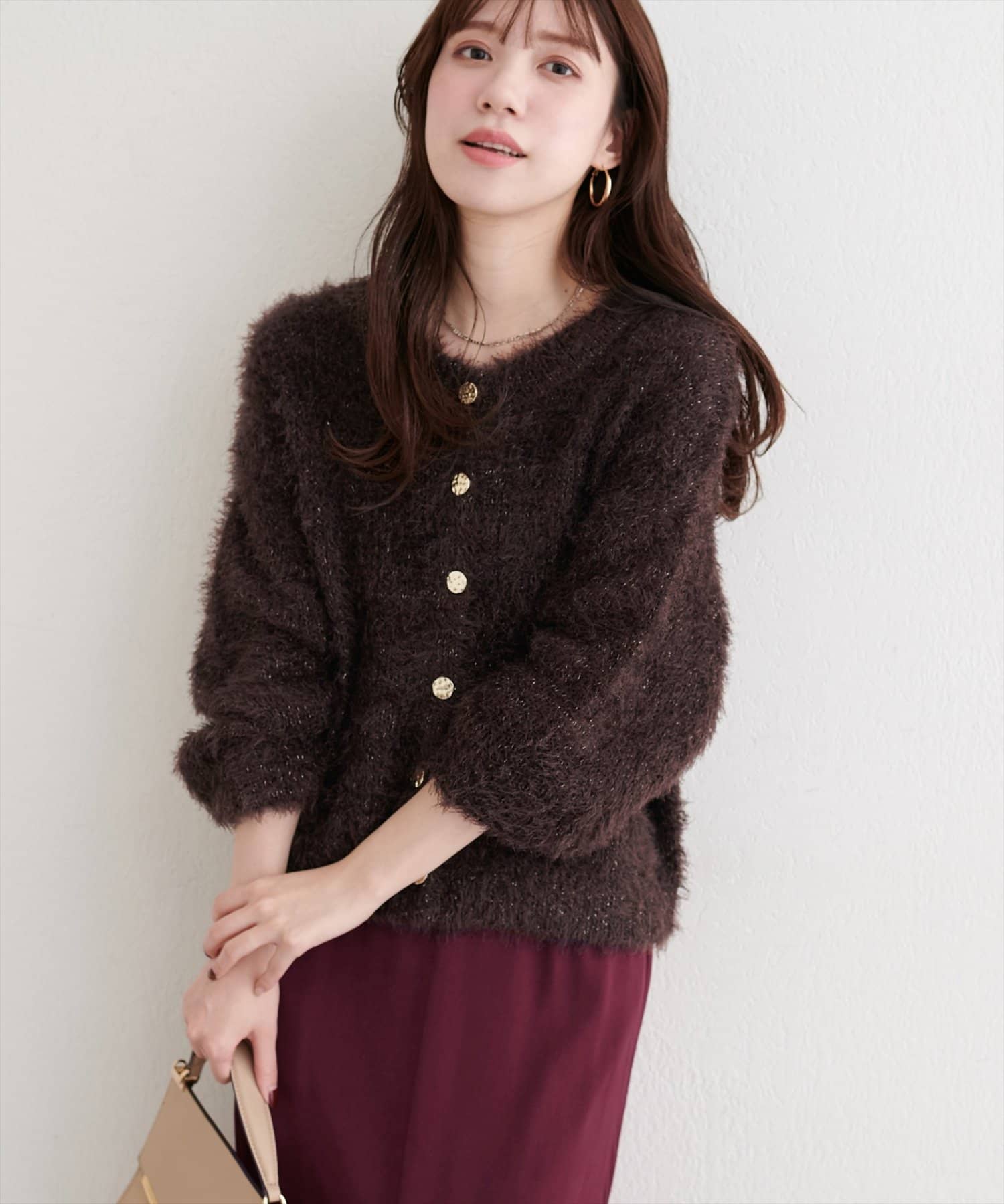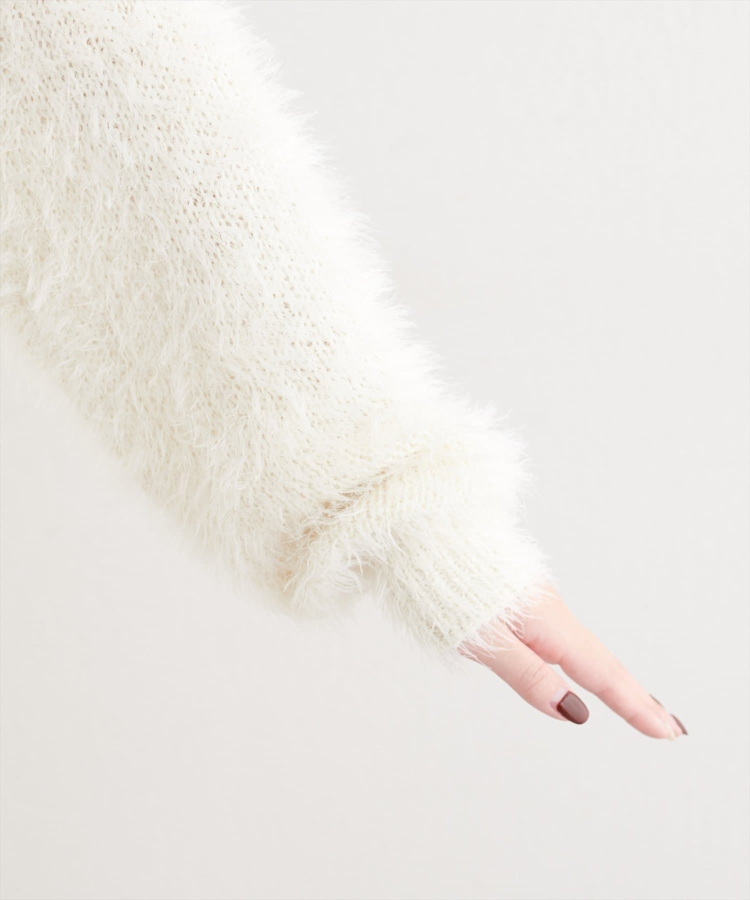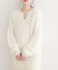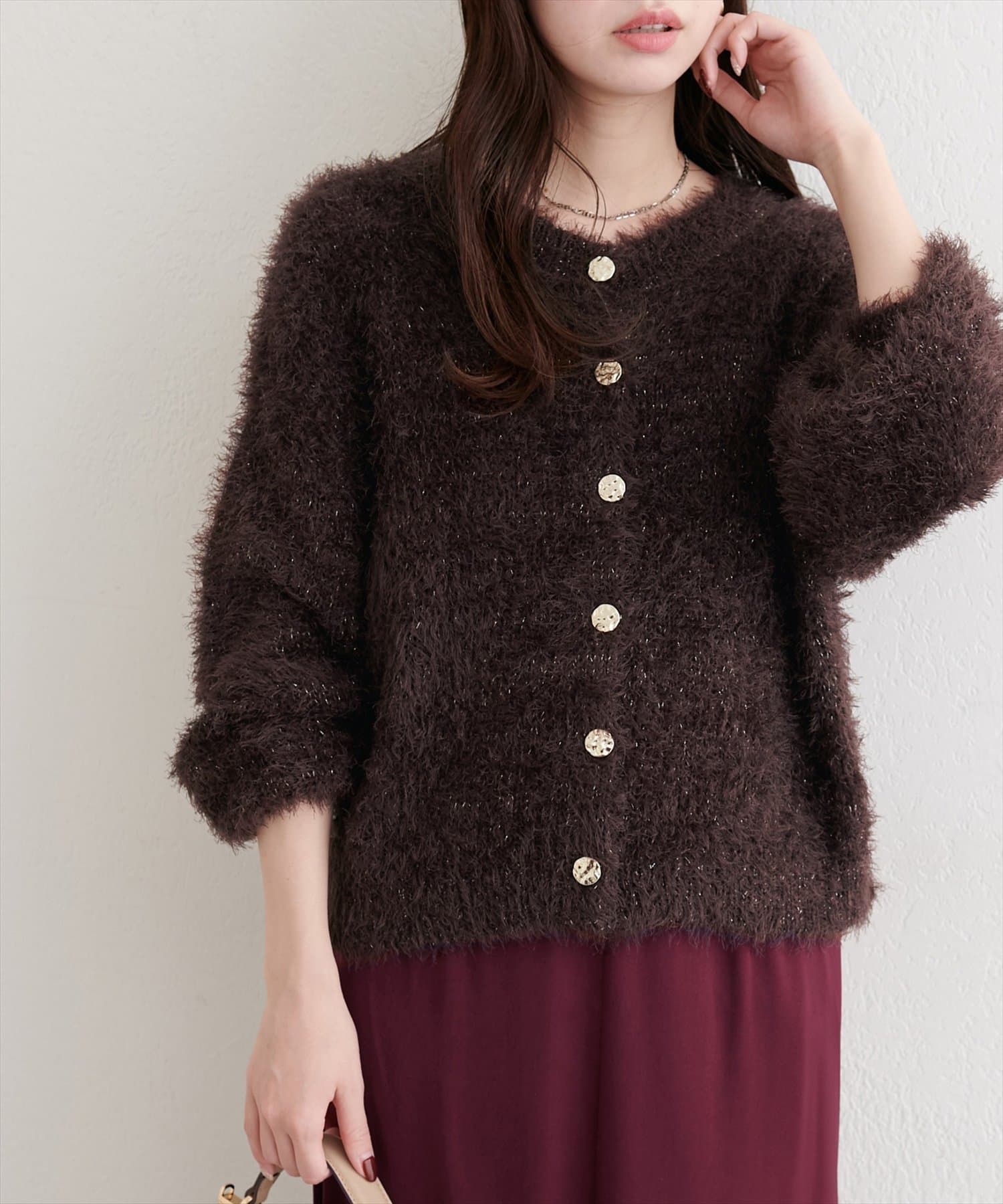 ふんわりとしたフェザーヤーンにラメを織り交ぜ、上品な光沢感をプラスしました。