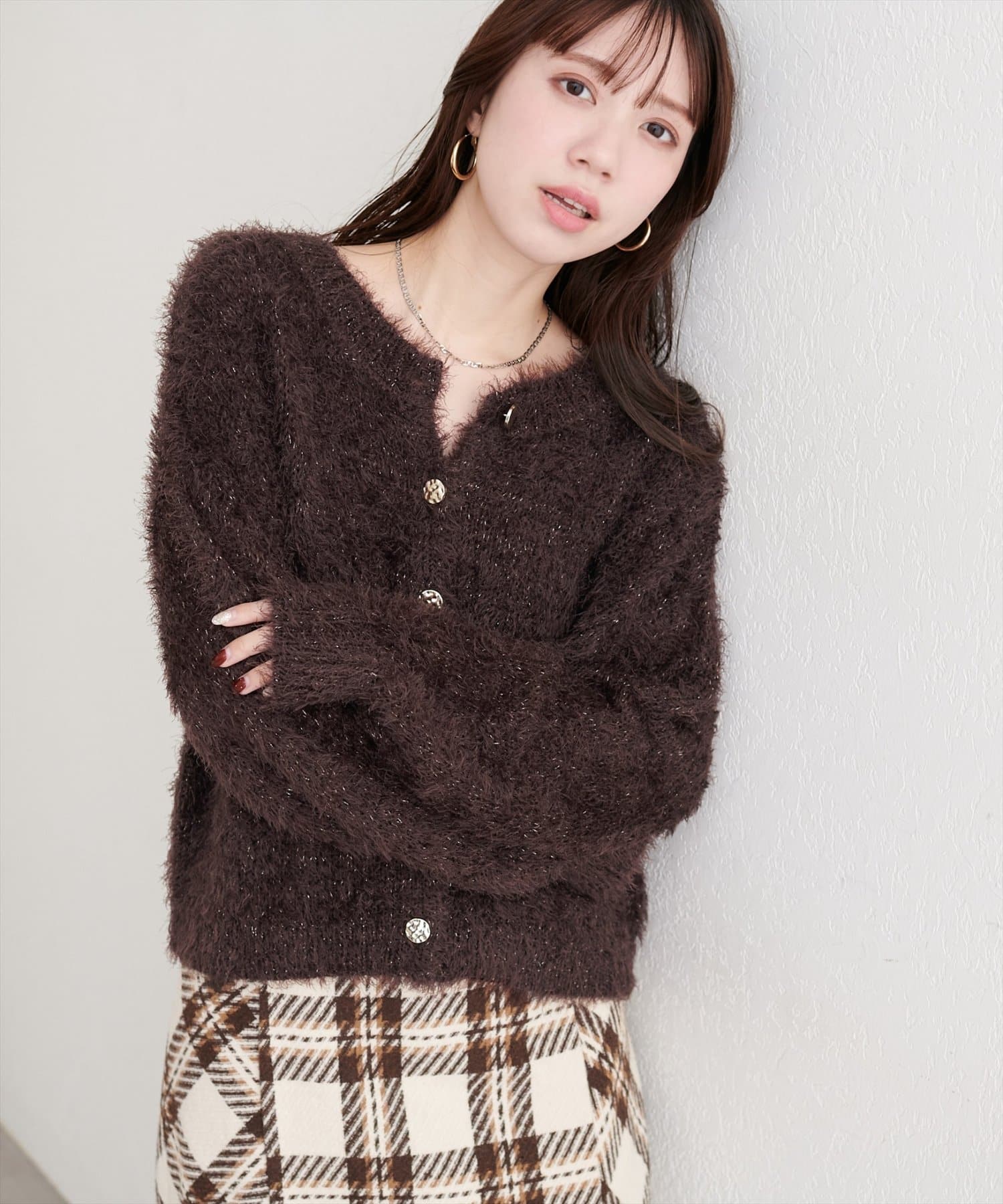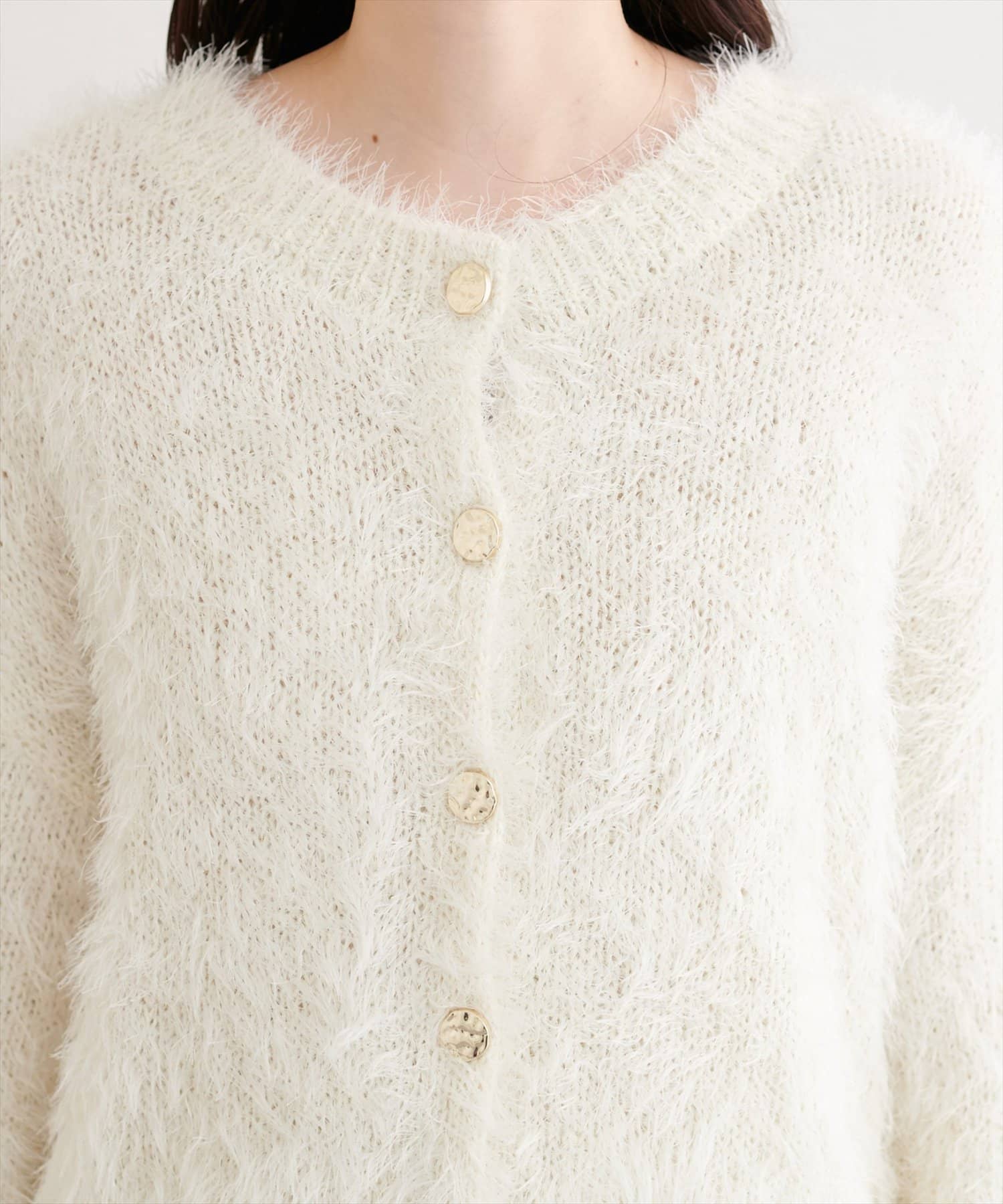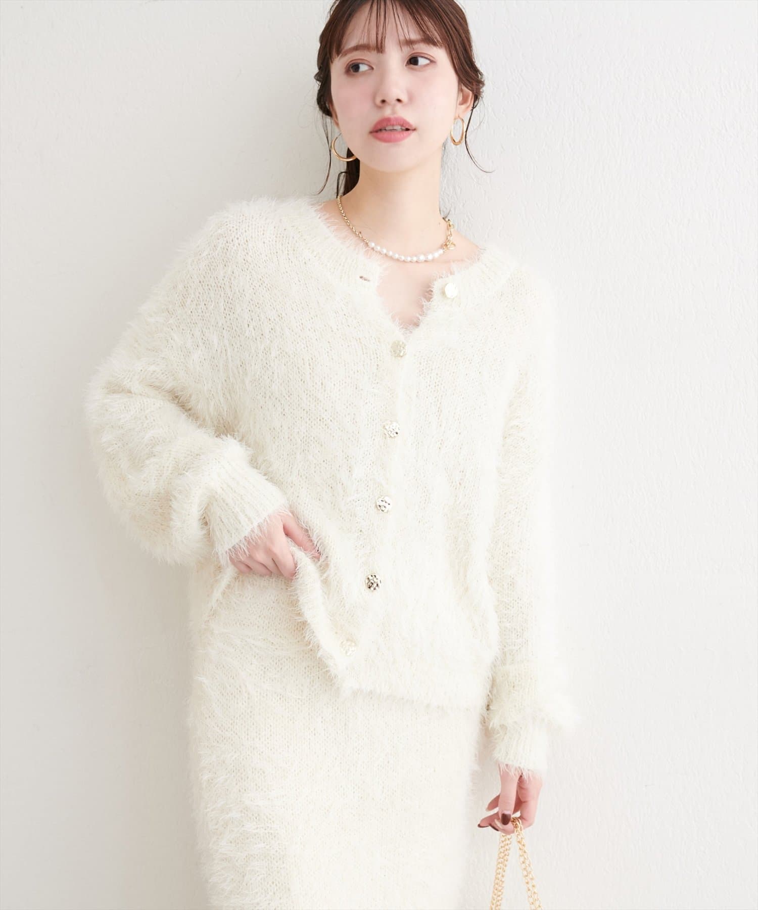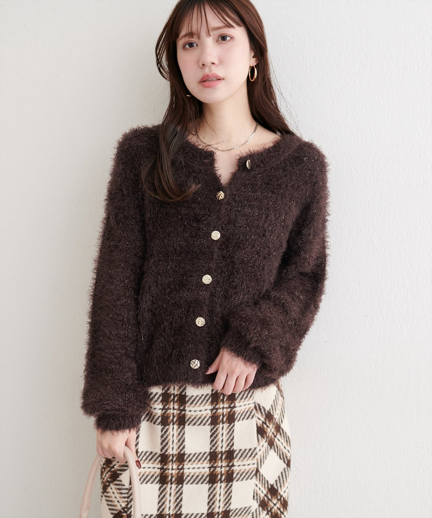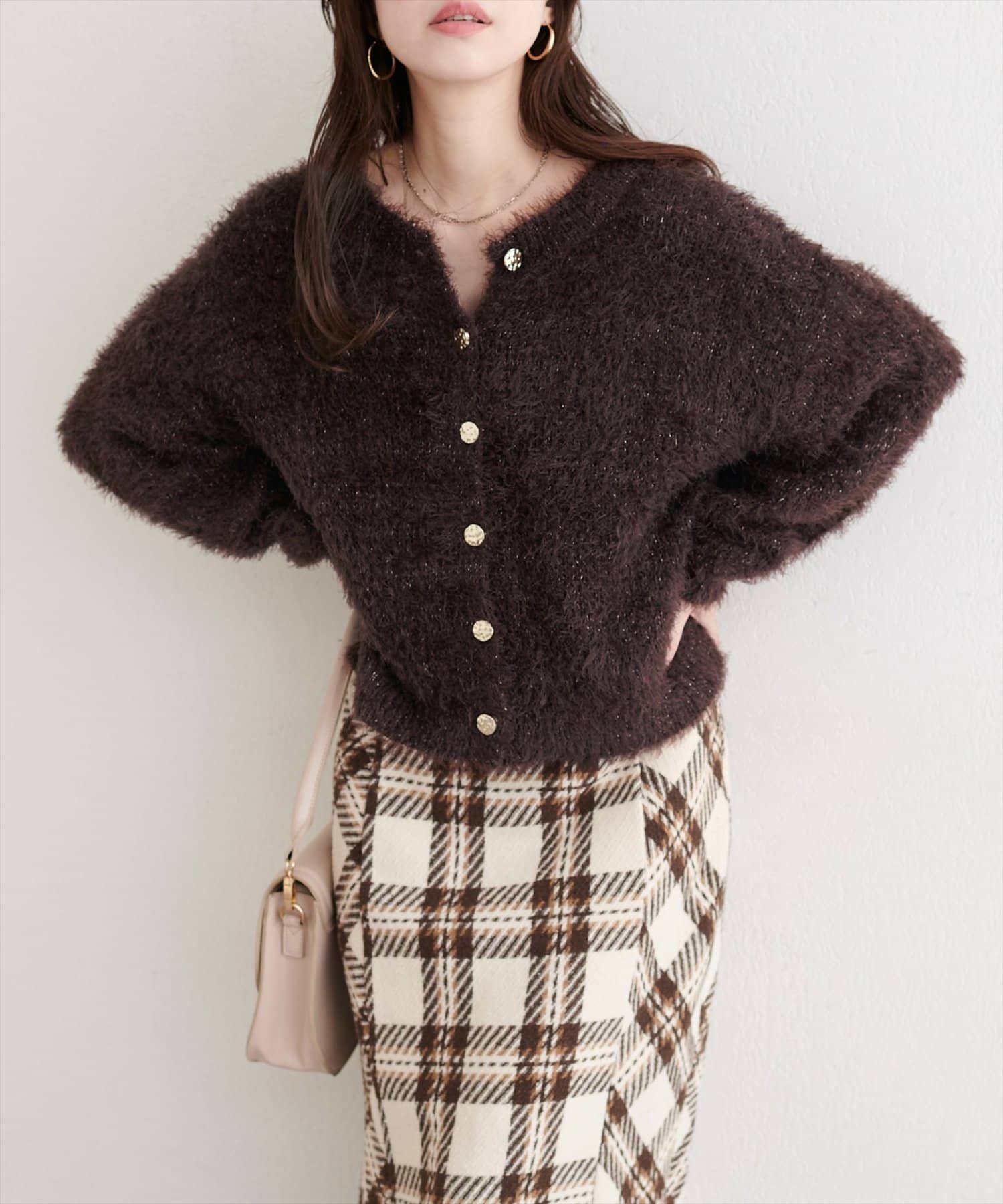 ふんわりとしたフェザーヤーンにラメを織り交ぜ、上品な光沢感をプラスしました。