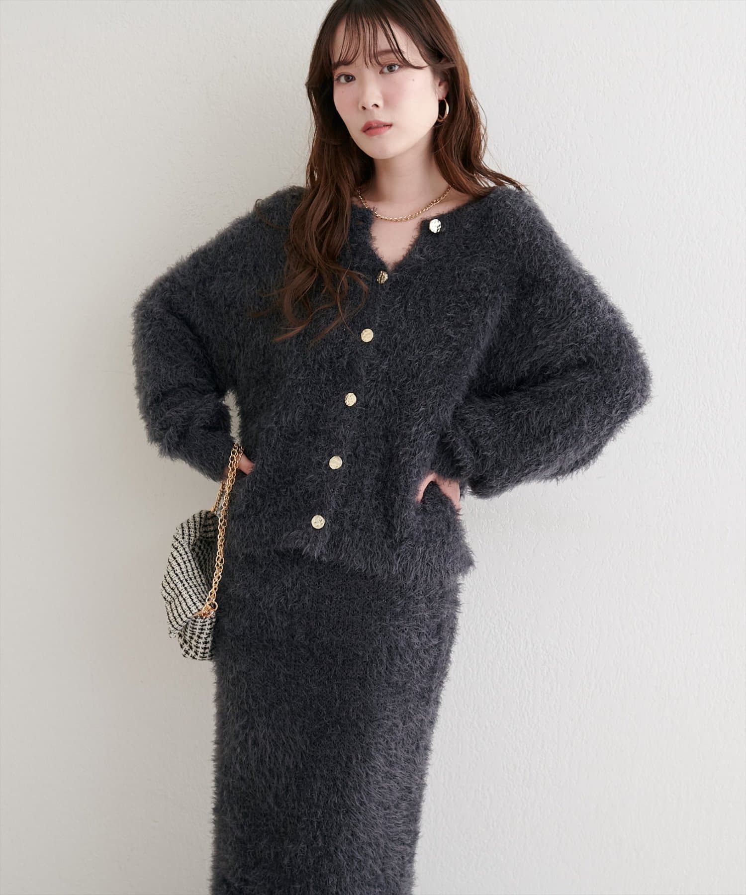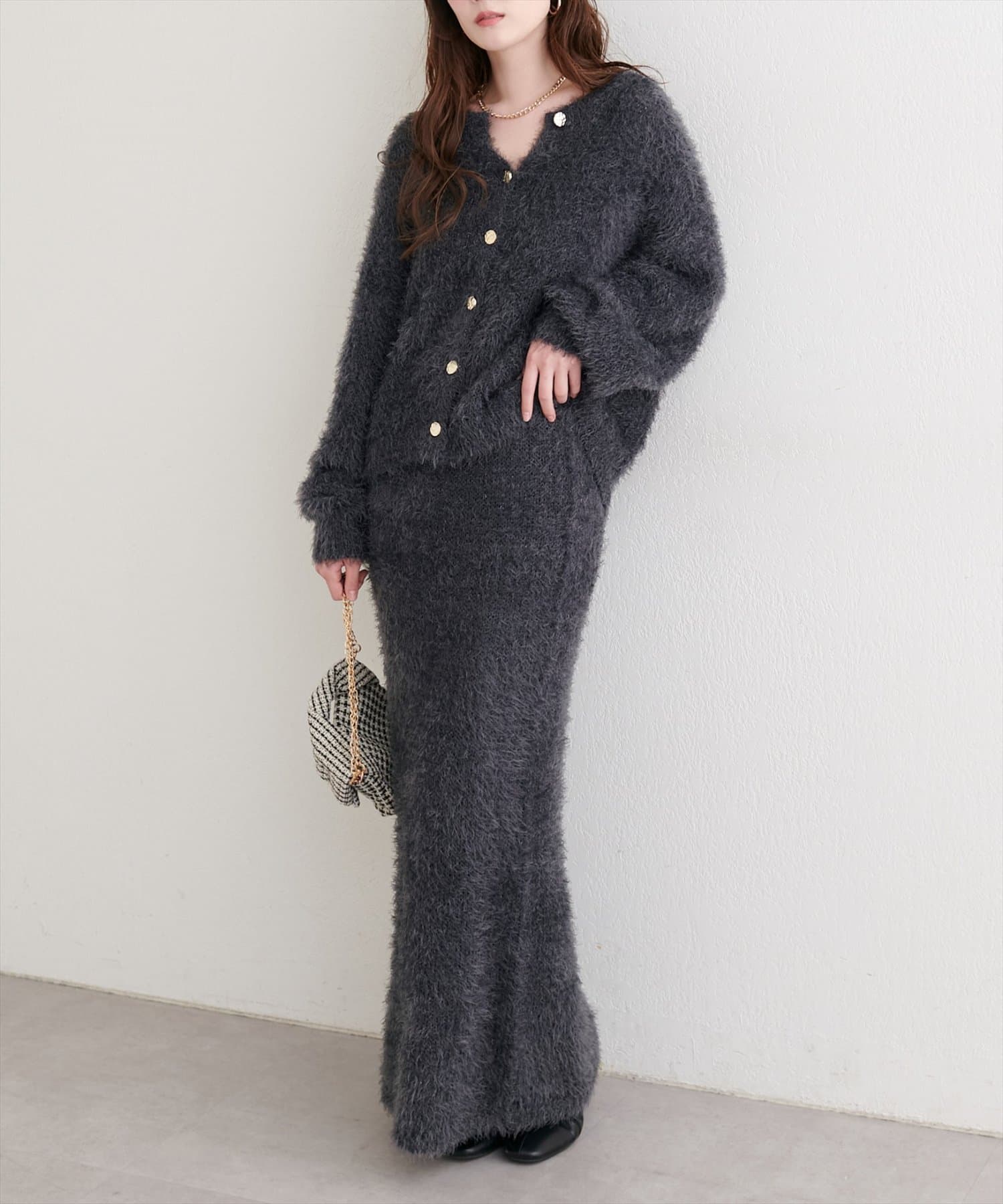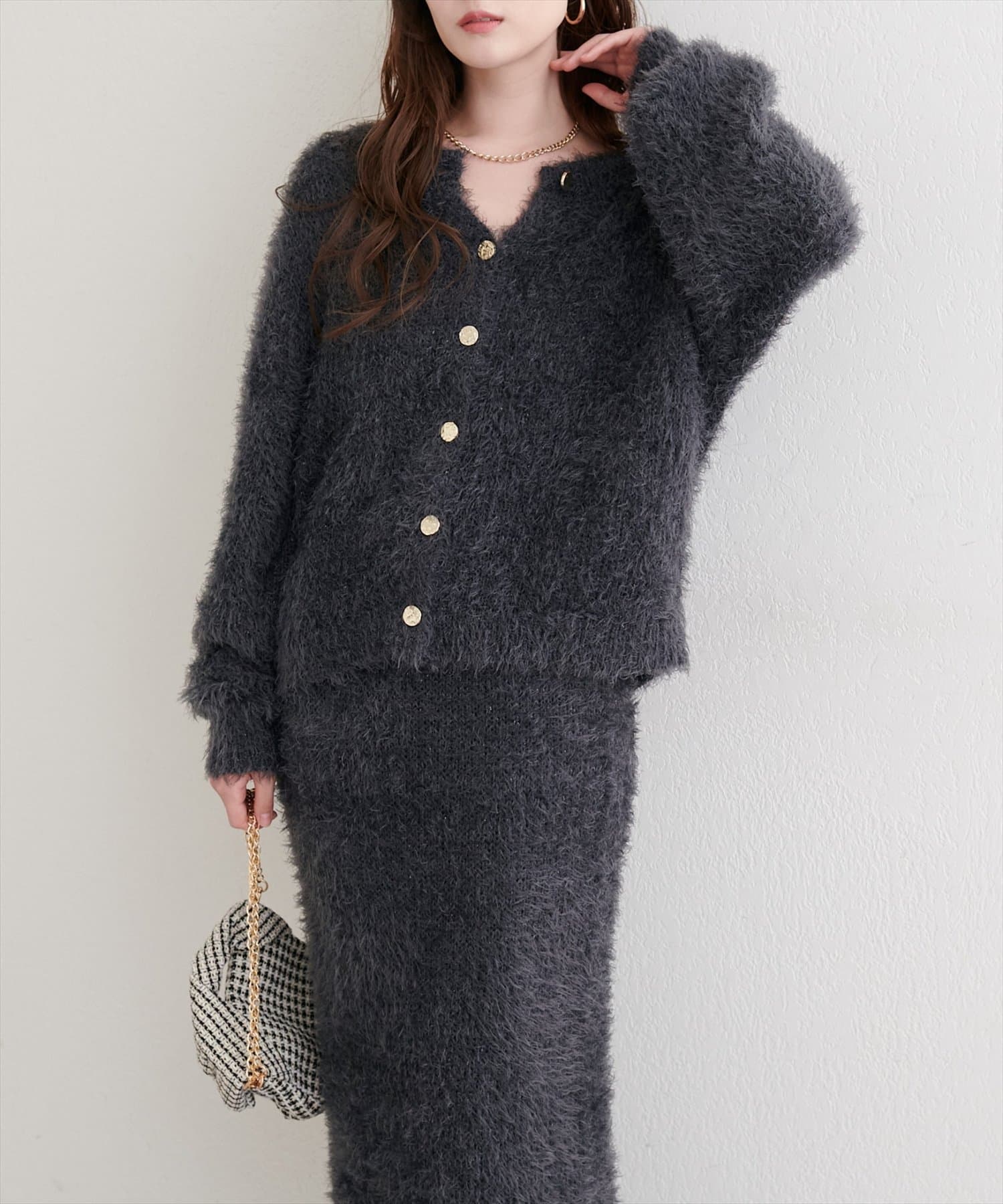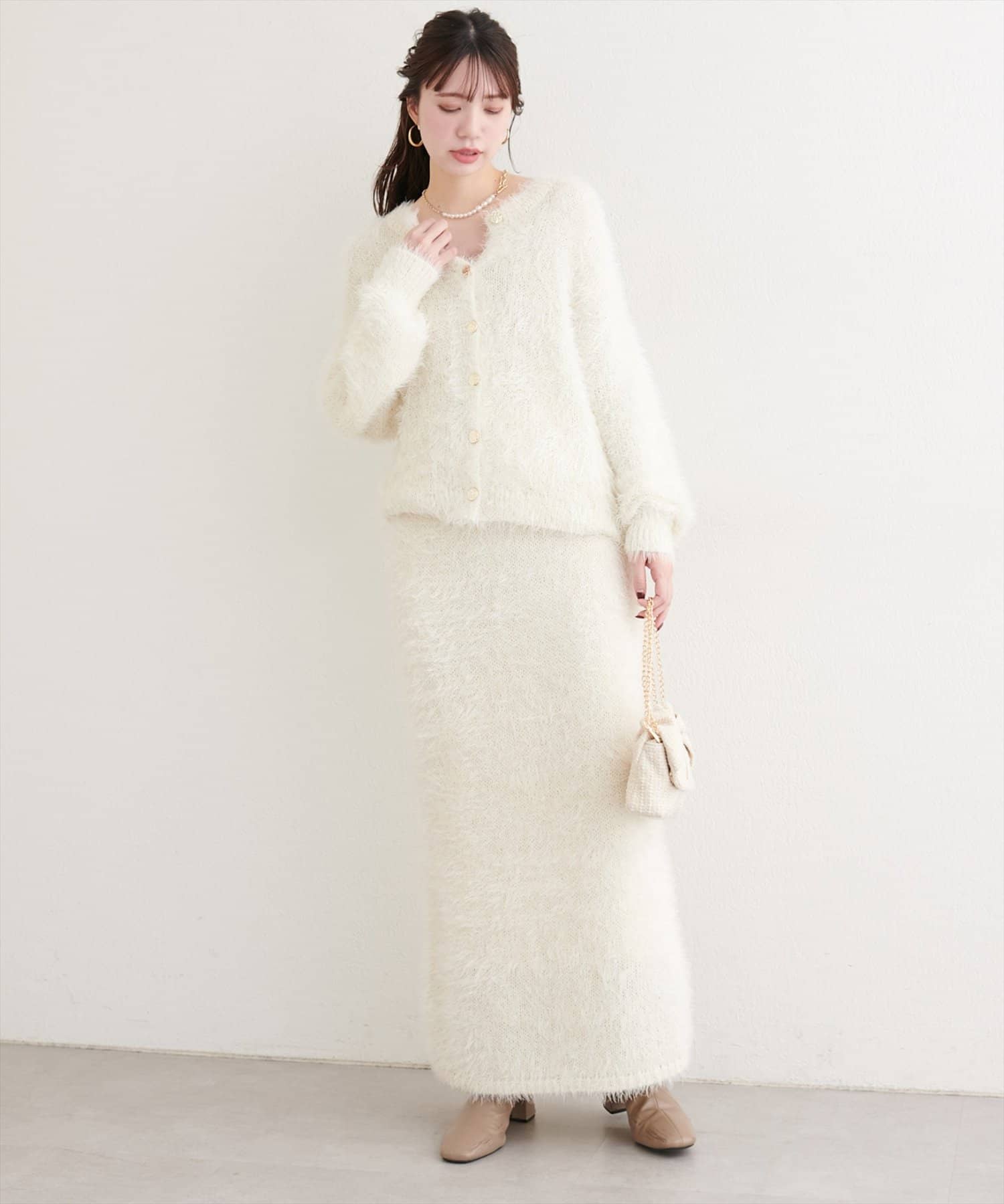 0352010860 ラメフェザータイトスカートとセットアップ風に合わせるとこなれ感がUP◎