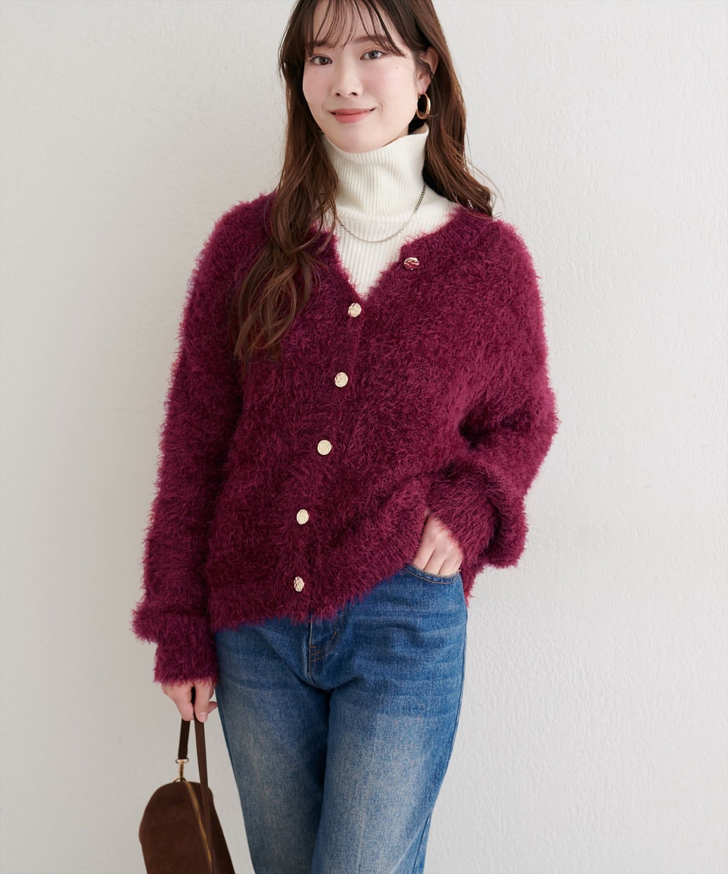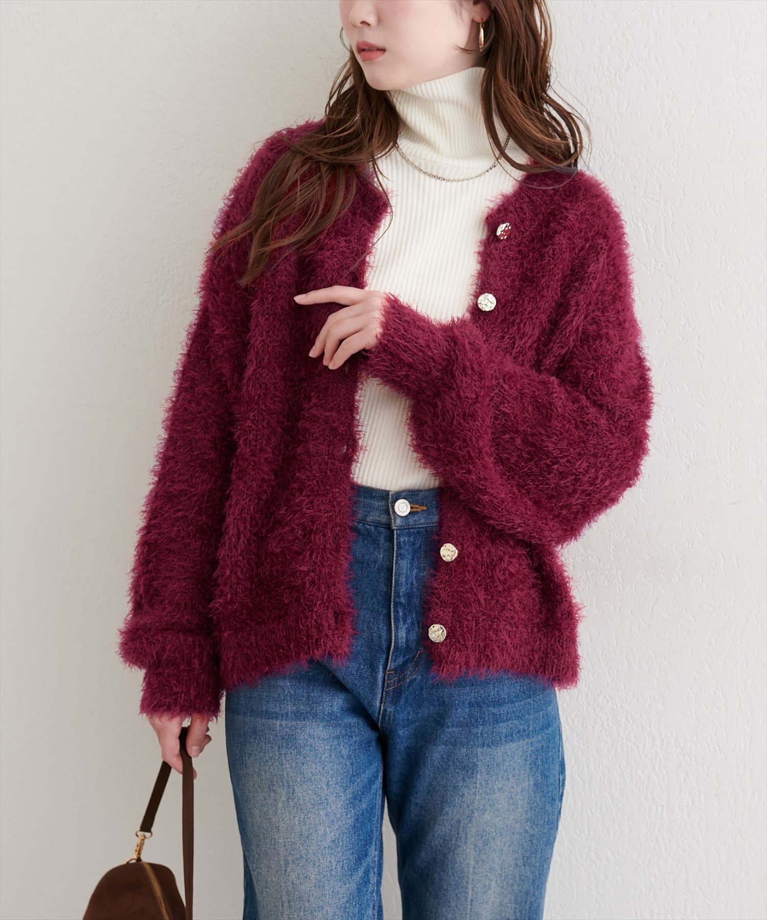 インナーにタートルネックをレイヤードして、暖かく着こなすのもおすすめです。