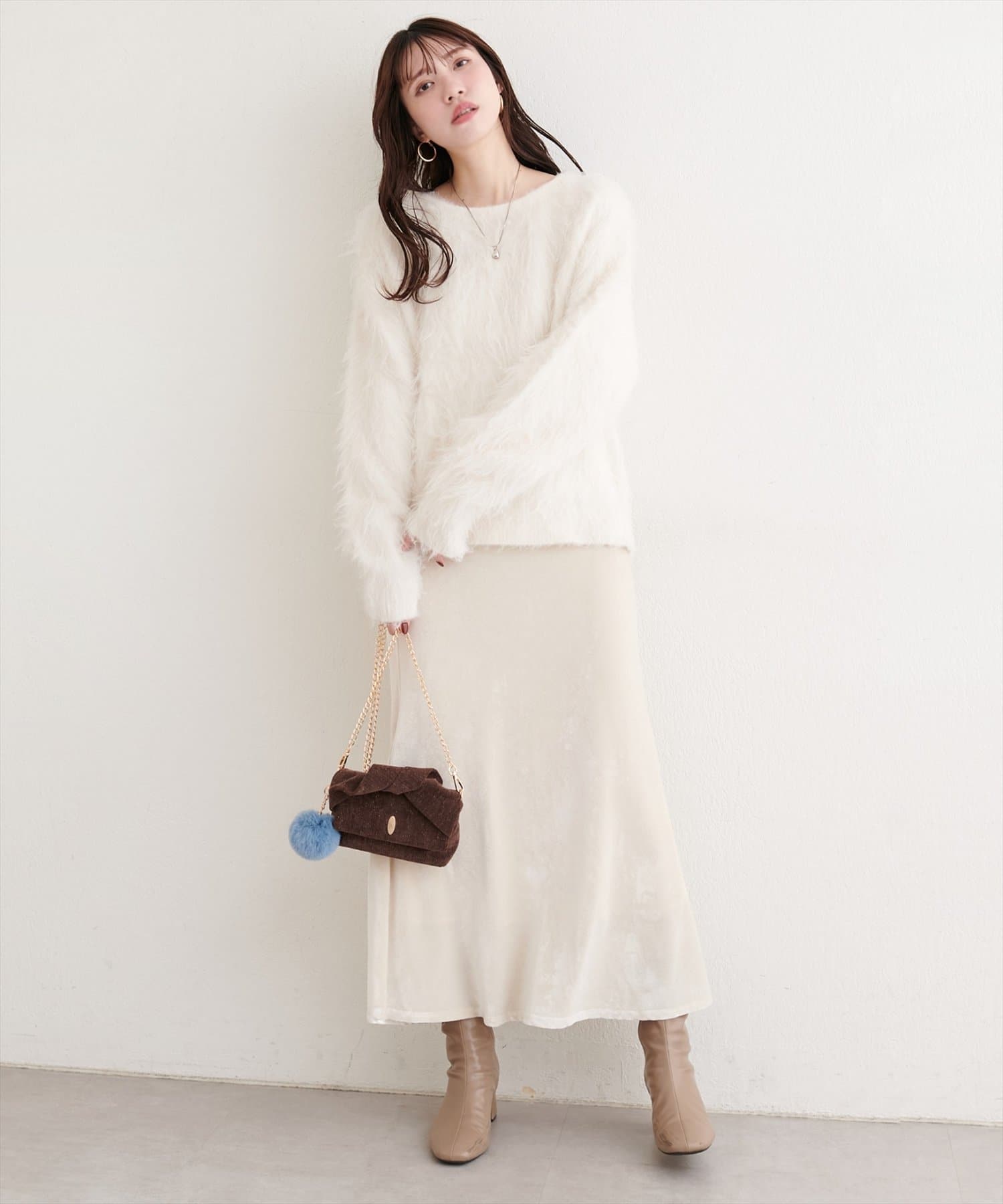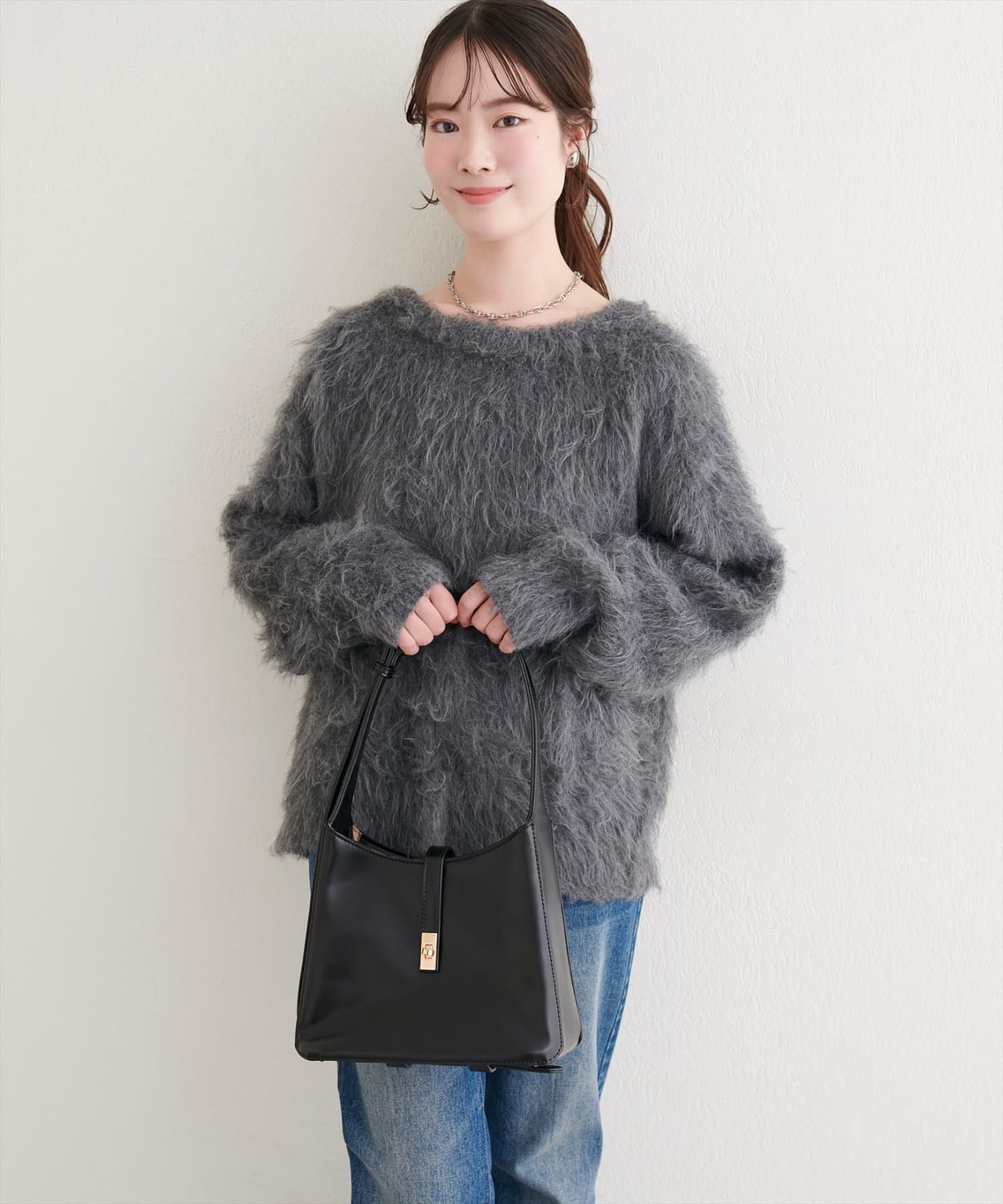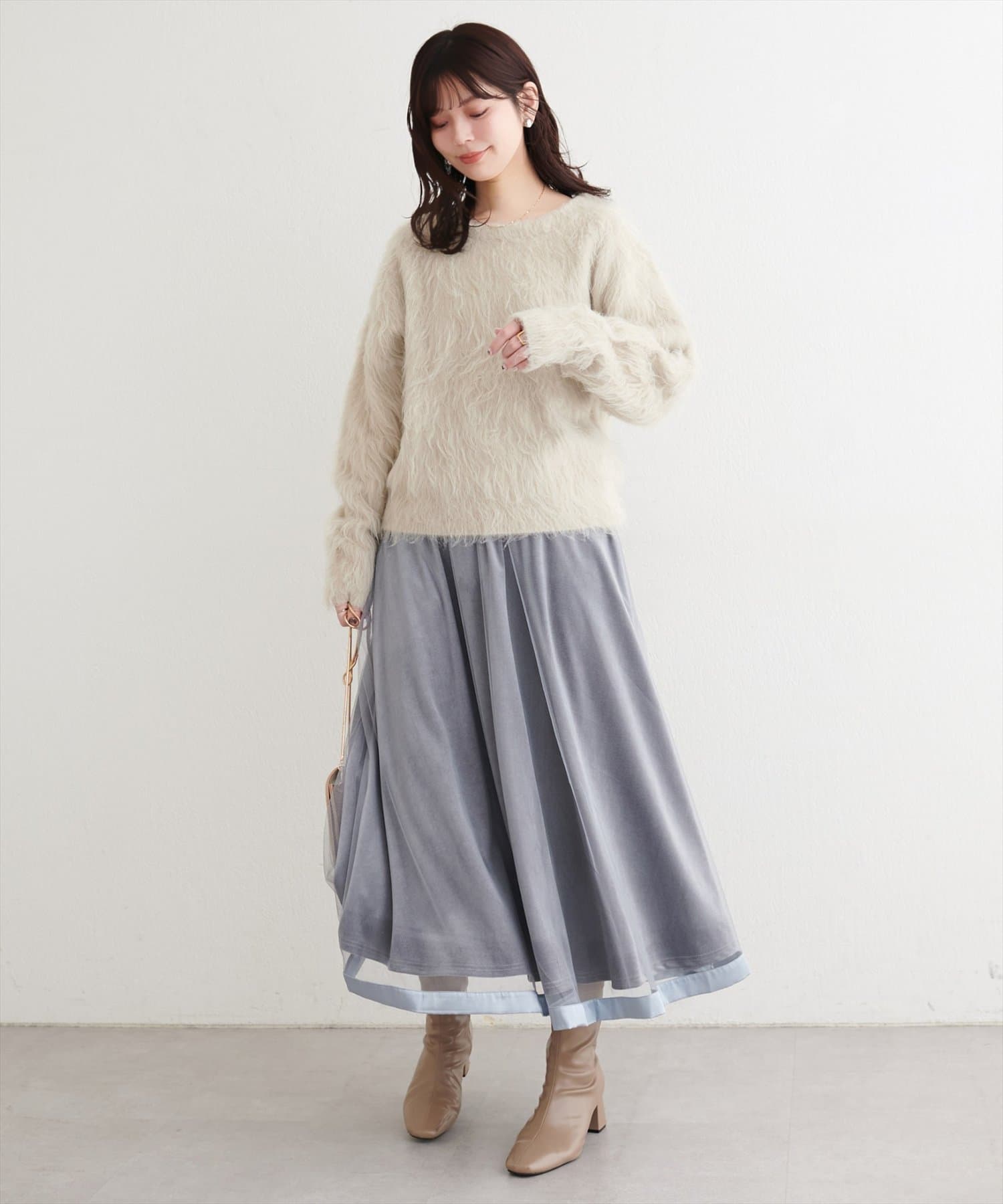 きれいめな着こなしには、タイトスカートやフレアスカートと合わせて、上品な印象に。