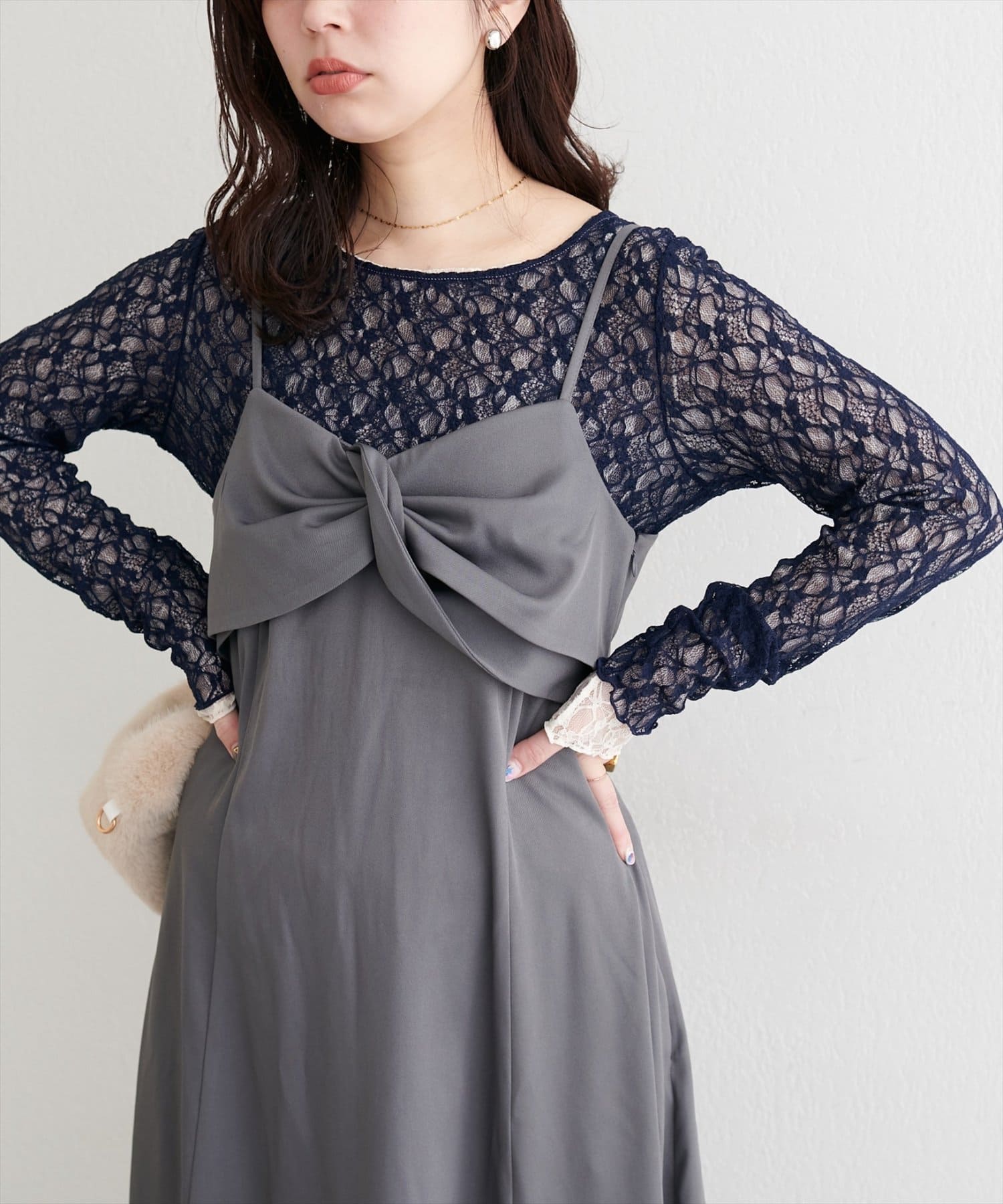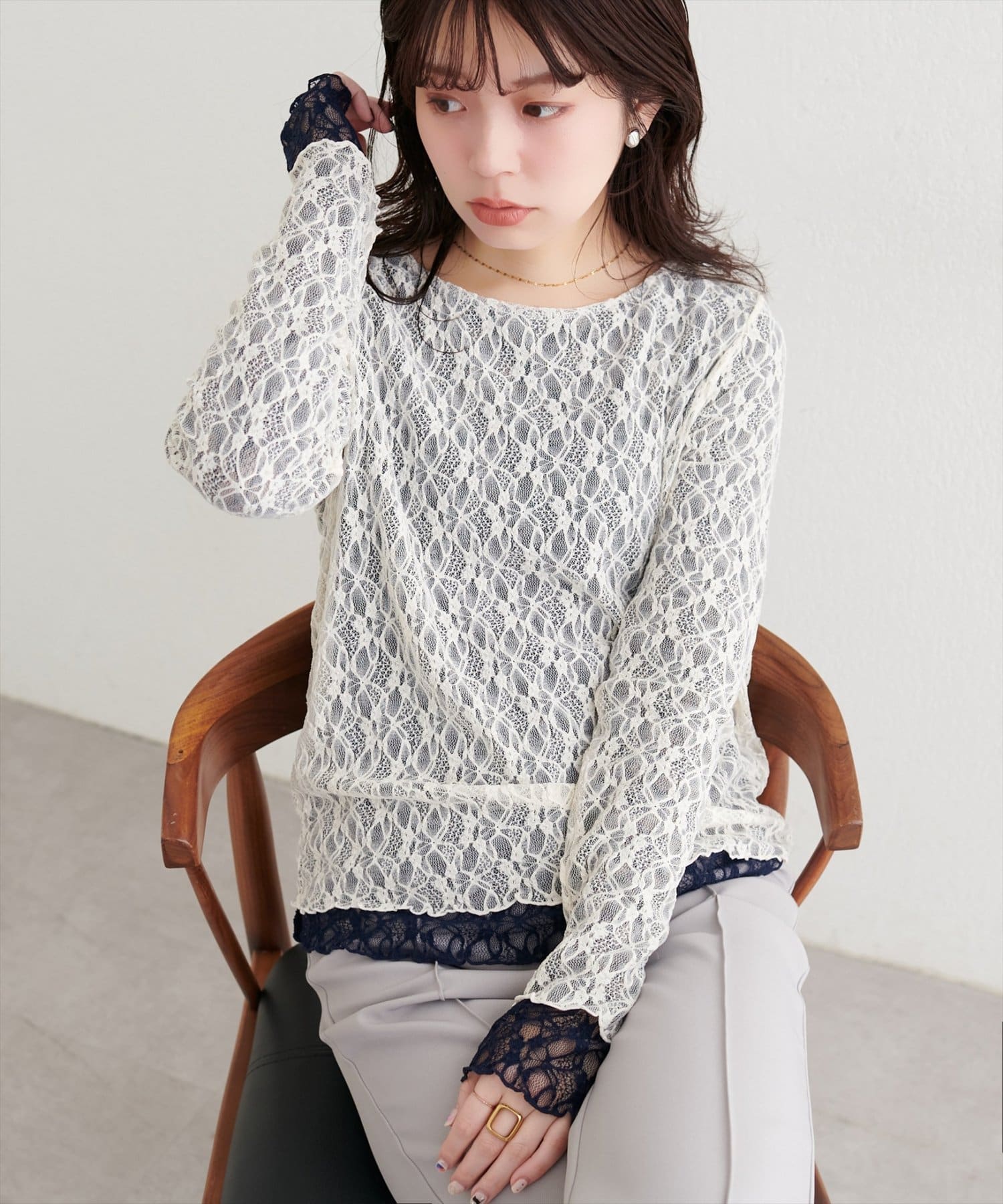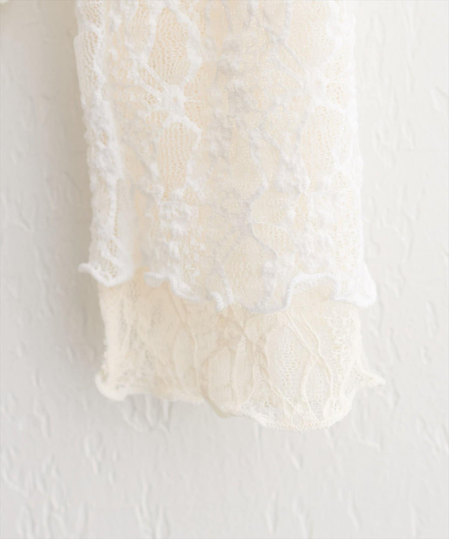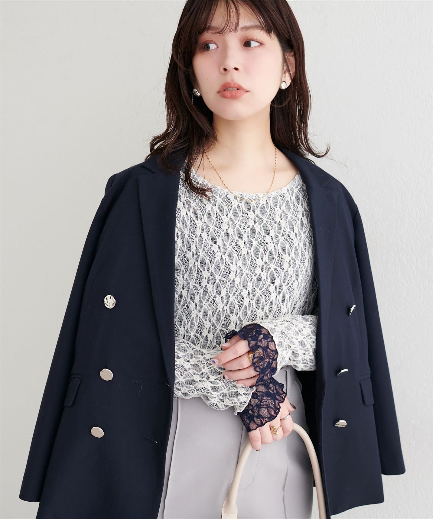 上品な肌見せが、女性らしさを引き立てます。袖口のさりげないレース使いもポイント。