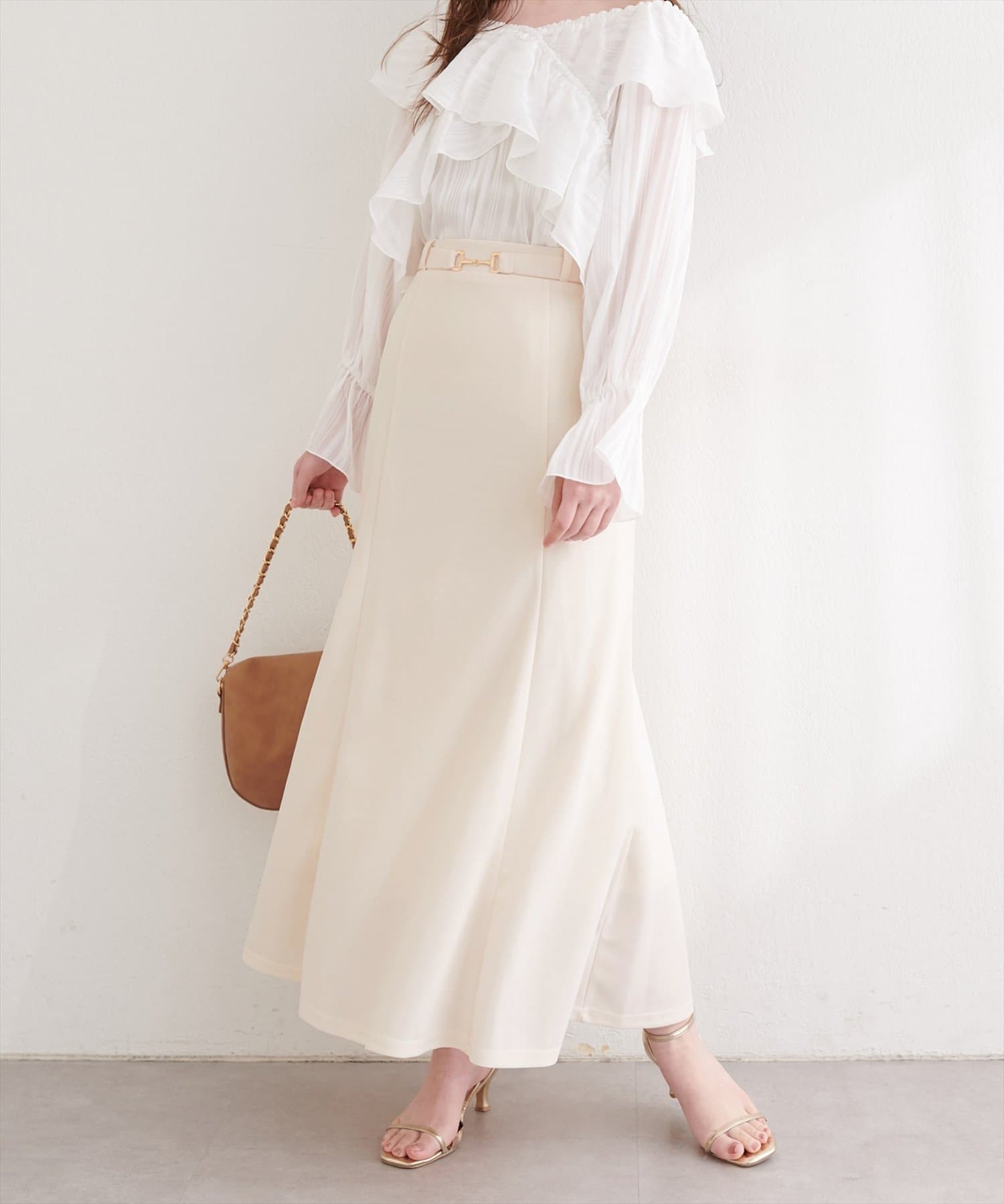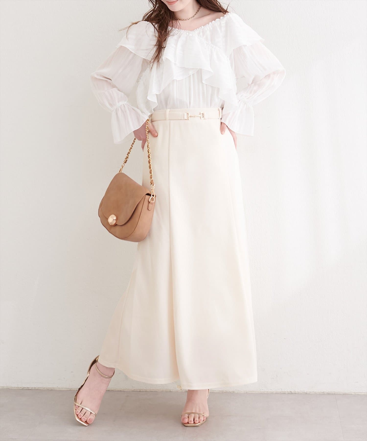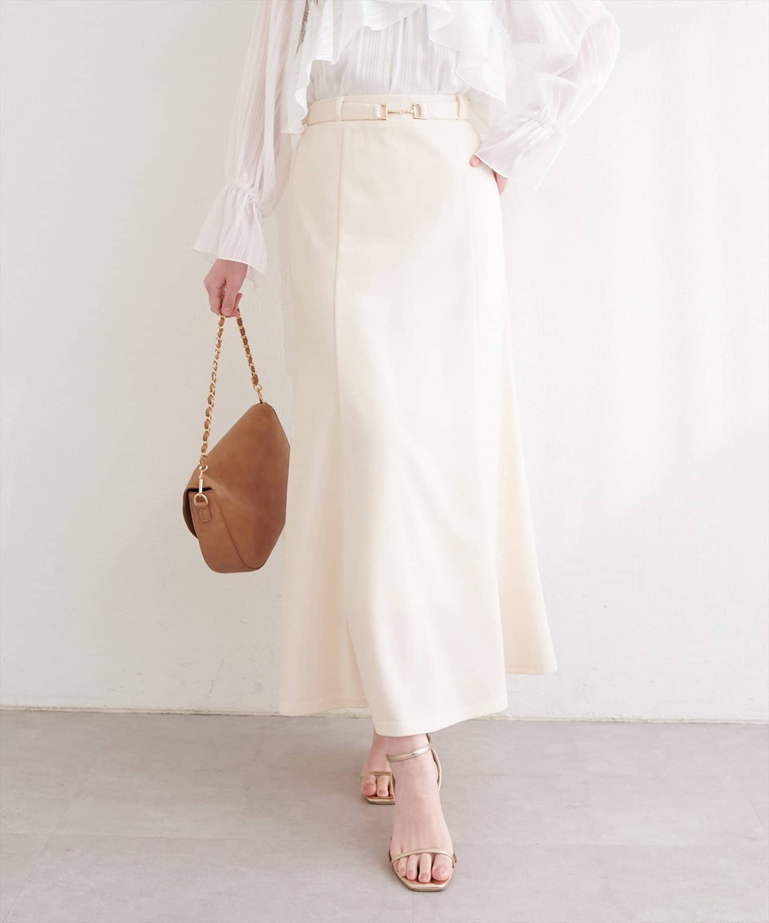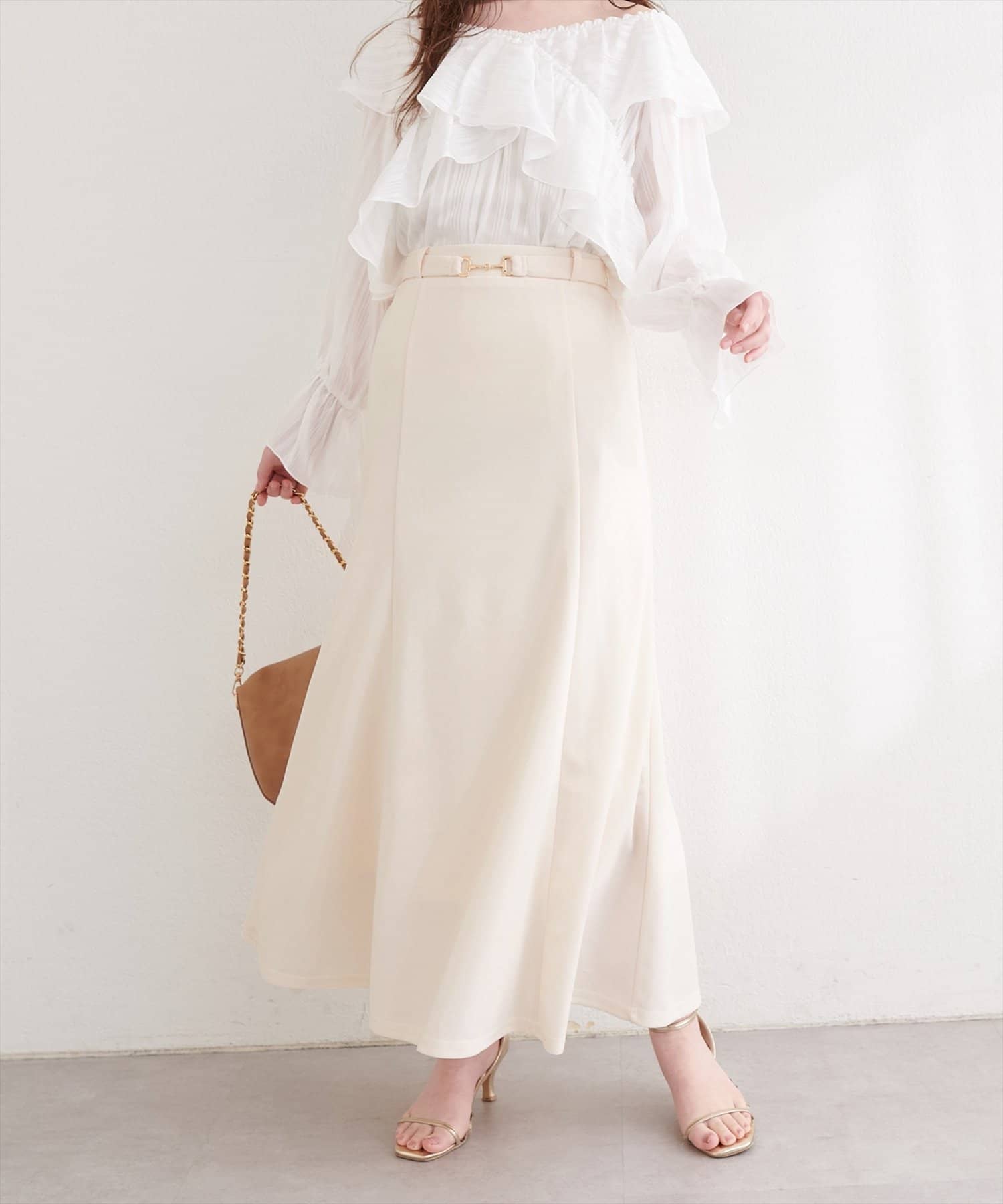 すっきりとしたIラインシルエットと、裾にかけて緩やかに広がるフレアが、女性らしい上品な印象を与えてくれます。