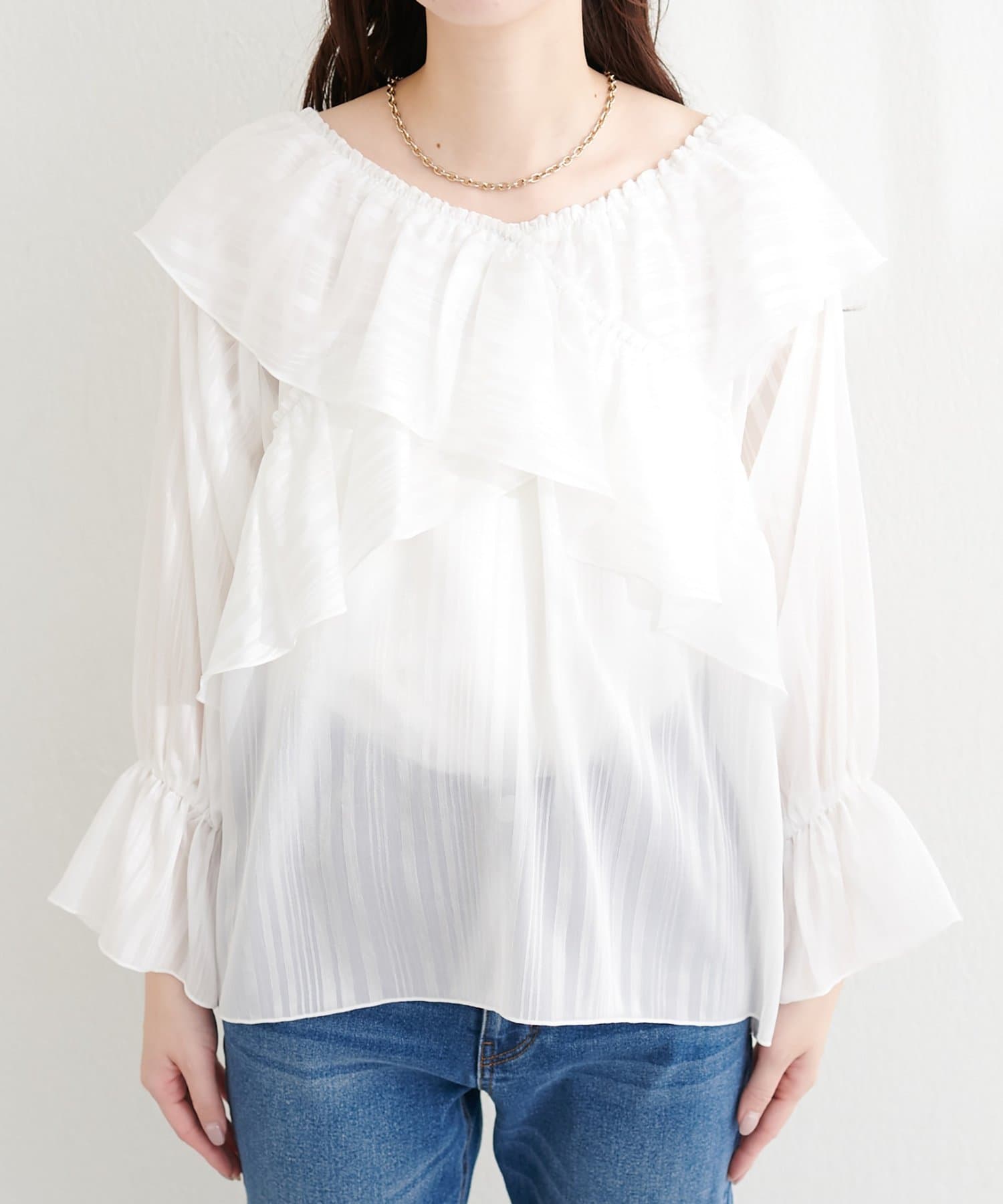 TOP > natural couture > レディース > トップス > シャツ/ブラウス(ボタン) > ランダムシアーストライプクロスフリルブラウス