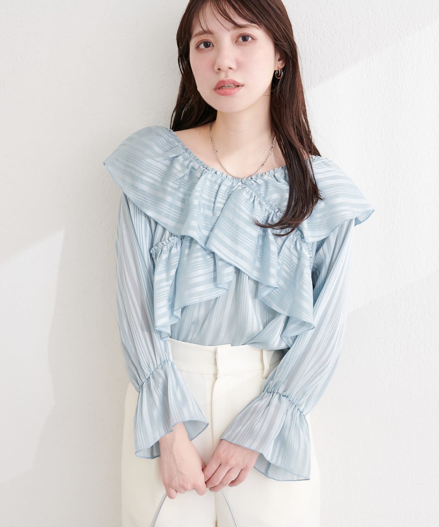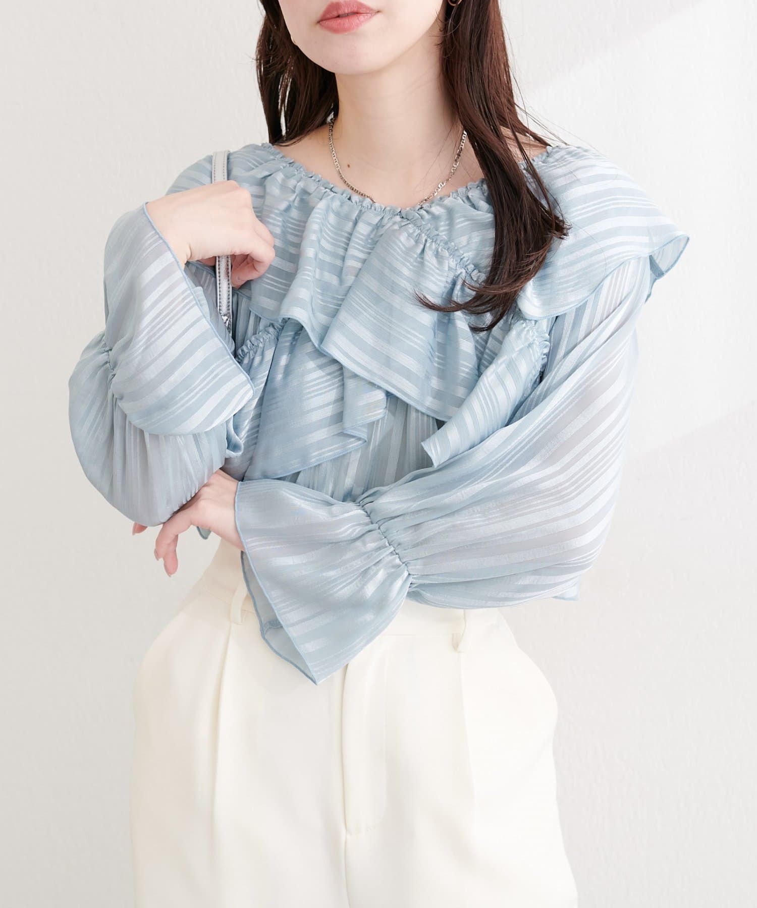 ランダムシアーストライプクロスフリルブラウス
