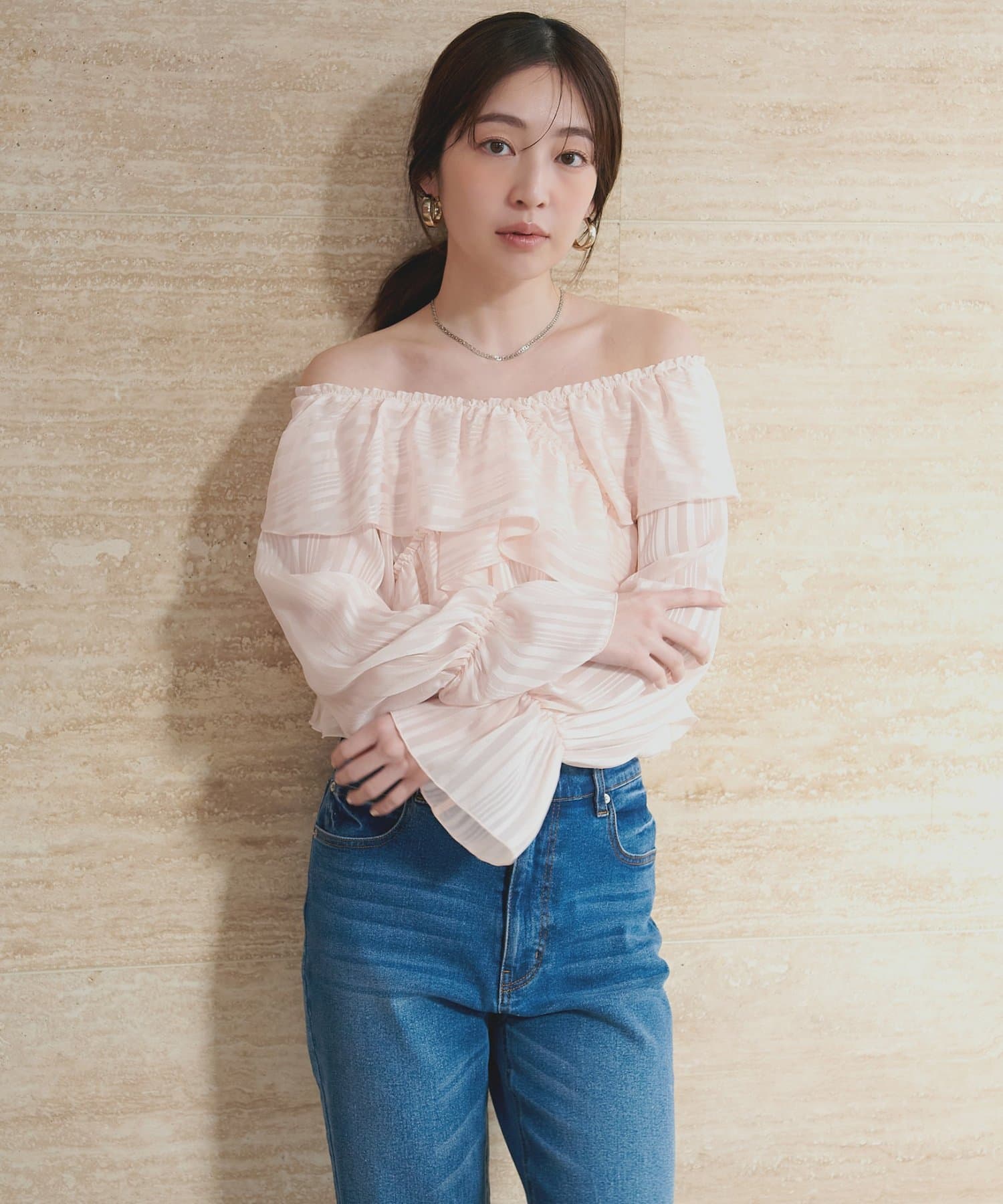 カジュアルに着こなしたいときは、デニムやワイドパンツと合わせて、リラックス感のあるスタイリングに。