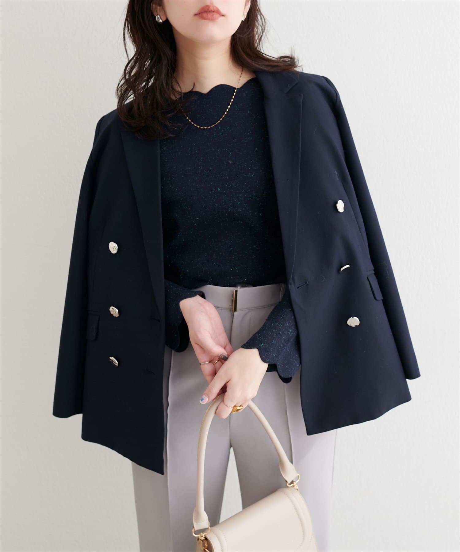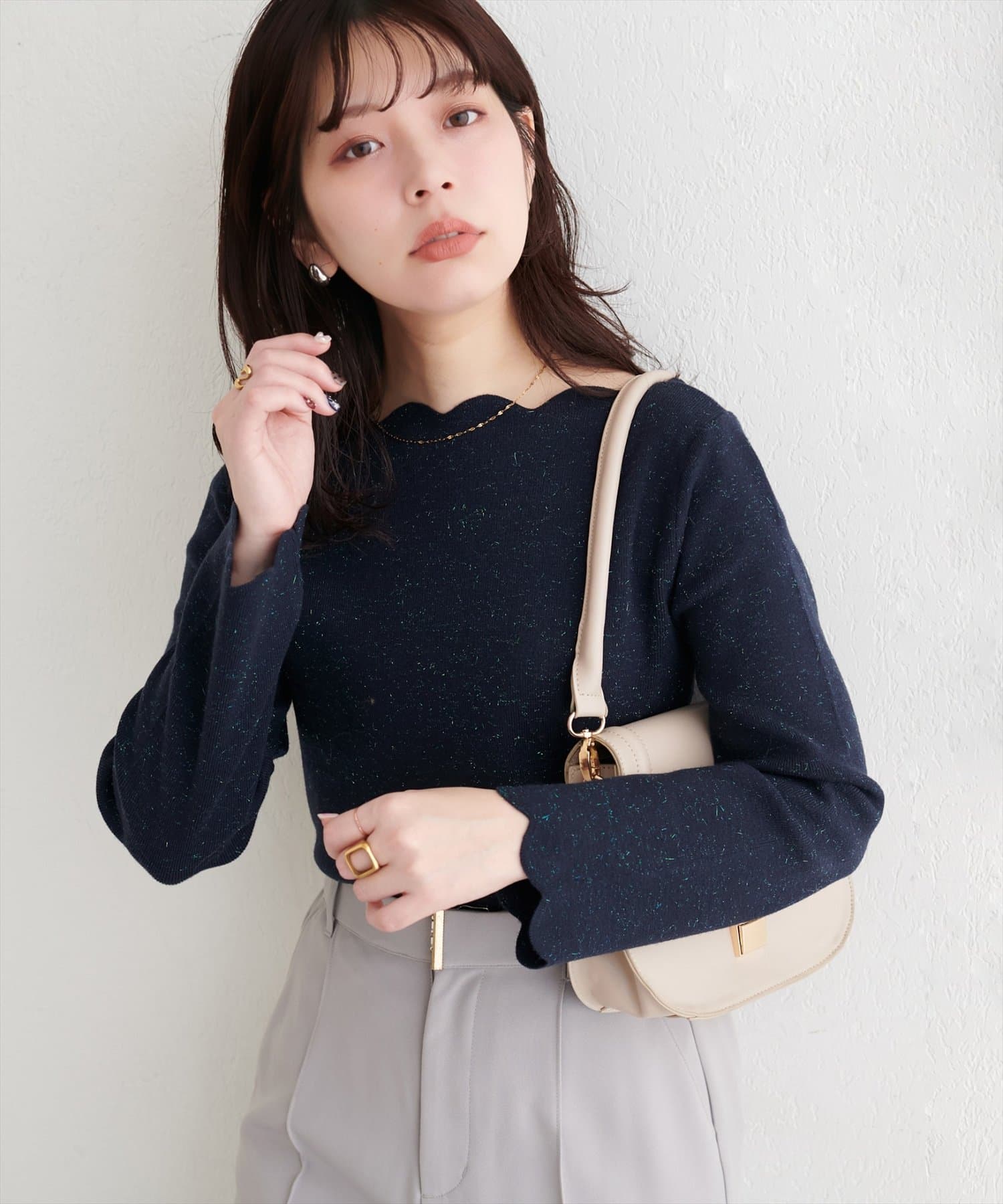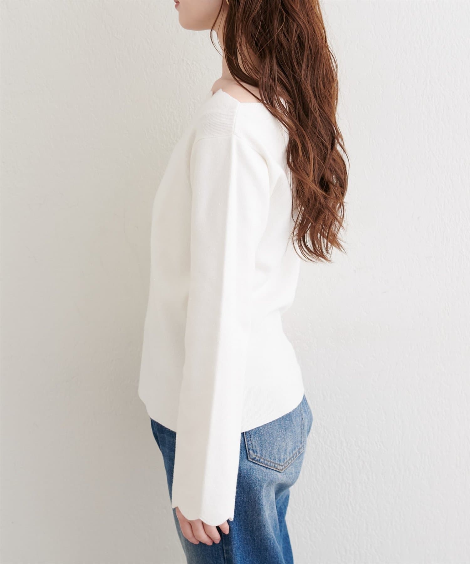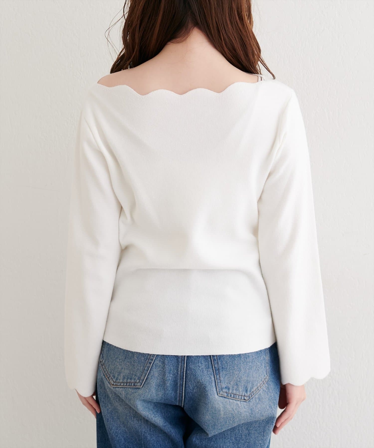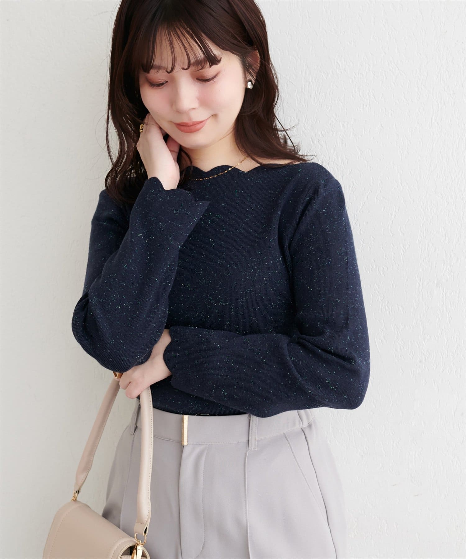 袖口のスカラップは、手元を華奢に見せ、さりげない可愛らしさを演出。