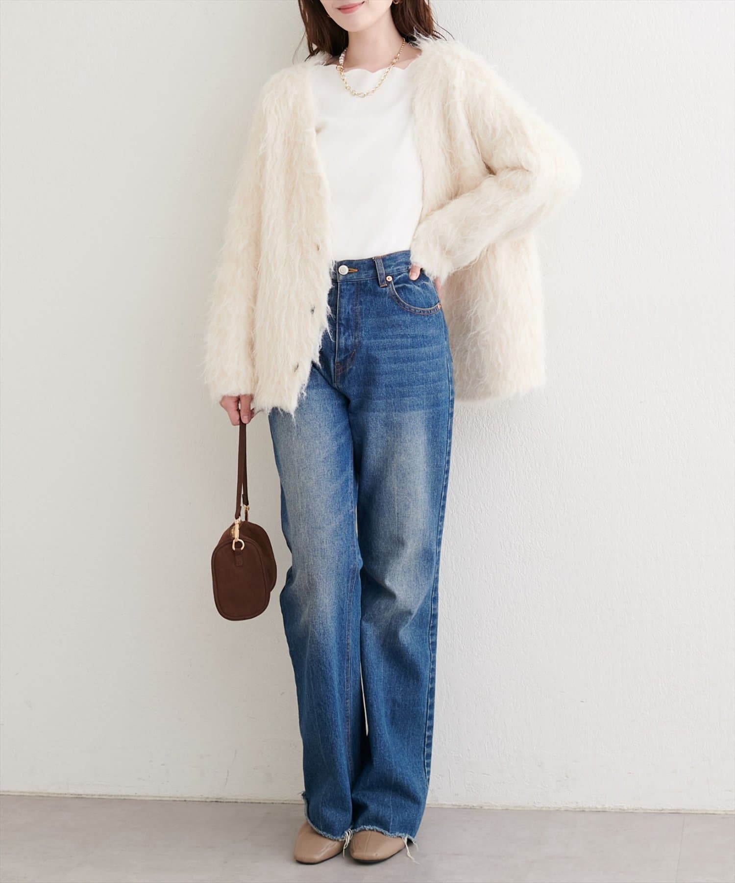 普段使いには、デニムやカジュアルなパンツと合わせて、甘さを抑えた大人カジュアルな着こなしがおすすめです。