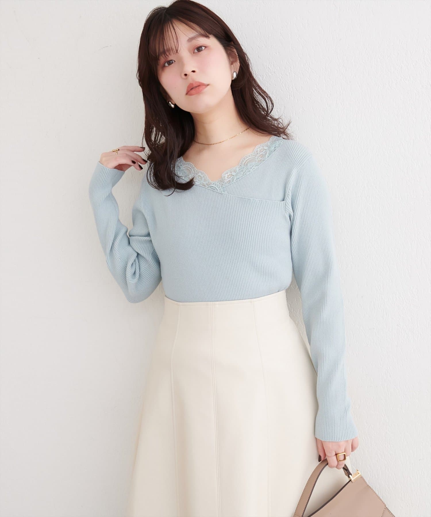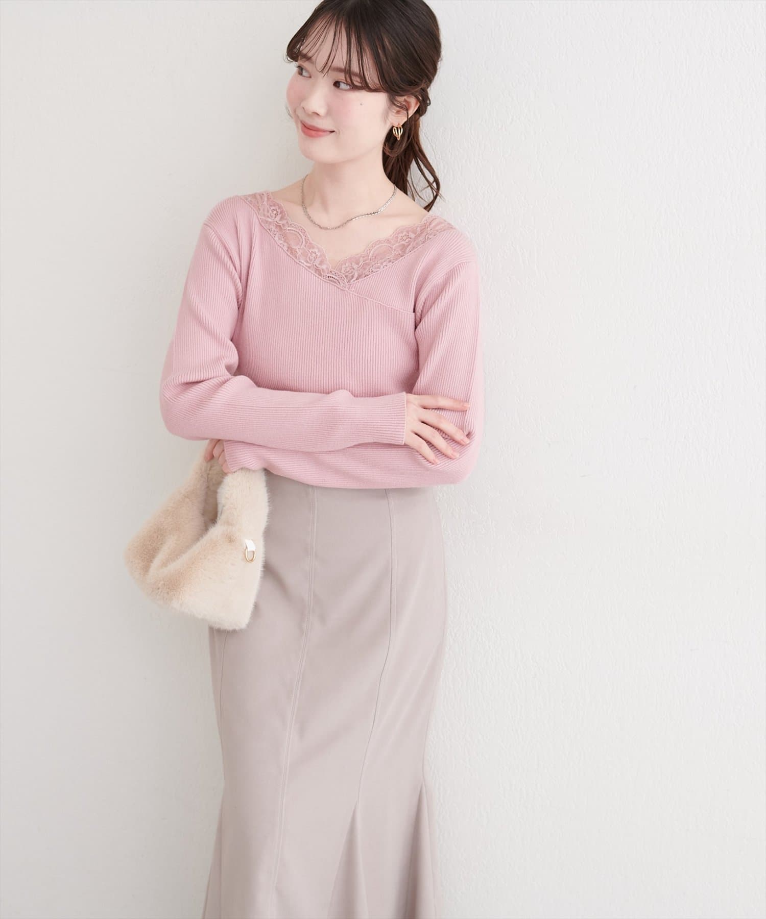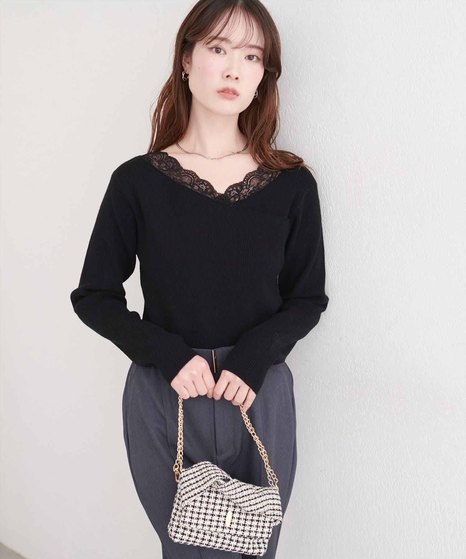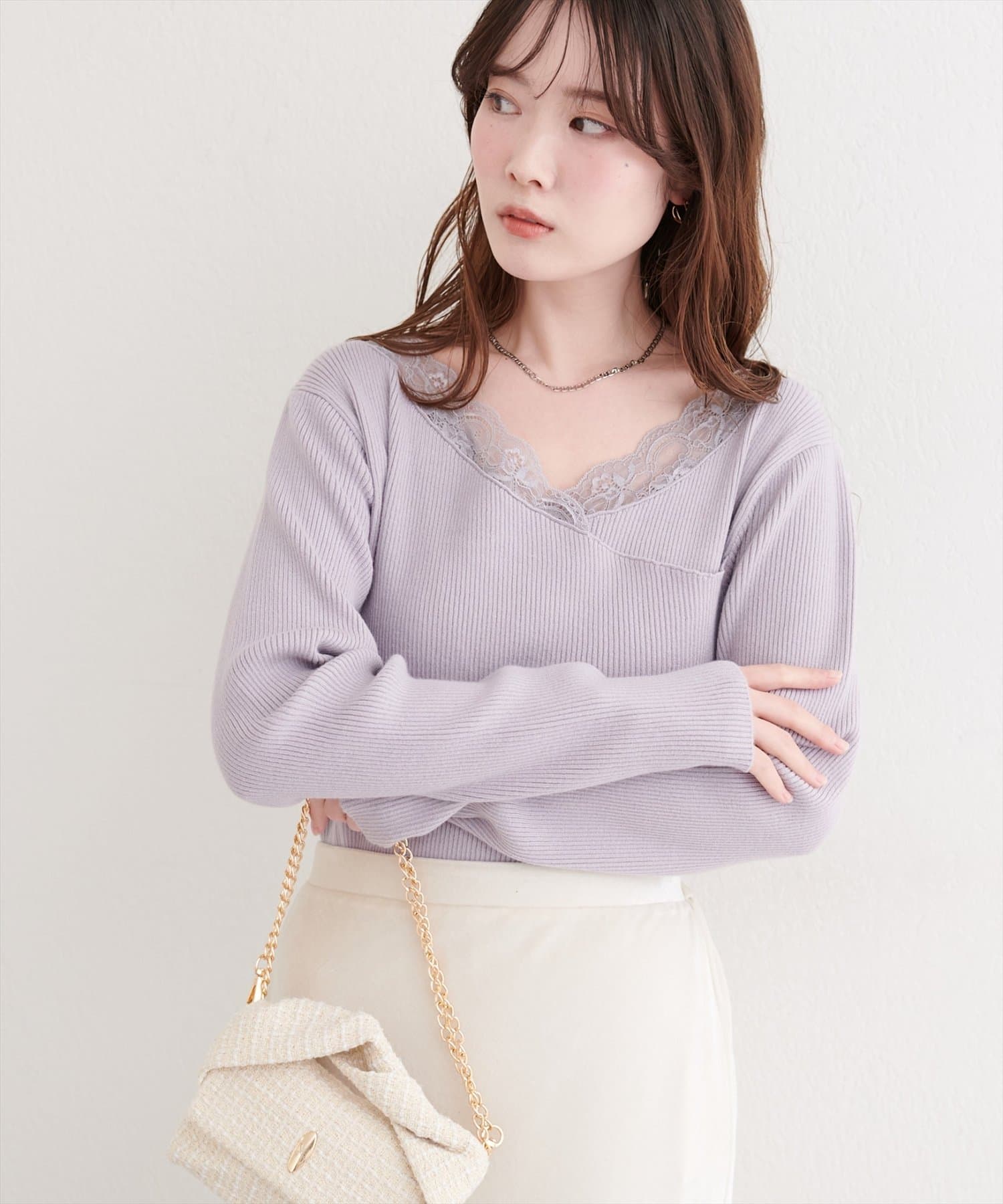 デコルテを美しく見せるレースは、顔周りを華やかに演出し、アクセサリーなしでも上品な着こなしが完成します。