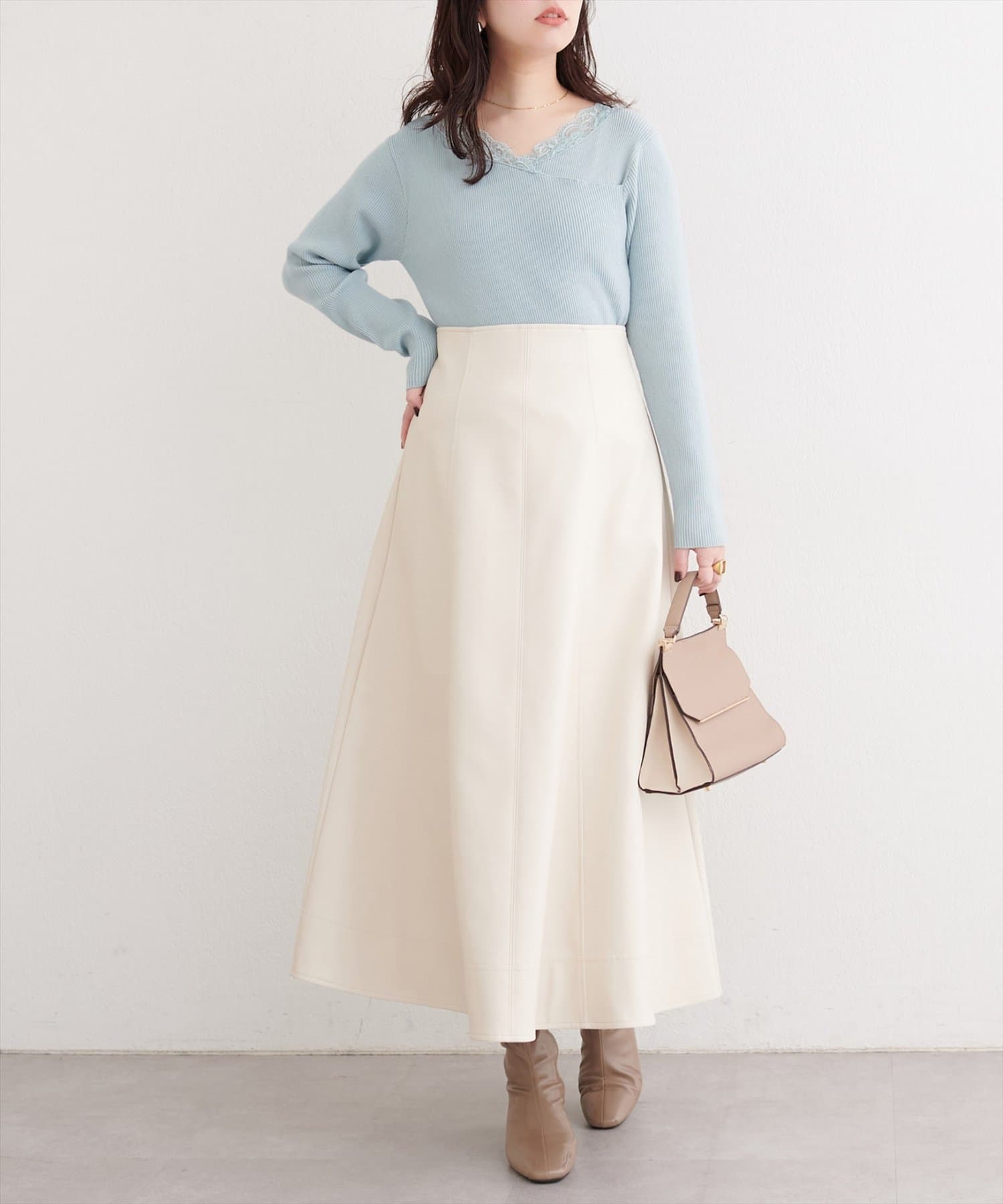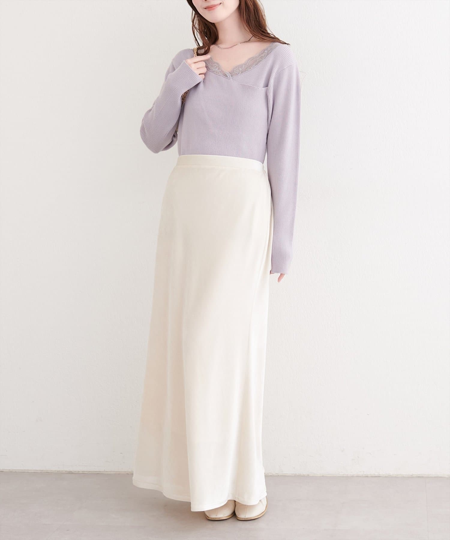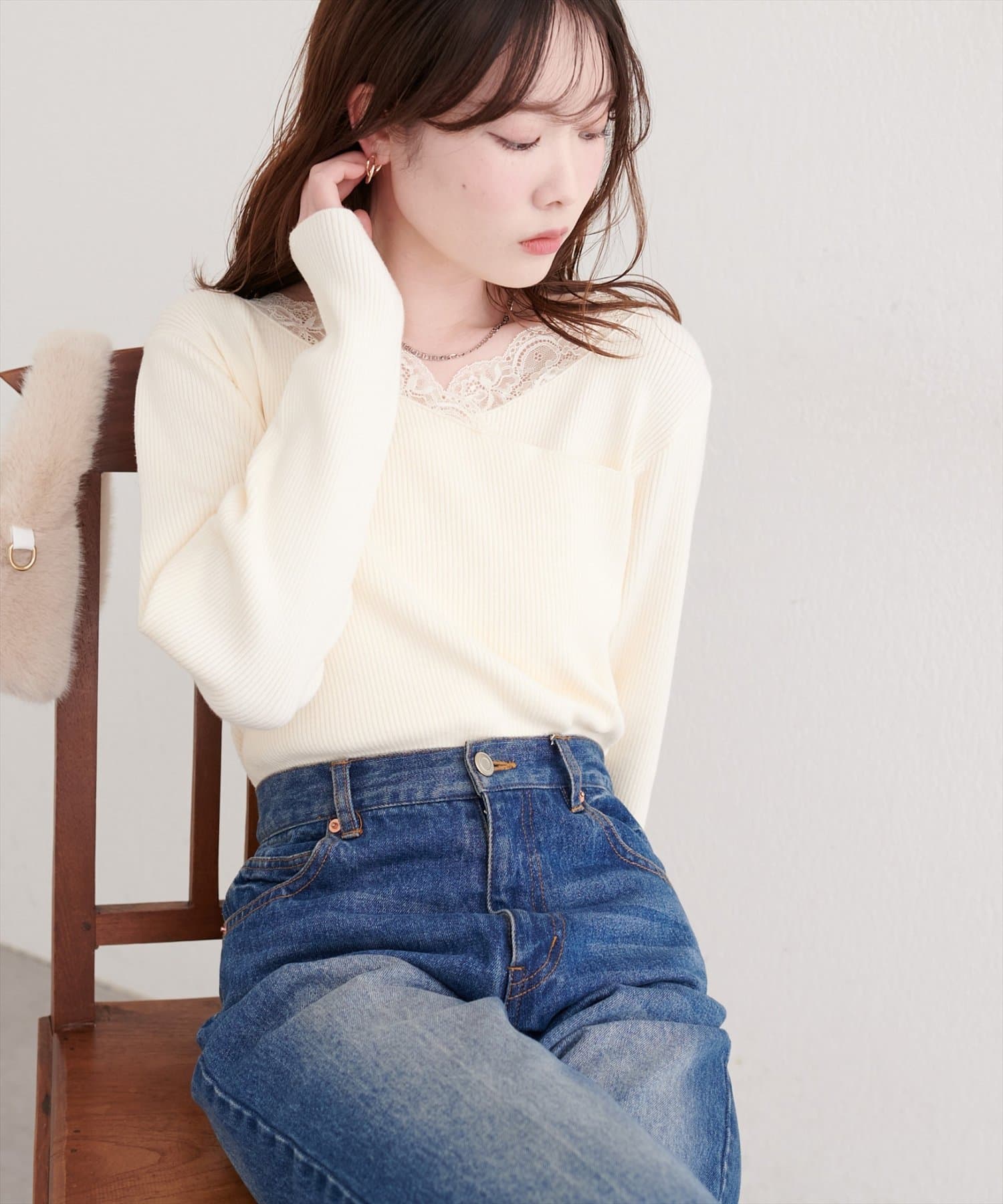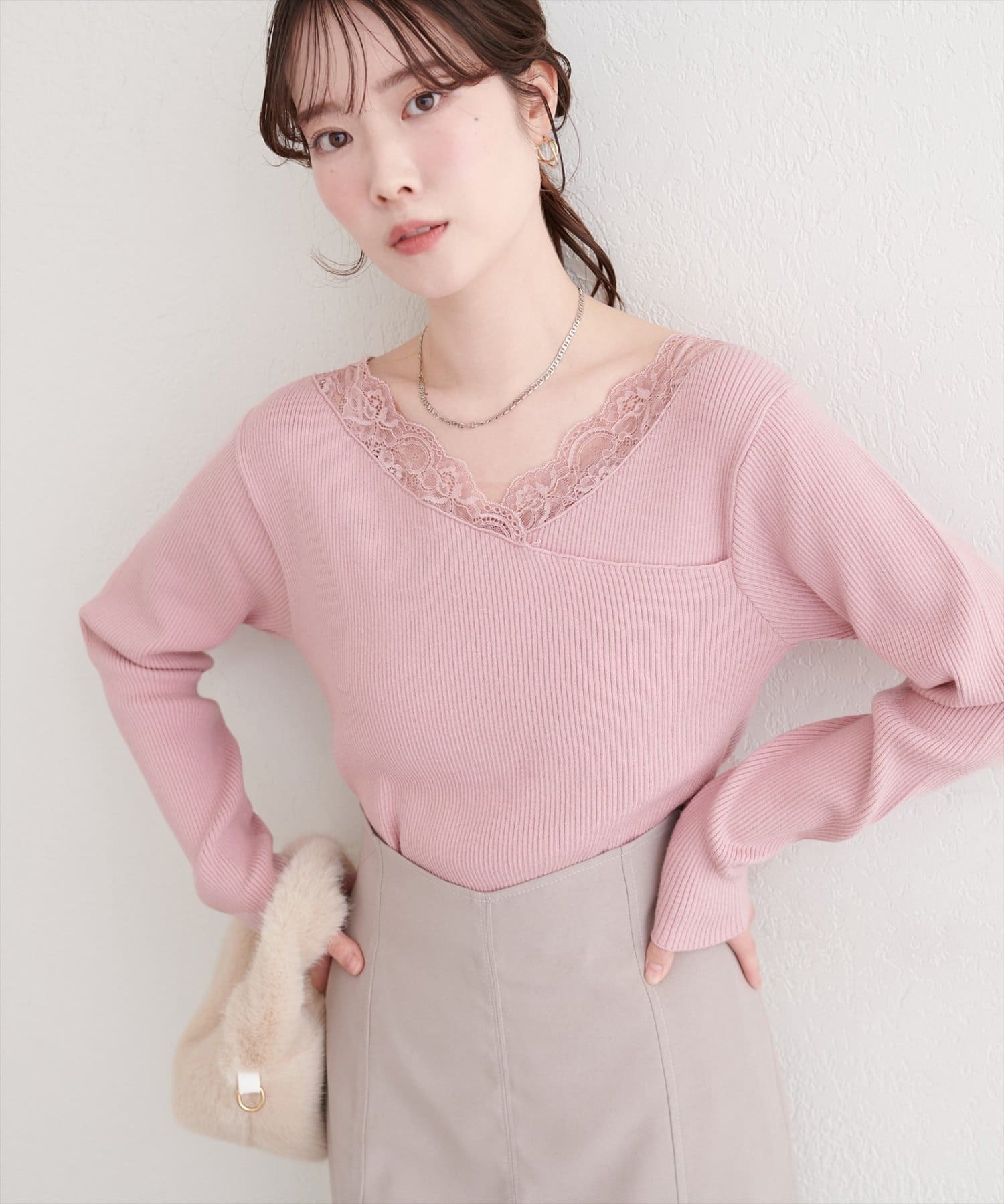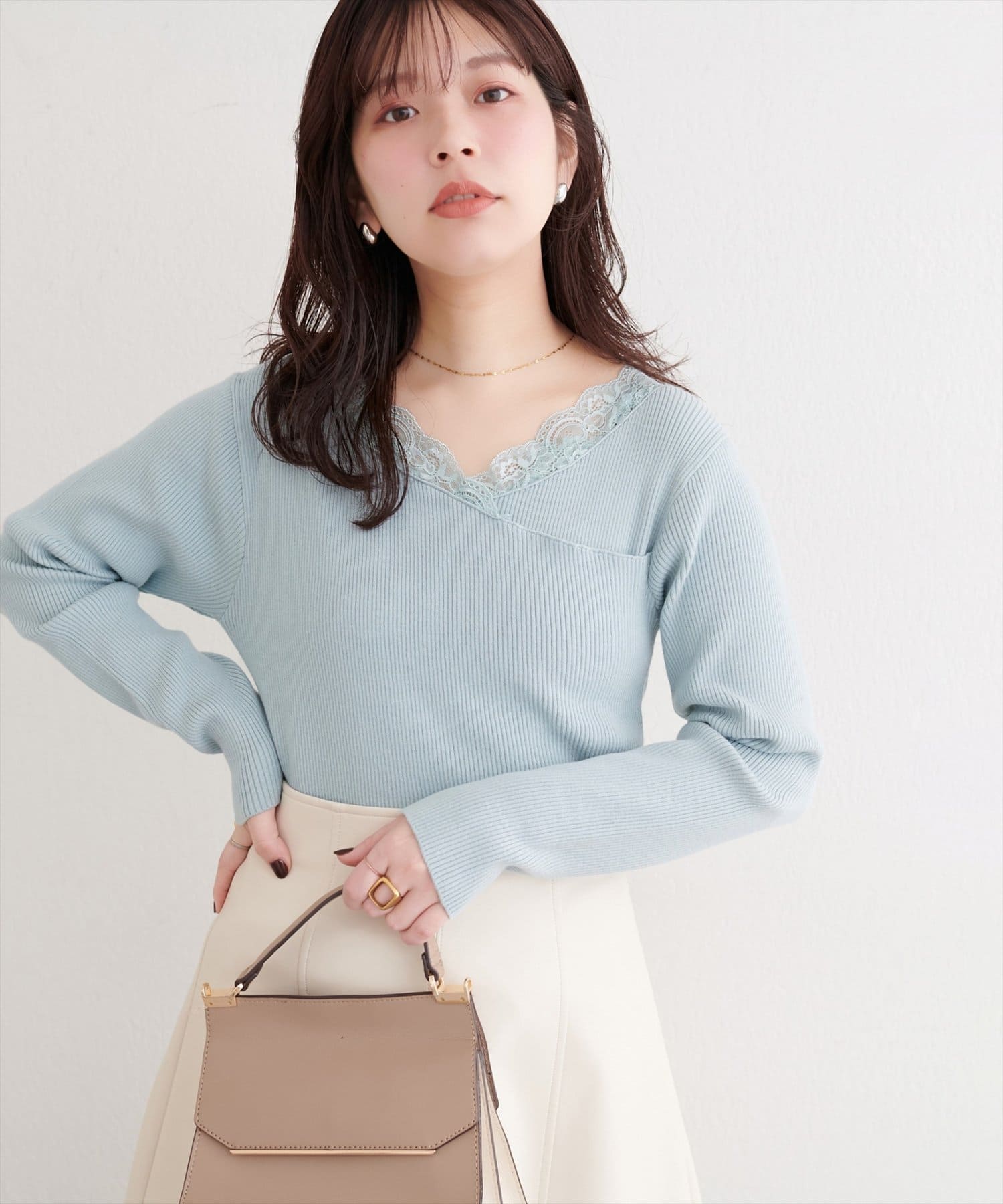 デコルテを美しく見せるレースは、顔周りを華やかに演出し、アクセサリーなしでも上品な着こなしが完成します。