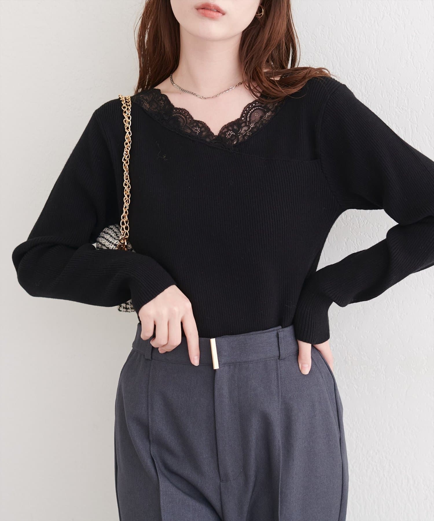 繊細なレースとリブニットのミックスが、大人の女性らしさを引き立てるプルオーバー。