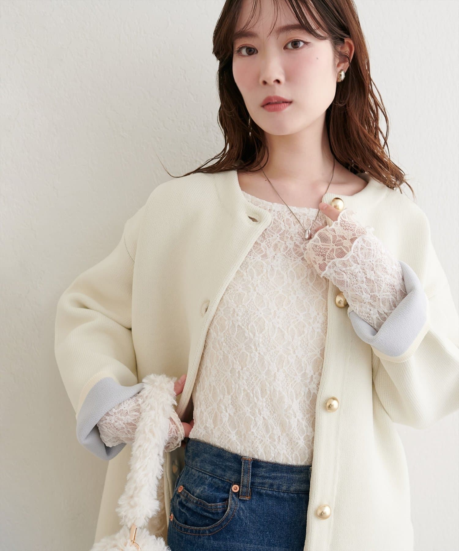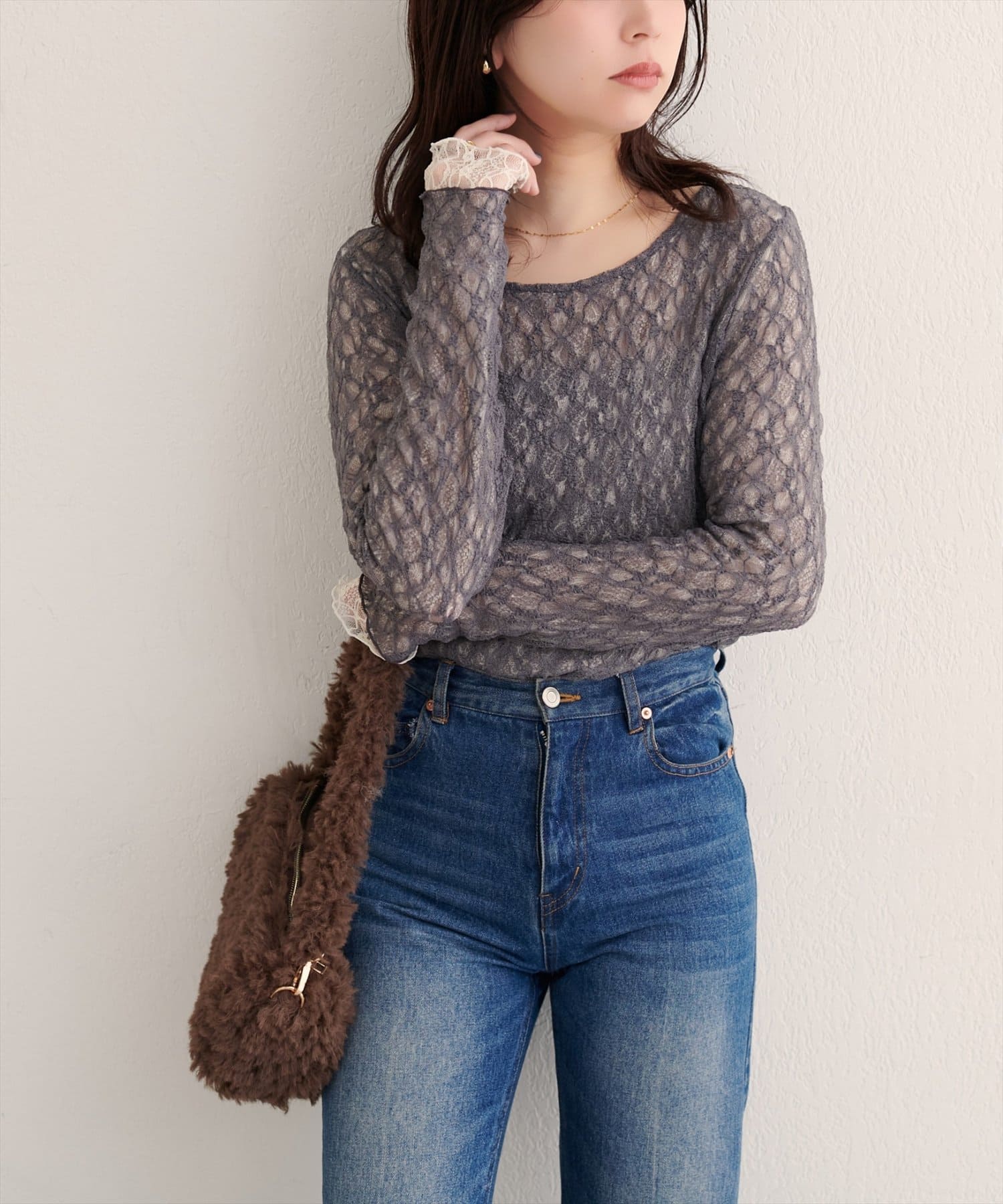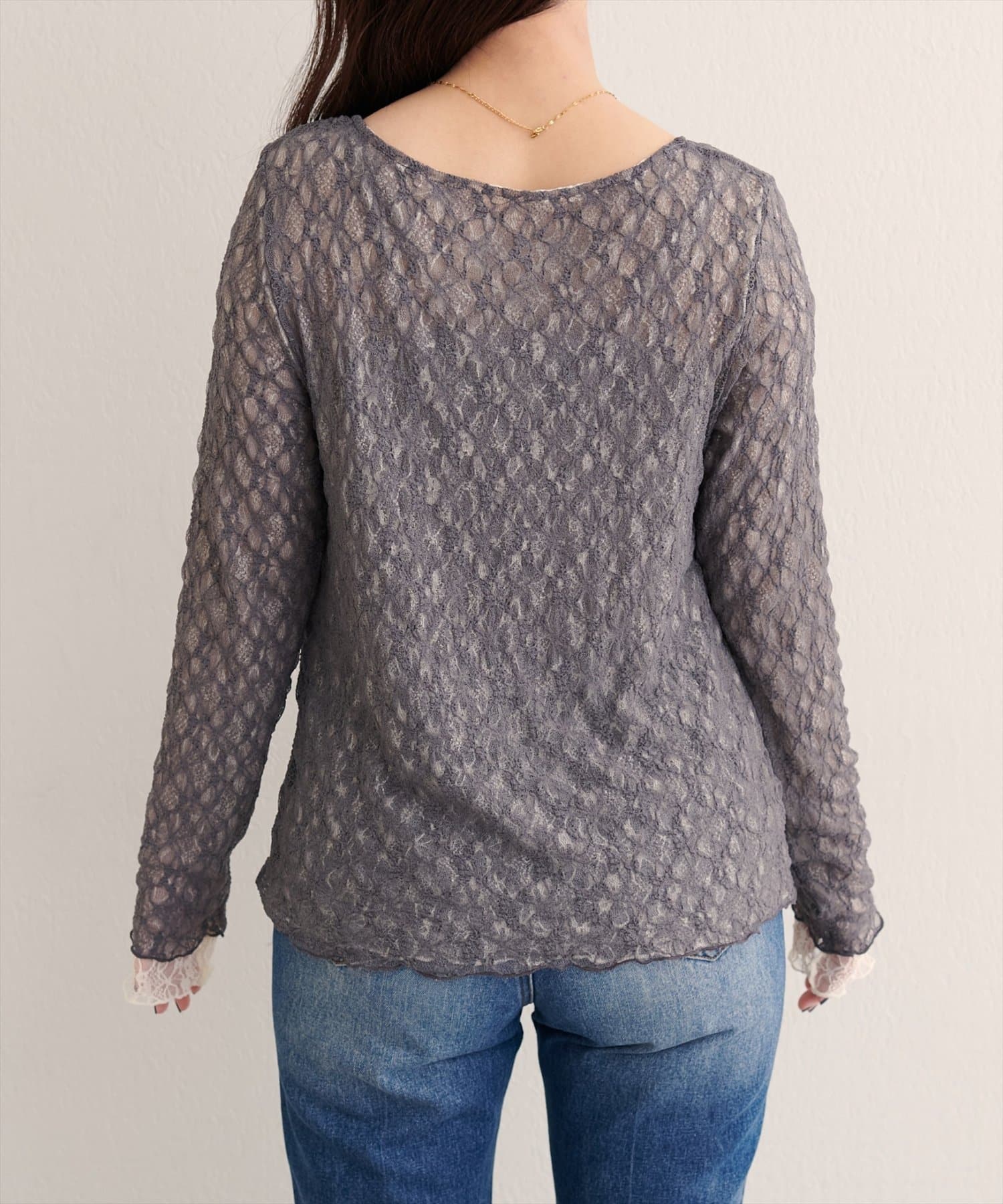 上品な肌見せが、女性らしさを引き立てます。袖口のさりげないレース使いもポイント。
