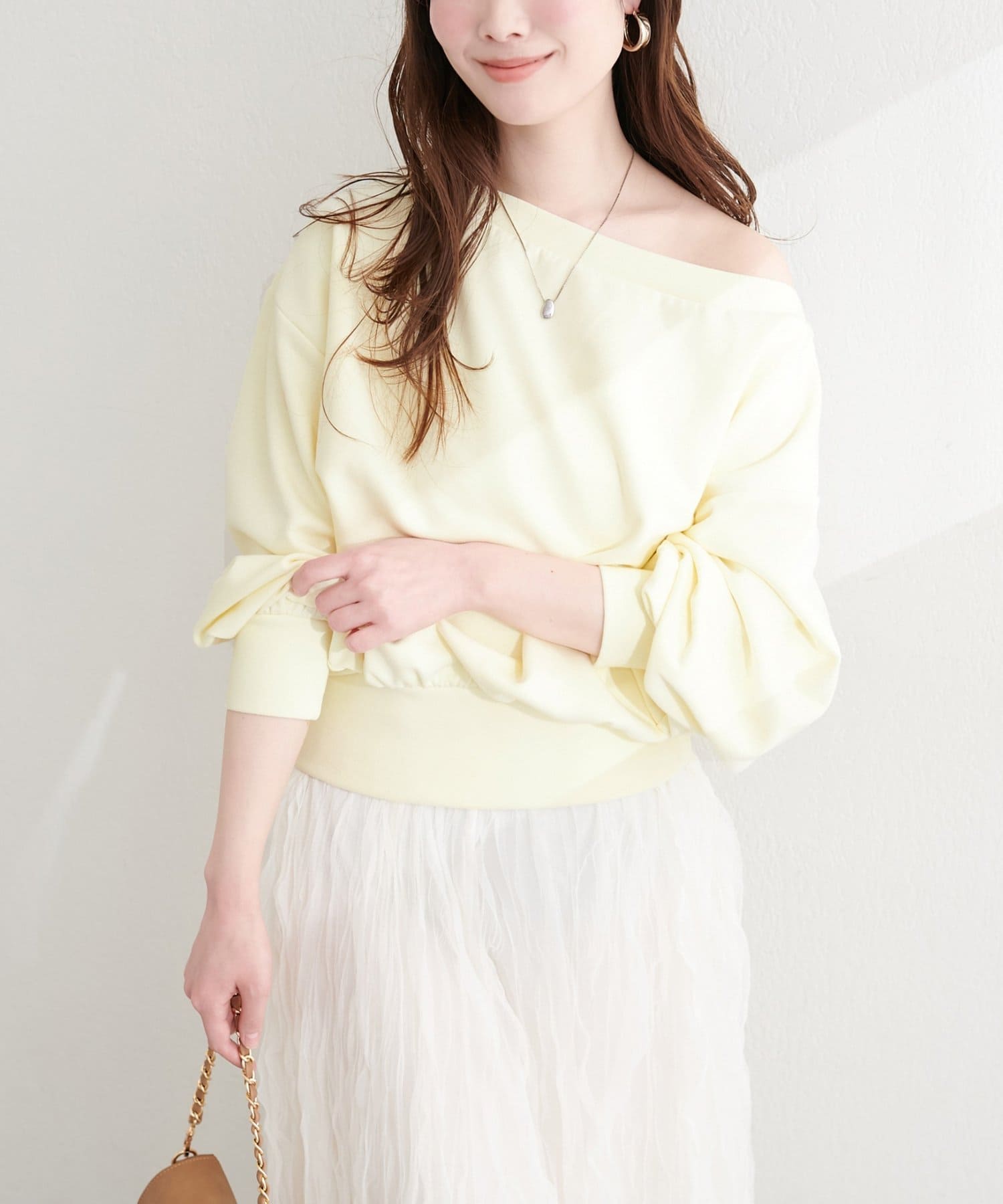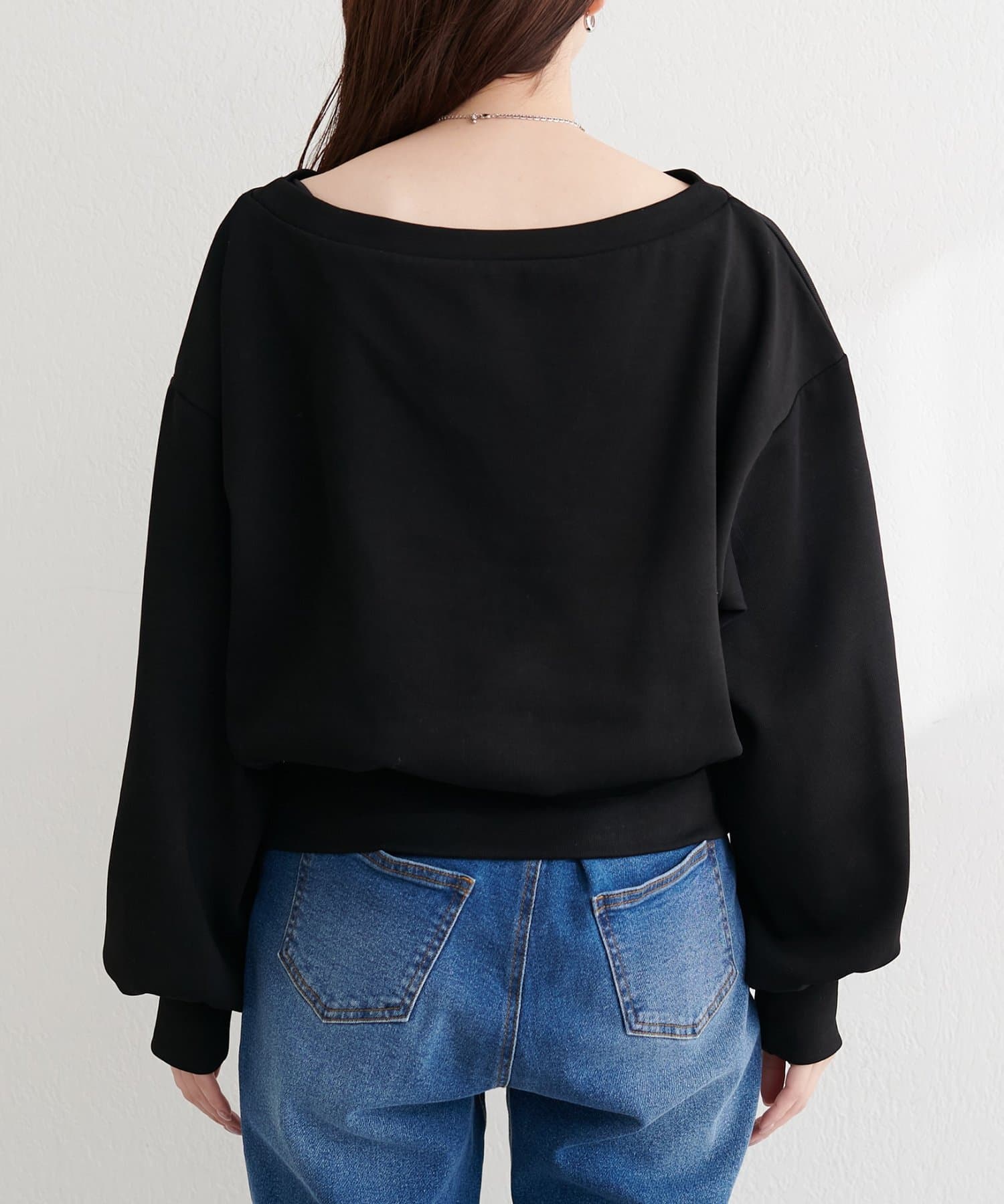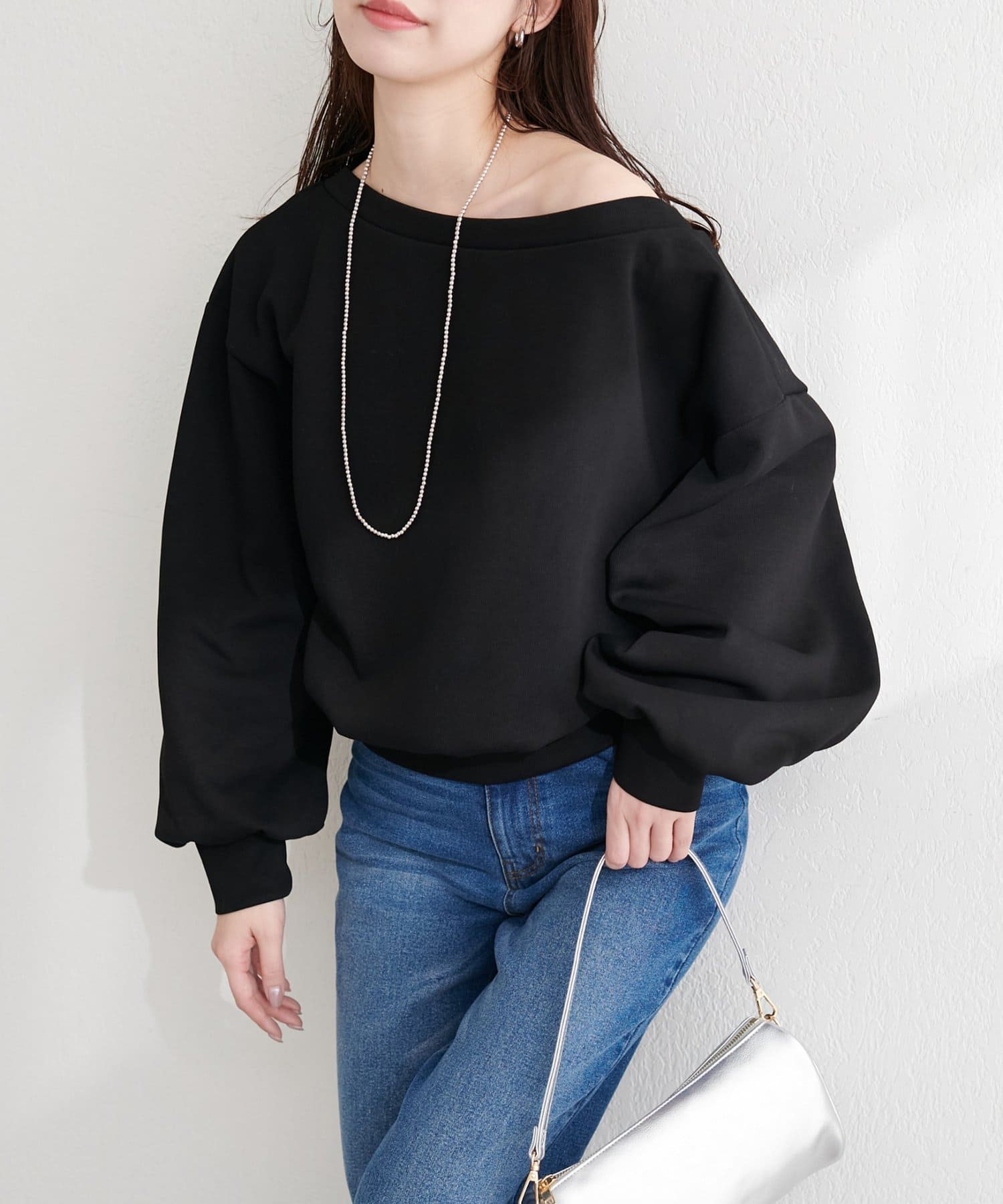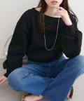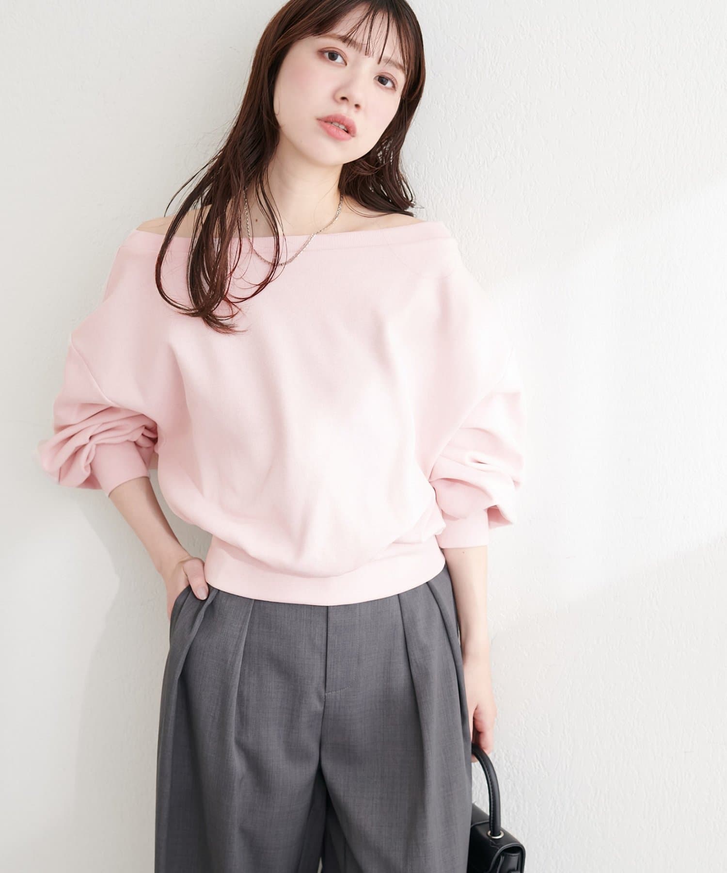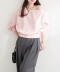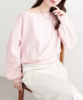 抜け感と女性らしさを演出する、オフショルデザインのスウェットプルオーバー。