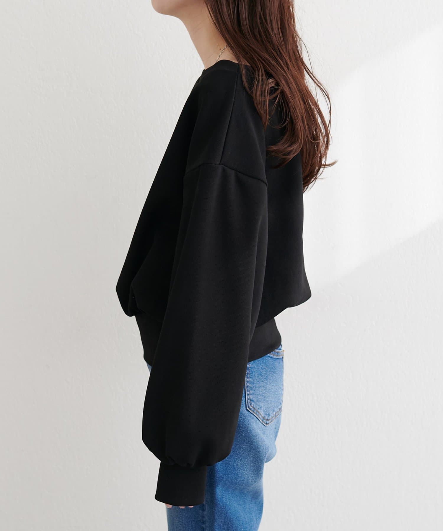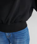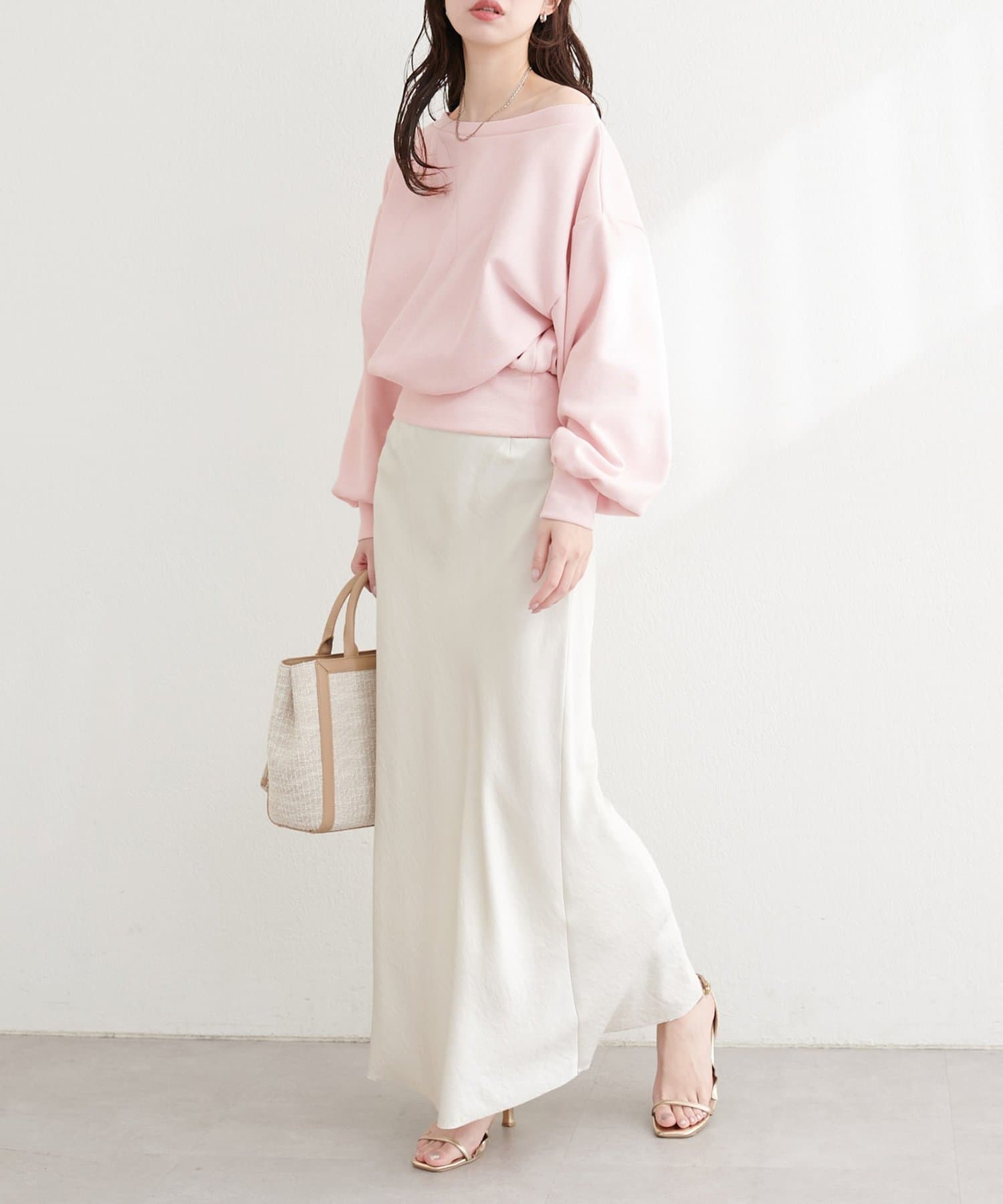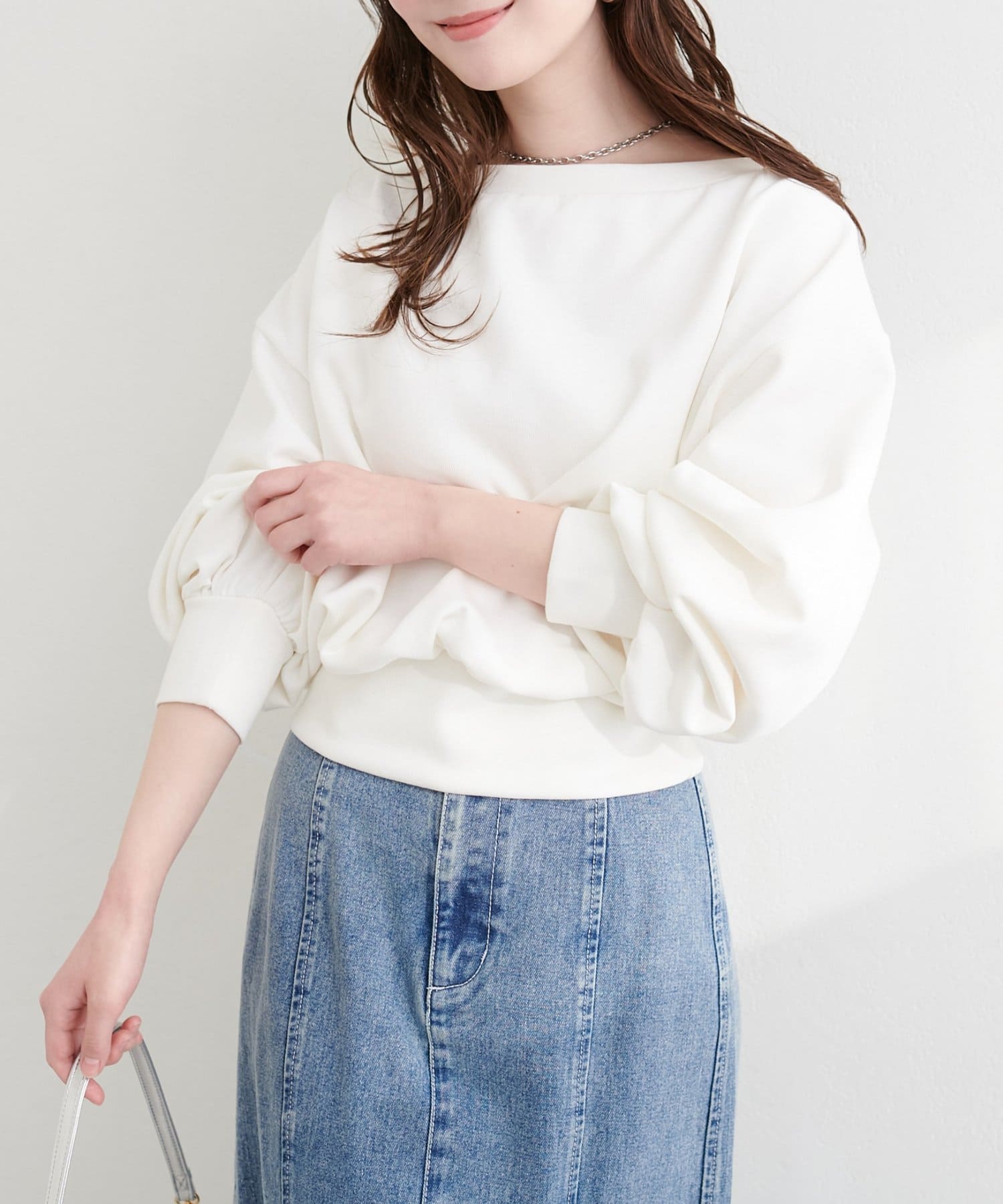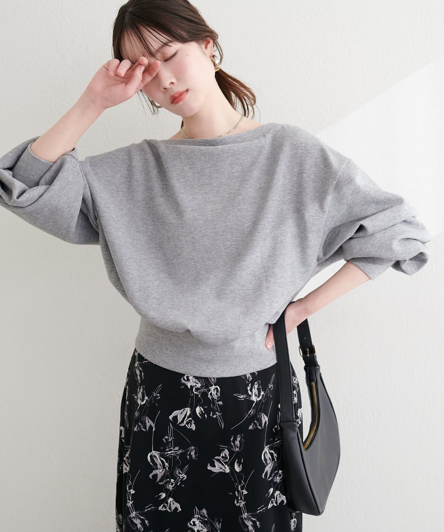 抜け感と女性らしさを演出する、オフショルデザインのスウェットプルオーバー。