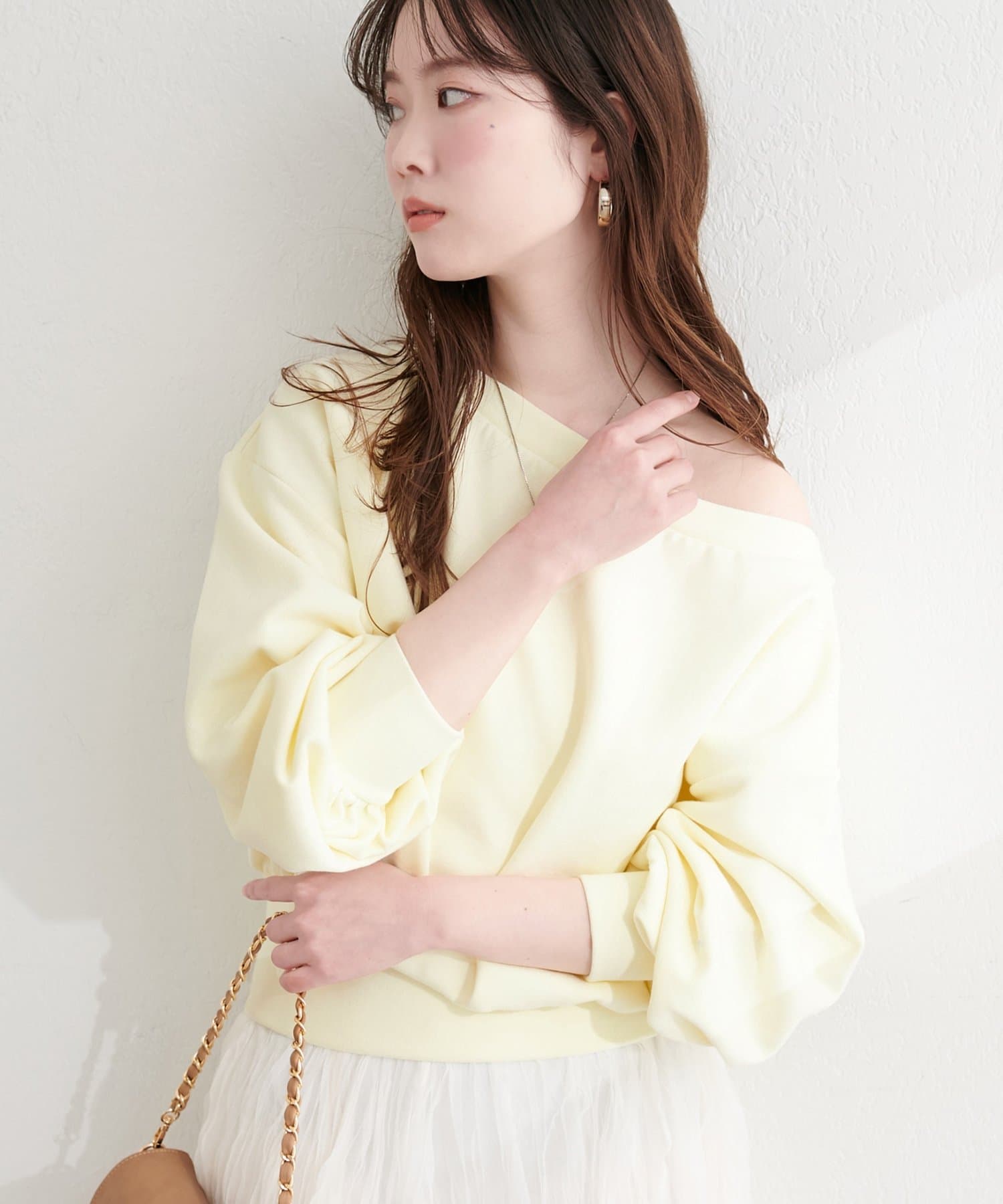 デコルテをチラ見せするスタイリングはもちろん、