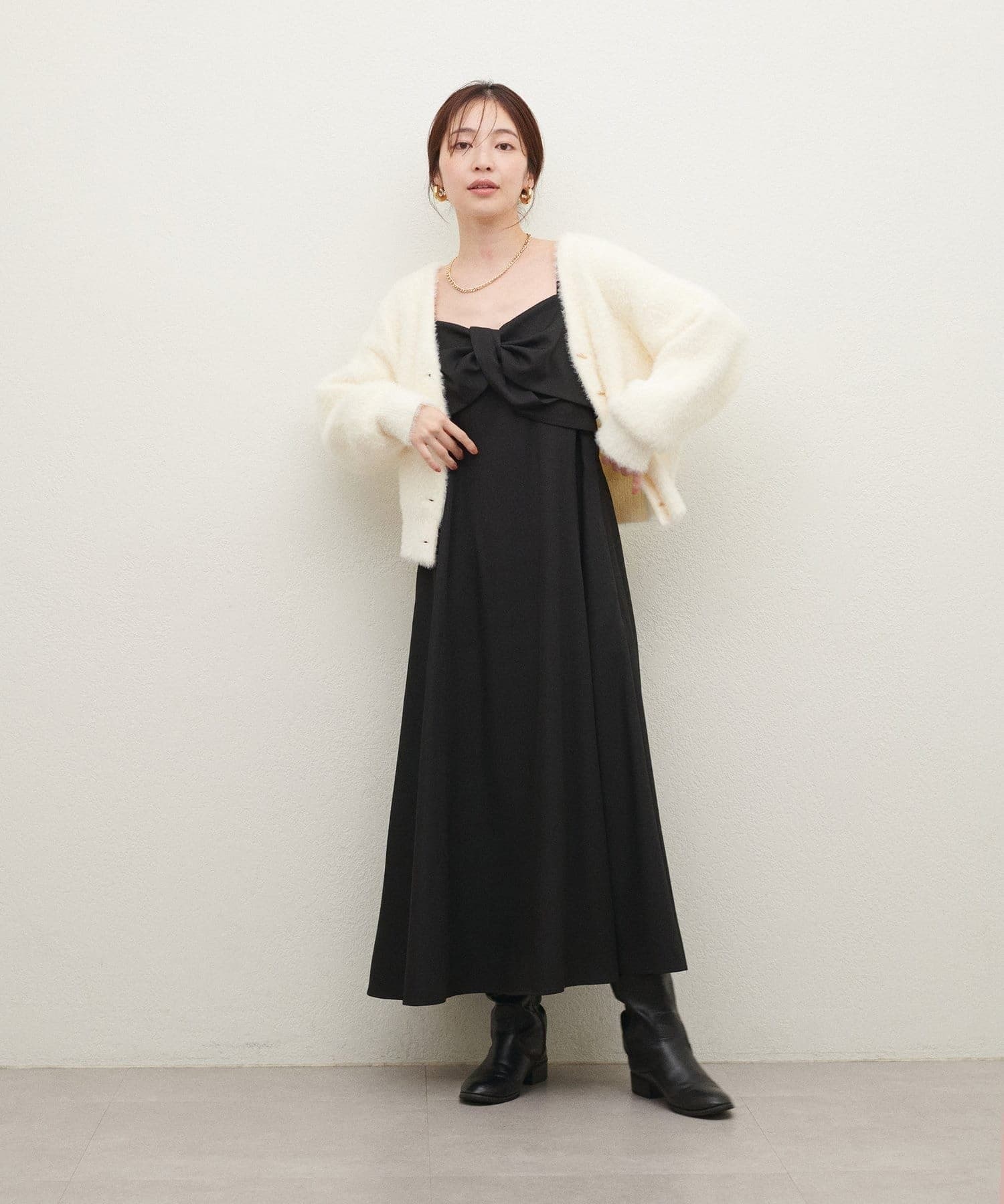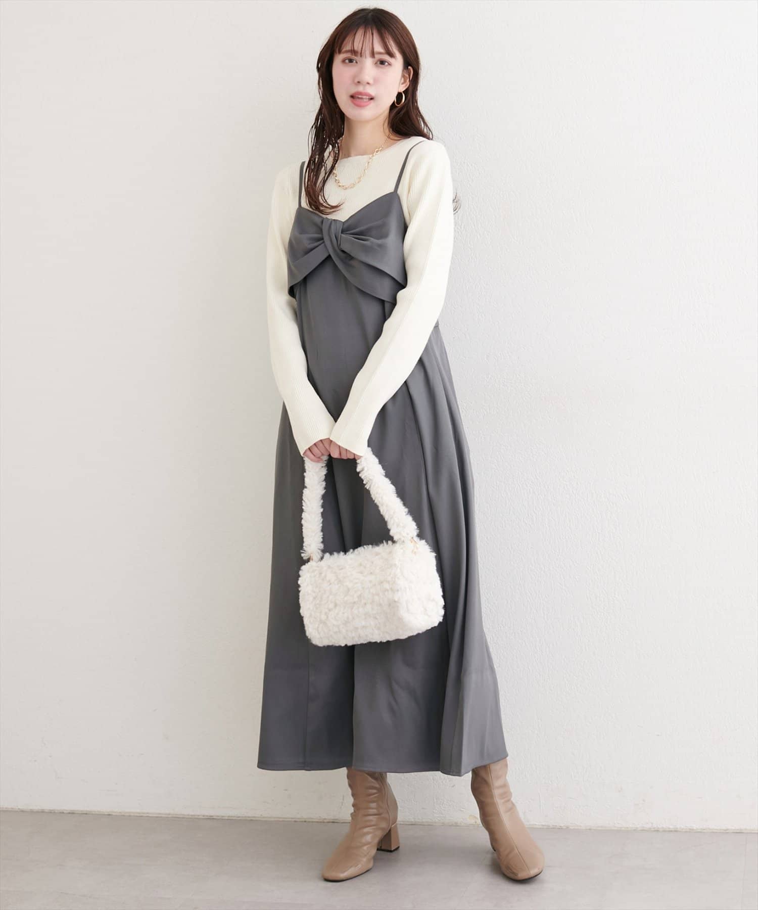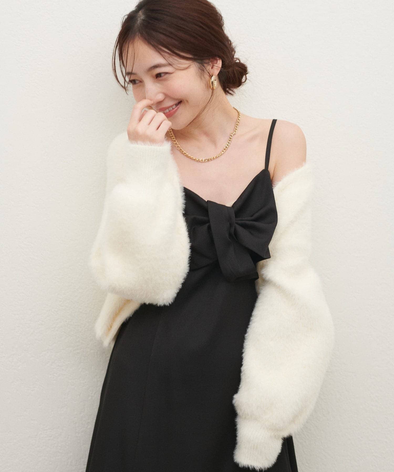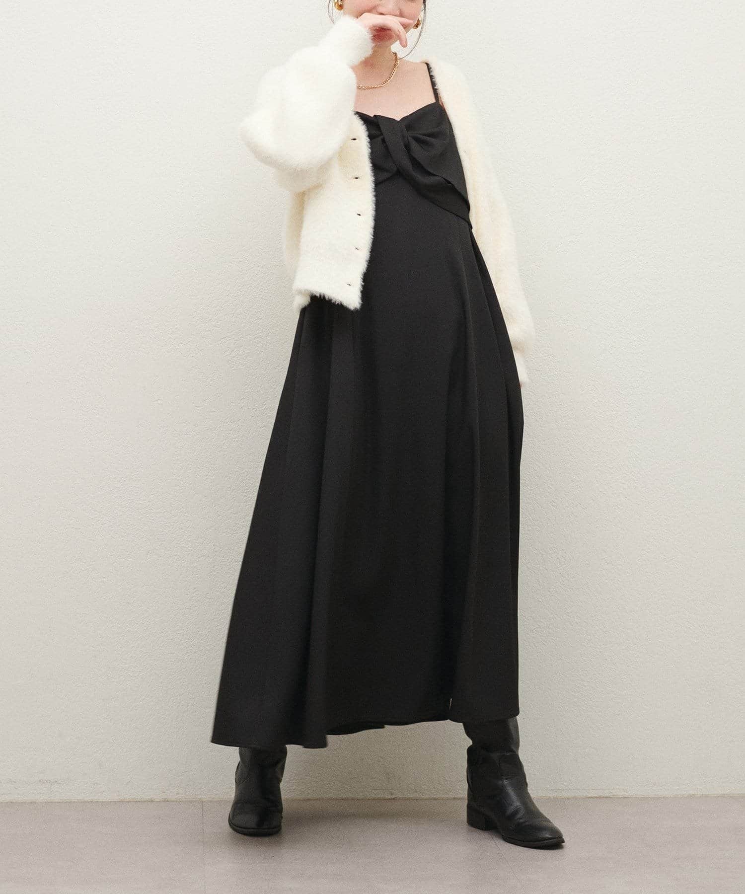 胸元のリボンデザインは甘くなりすぎないようねじりデザインに。