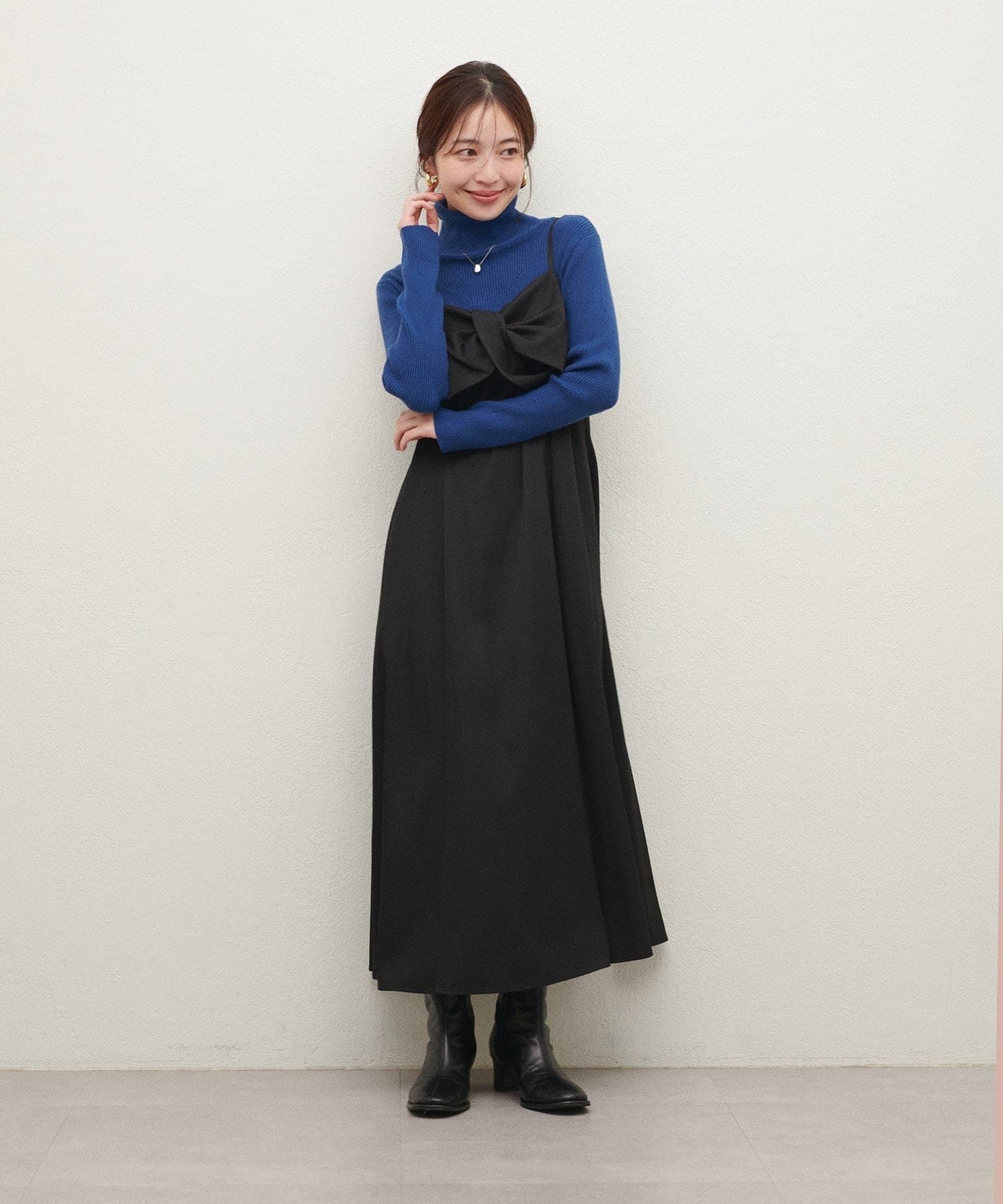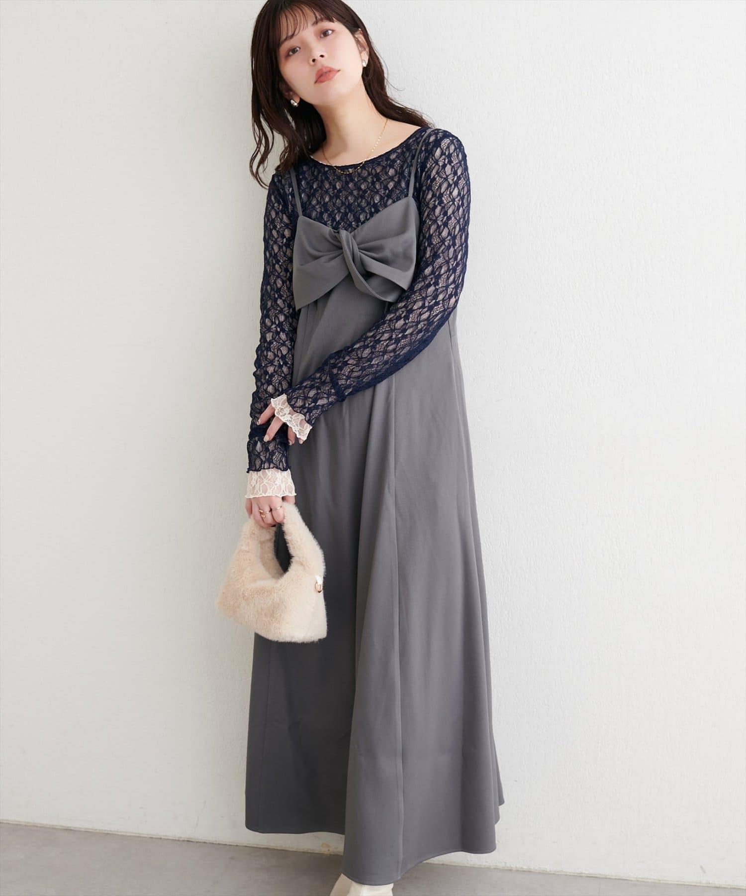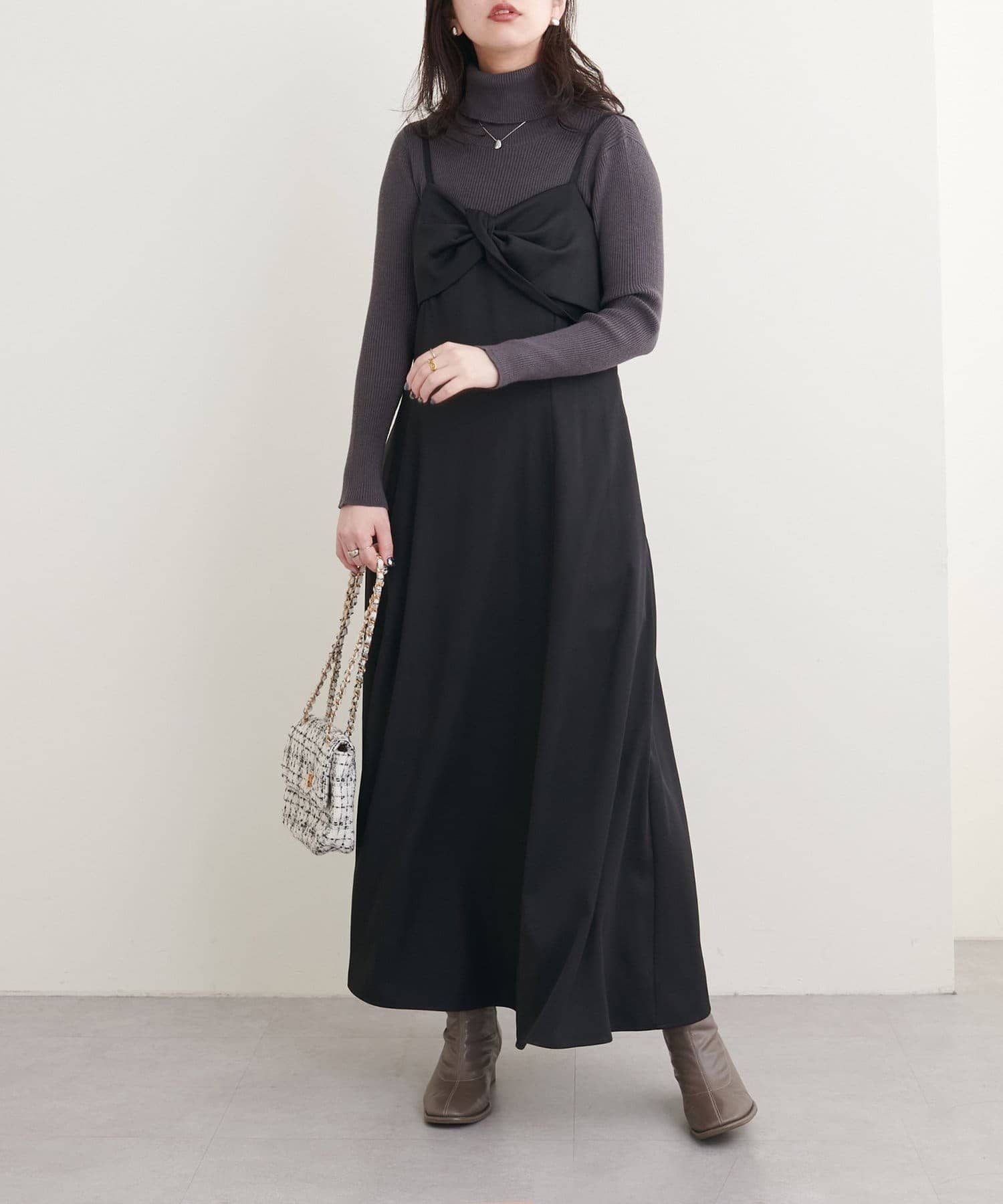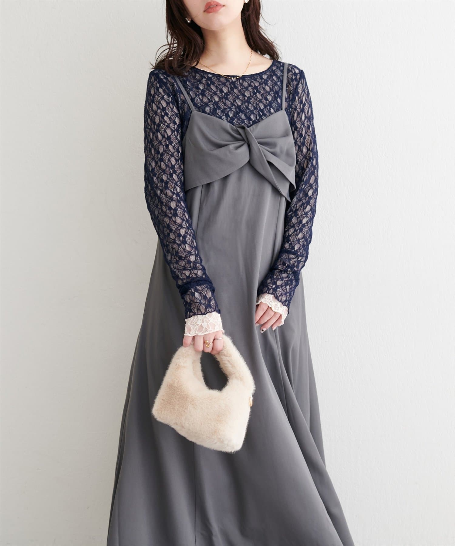 胸元のリボンデザインは甘くなりすぎないようねじりデザインに。