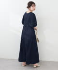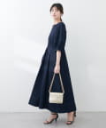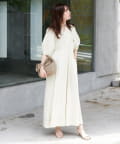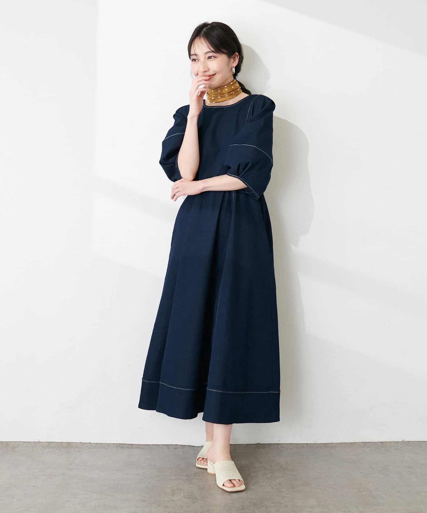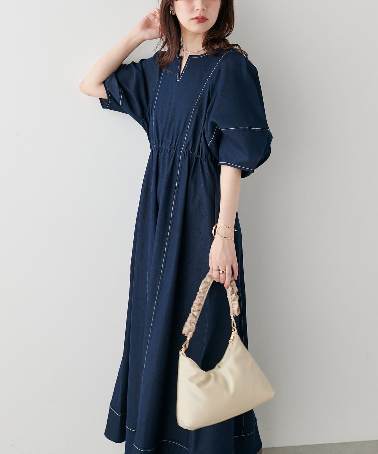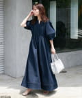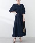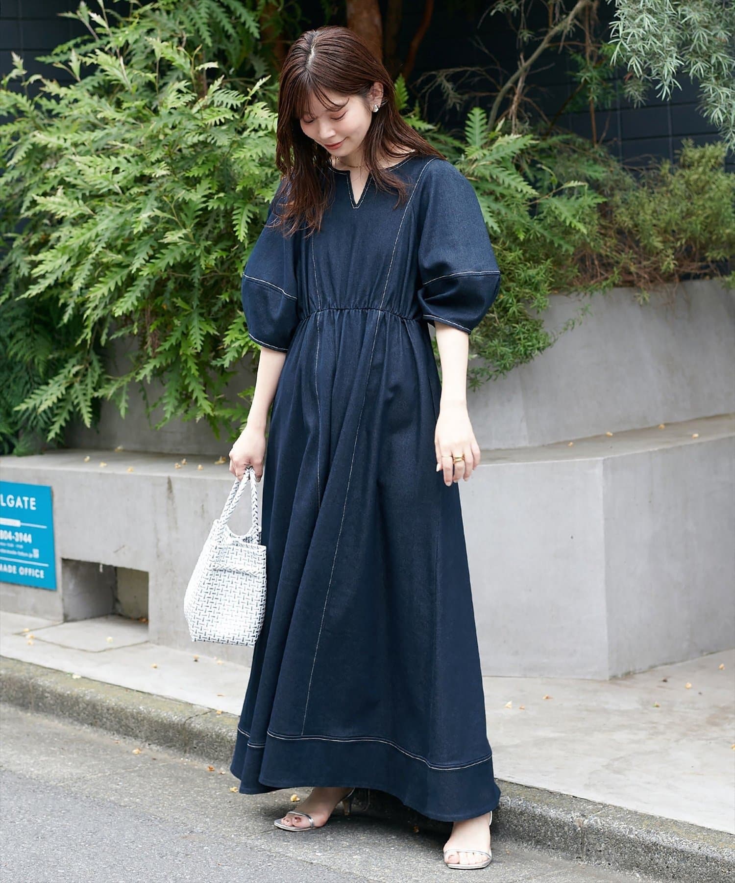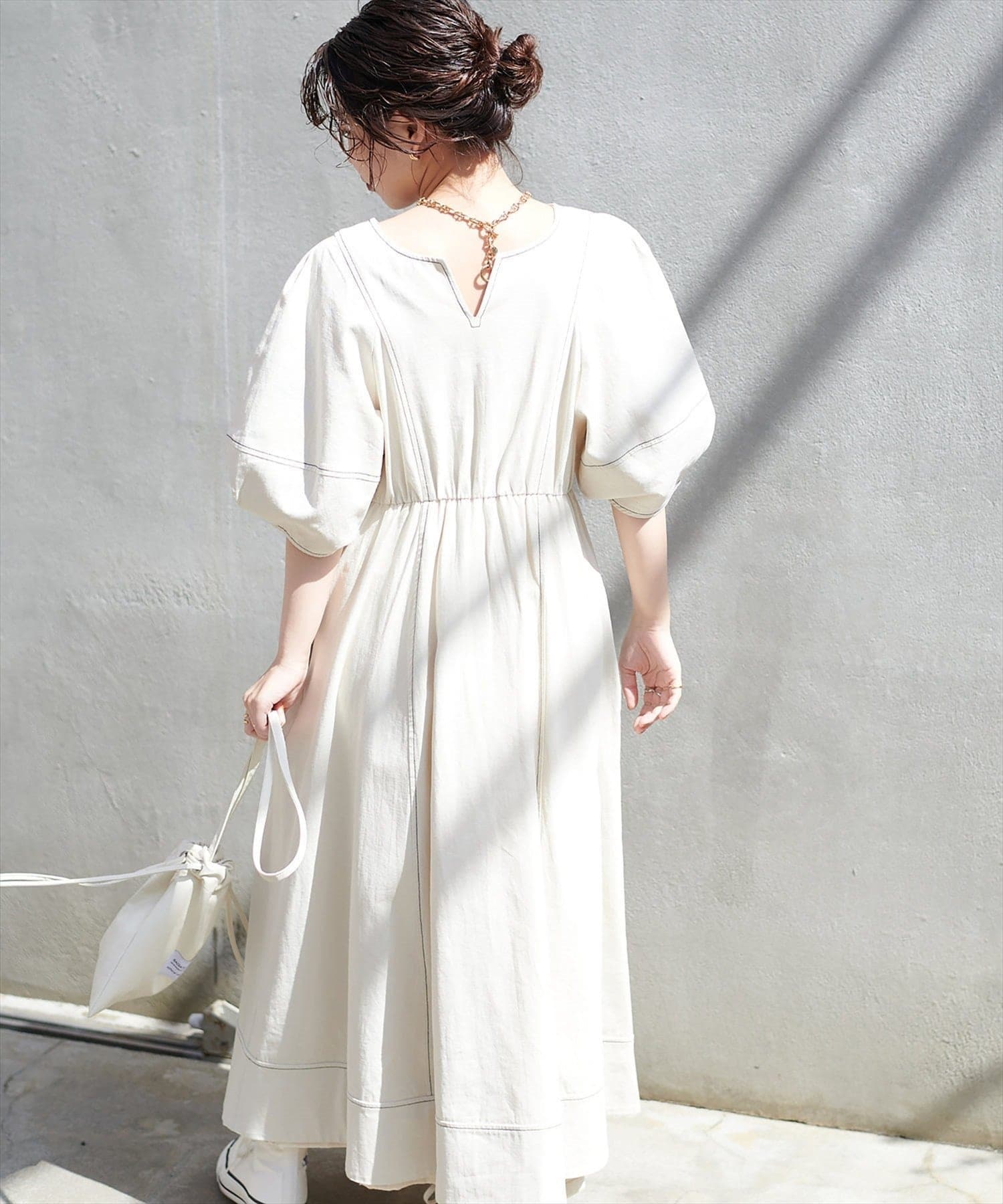 腕を華奢に見せてくれるランタンスリーブが目を引く一着。