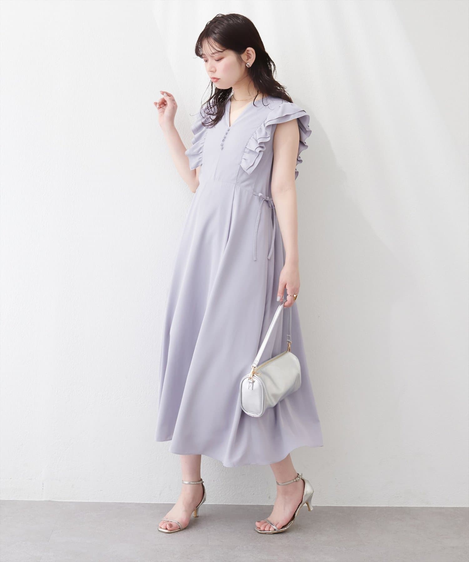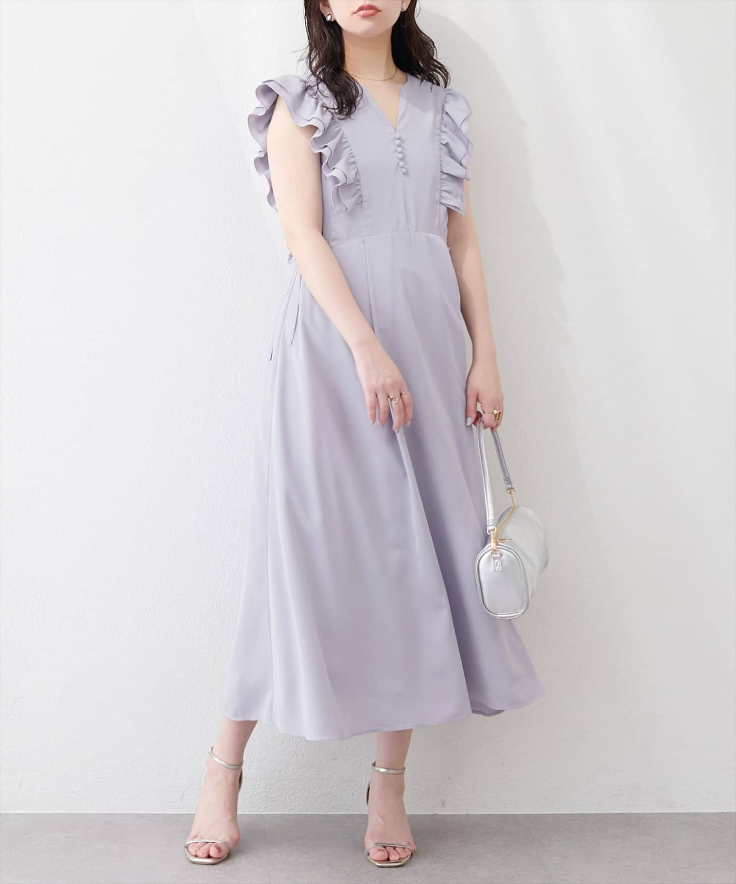 肩を飾るフリルは甘すぎない絶妙なボリューム感で、大人の女性にも似合う上品な可愛らしさを演出します。