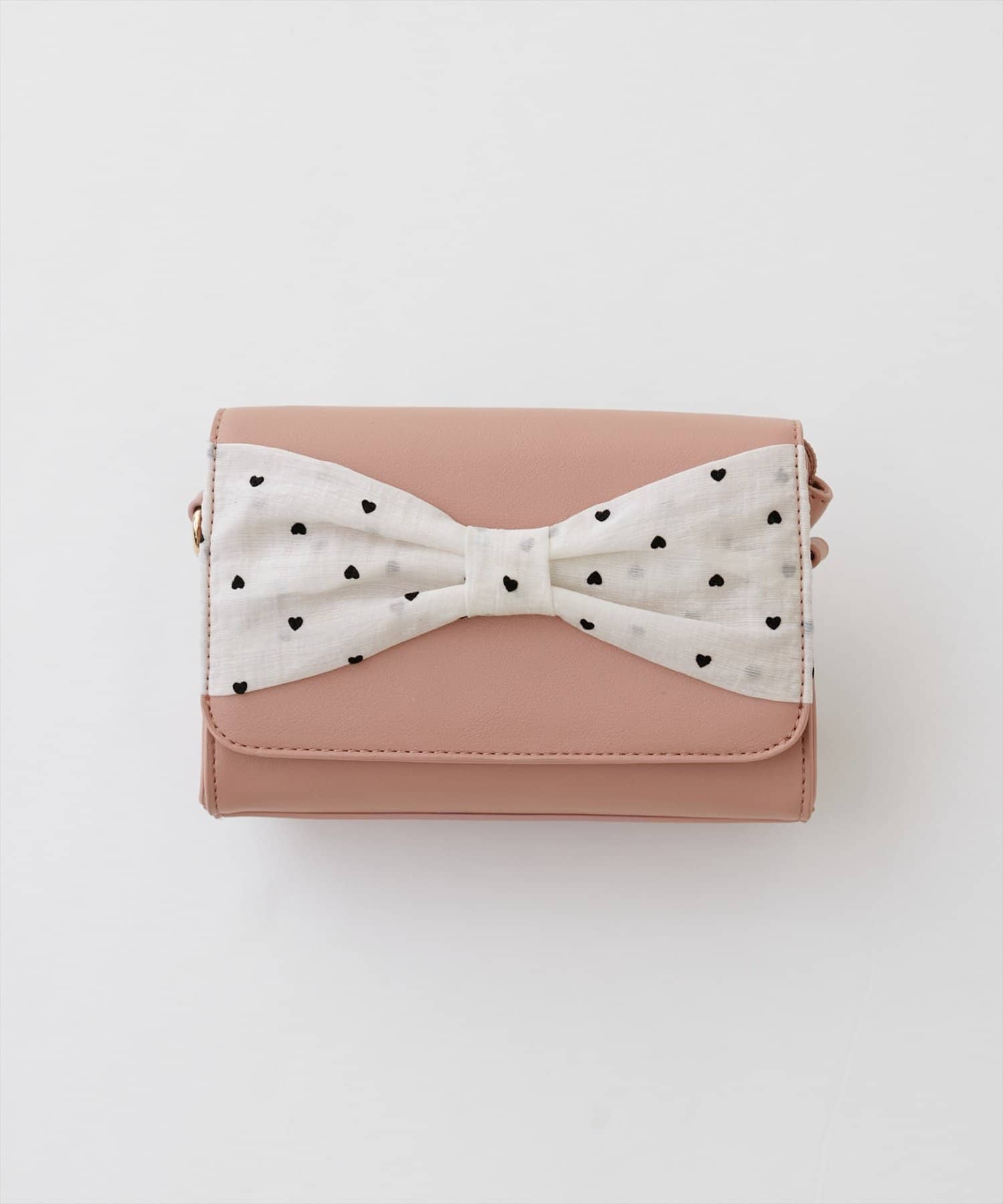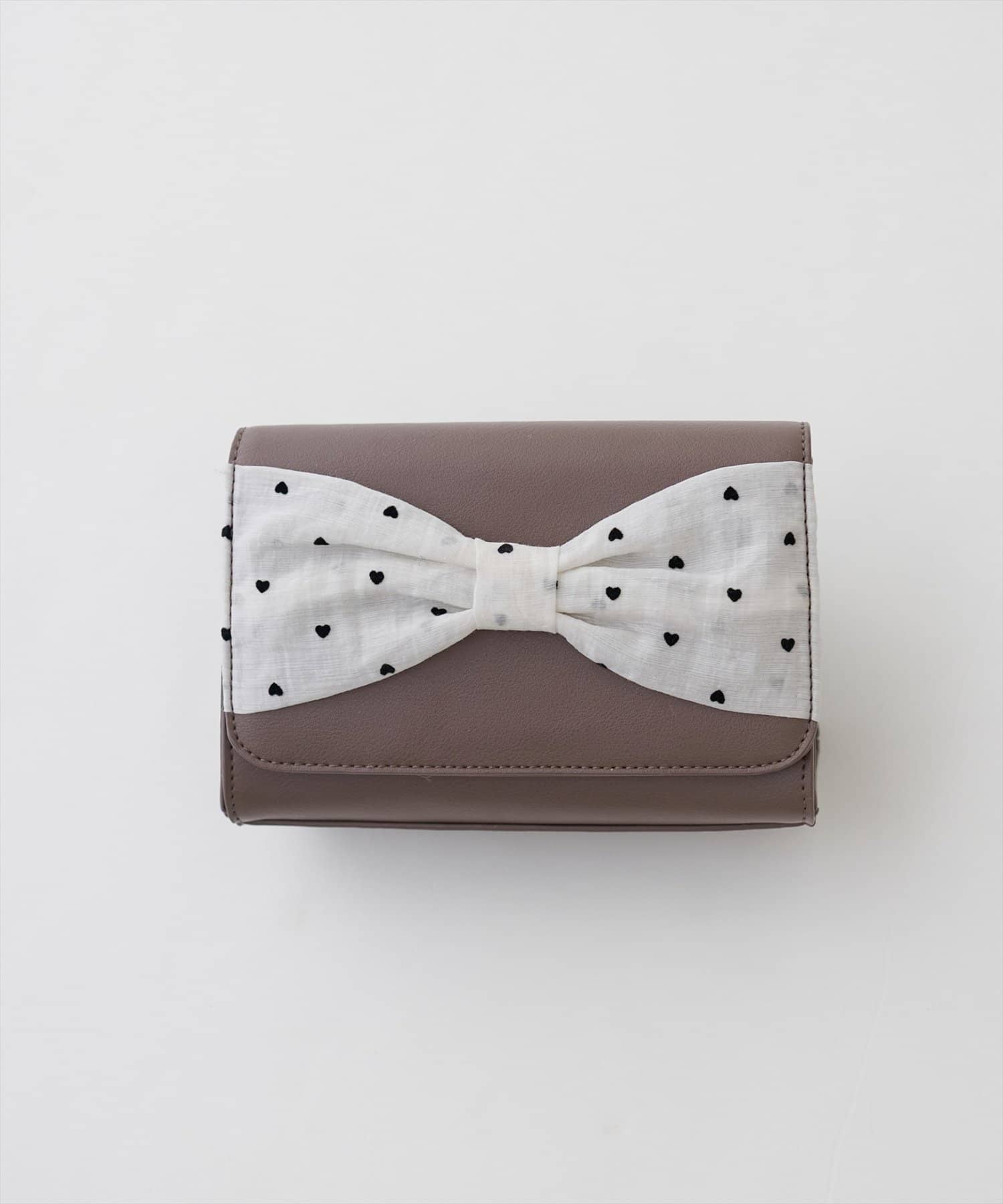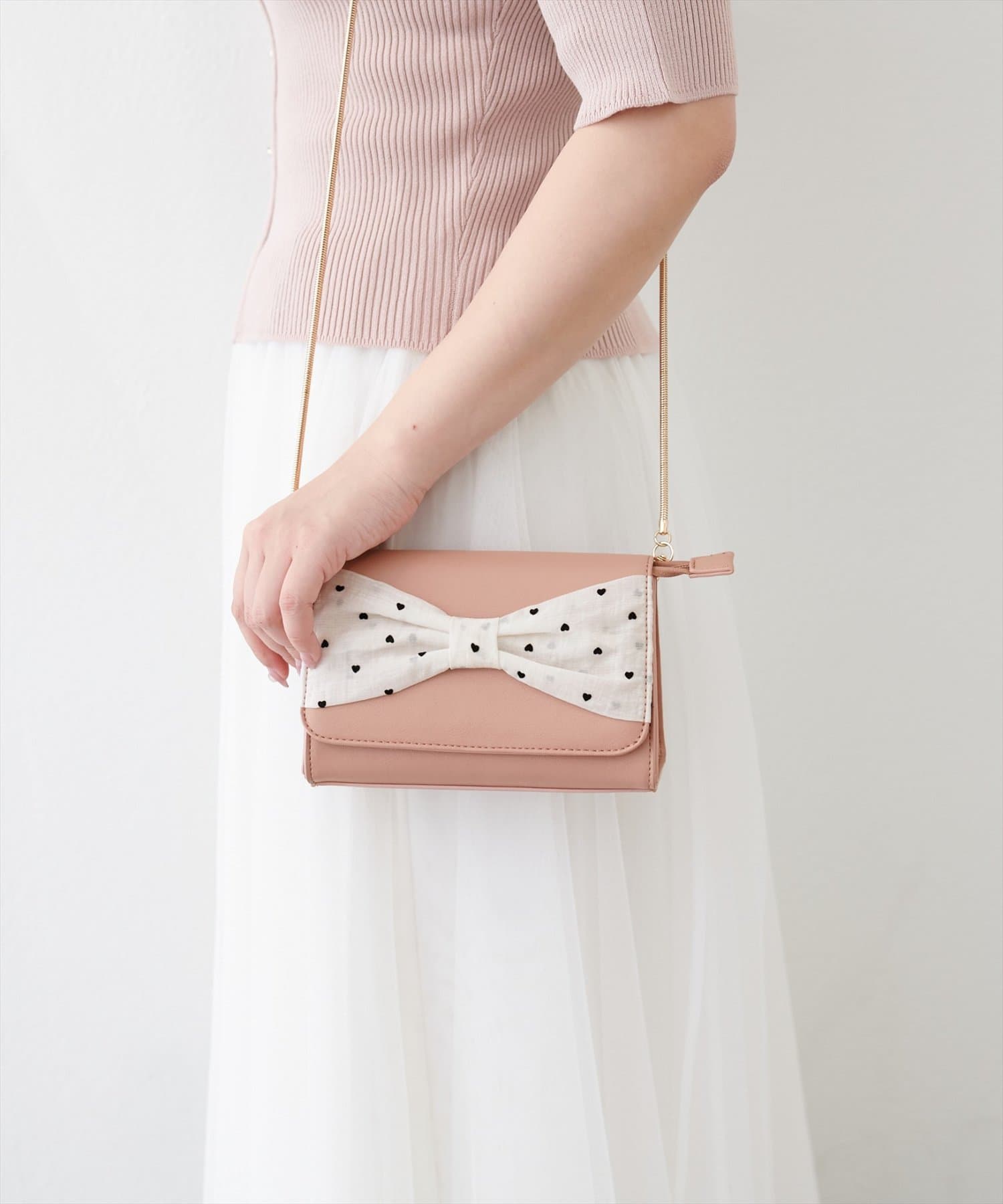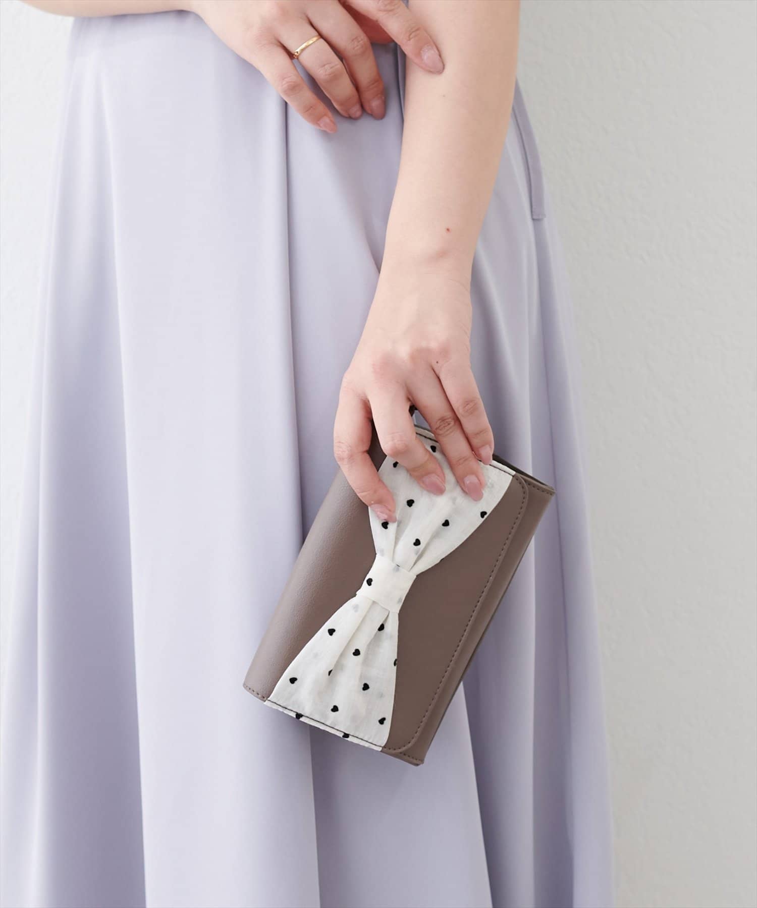 目を引く大きなリボン。ハートドット柄がさりげなく個性を演出し、可愛らしさの中に上品さをプラスしています。