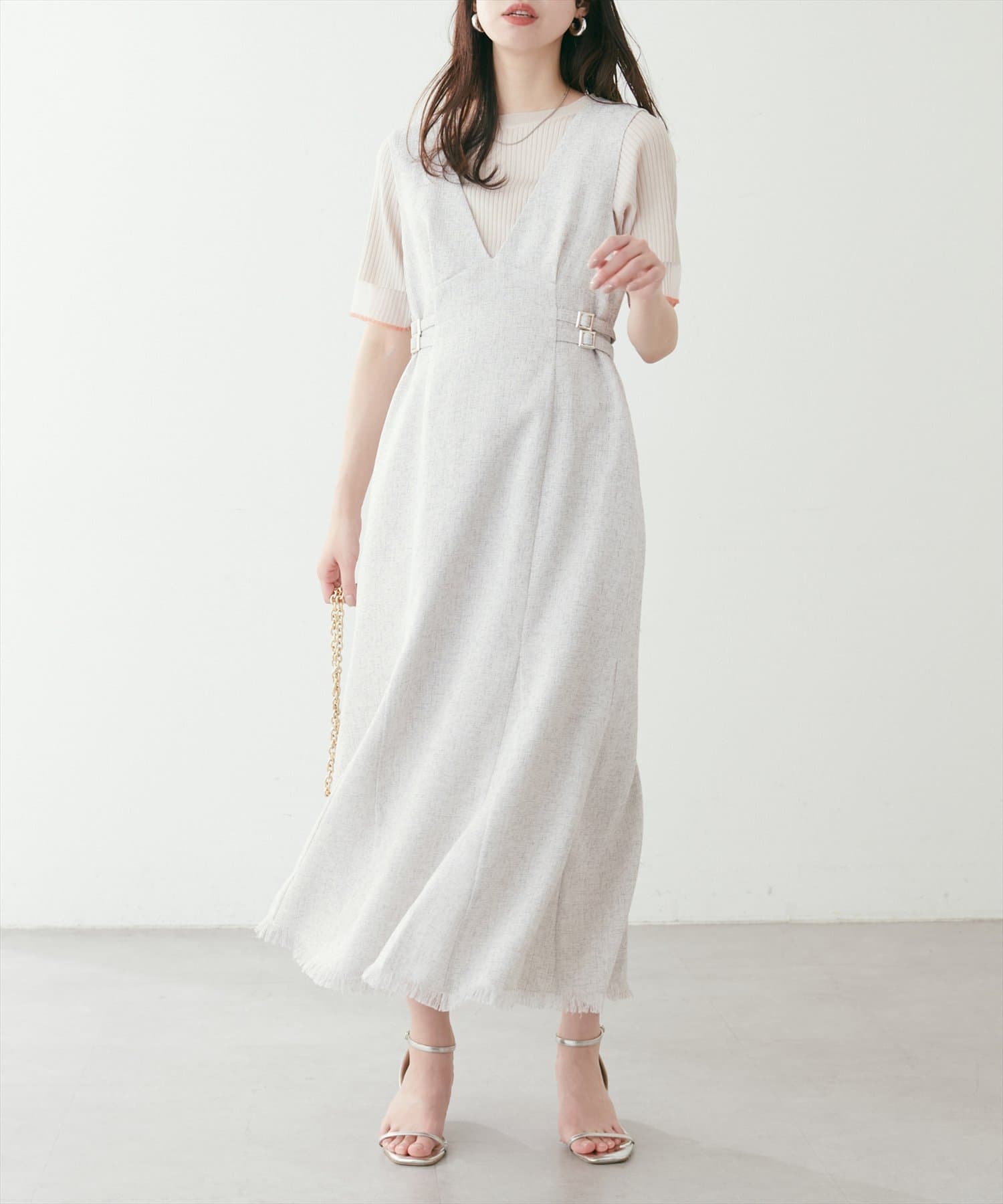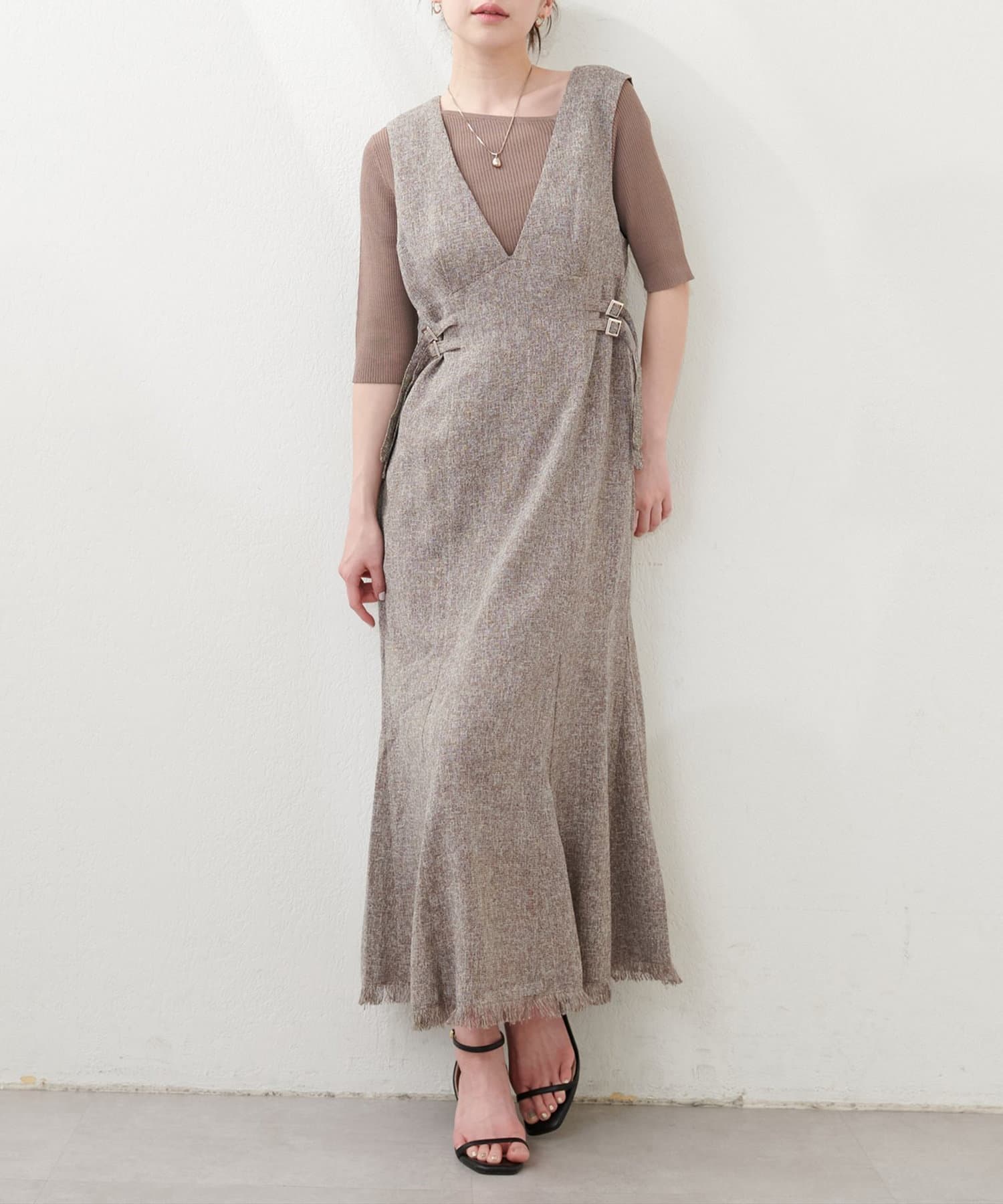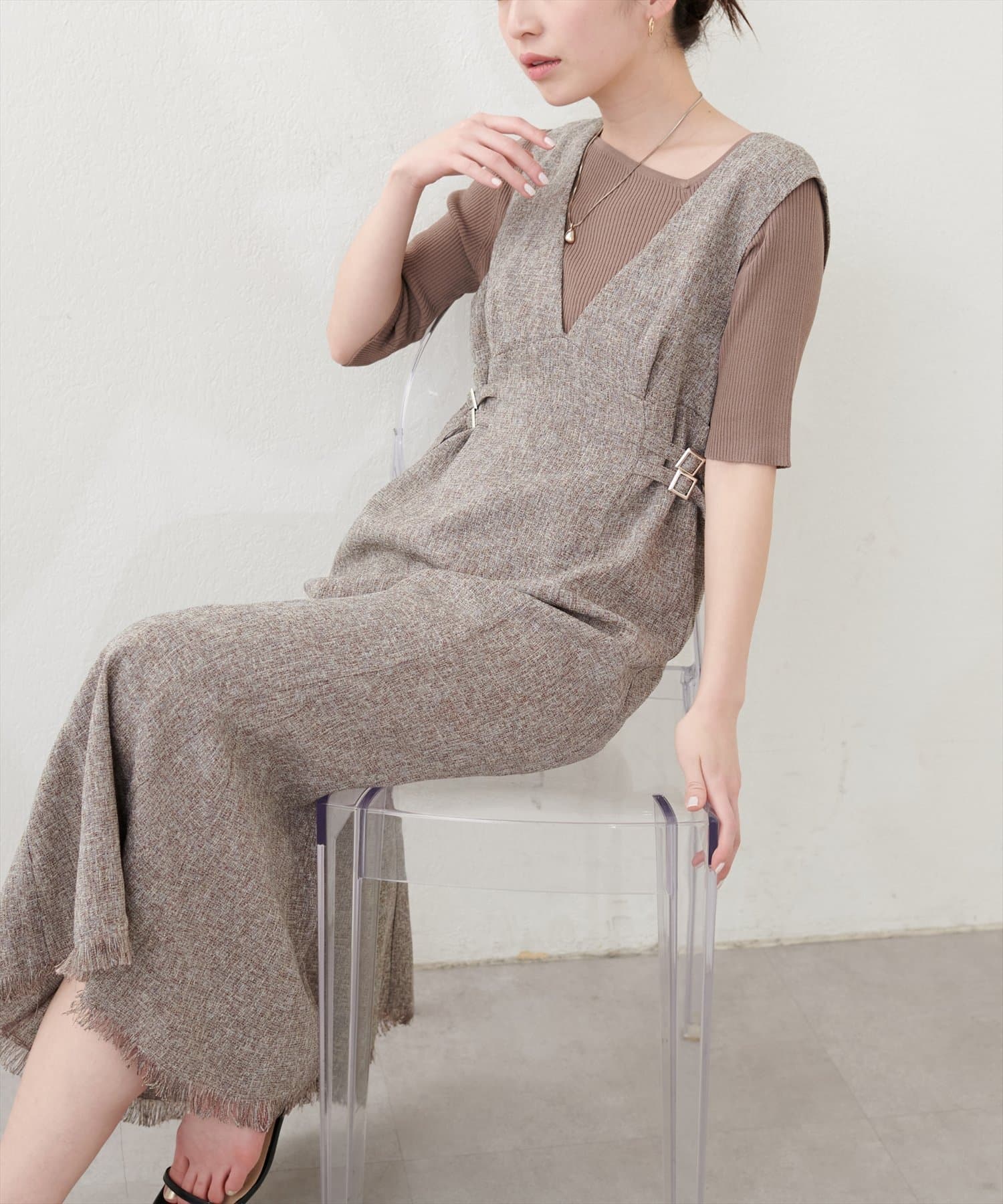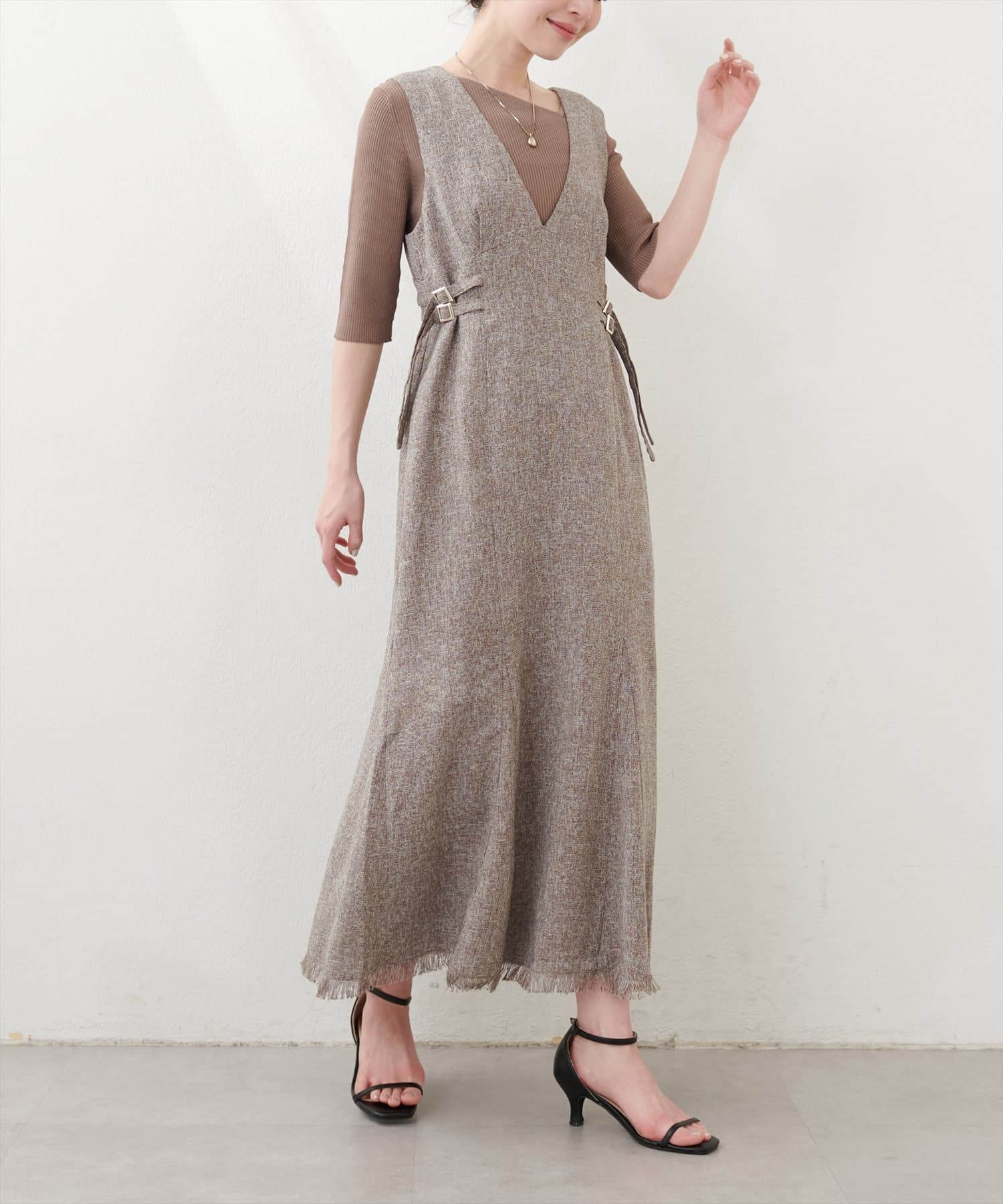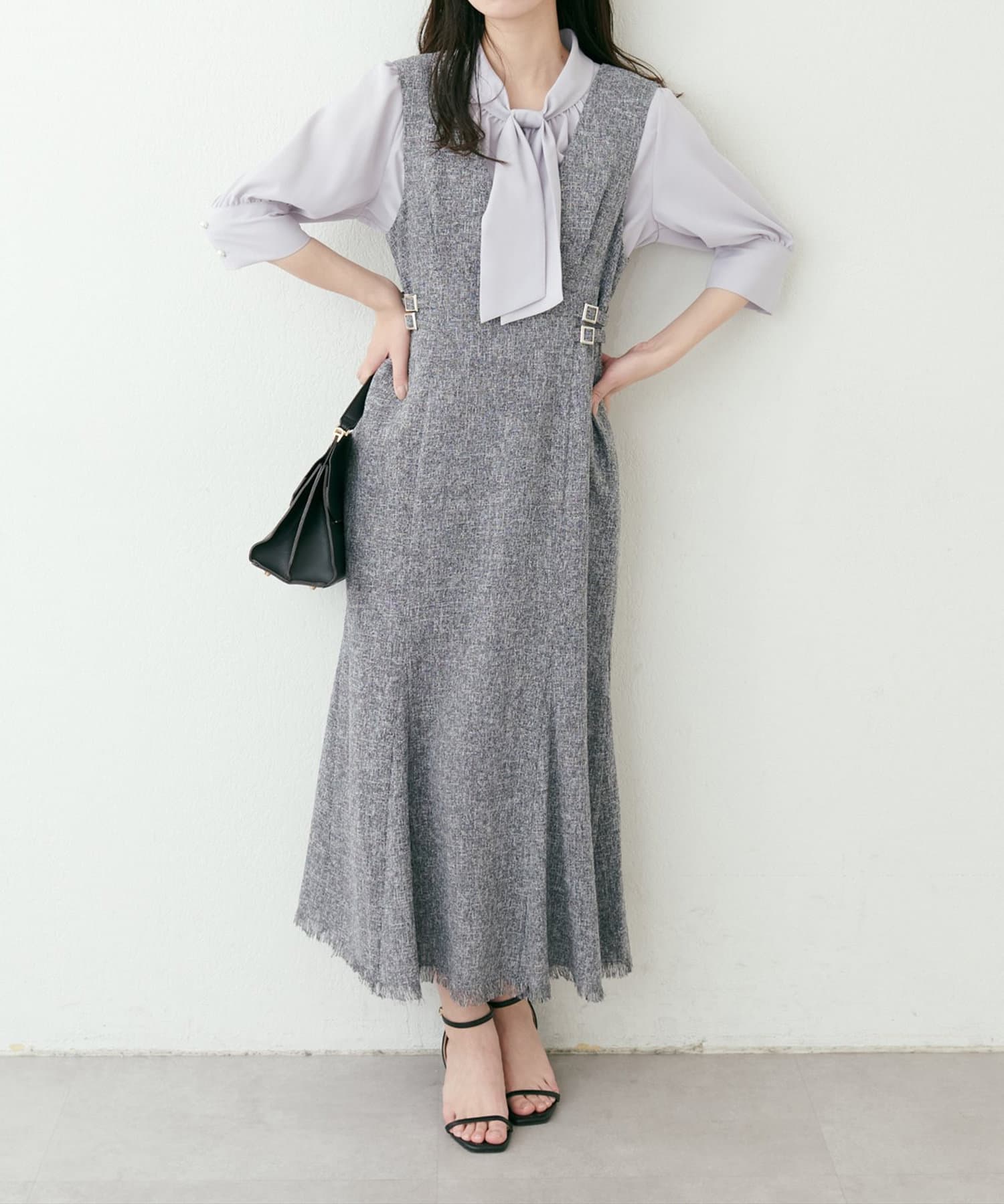 足もとはブーツ、パンプス、サンダルなどお好みの靴でスタイリング可能です。