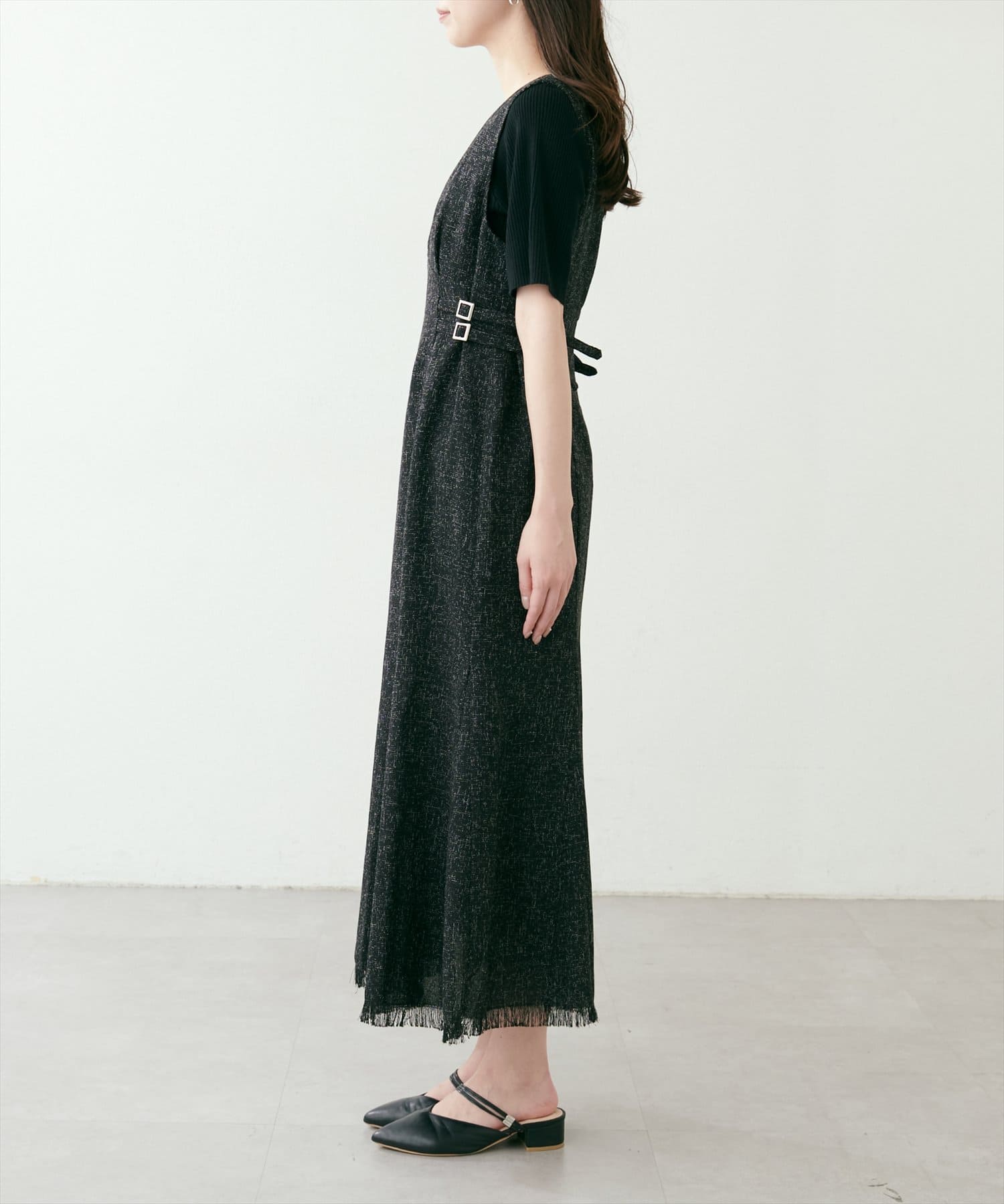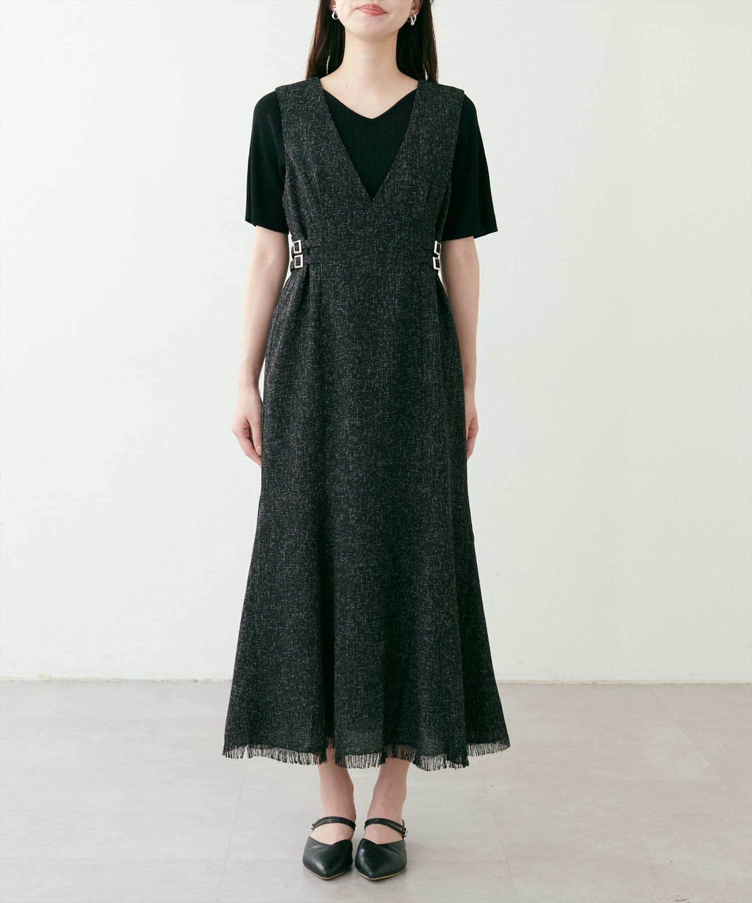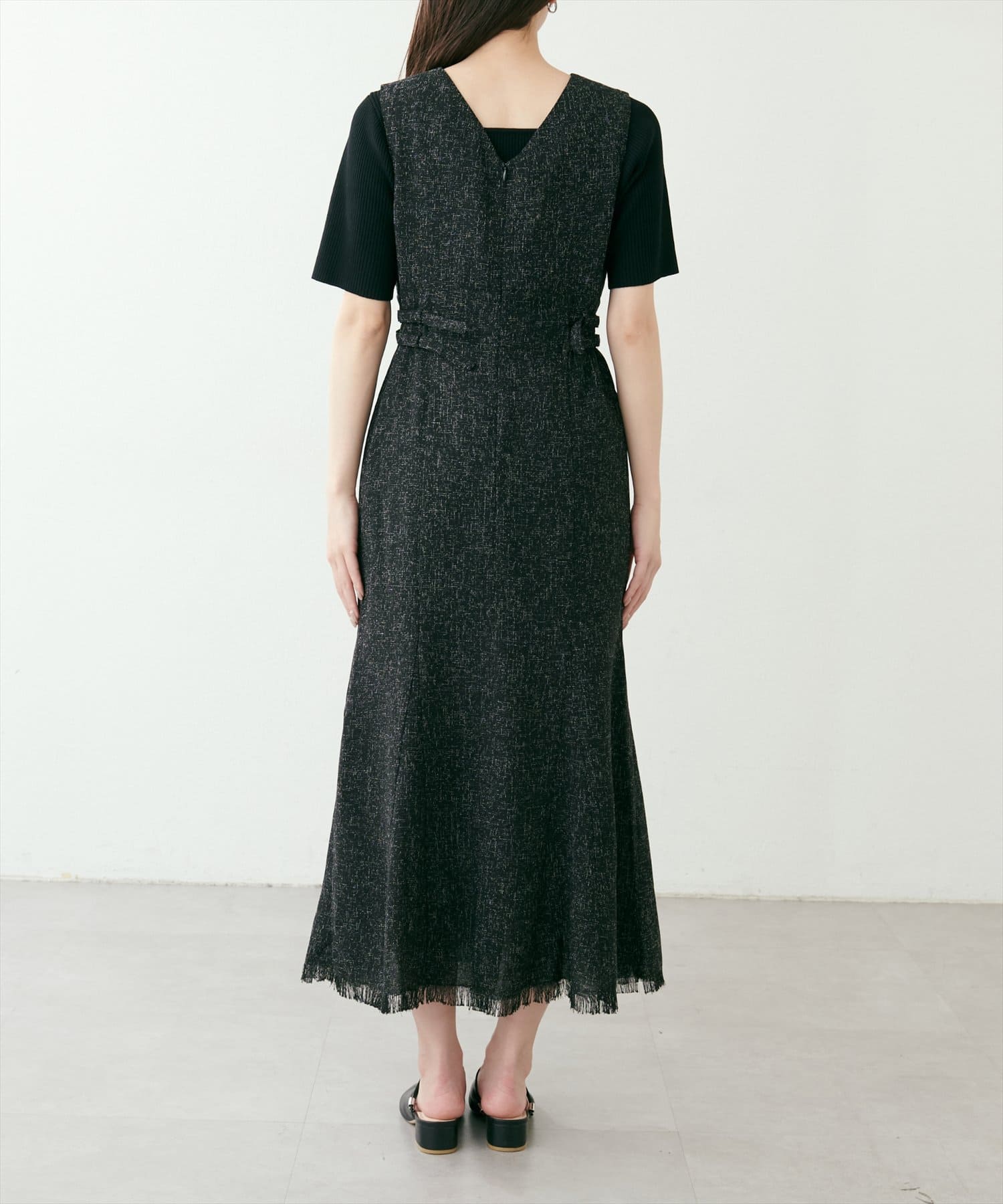 スカート部分は途中から動きの出るフレアになっていて、フリンジの付いた裾が動くたびに綺麗なドレープが生まれます。