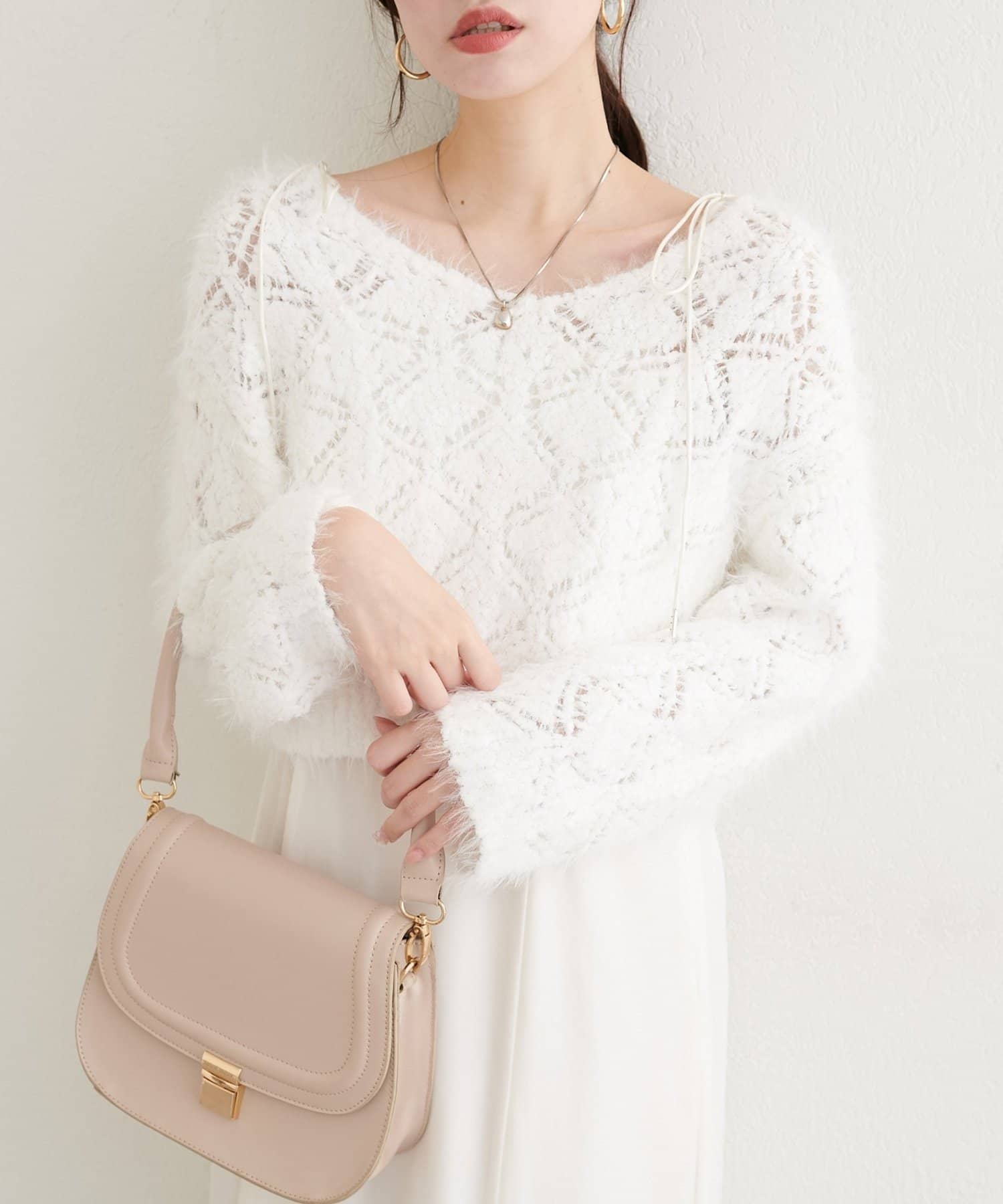 ゆるく編み上げた生地に、ふわっとした毛足の長いフェザー糸をミックス。ホワイトのみやや透け感があり、ピンク・モカは透けにくい仕様です。