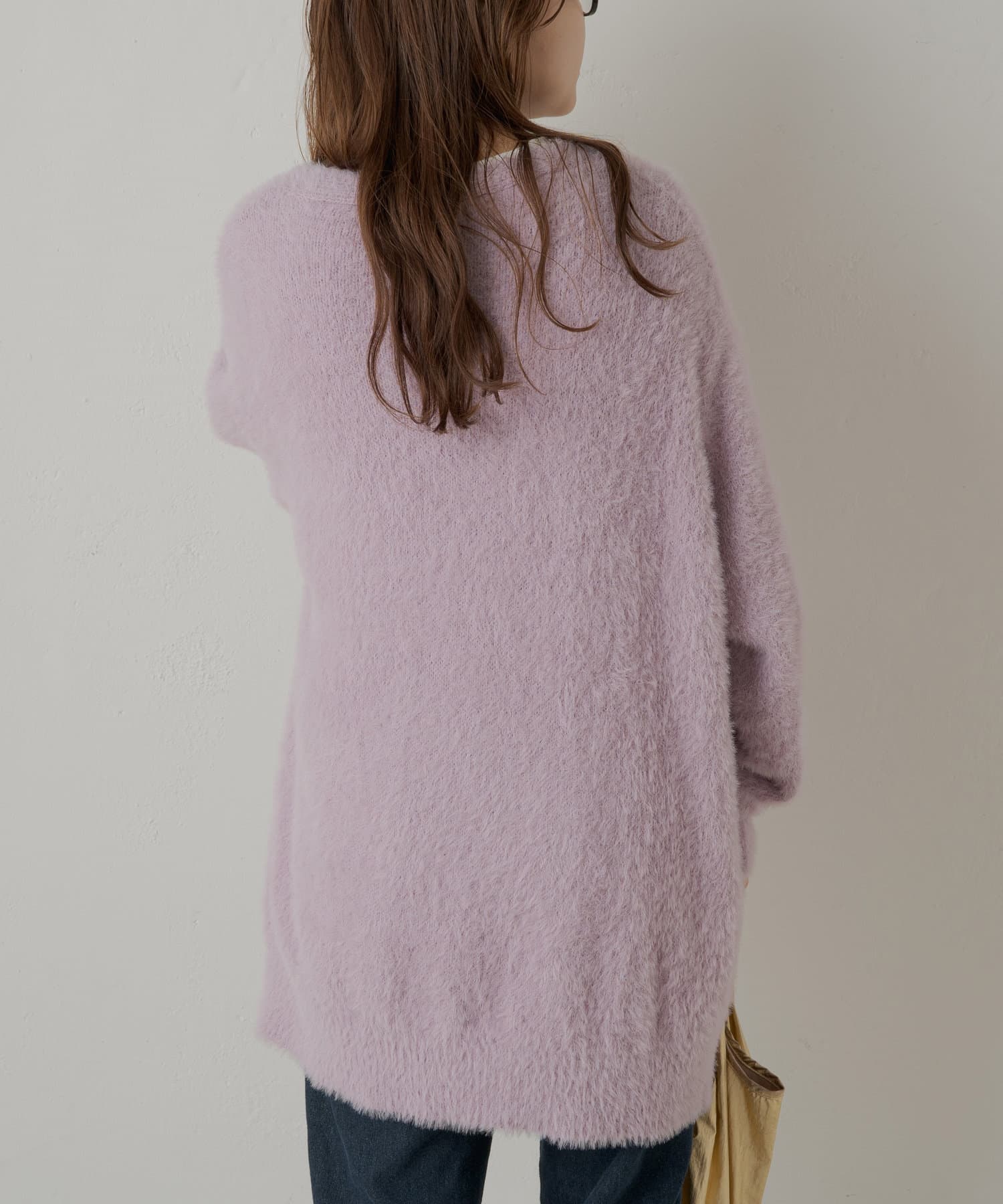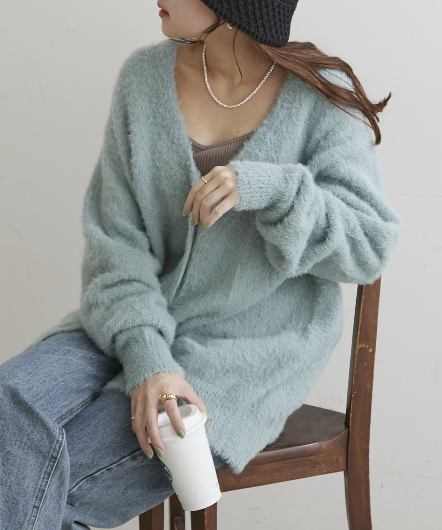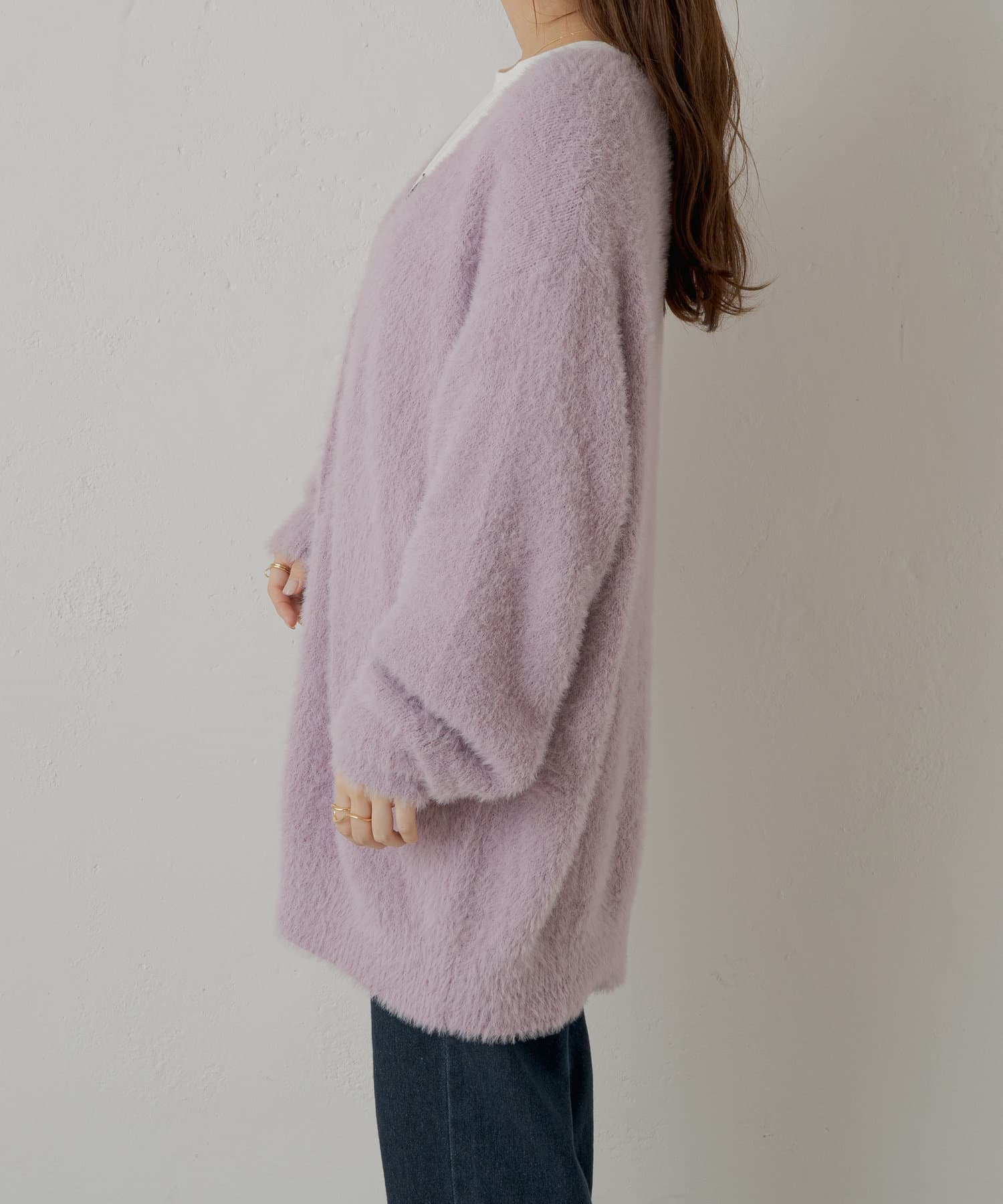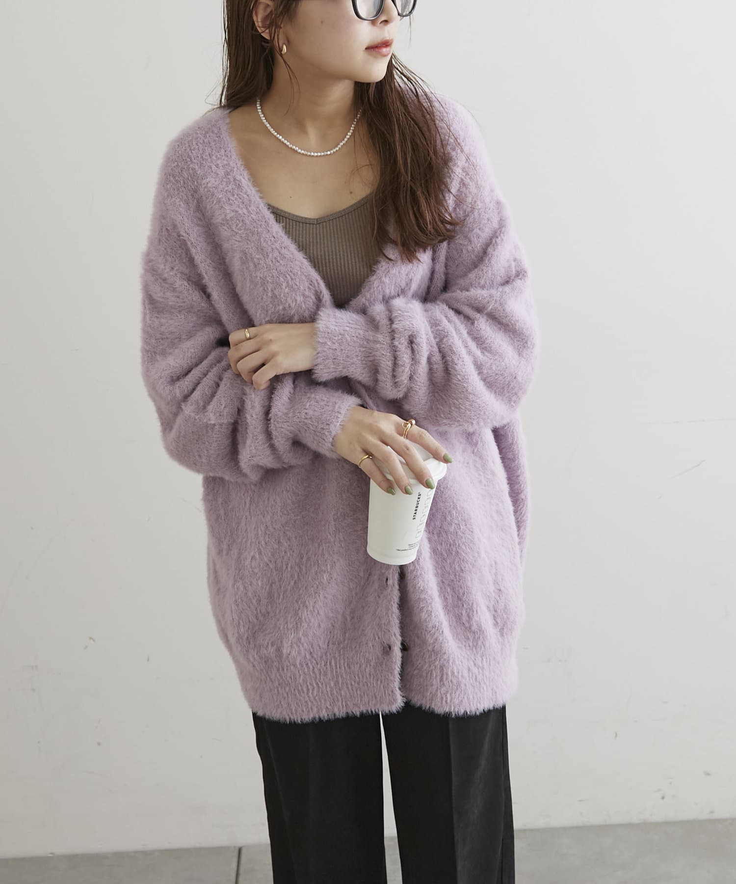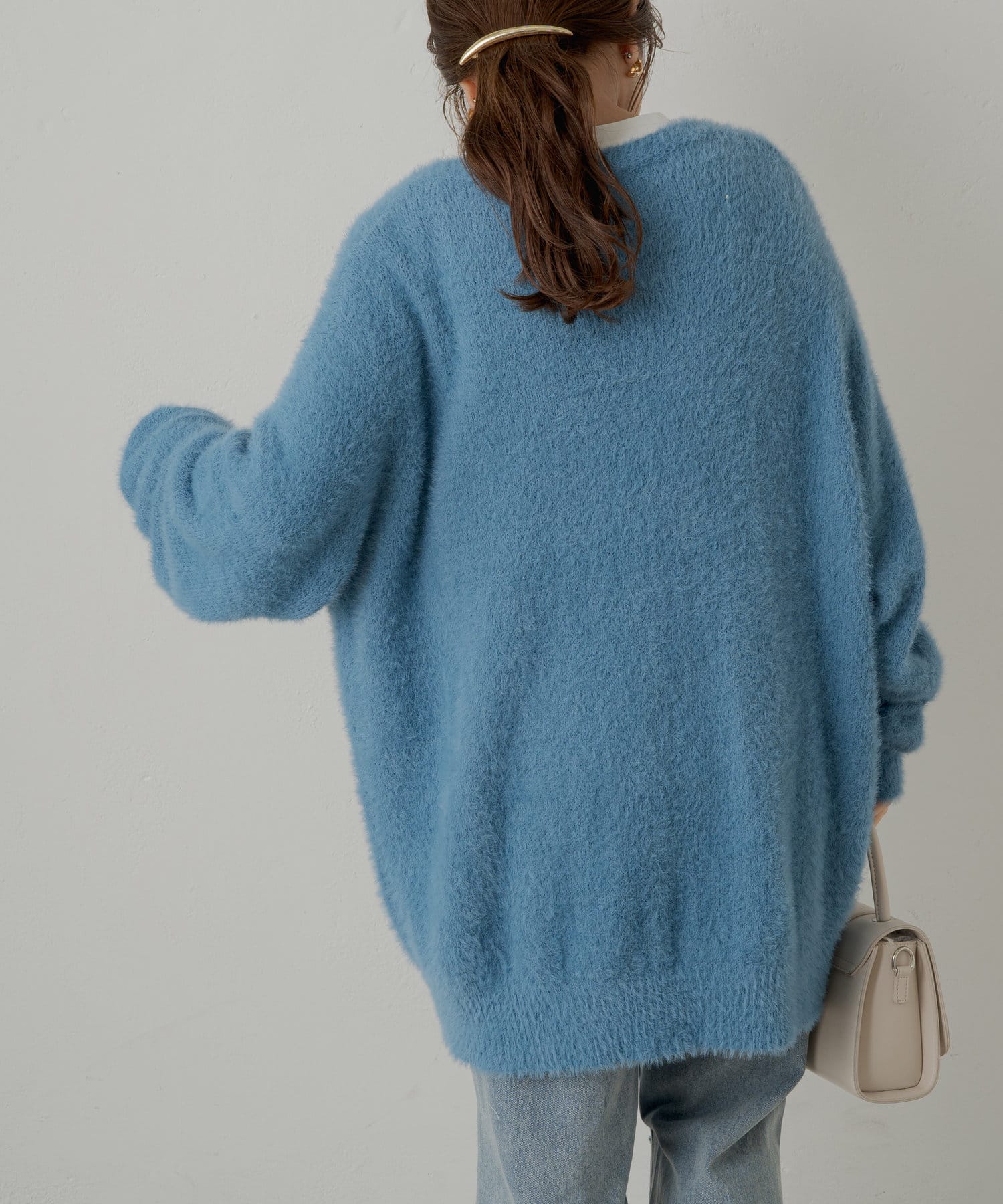 ・ふわふわしたフェザーヤーンで表情たっぷりに仕上げたビッグシルエットのニットカーディガン。