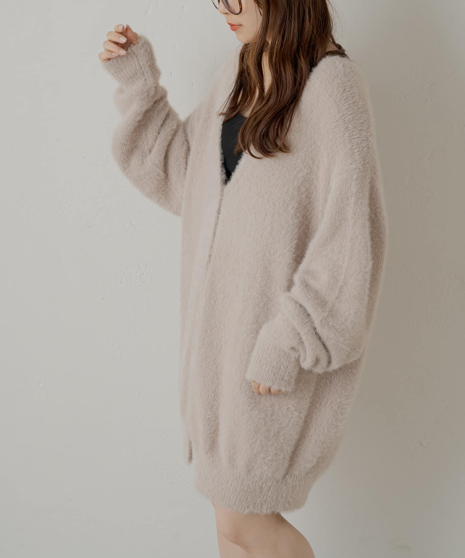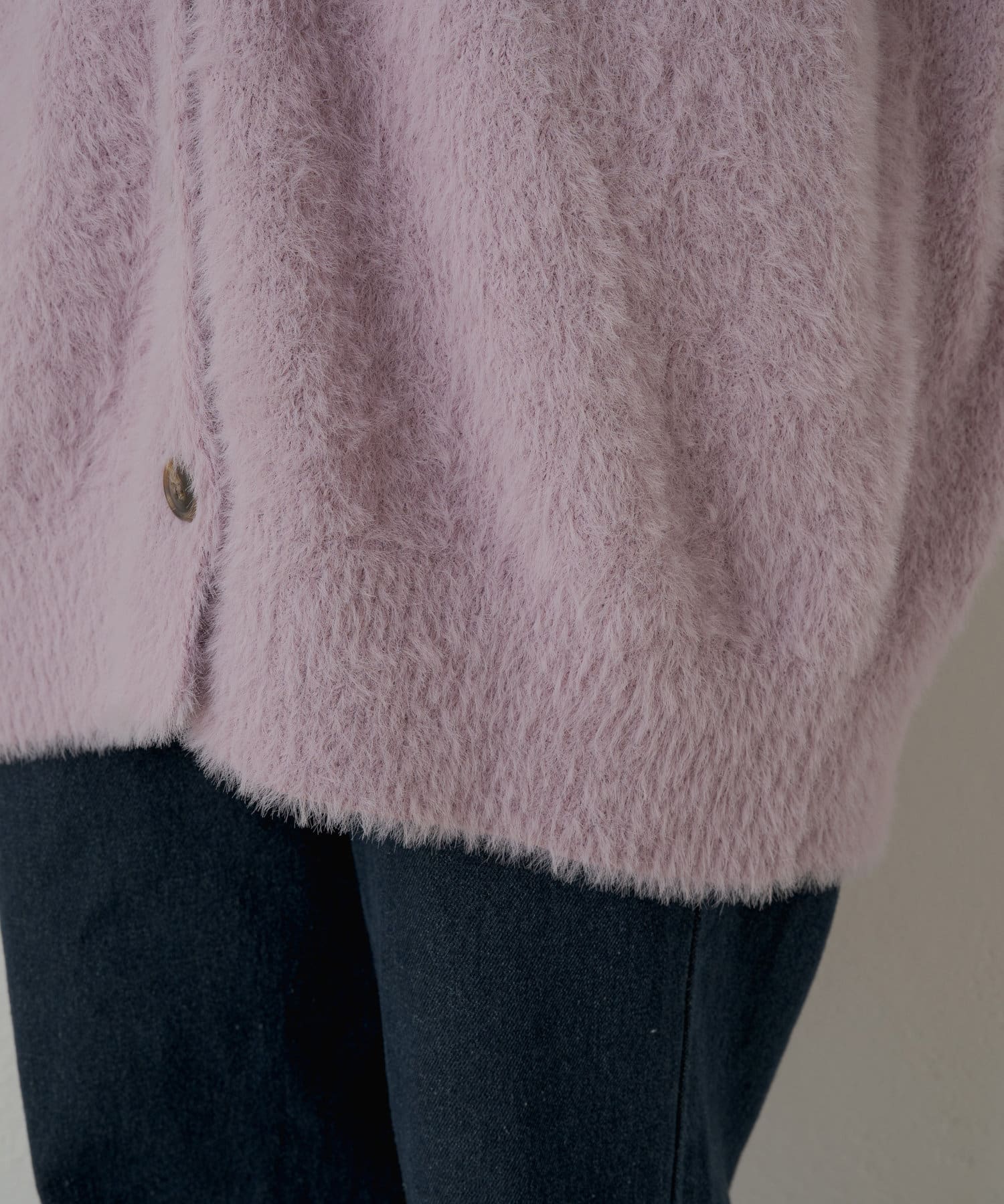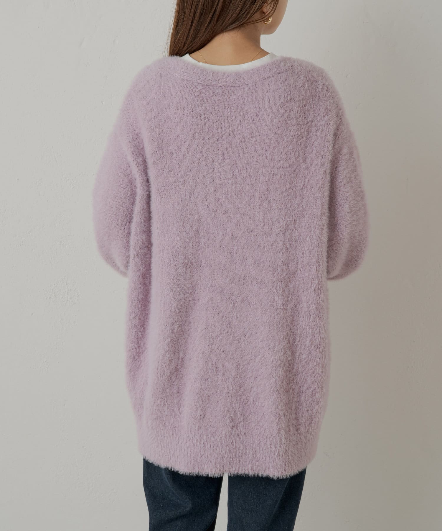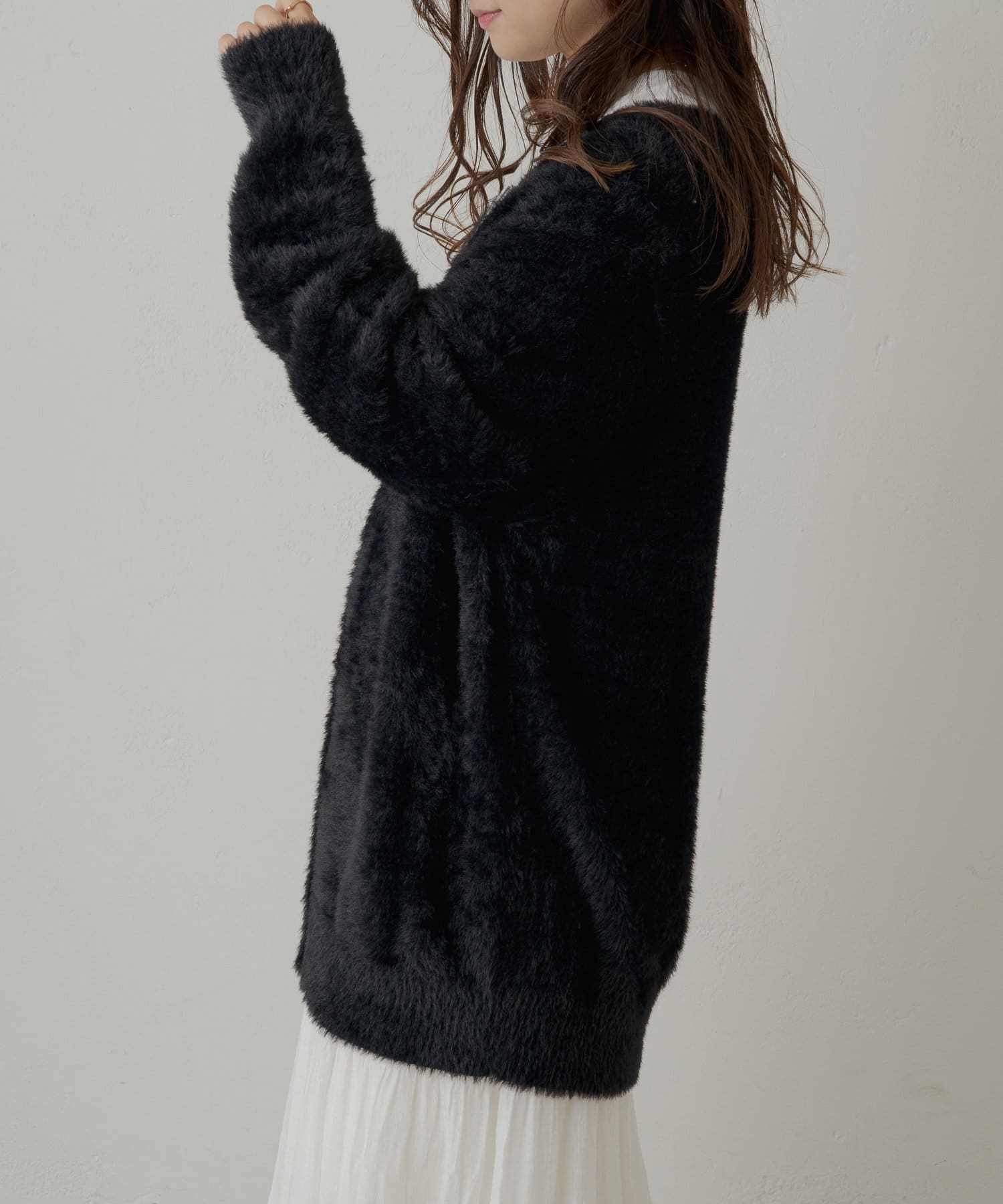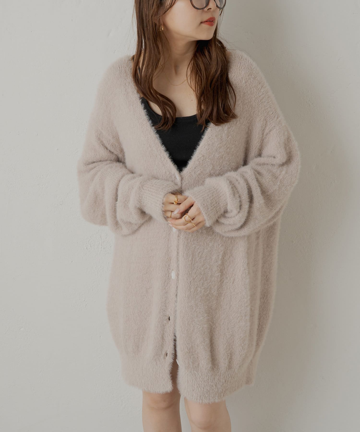 ・ふわふわしたフェザーヤーンで表情たっぷりに仕上げたビッグシルエットのニットカーディガン。