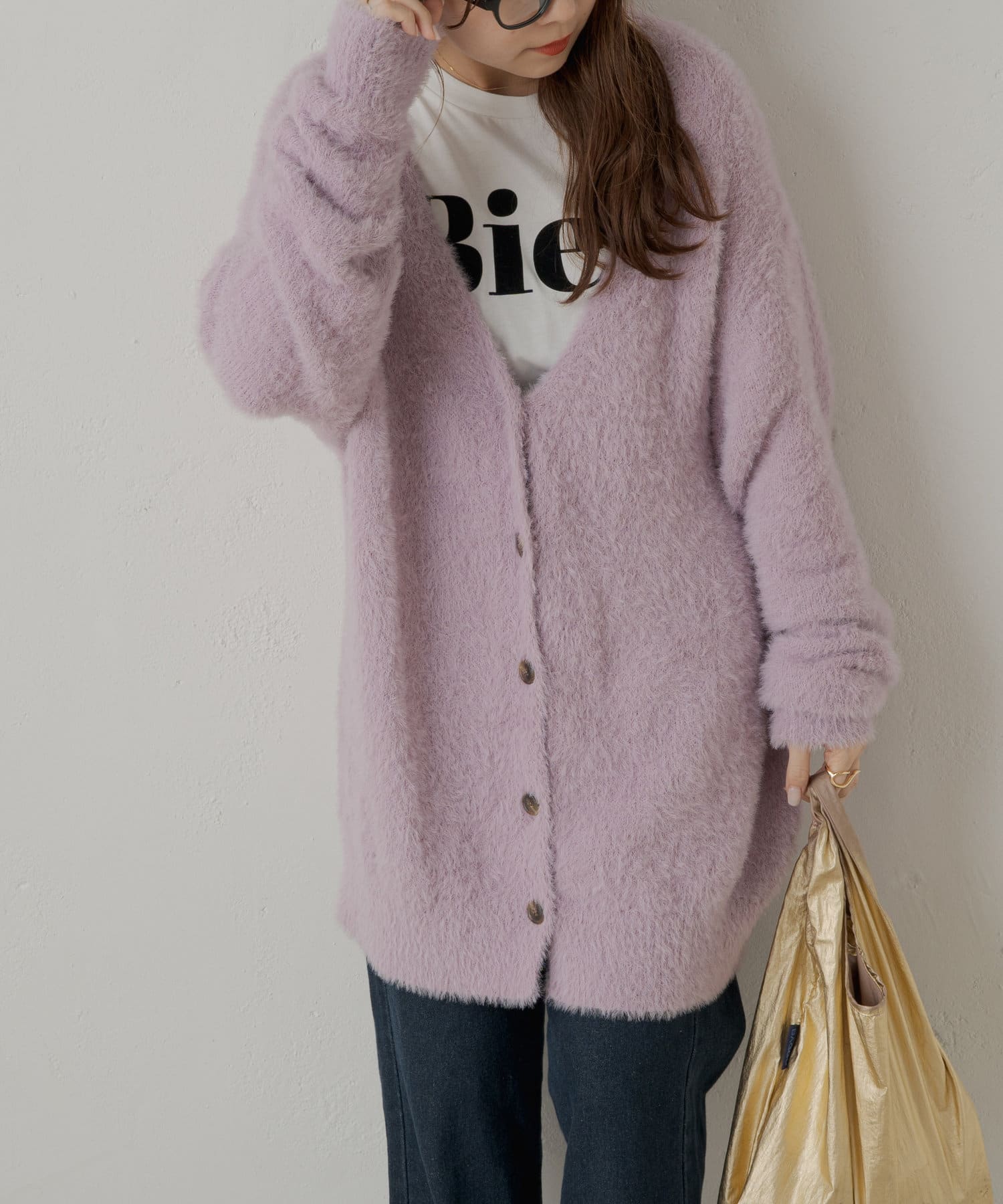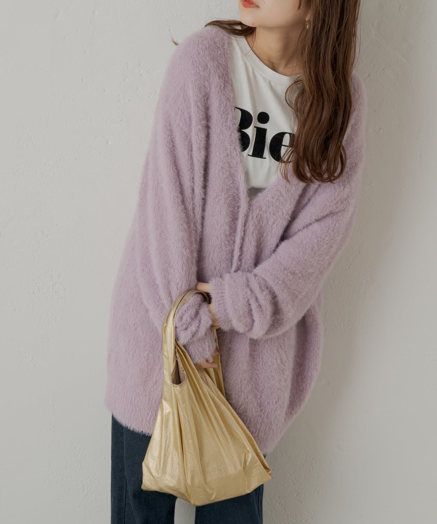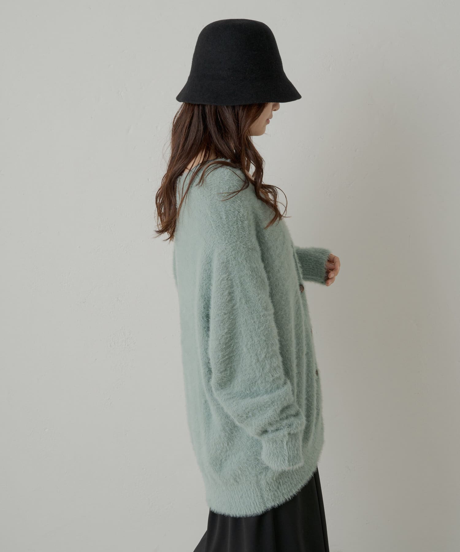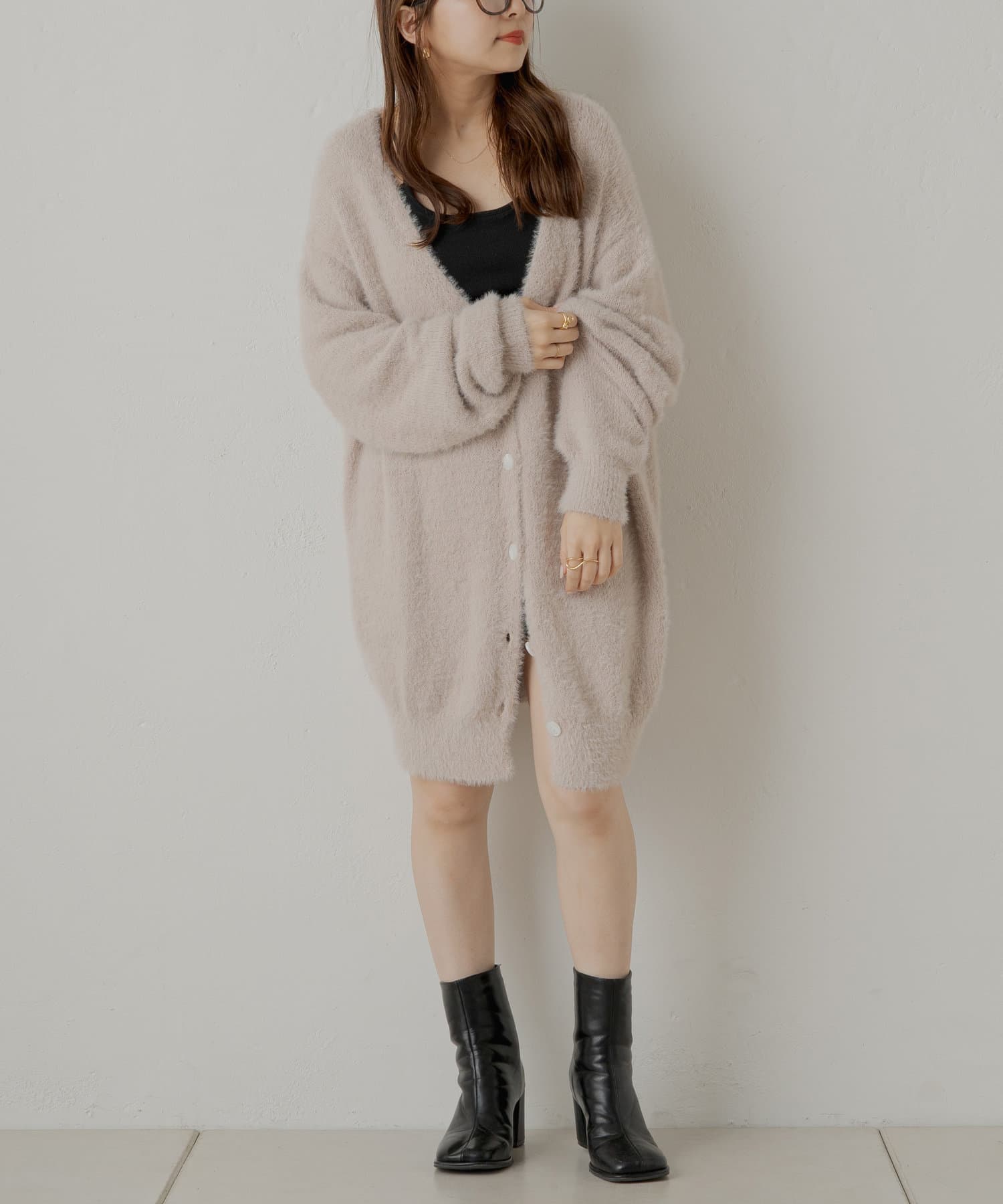 ・ふわふわしたフェザーヤーンで表情たっぷりに仕上げたビッグシルエットのニットカーディガン。