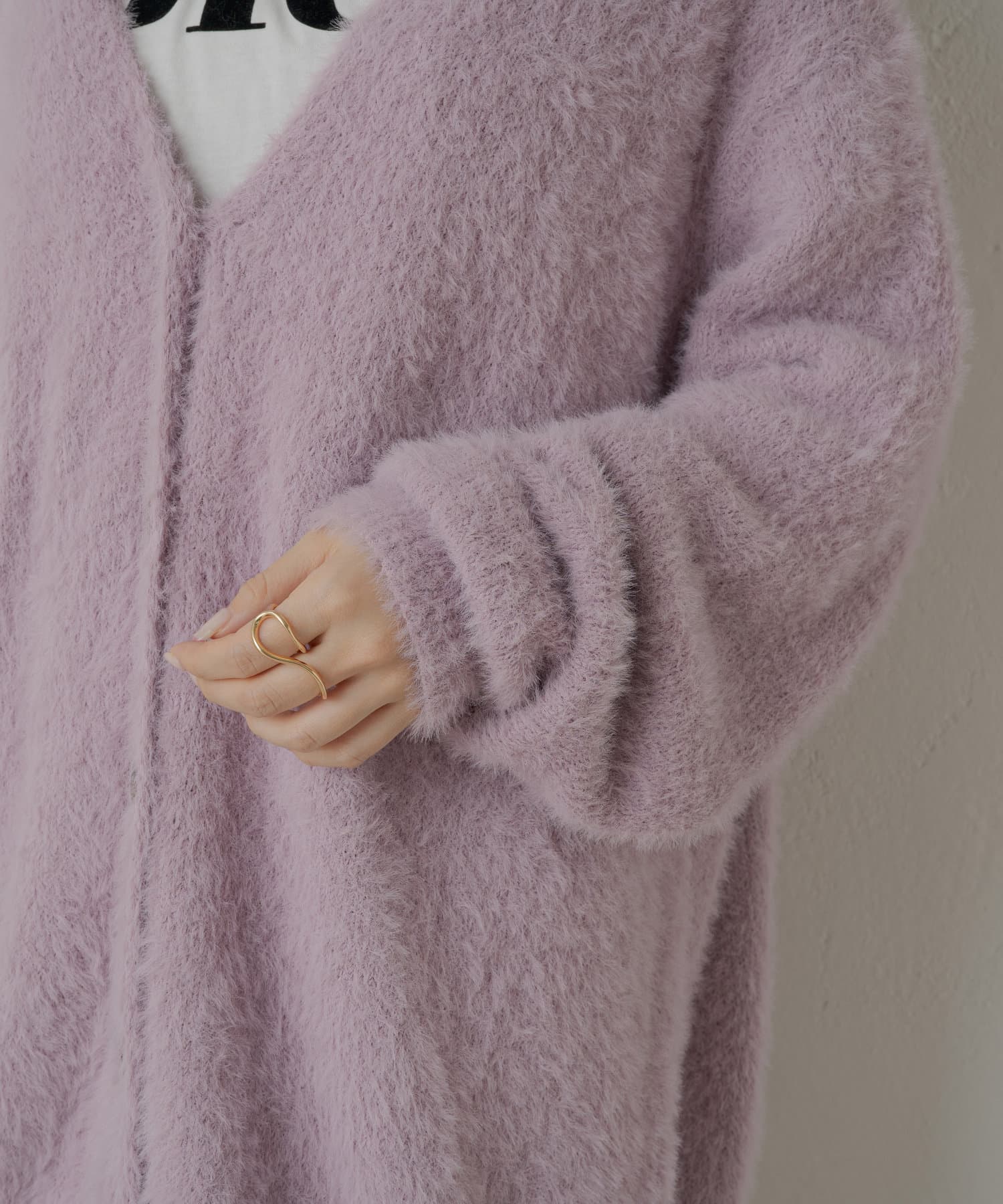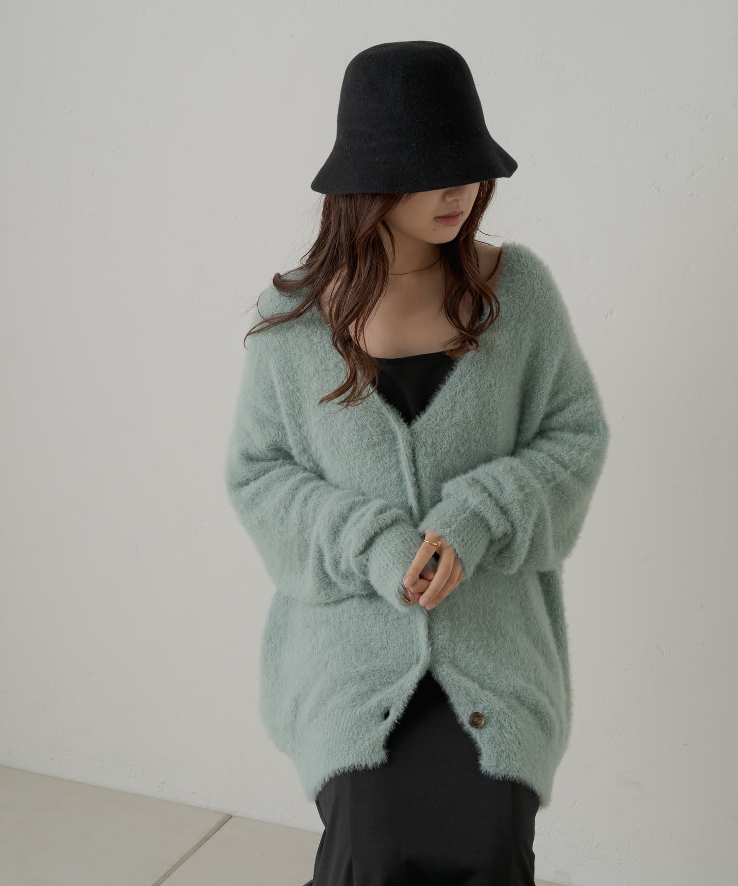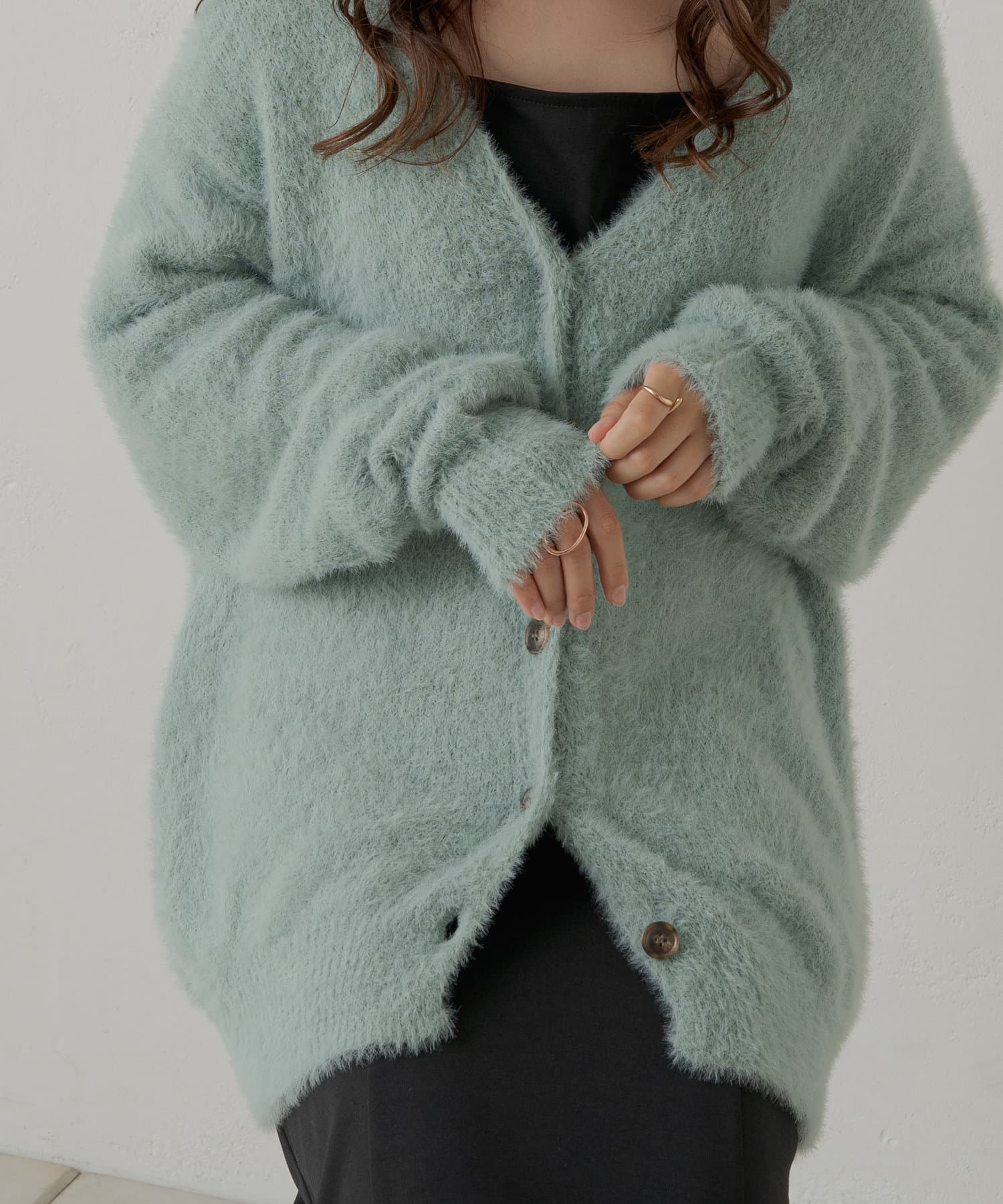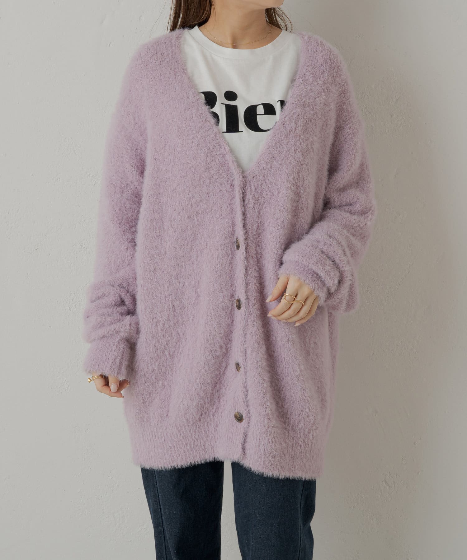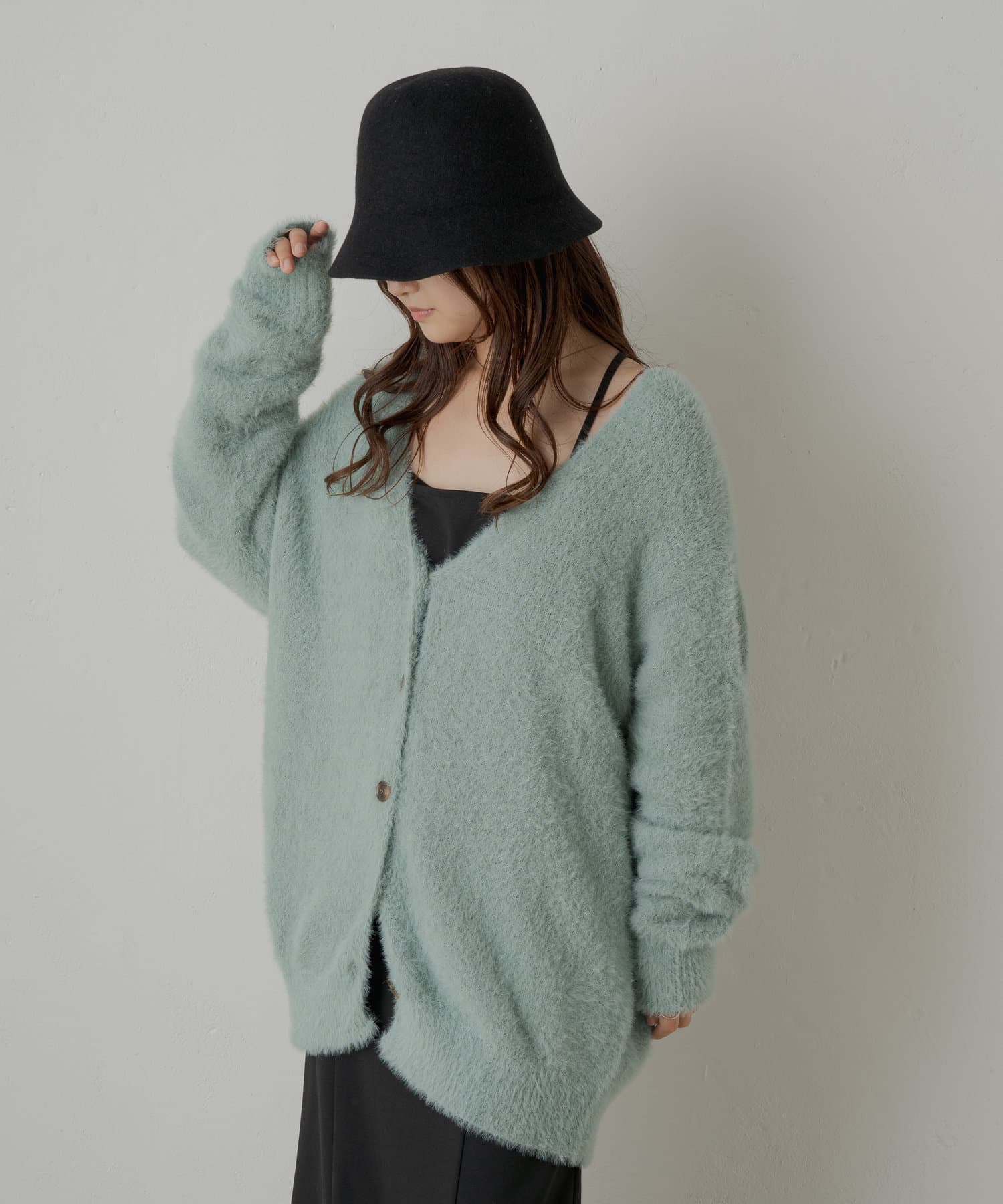・ふわふわしたフェザーヤーンで表情たっぷりに仕上げたビッグシルエットのニットカーディガン。