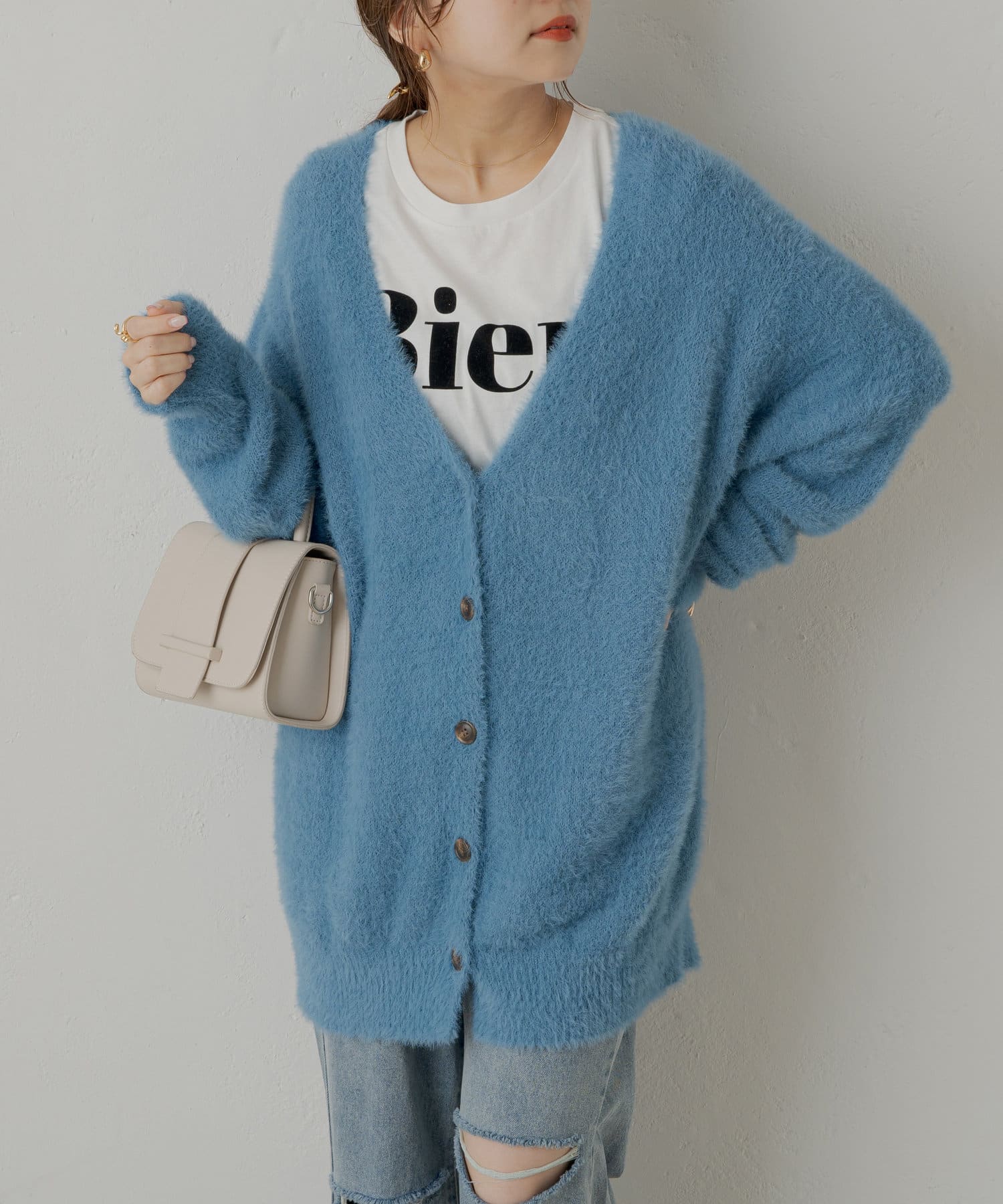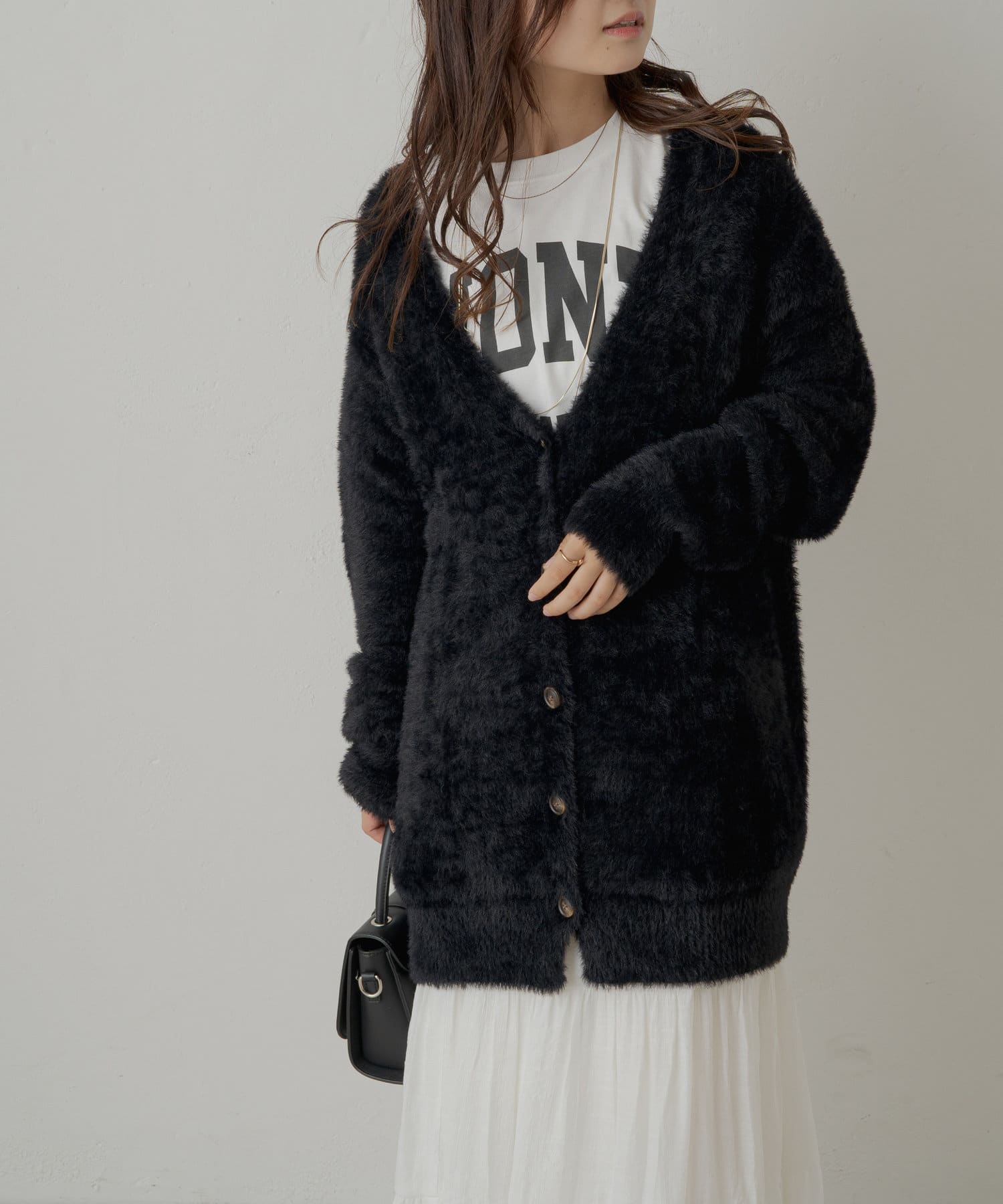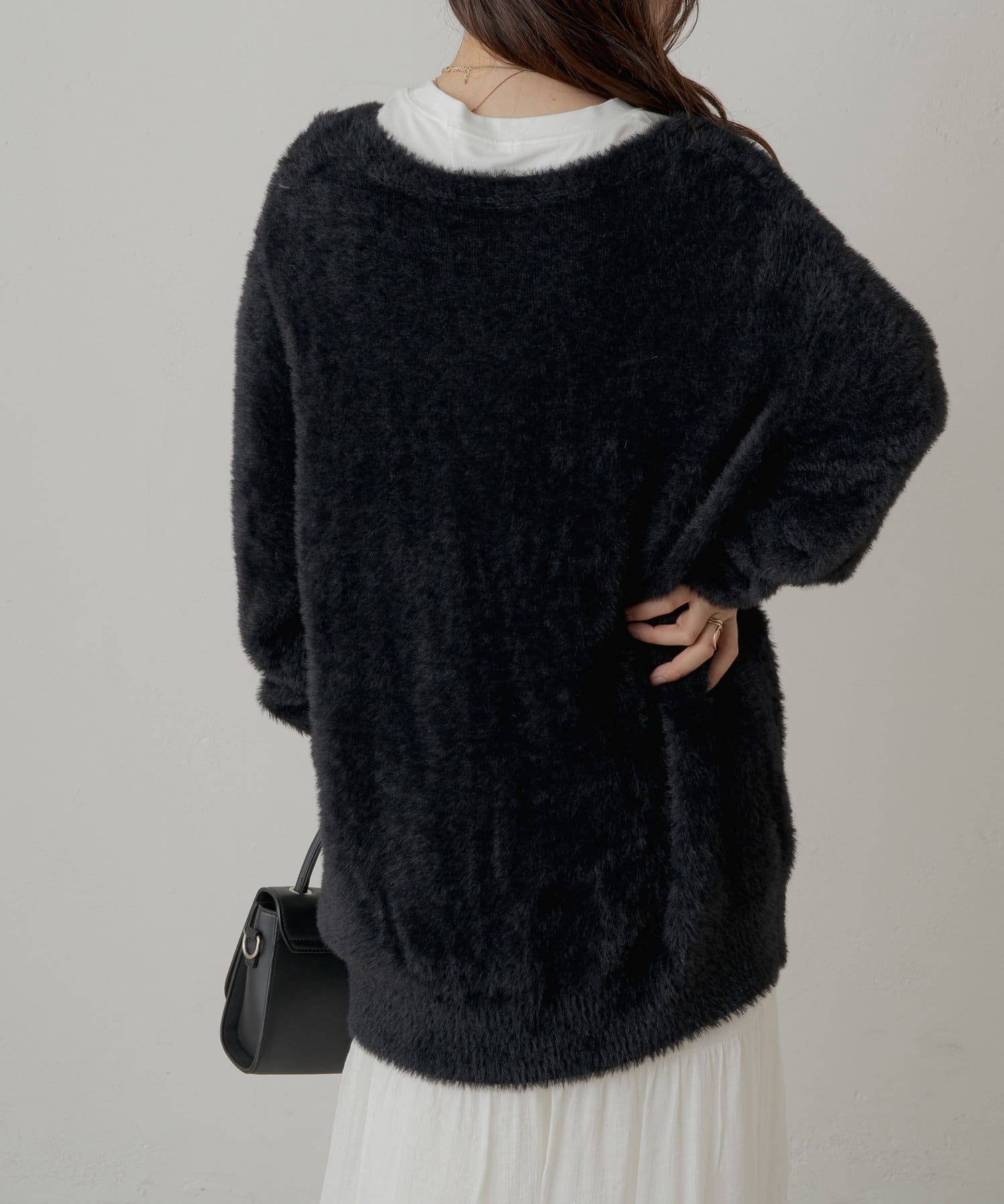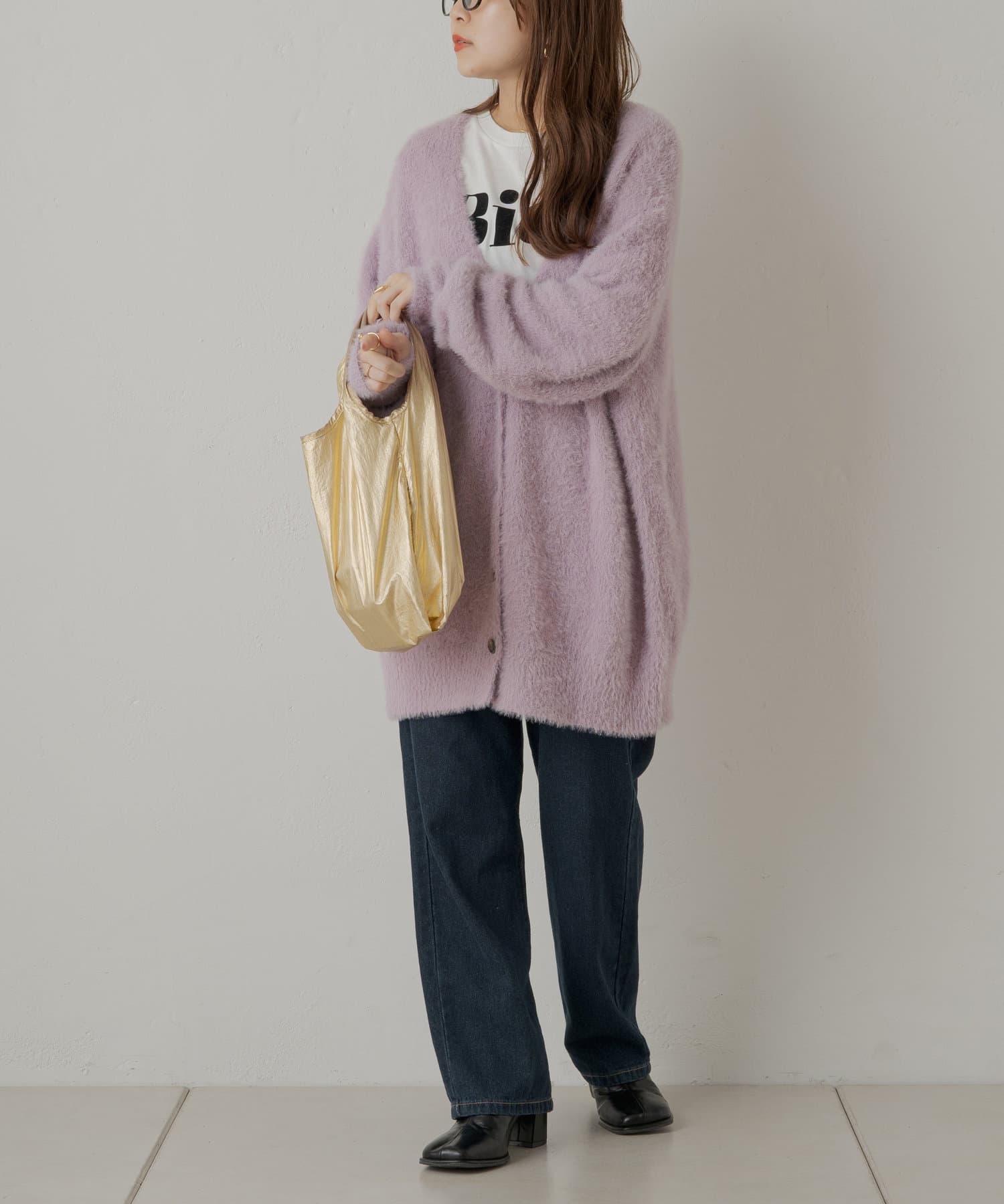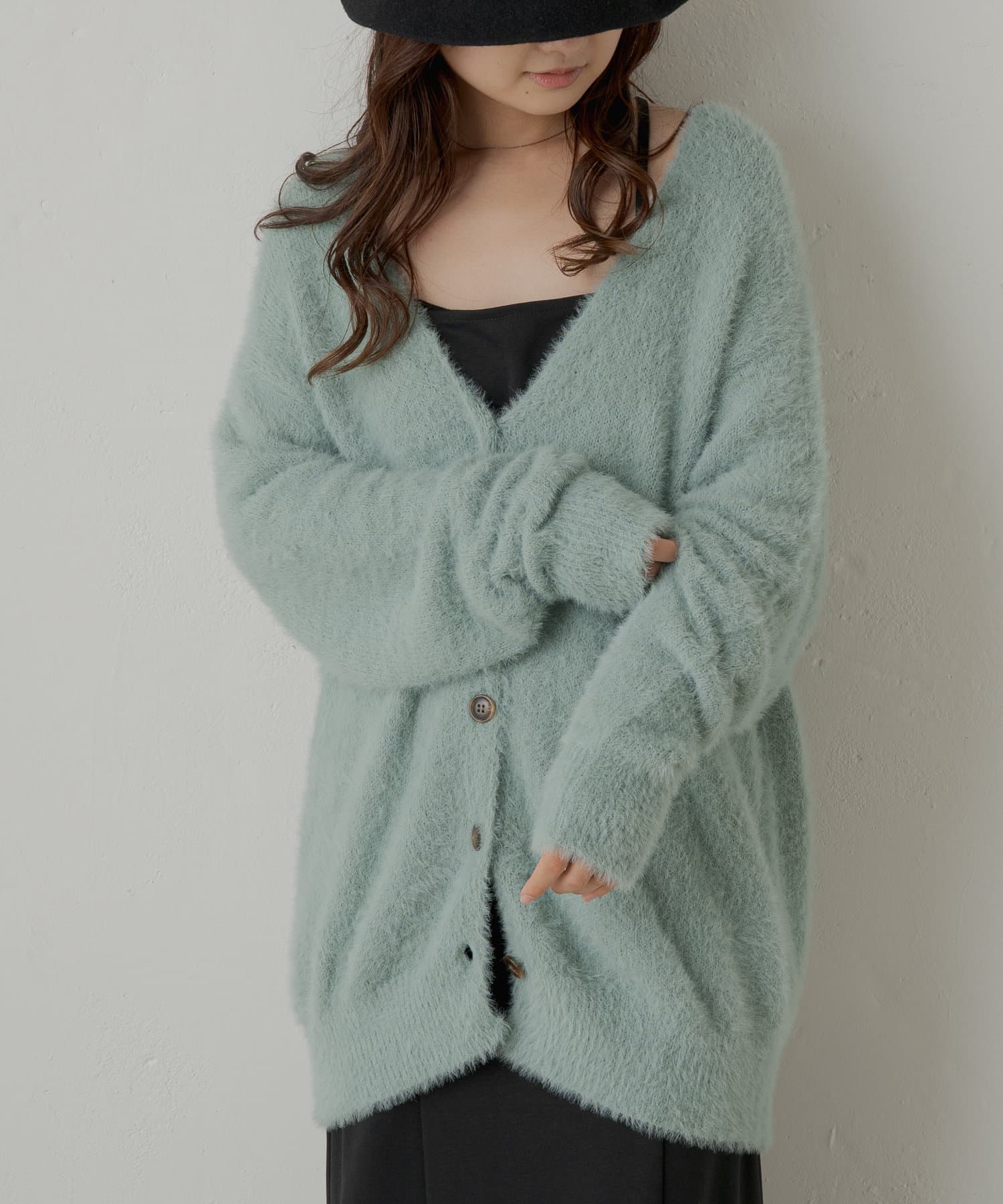 ・ふわふわしたフェザーヤーンで表情たっぷりに仕上げたビッグシルエットのニットカーディガン。