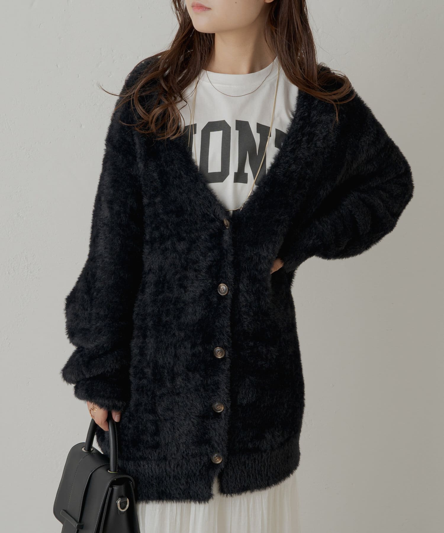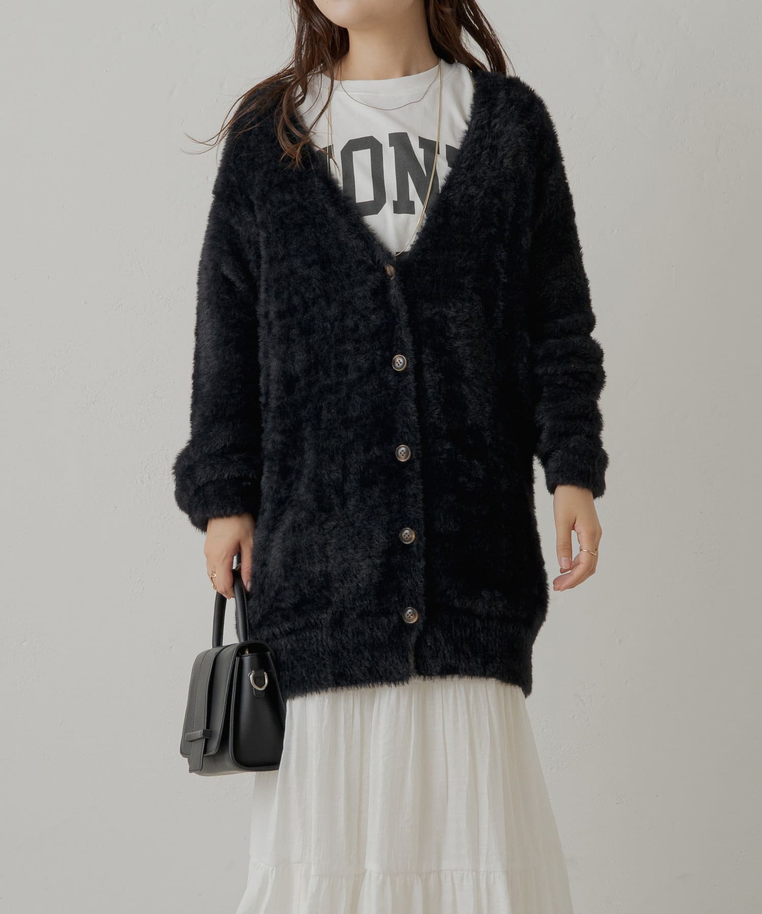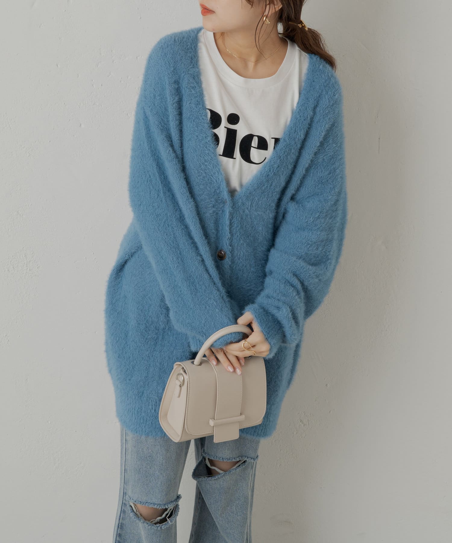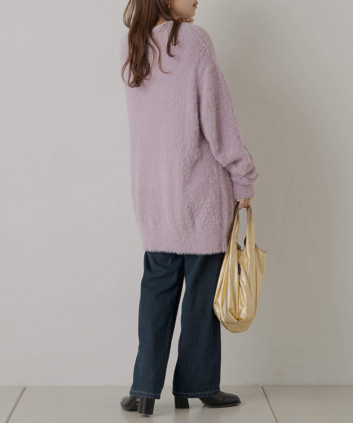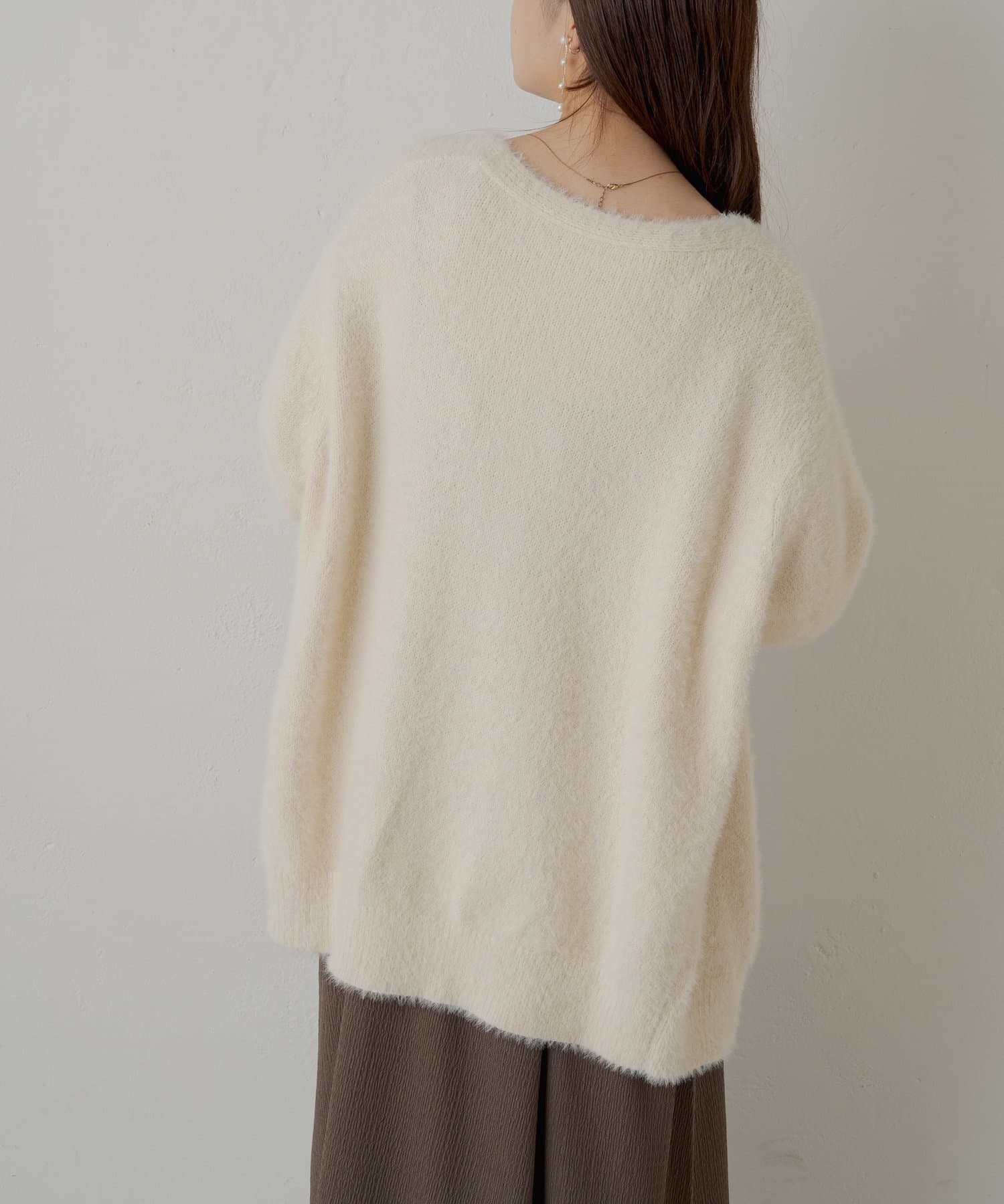 ・ふわふわしたフェザーヤーンで表情たっぷりに仕上げたビッグシルエットのニットカーディガン。