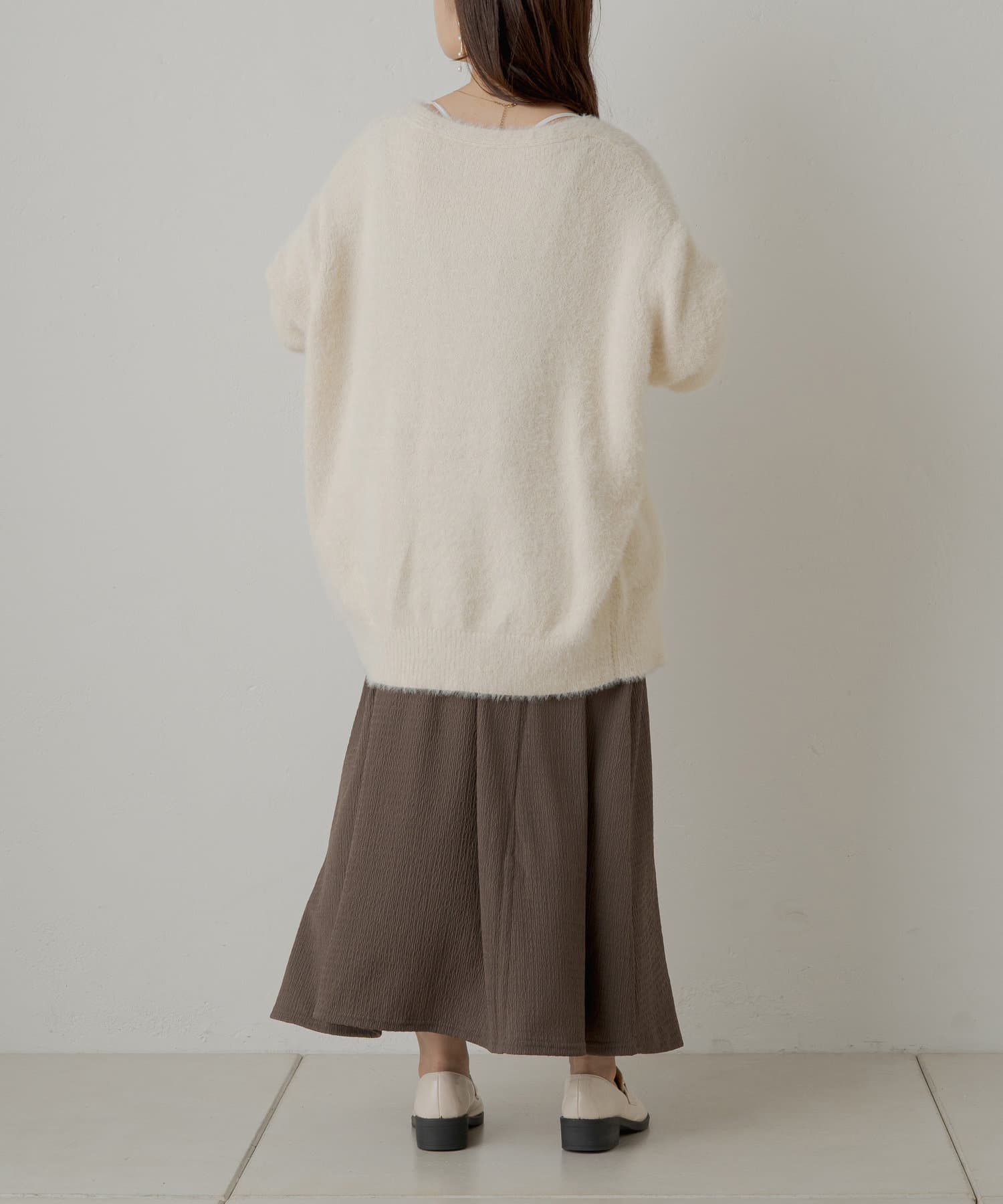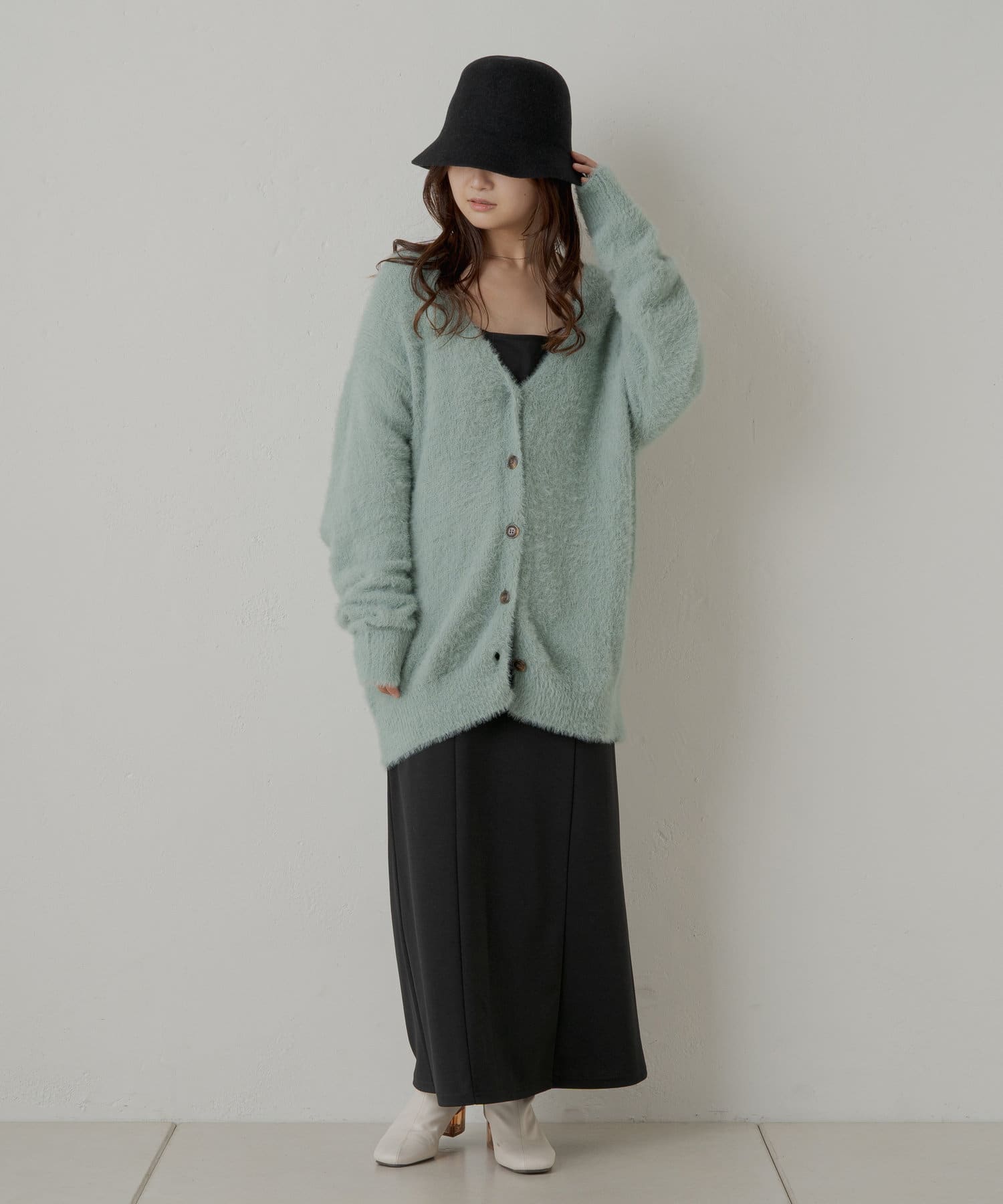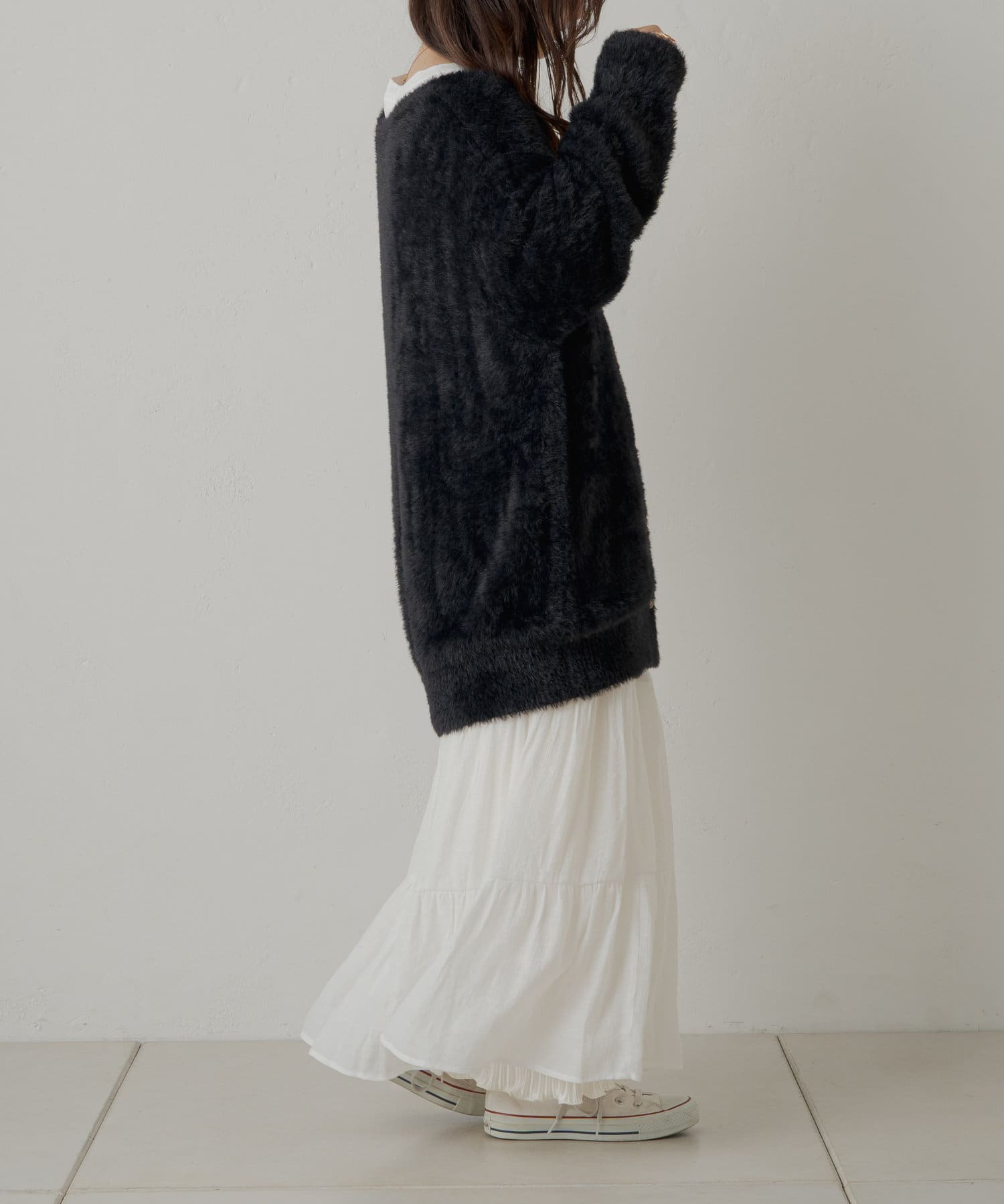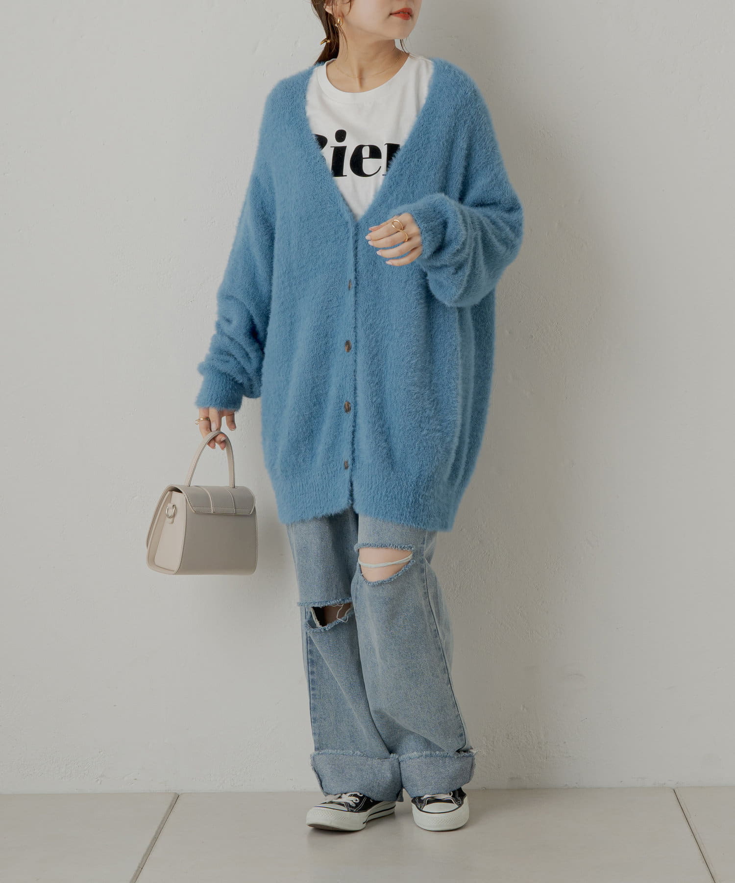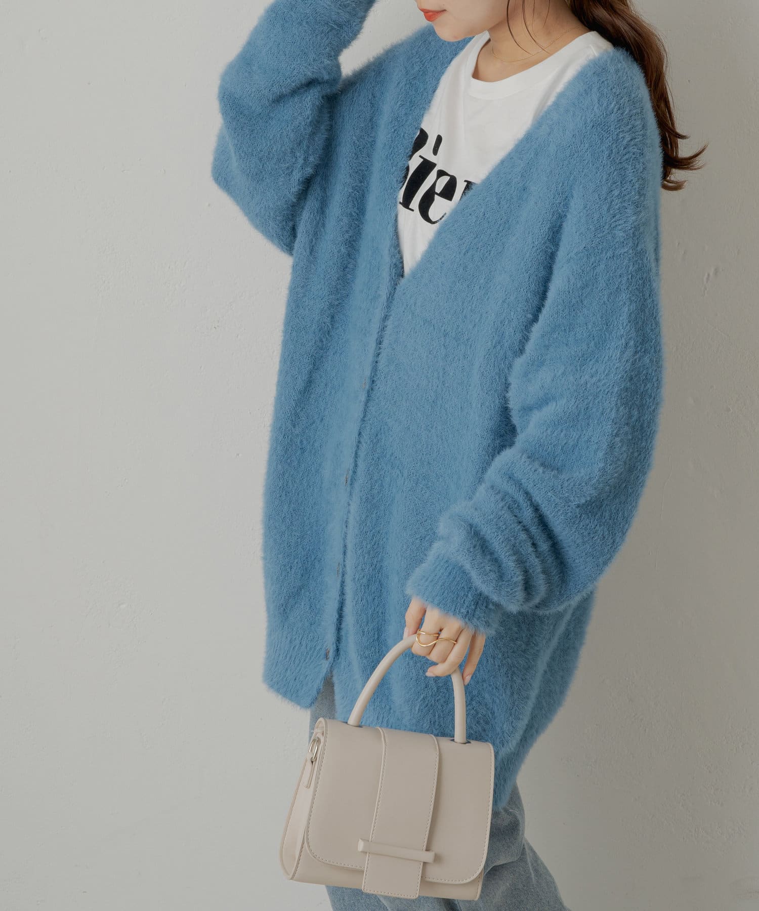 ・ふわふわしたフェザーヤーンで表情たっぷりに仕上げたビッグシルエットのニットカーディガン。