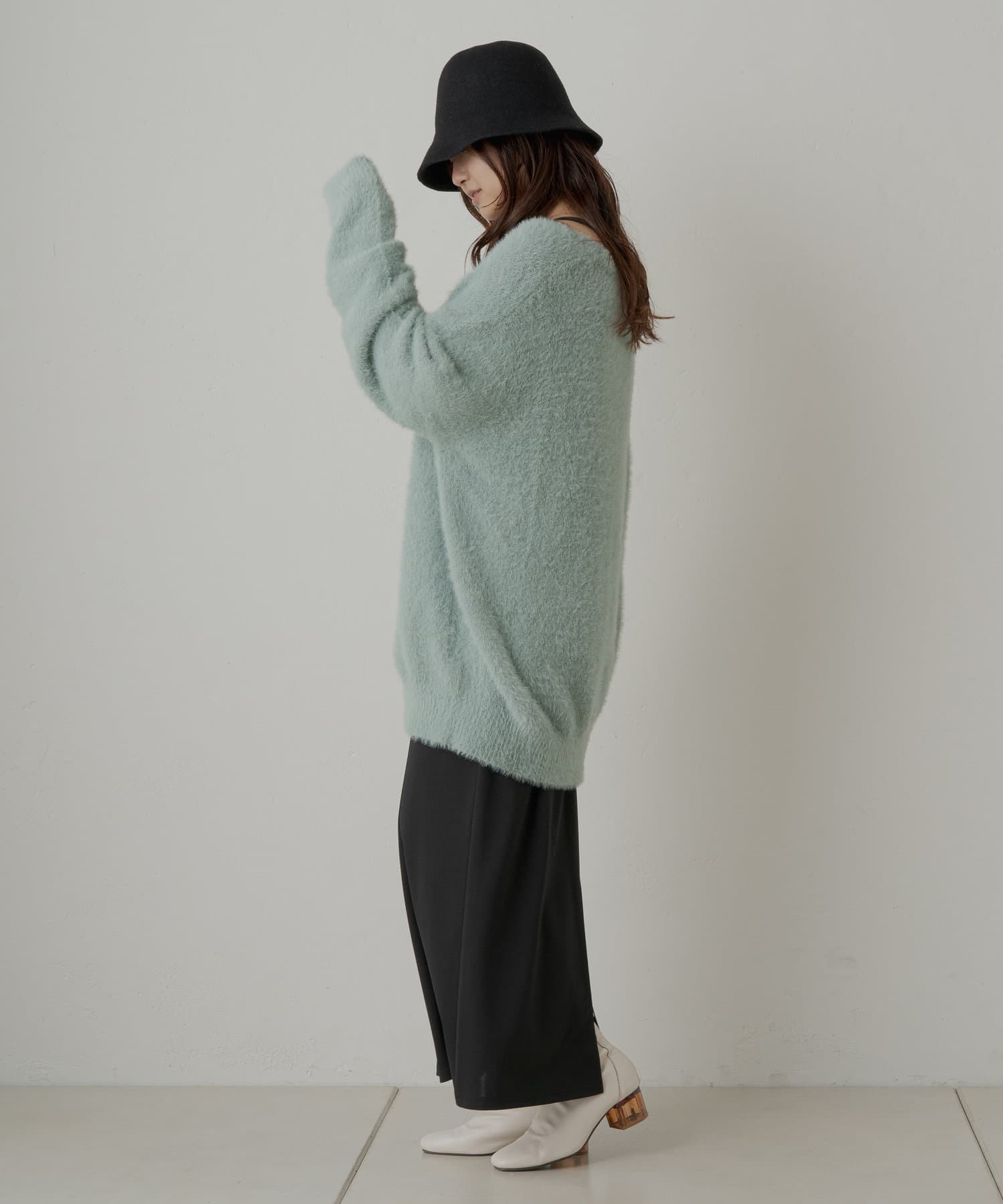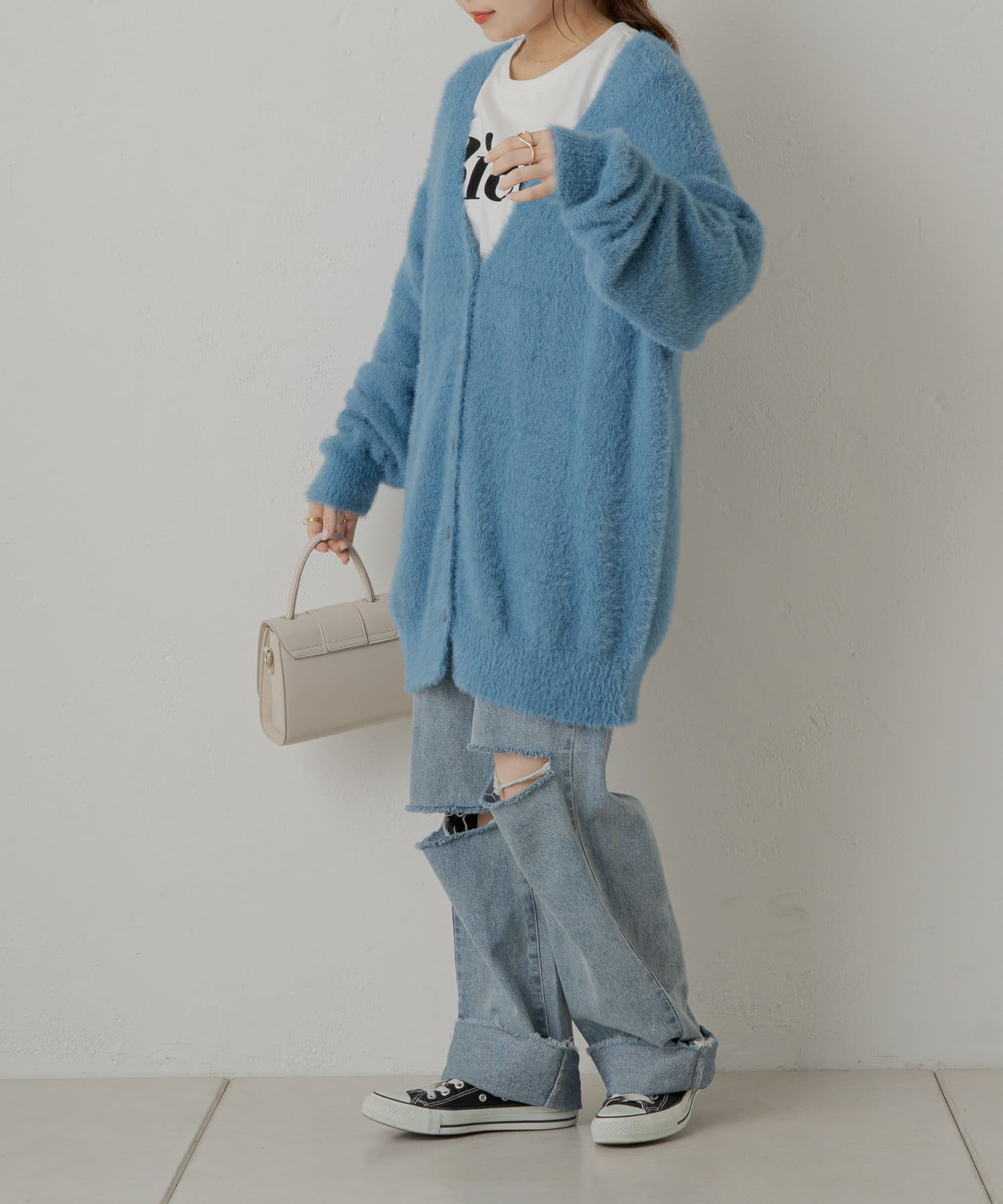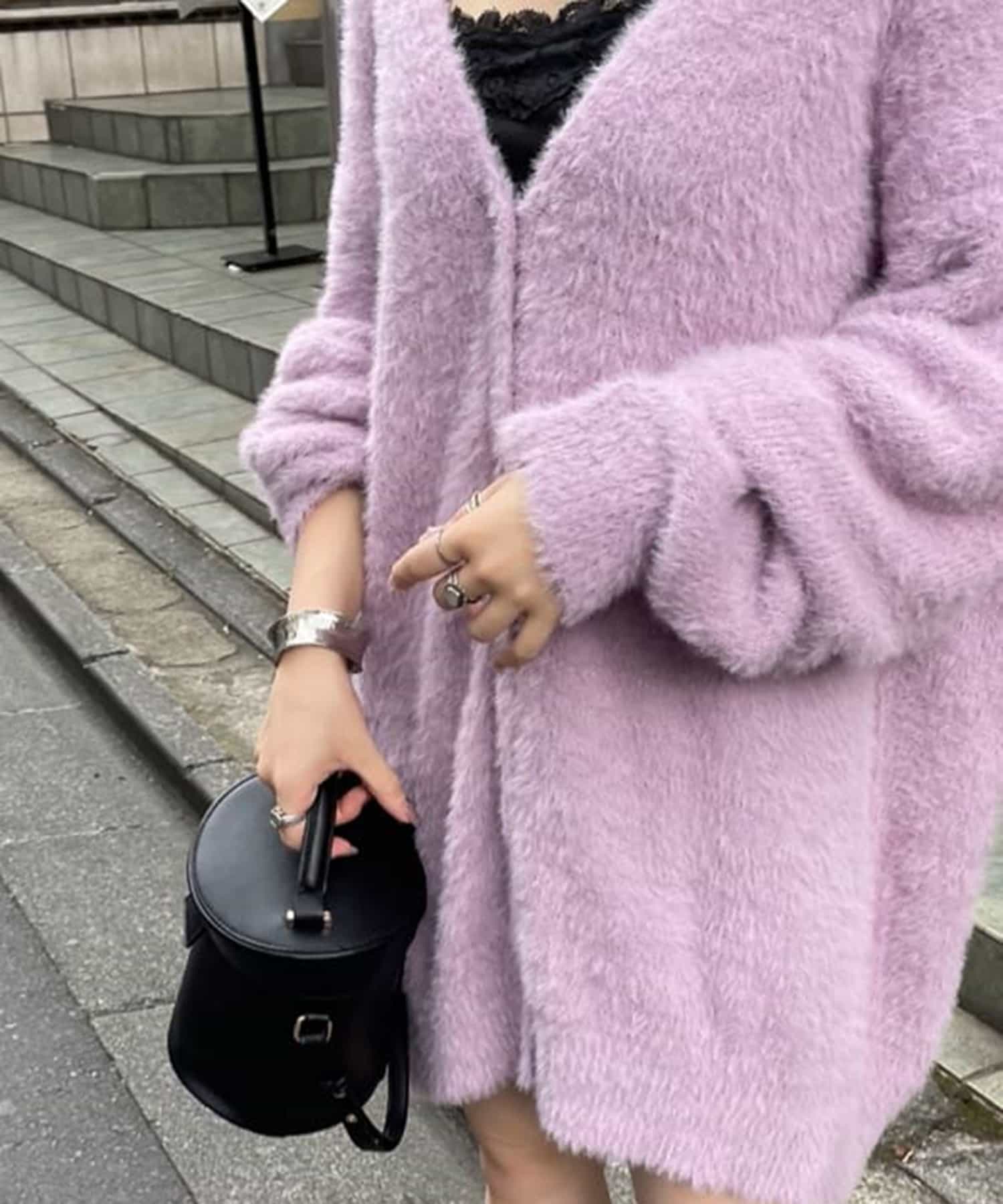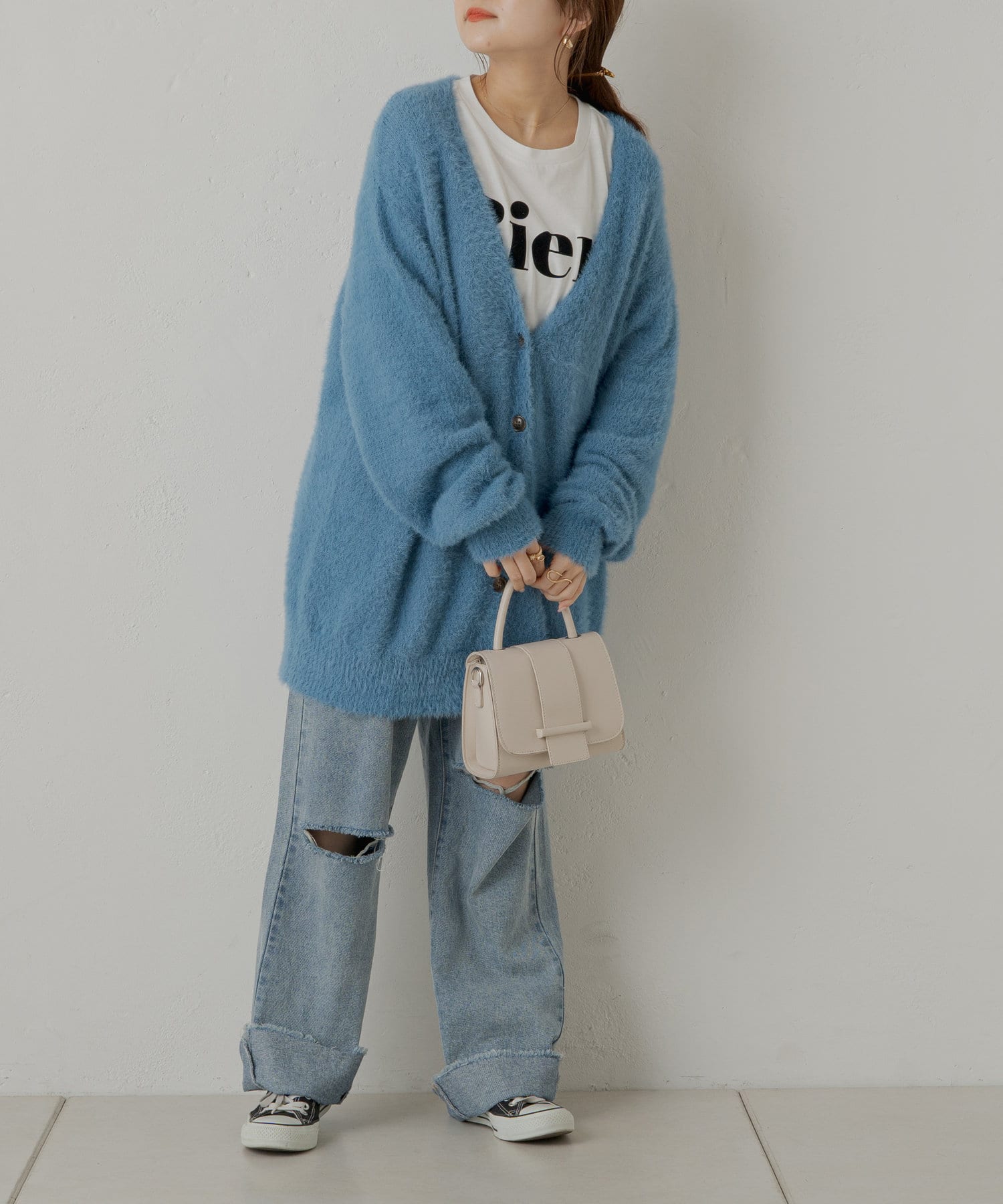 ・ふわふわしたフェザーヤーンで表情たっぷりに仕上げたビッグシルエットのニットカーディガン。
