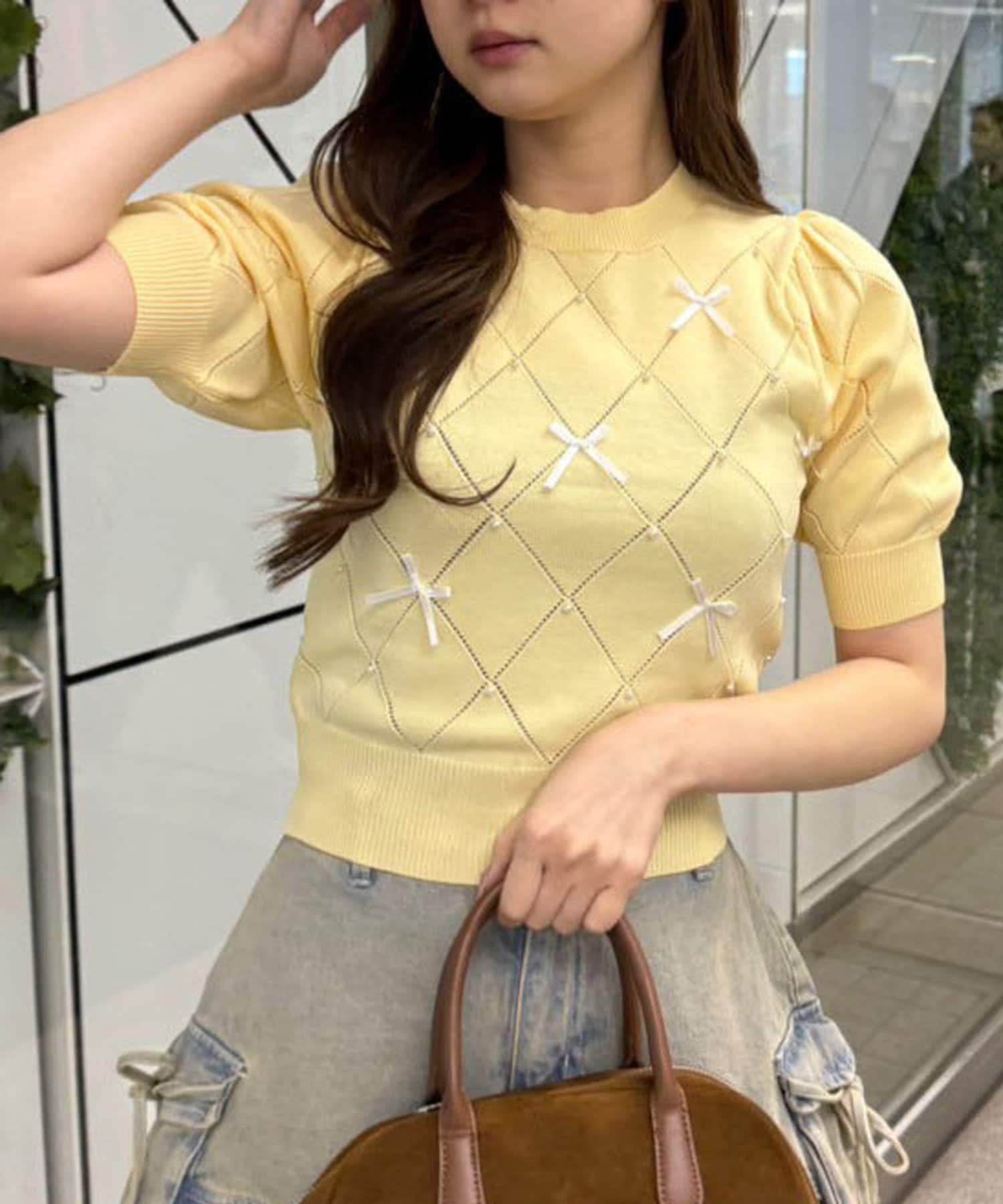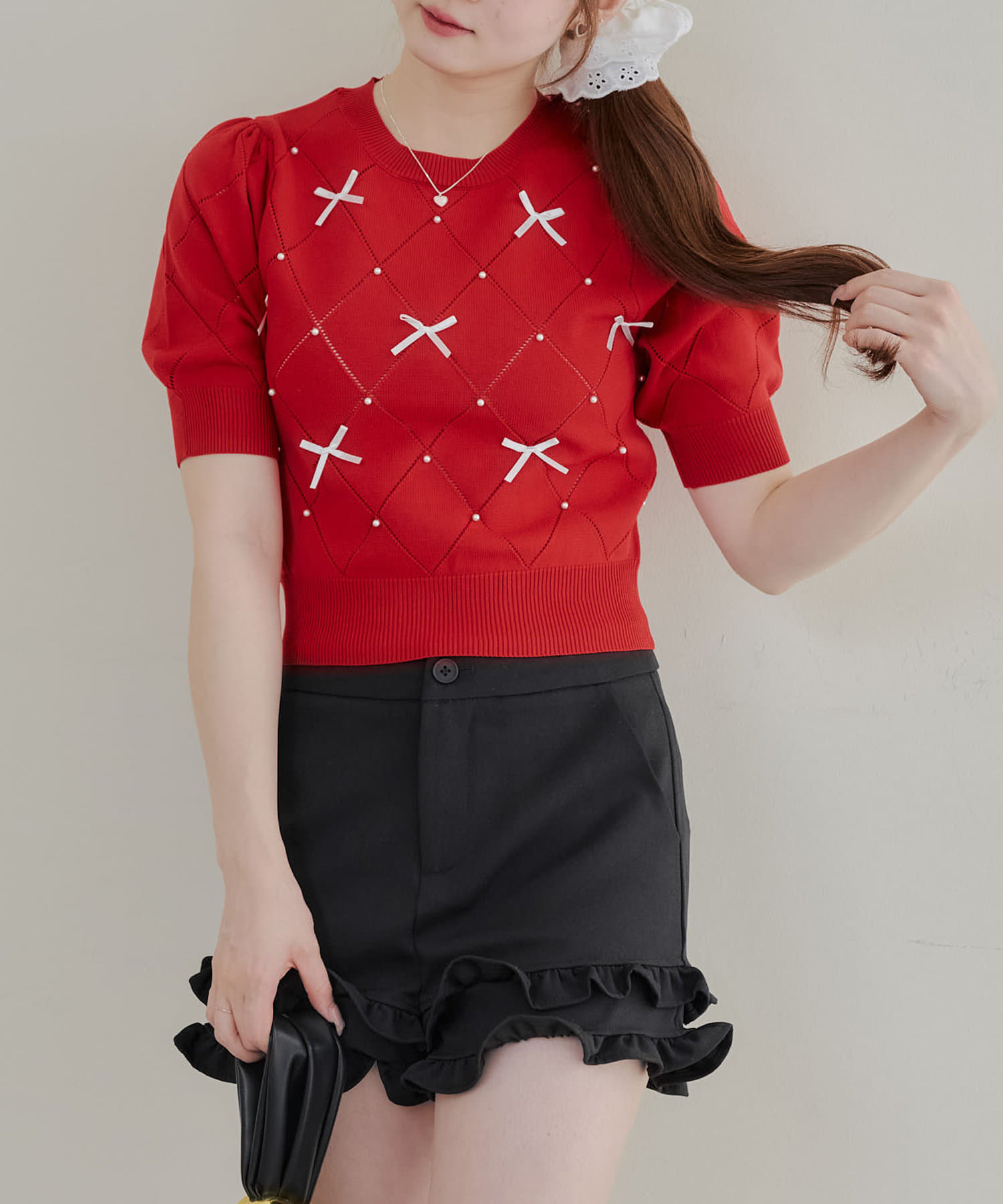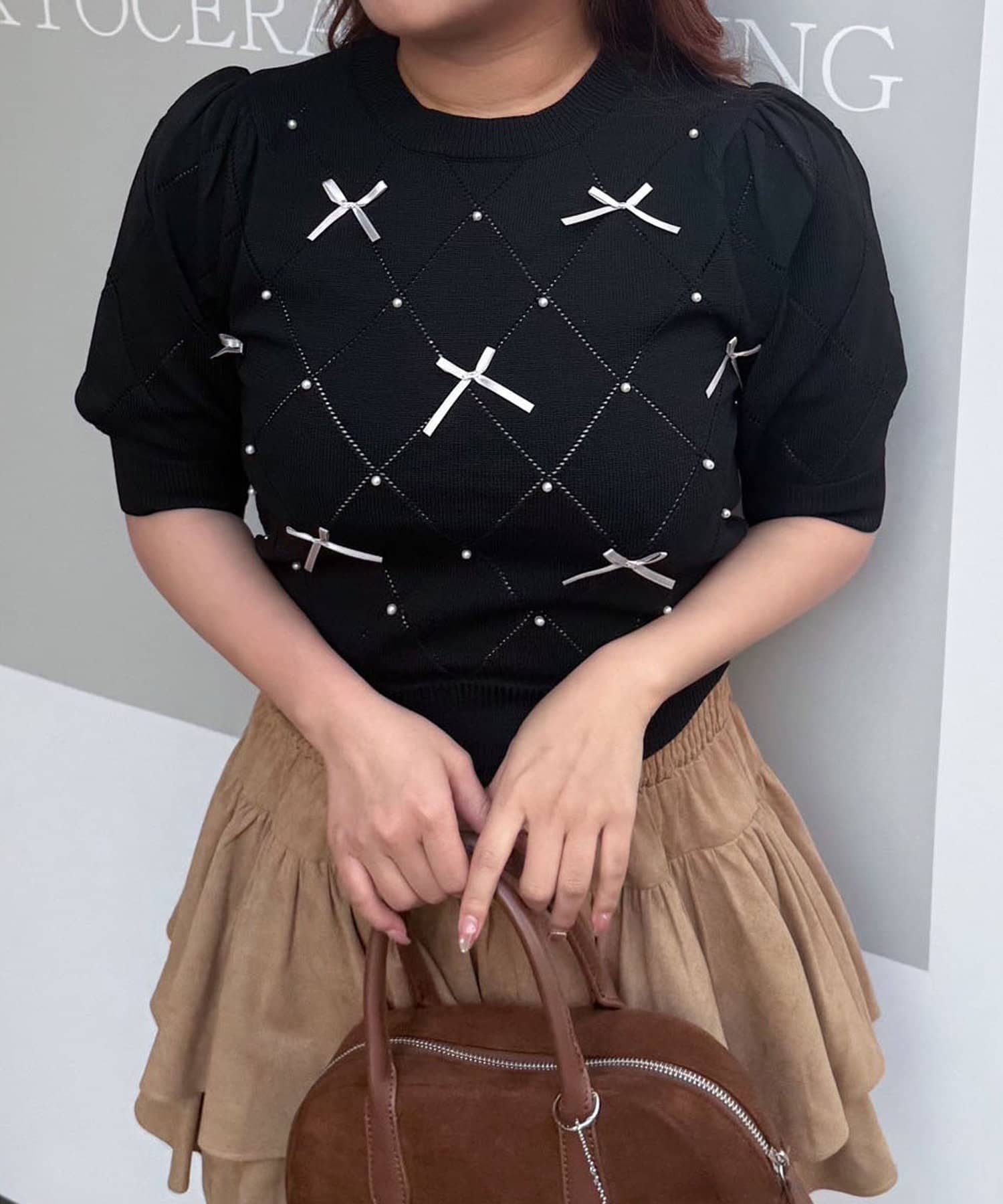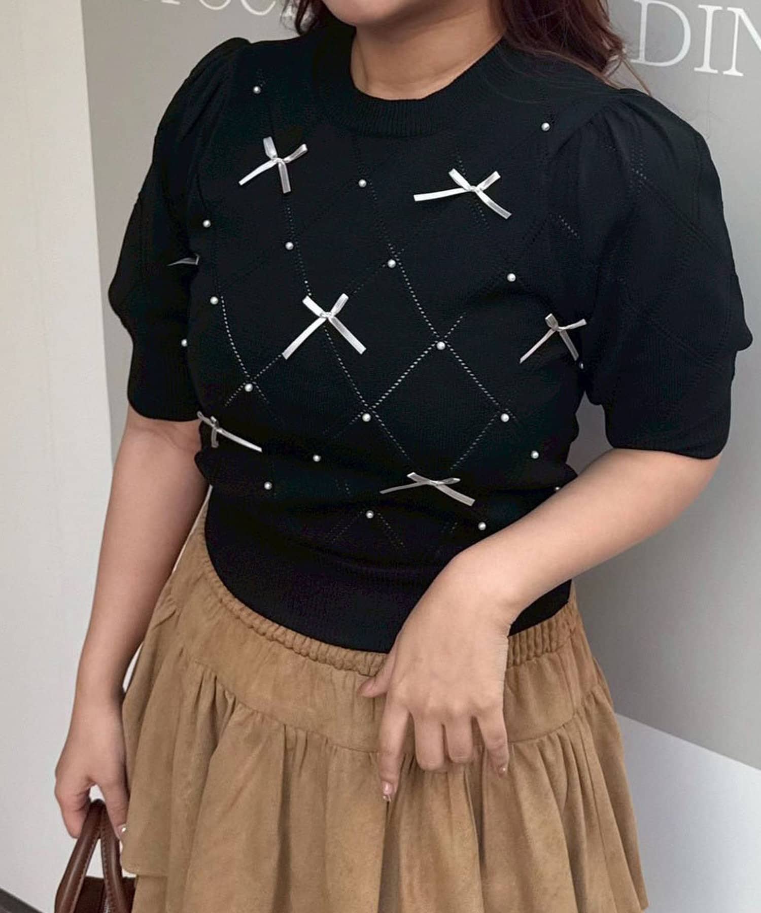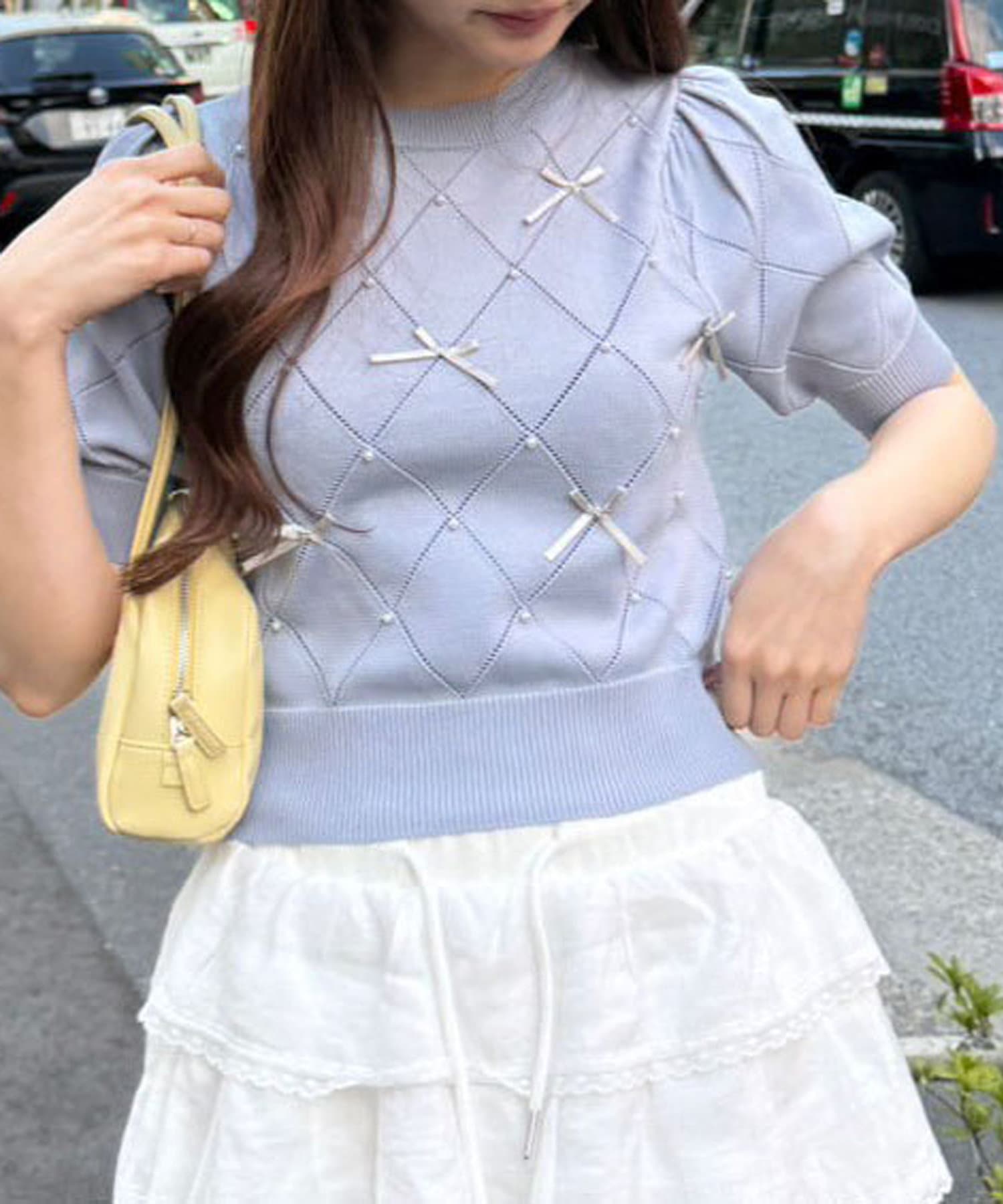 ◇パールとリボンがガーリーな半袖ニットトップス◇