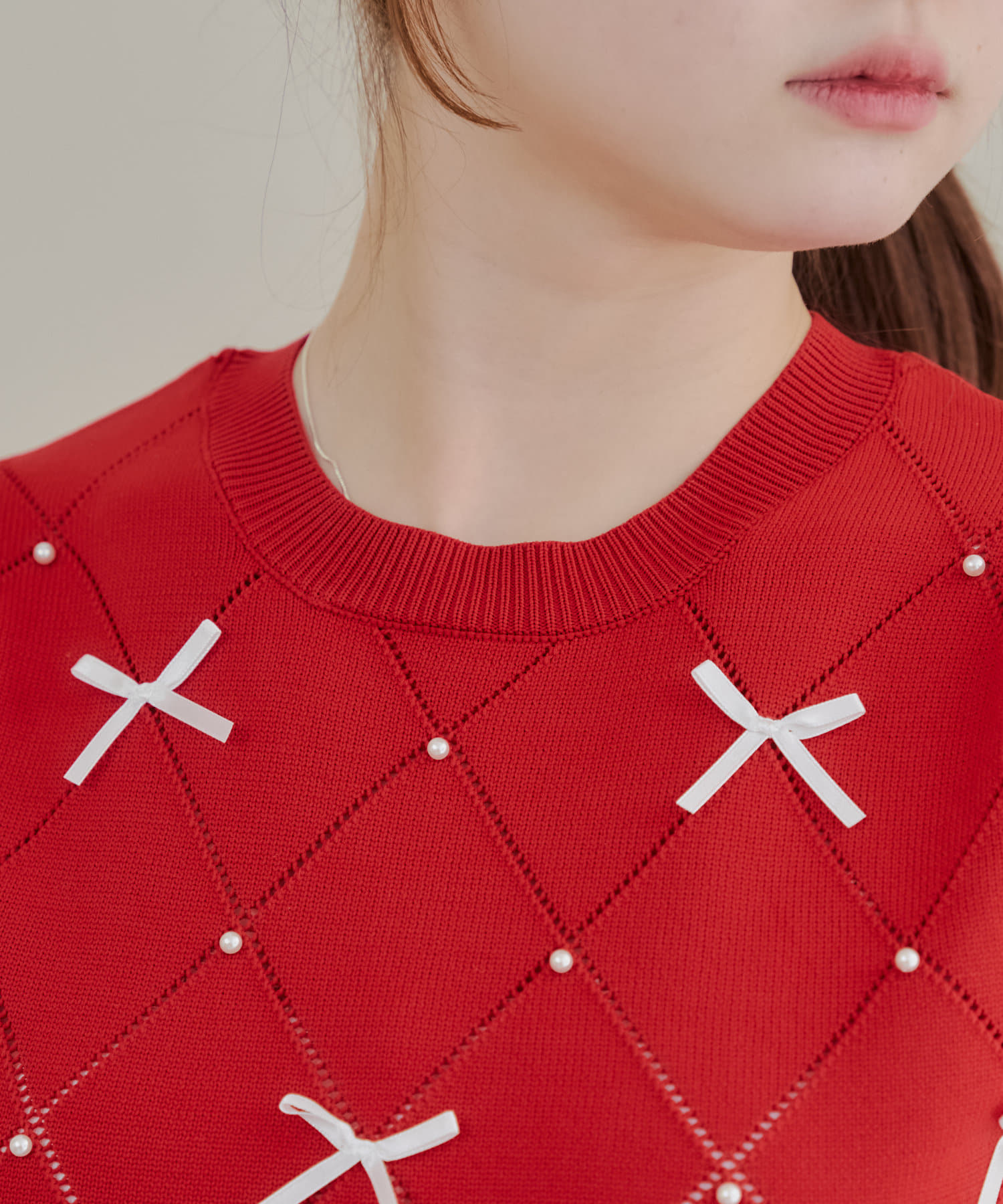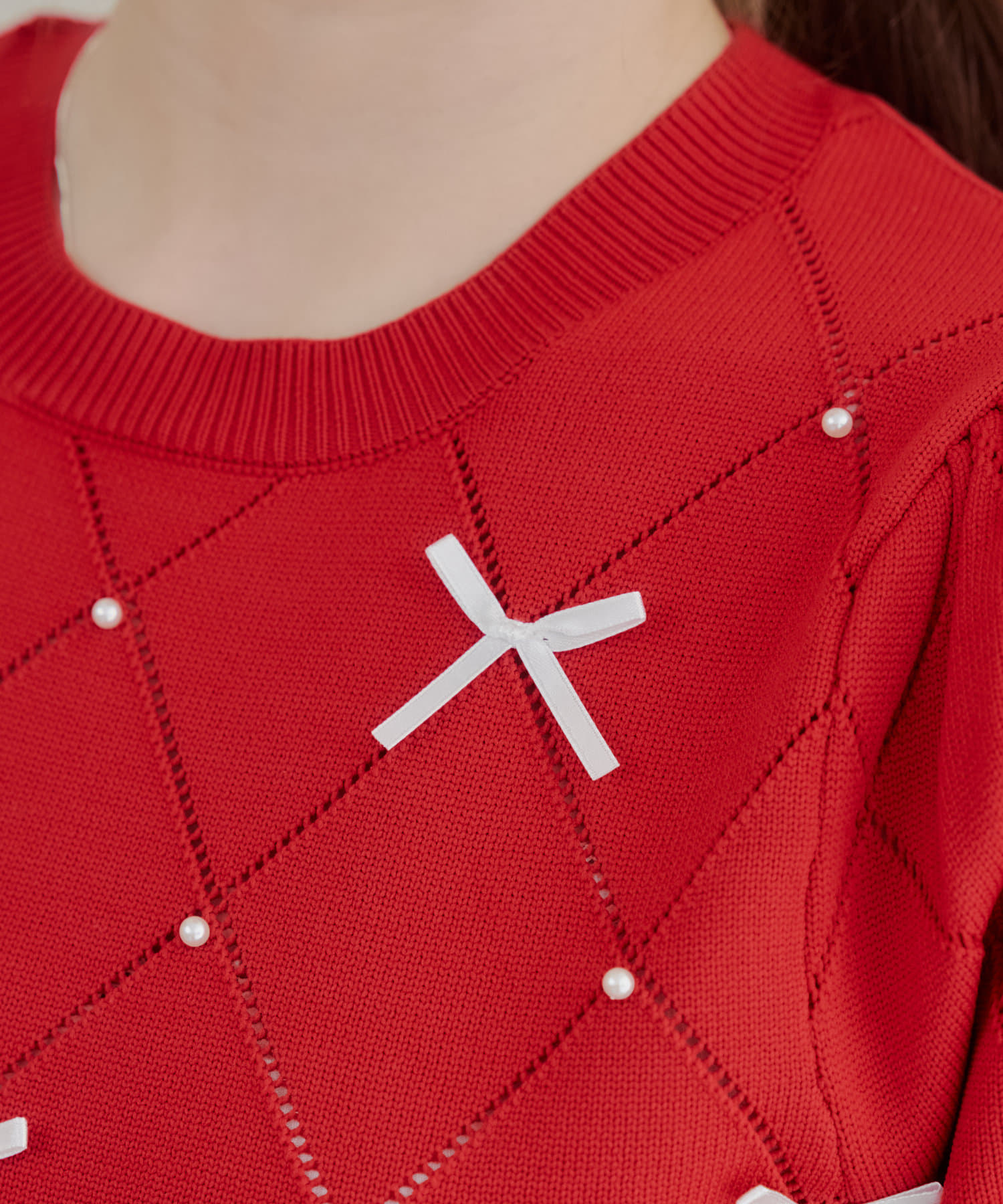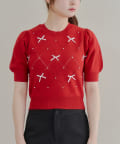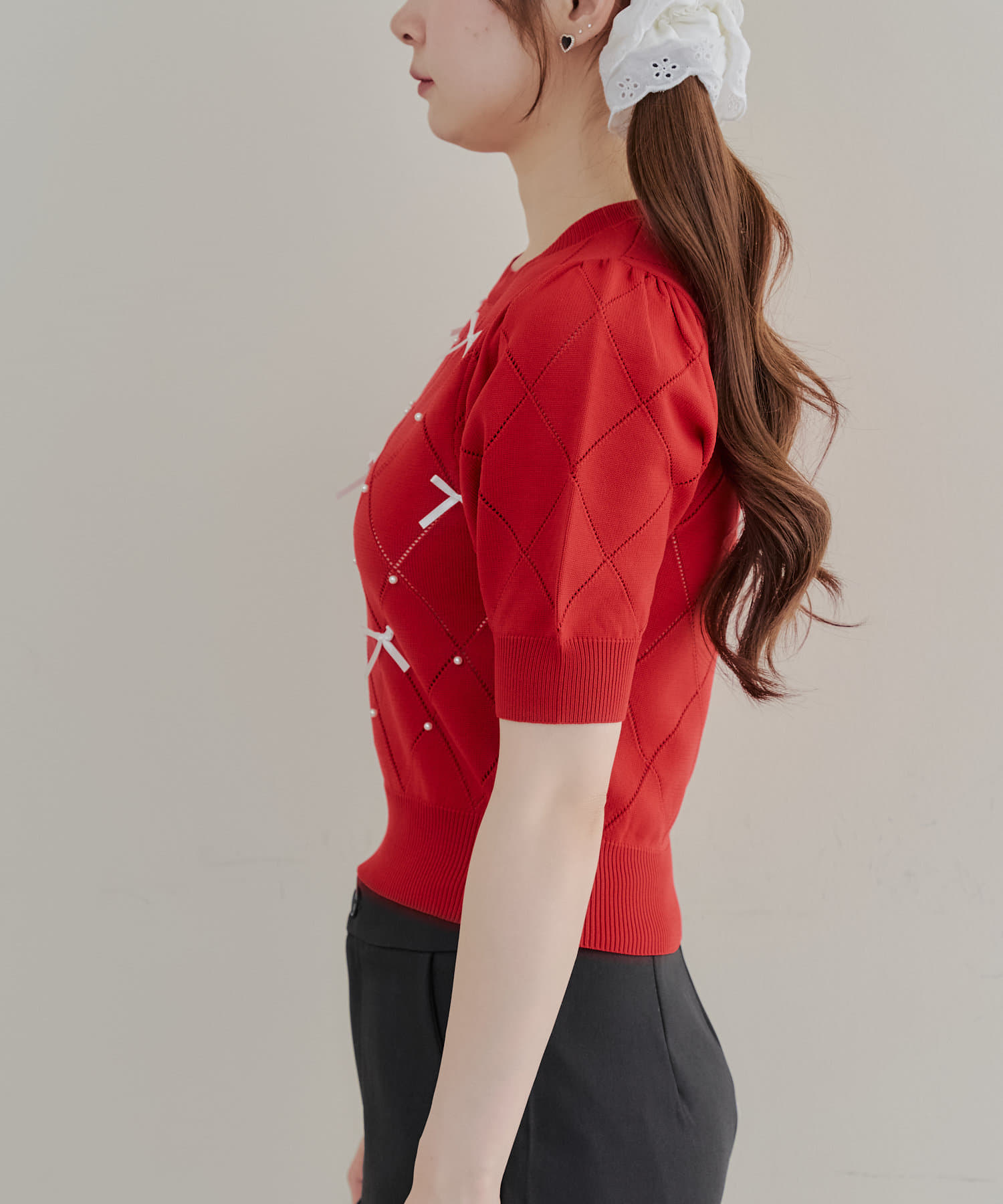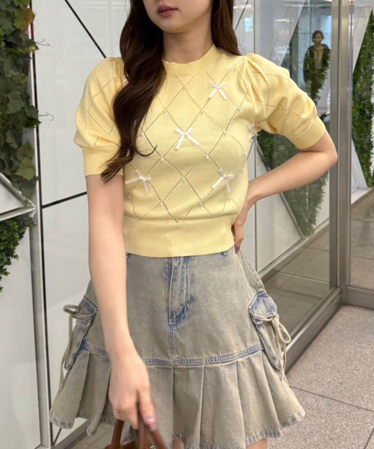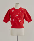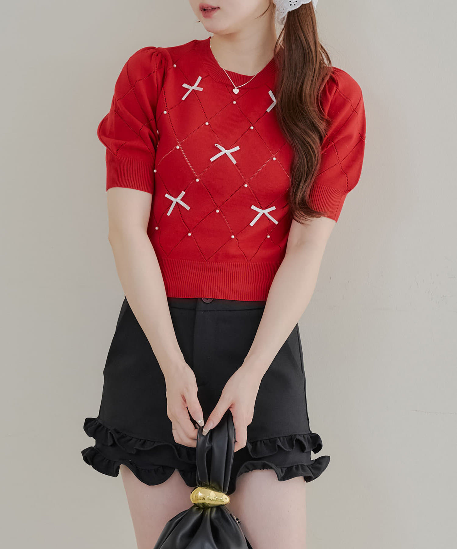 ◇パールとリボンがガーリーな半袖ニットトップス◇