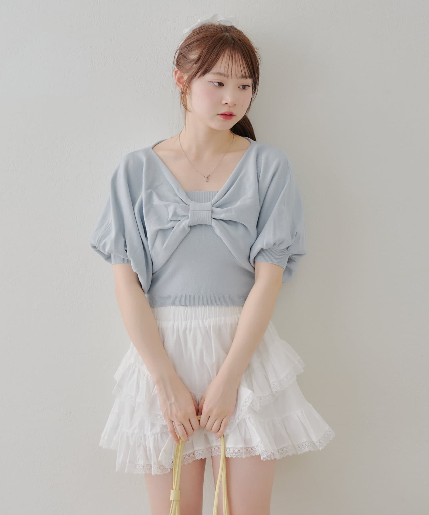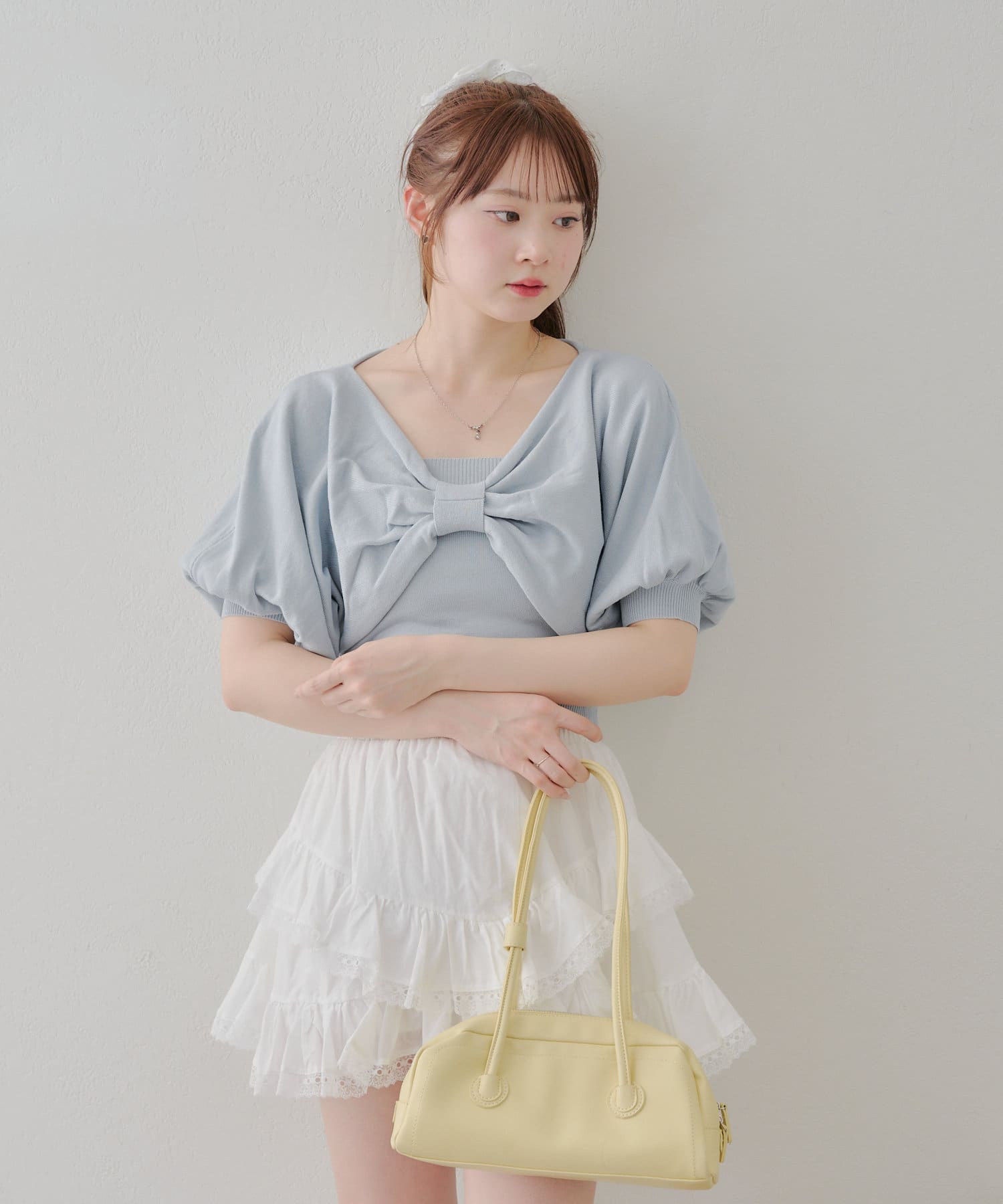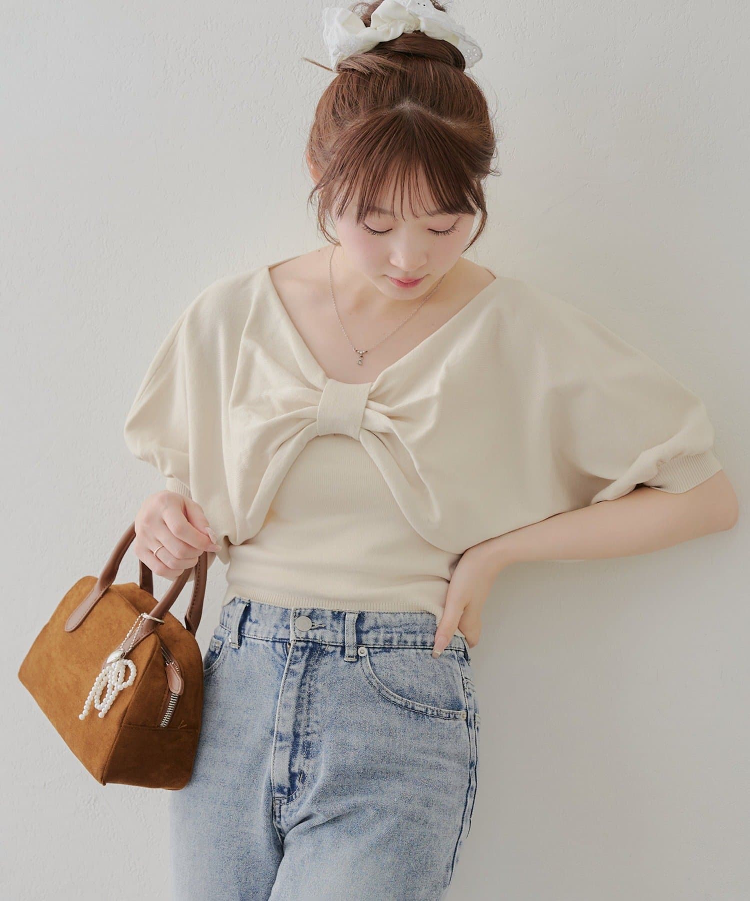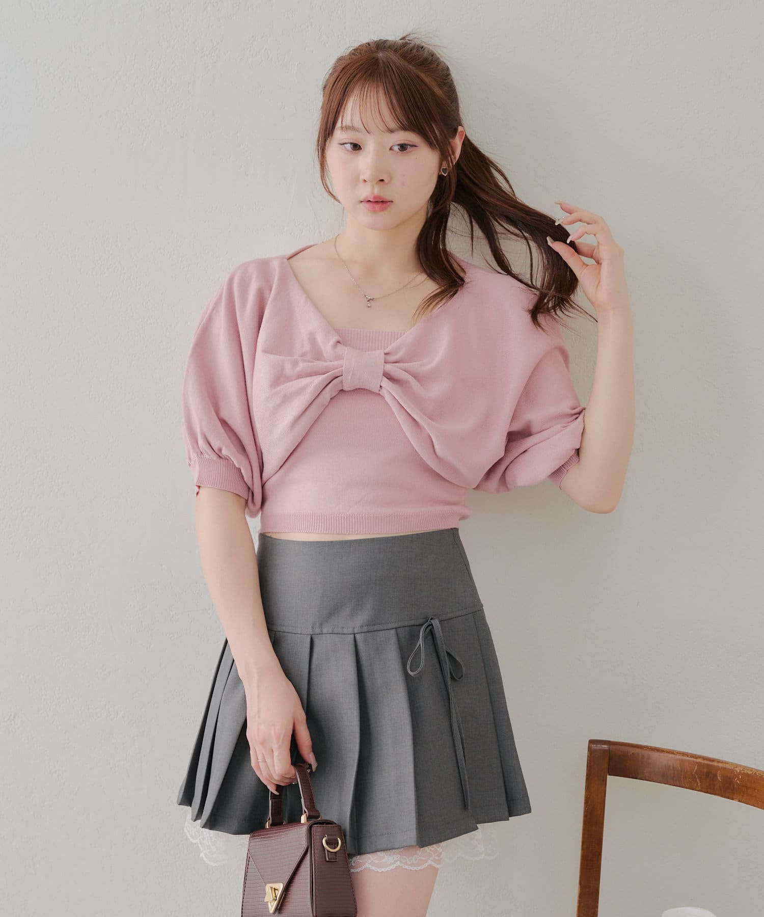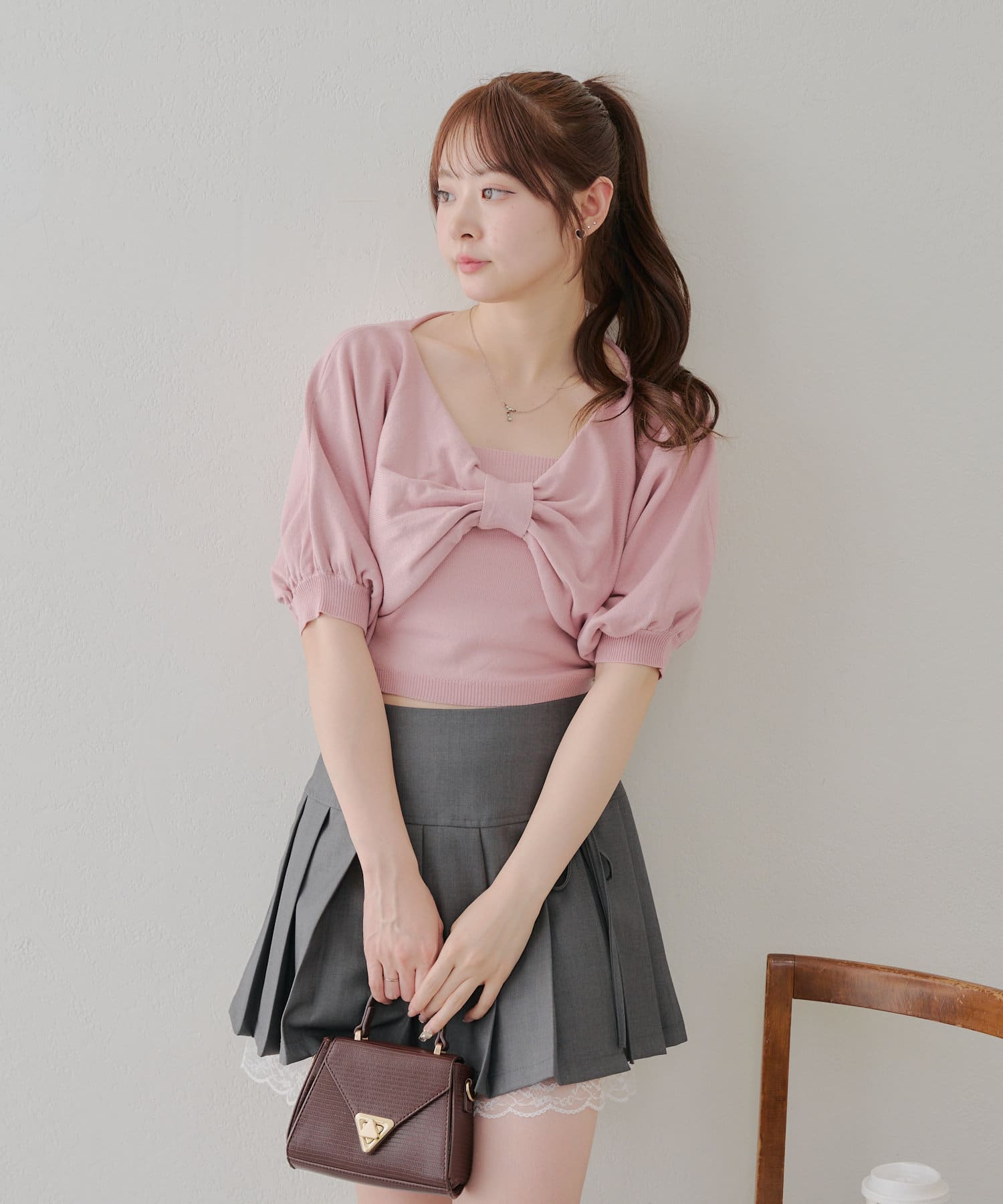 胸元の大きなリボンデザインがガーリーにしてくれるアンサンブル