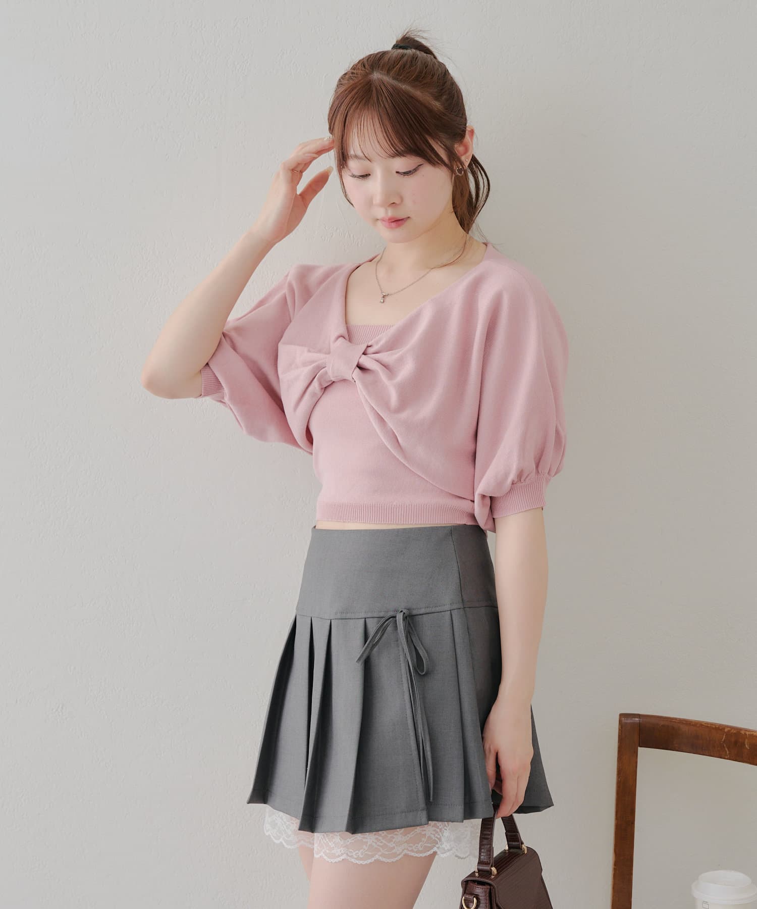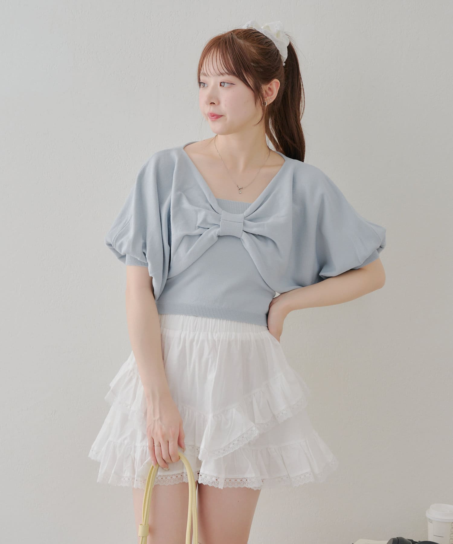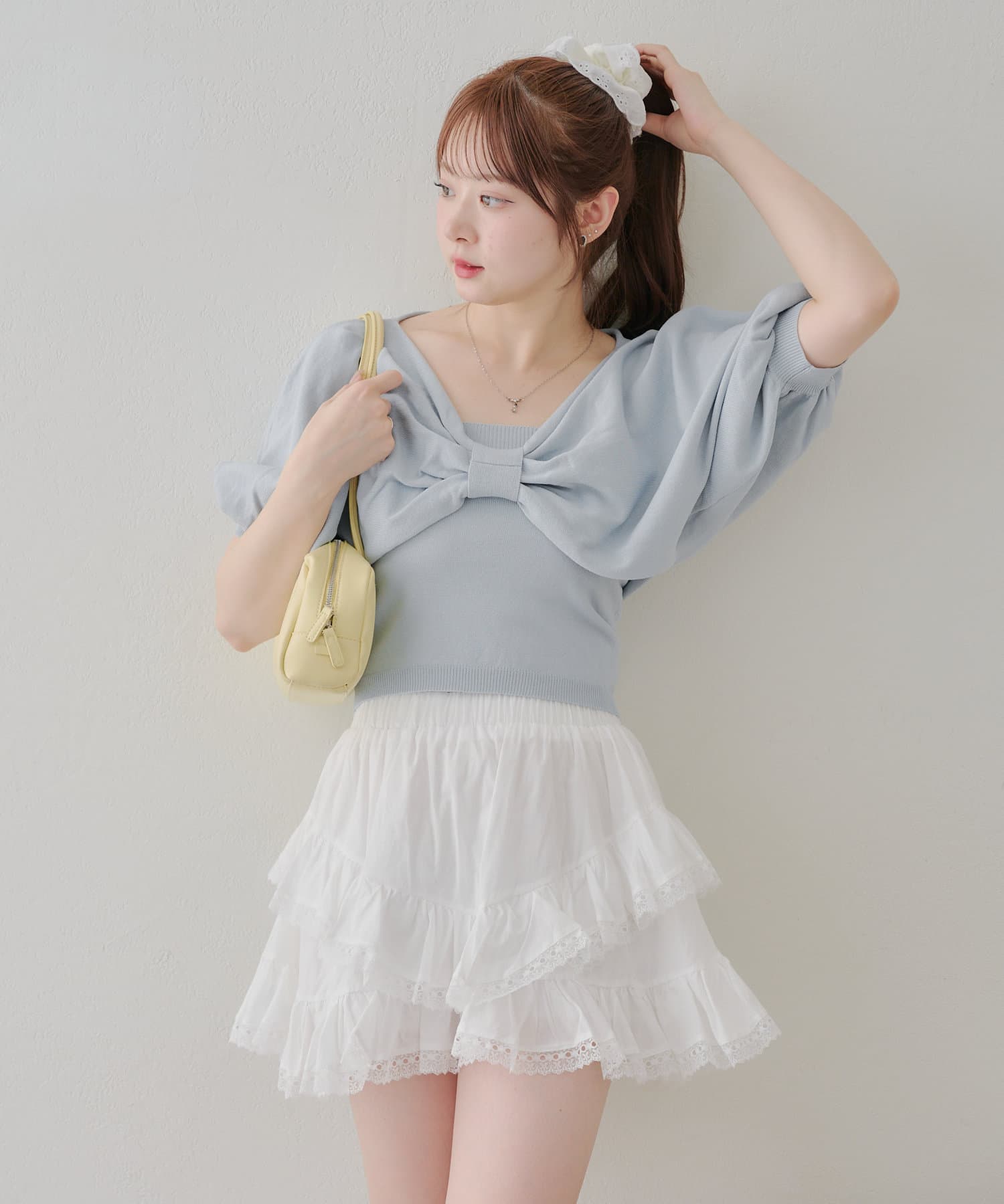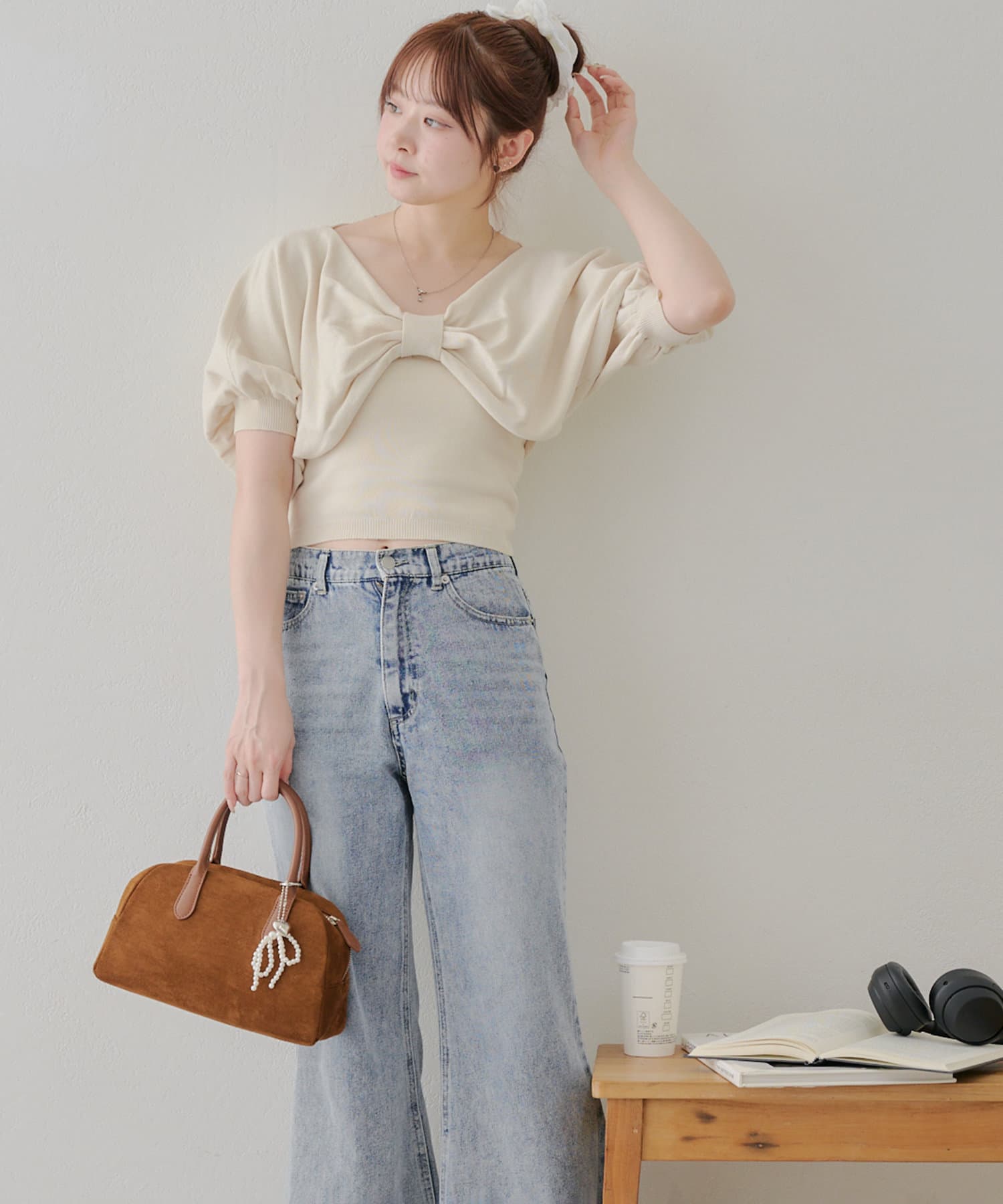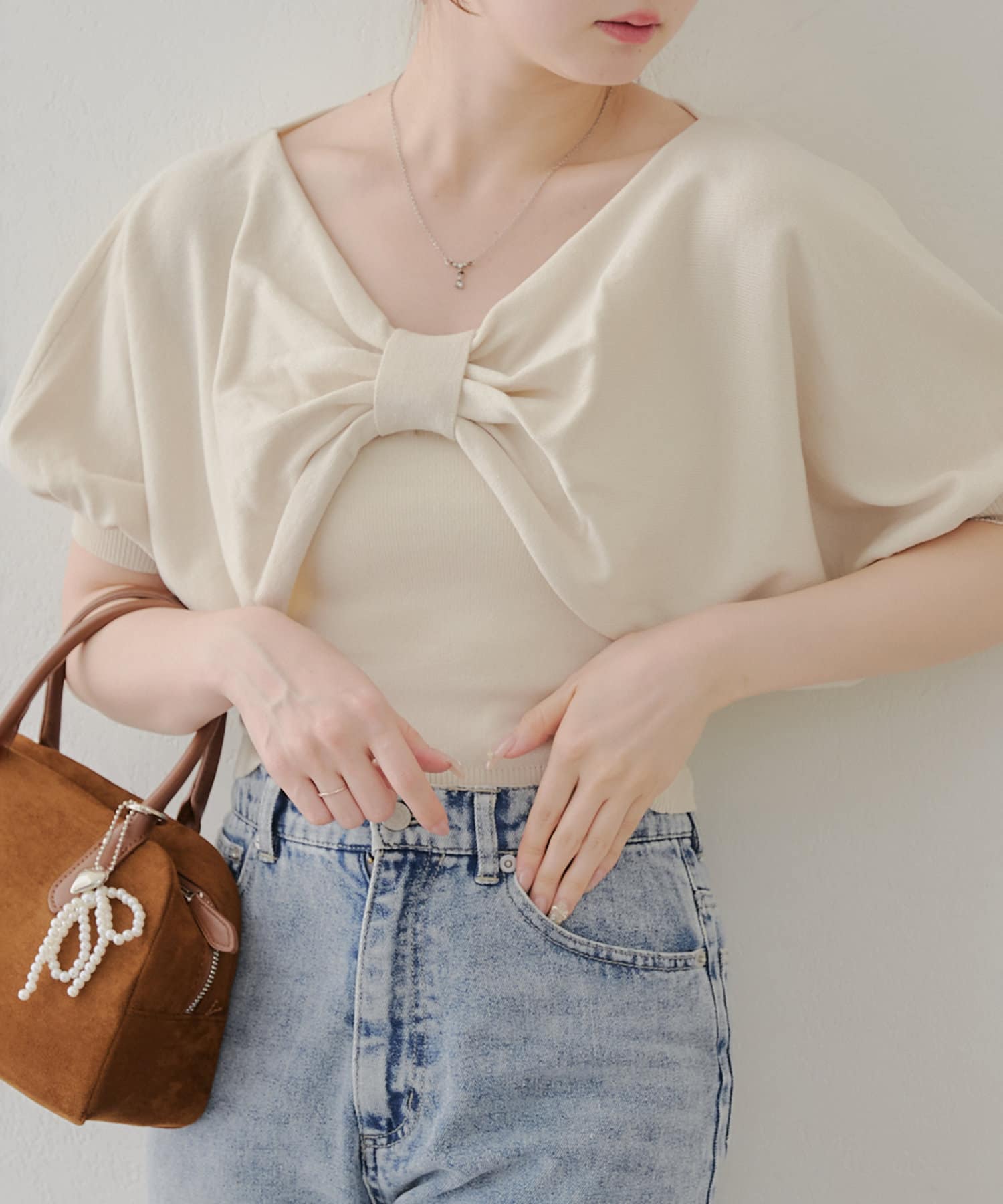 胸元の大きなリボンデザインがガーリーにしてくれるアンサンブル