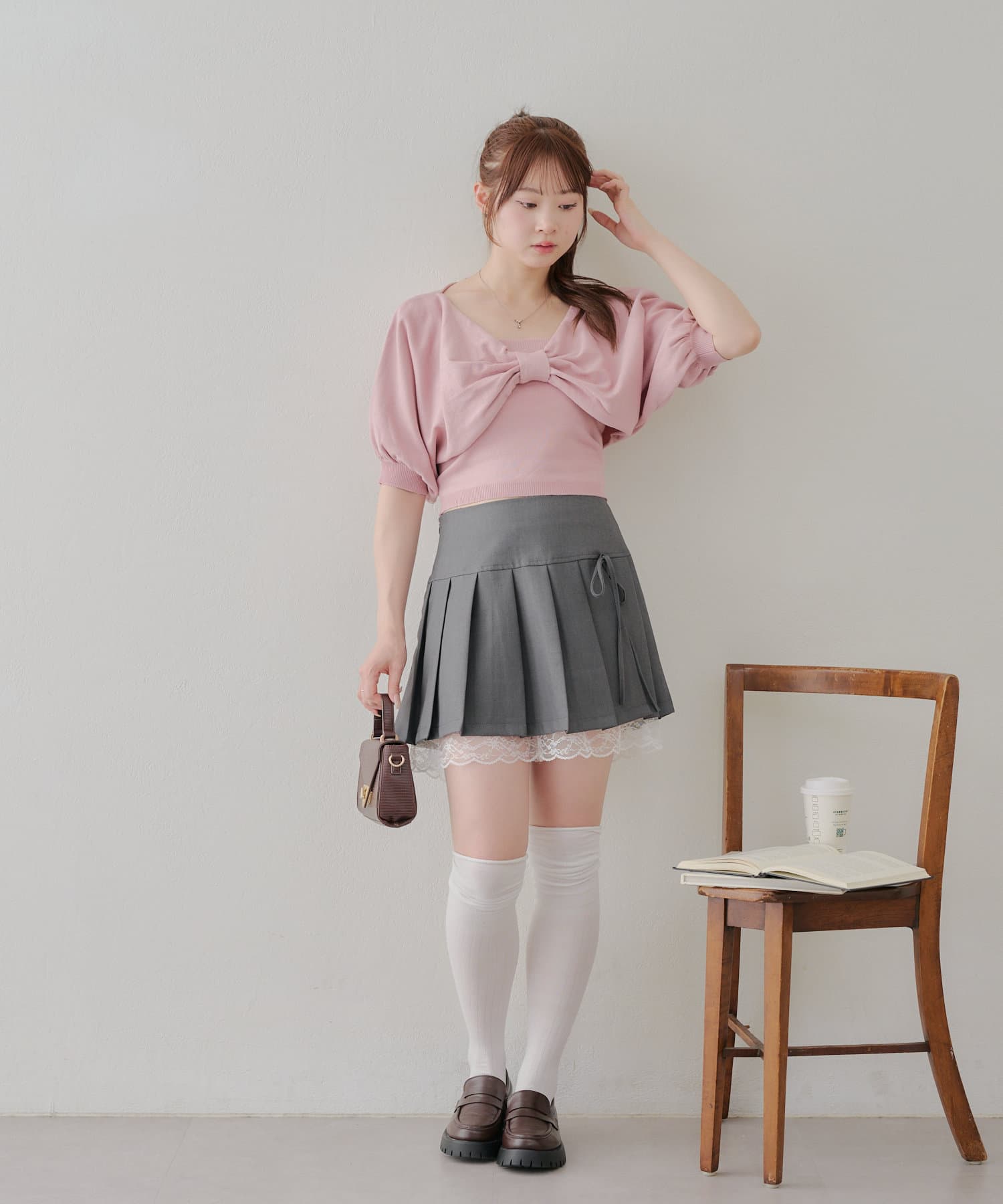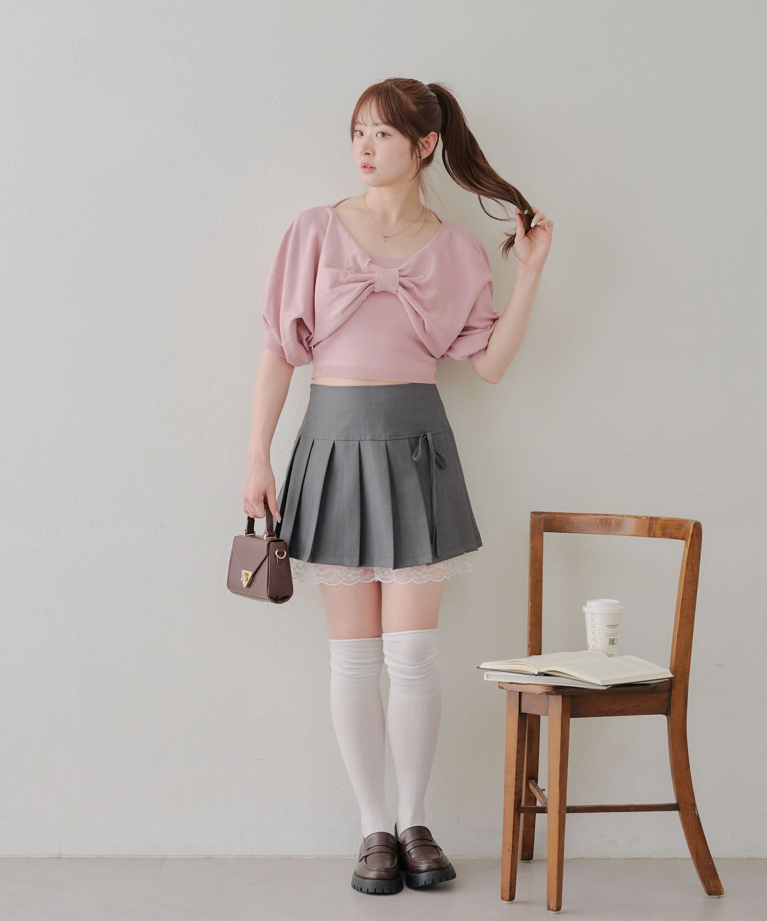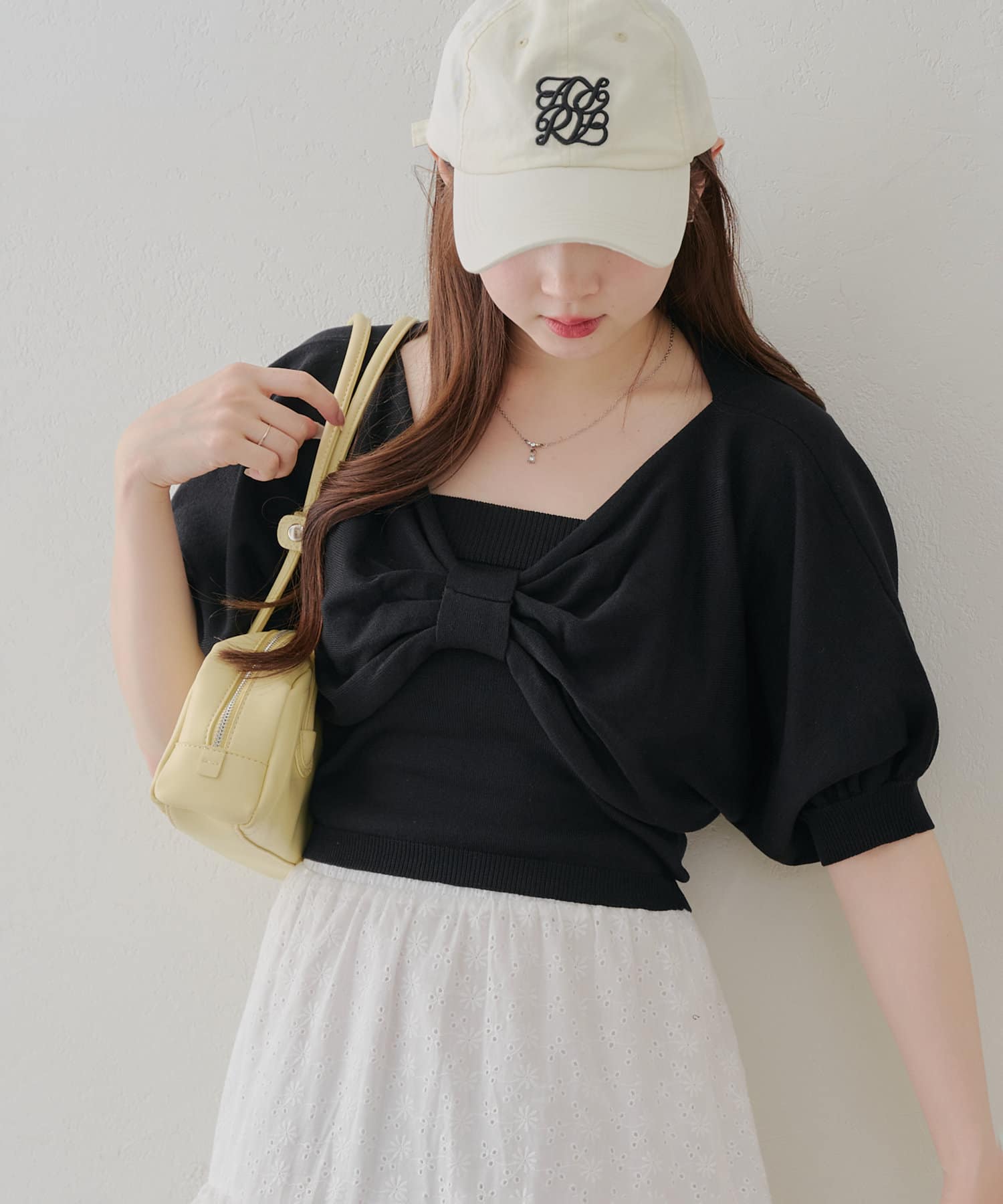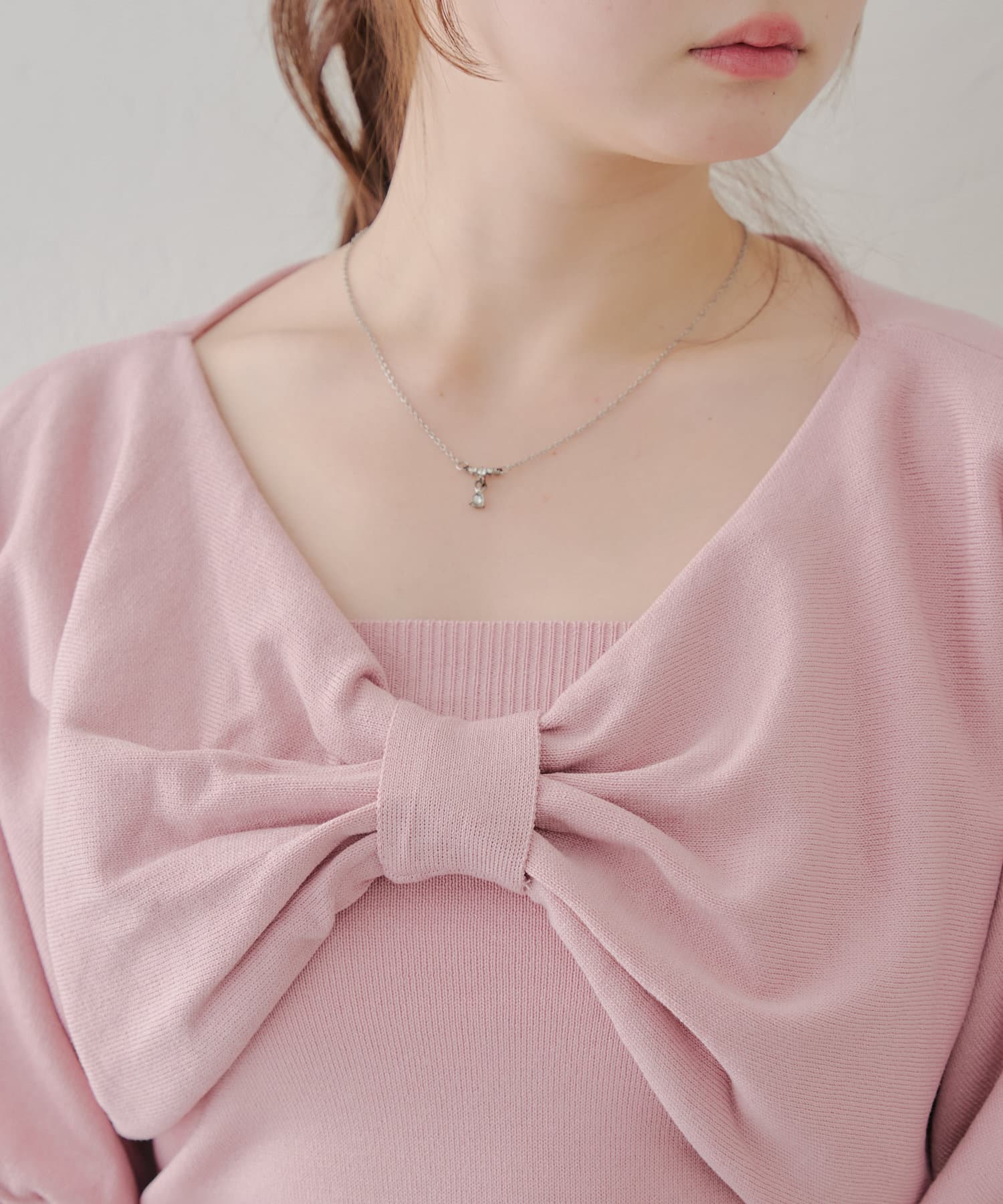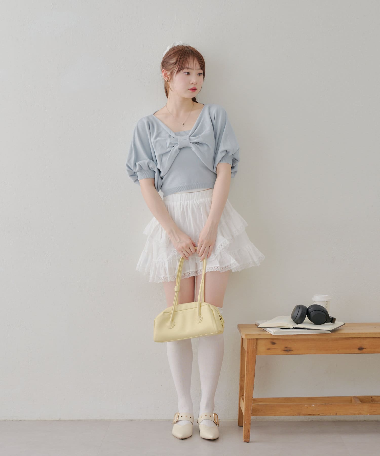 胸元の大きなリボンデザインがガーリーにしてくれるアンサンブル